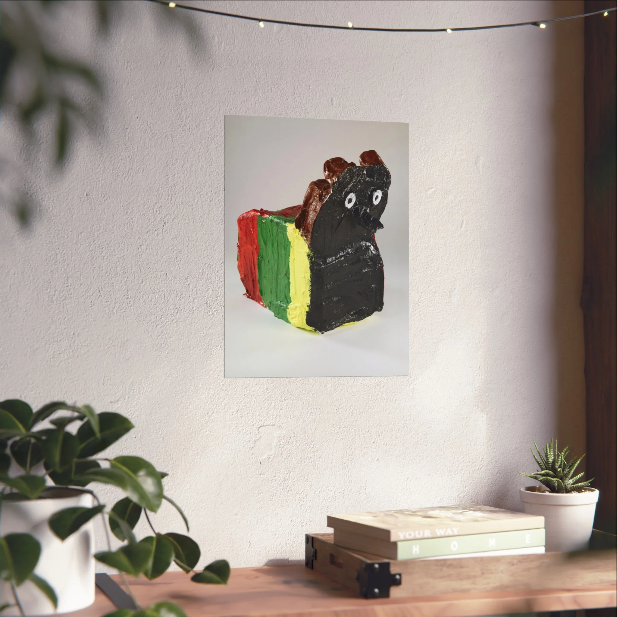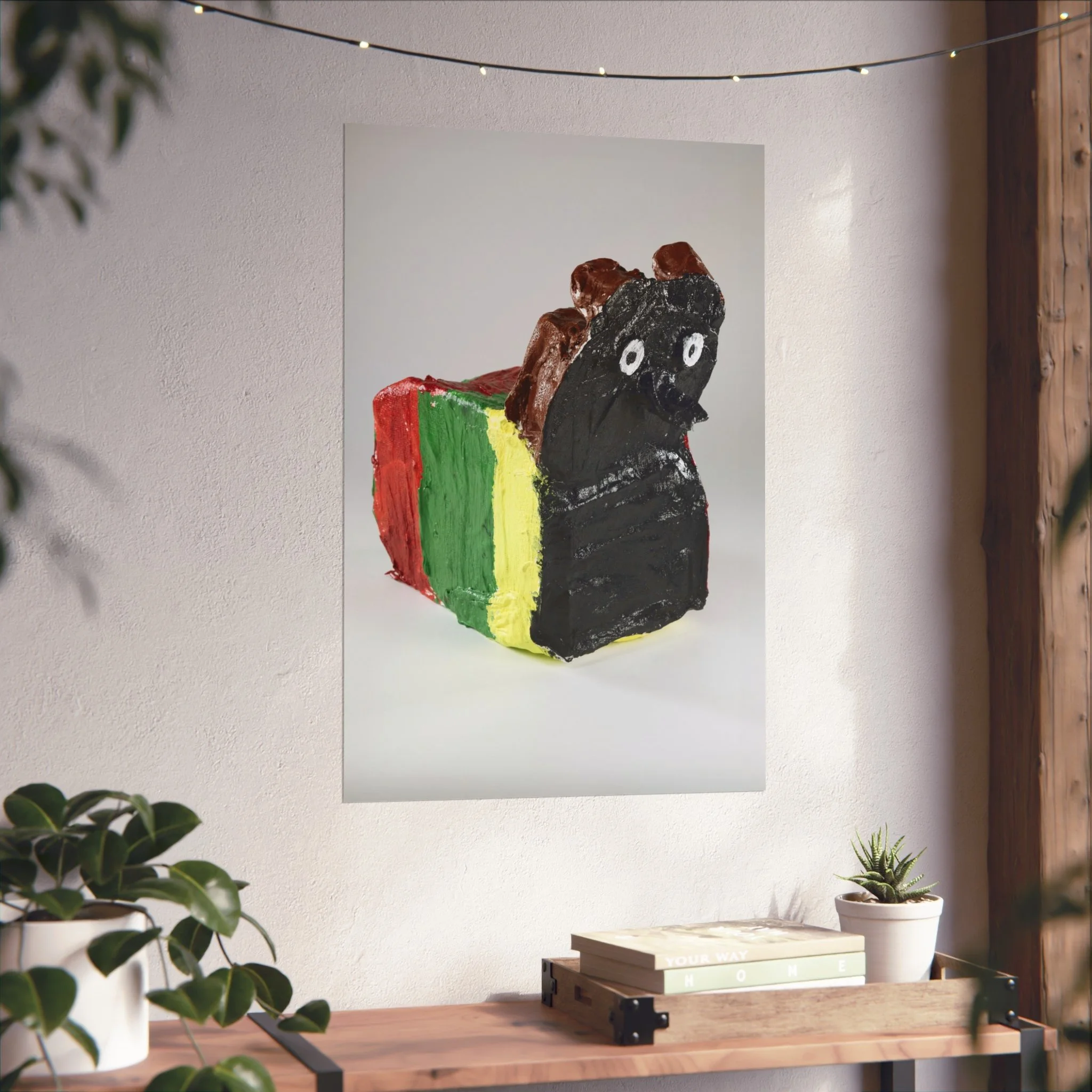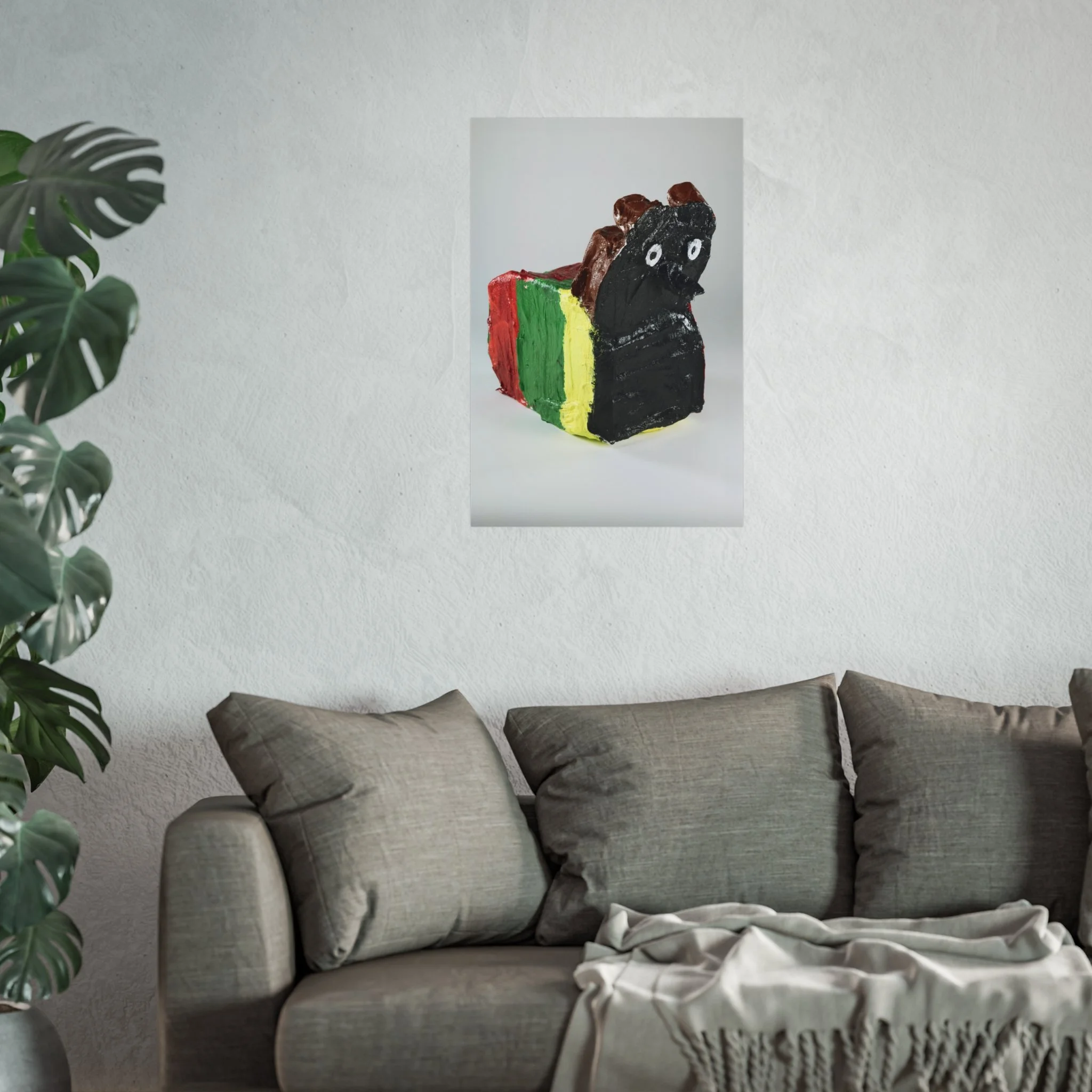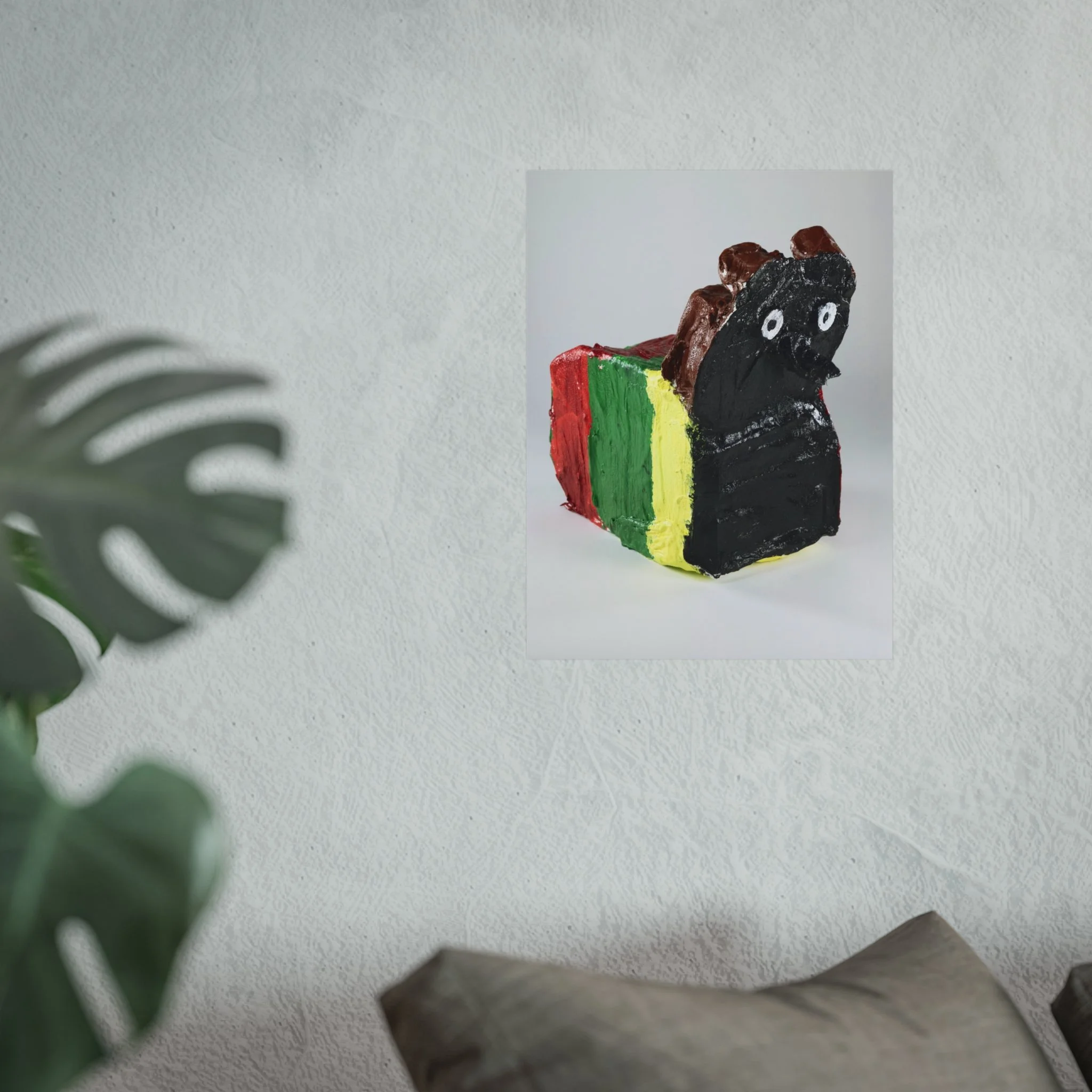 This fine art poster captures a playful, hand-made sculpture rendered in bright, confident brushstrokes. Printed with giclée quality on smooth, gallery-grade 220gsm paper, the image keeps its texture and color depth—matte and soft to the eye, but crisp in detail. It hangs quietly in a living room or studio, adding a touch of folk character and upbeat color without shouting. The piece feels like a small, joyful discovery: a curious, slightly rough-hewn figure with bold blocks of red, yellow and green that bring warmth to a neutral wall. It’s for someone who collects oddities, celebrates imperfect craft, and likes art that sparks conversation and smiles during relaxed evenings at home or casual gatherings.