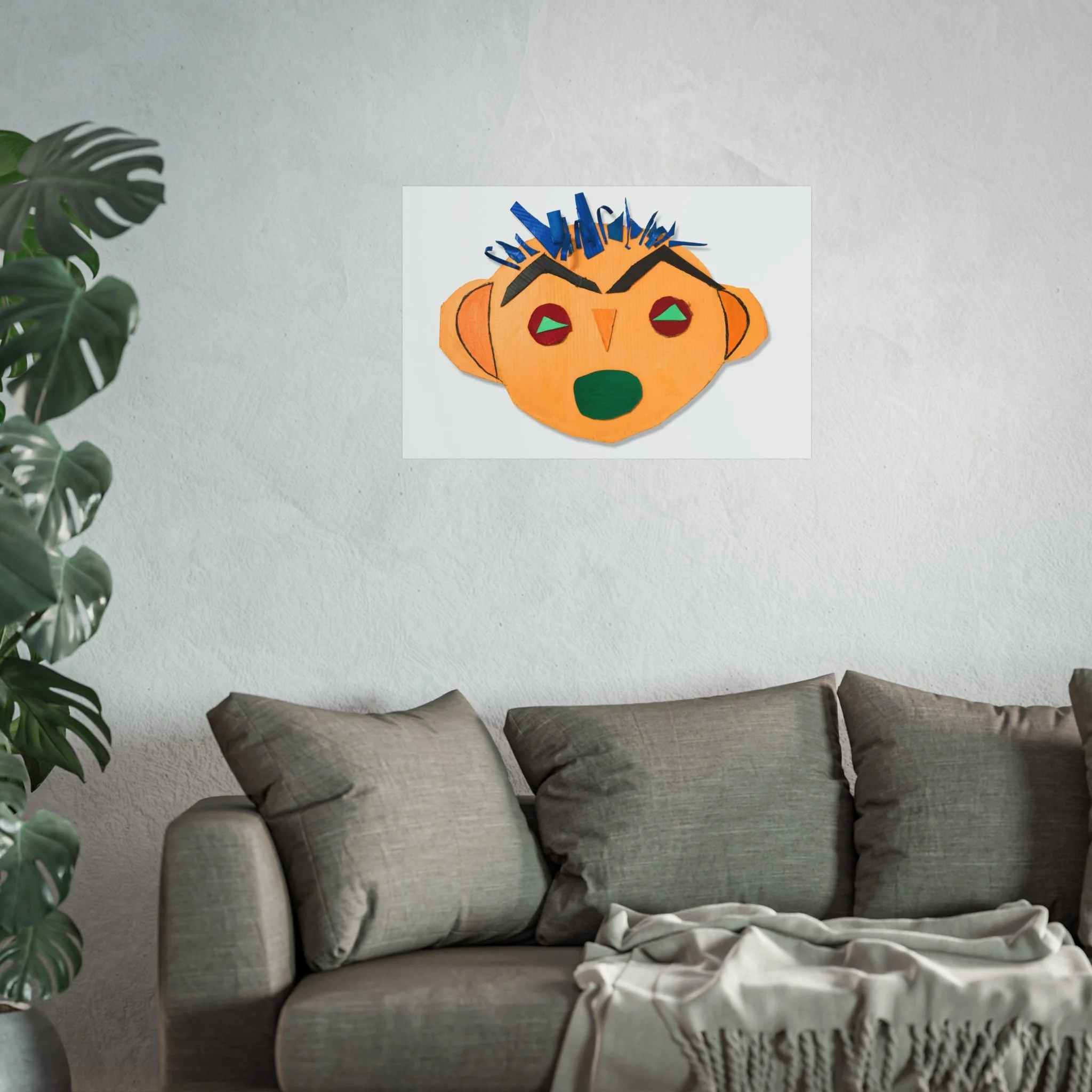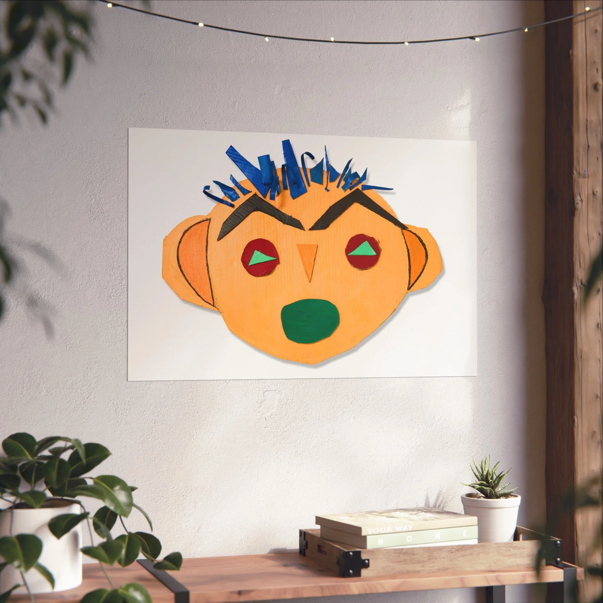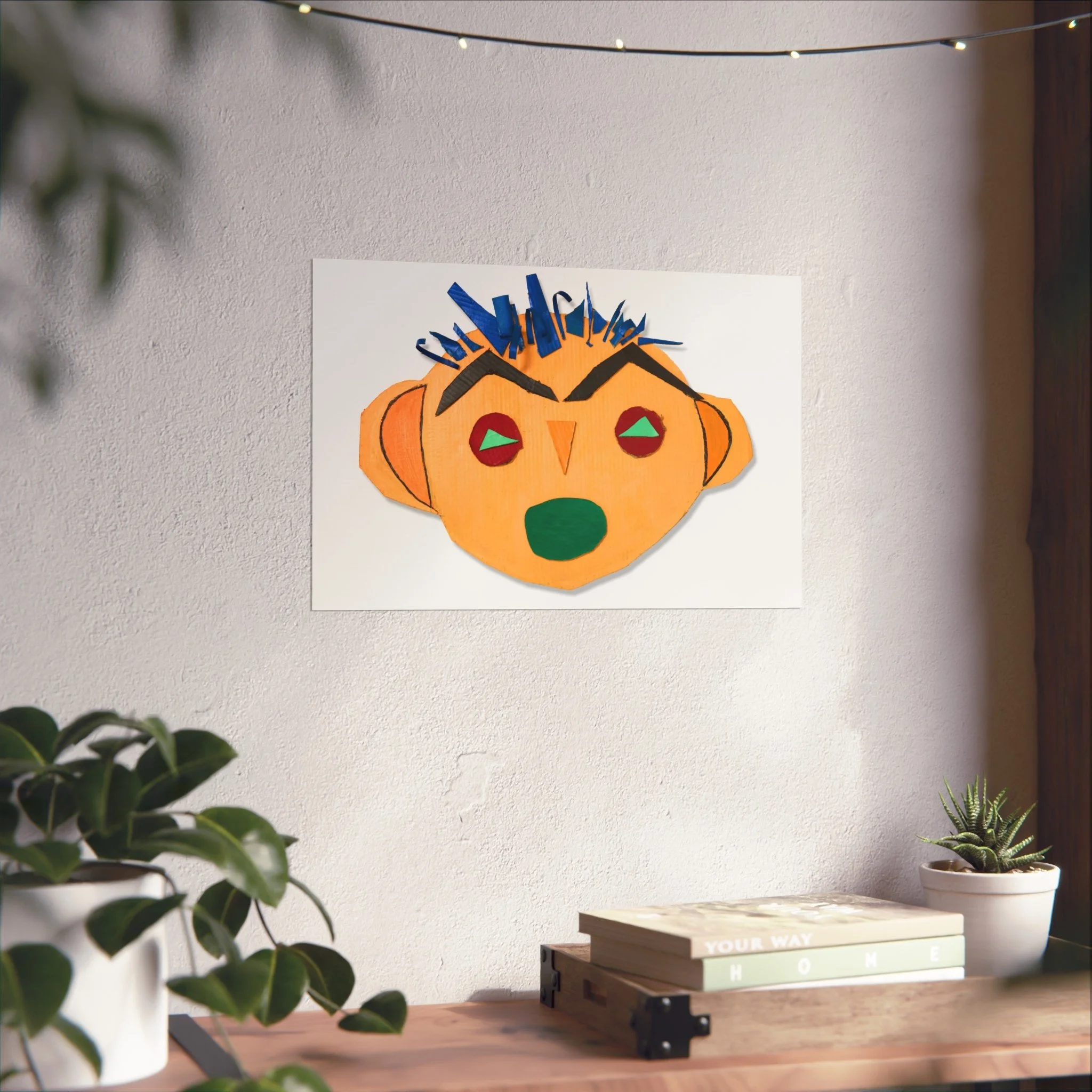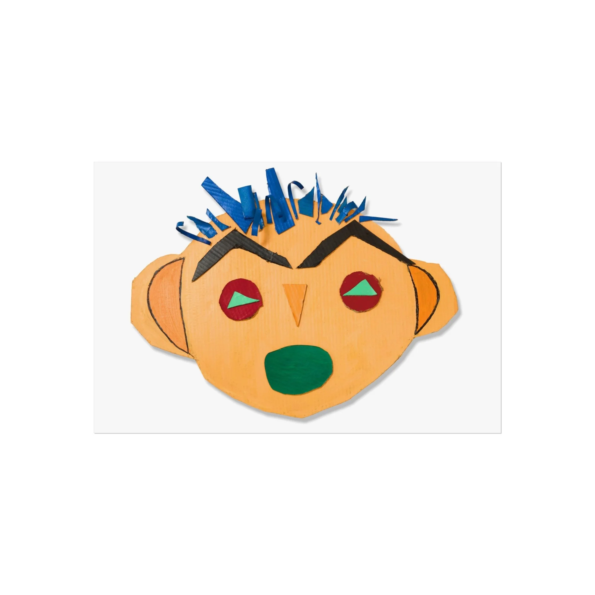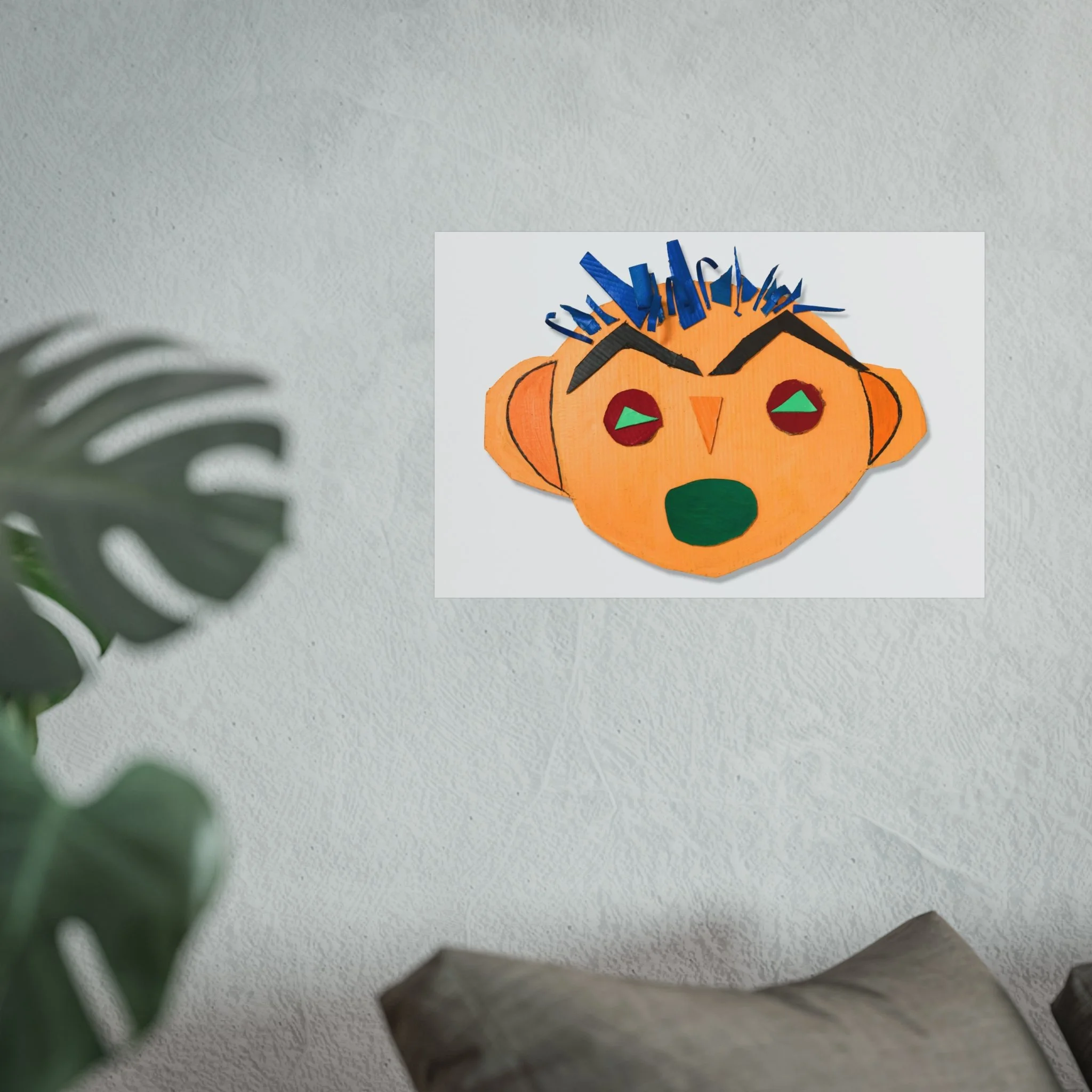 Bright, playful, and tactile — this fine art poster brings a burst of childlike imagination into a grown-up space. A bold, hand-cut collage face stares out with angular brows, a crown of blue paper spikes, and warm ochre tones that feel both primitive and modern. Printed on gallery-grade, smooth matte paper, the colors stay vivid and the surface remains luxuriously flat. Hang it where you want a room to smile: above a reading nook, in a studio, or as part of an eclectic gallery wall. It reads like a found object turned artwork — joyful, slightly mischievous, and full of personality.