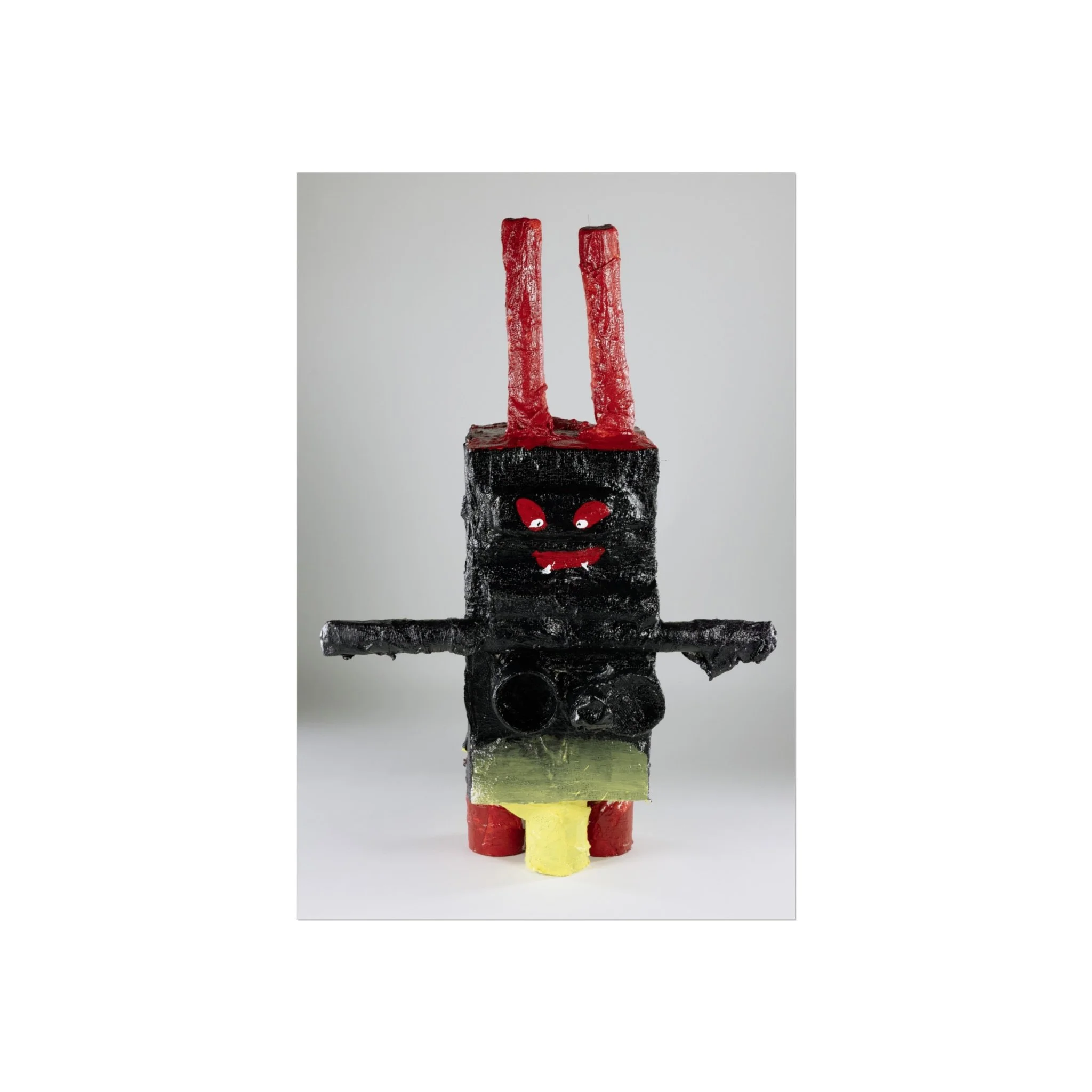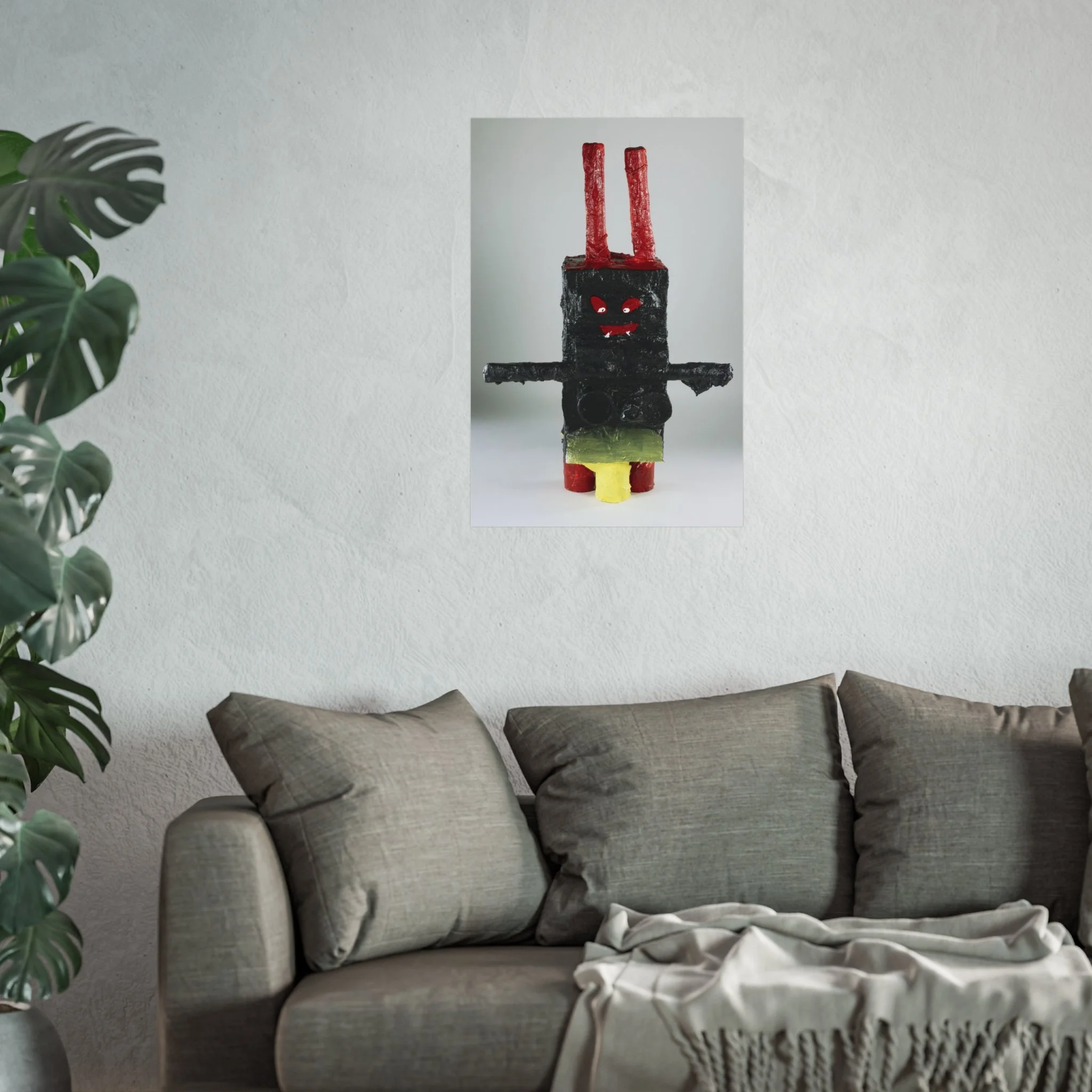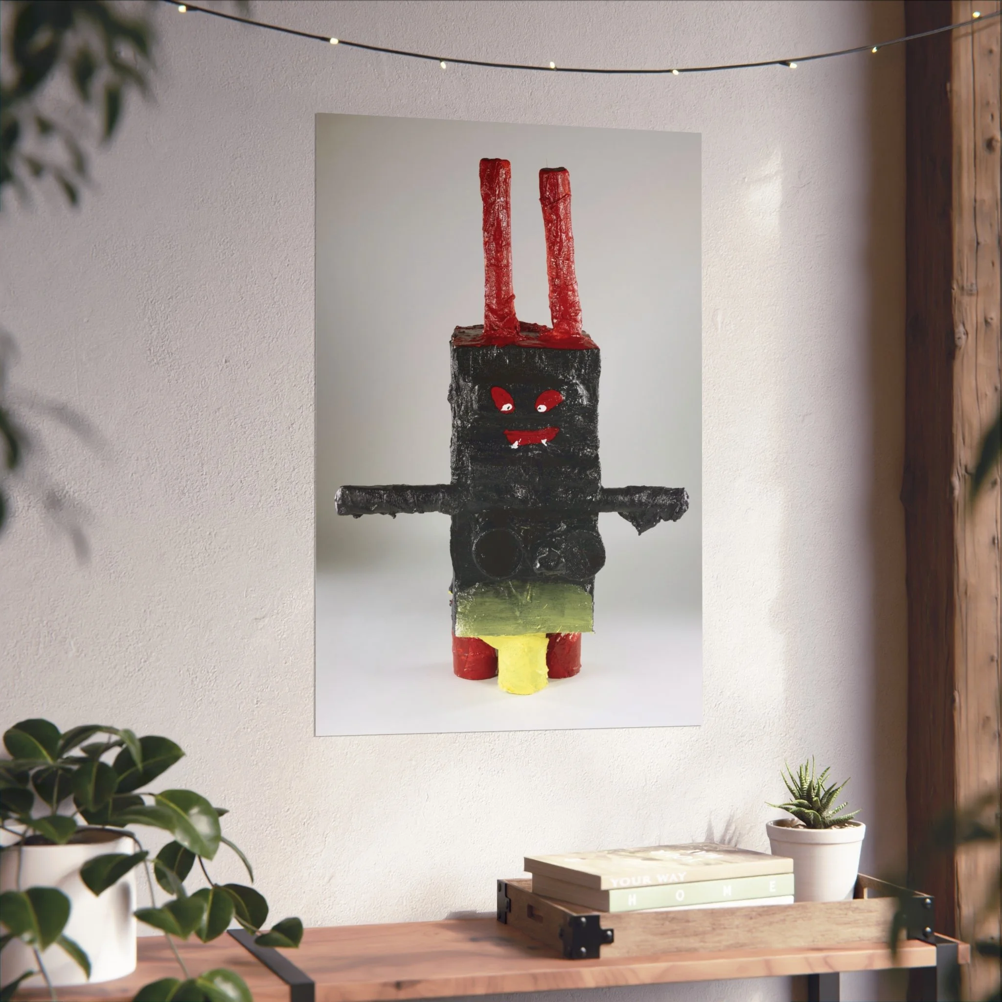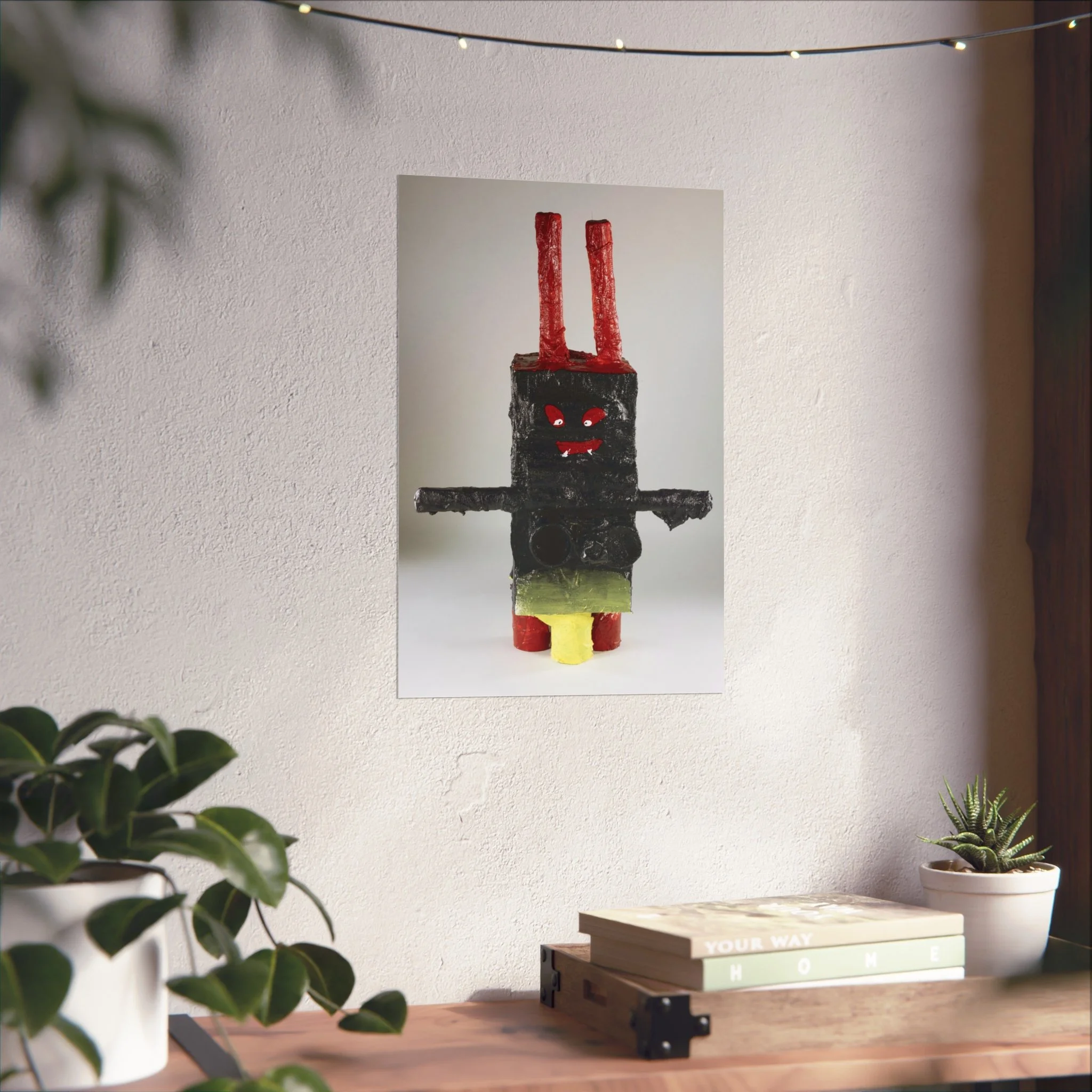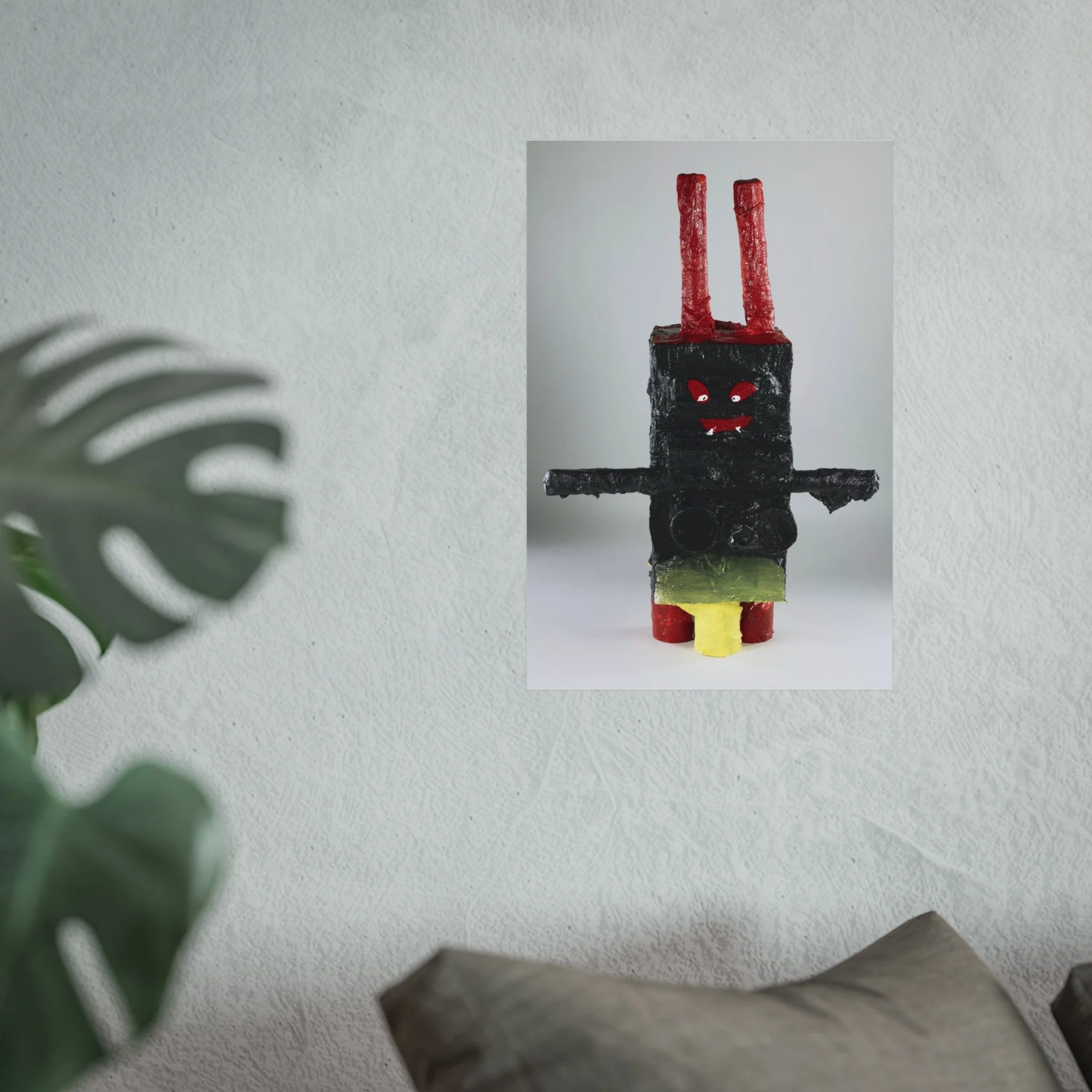 A bold fine art poster that captures playful, outsider-made charm. The image features a textured, handcrafted figure—blocky and primitive—with stark black form, bright red eyes and antennae, and pops of yellow and green. Printed with giclée quality on smooth, acid-free 220gsm paper, the piece holds deep blacks and vivid highlights while keeping a museum-ready matte surface. It sits quietly on a textured wall or above a couch, bringing a whimsical, slightly uncanny presence to a modern living room, studio, or eclectic gallery wall. This poster complements lovers of raw craft, contemporary folk art, and curious collectors who want an artwork that starts conversations and adds character to a calm, minimalist space.