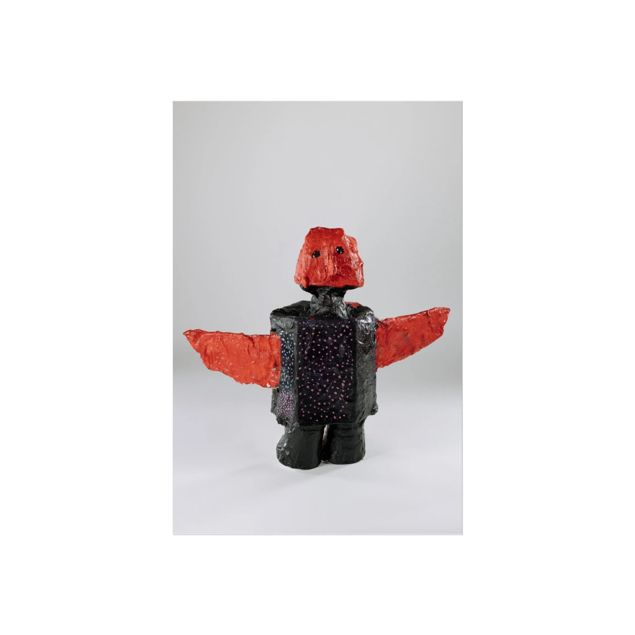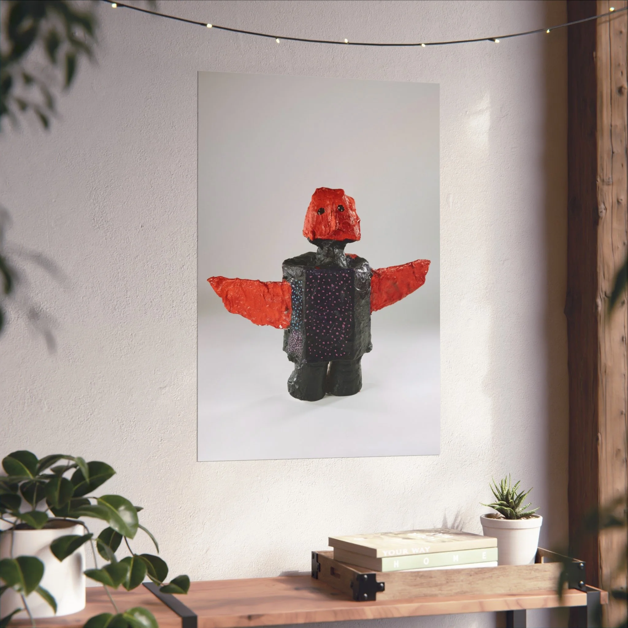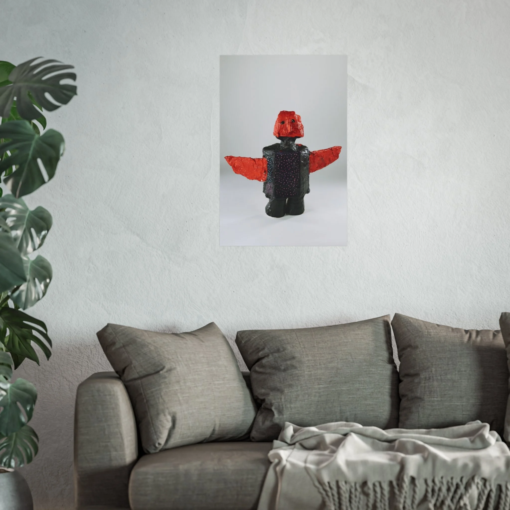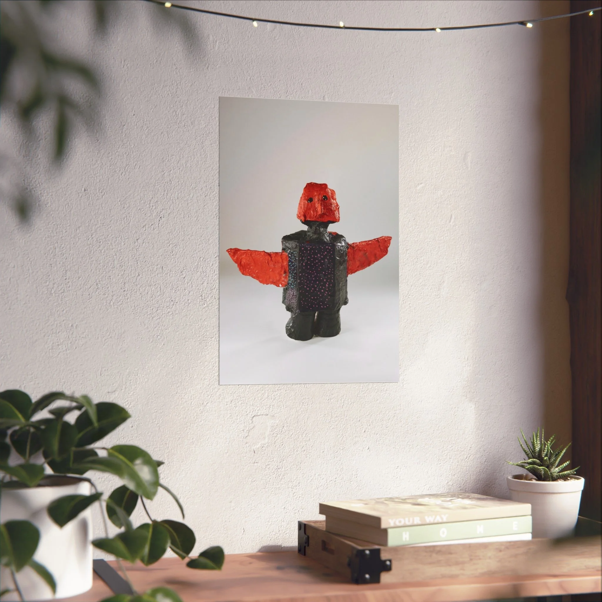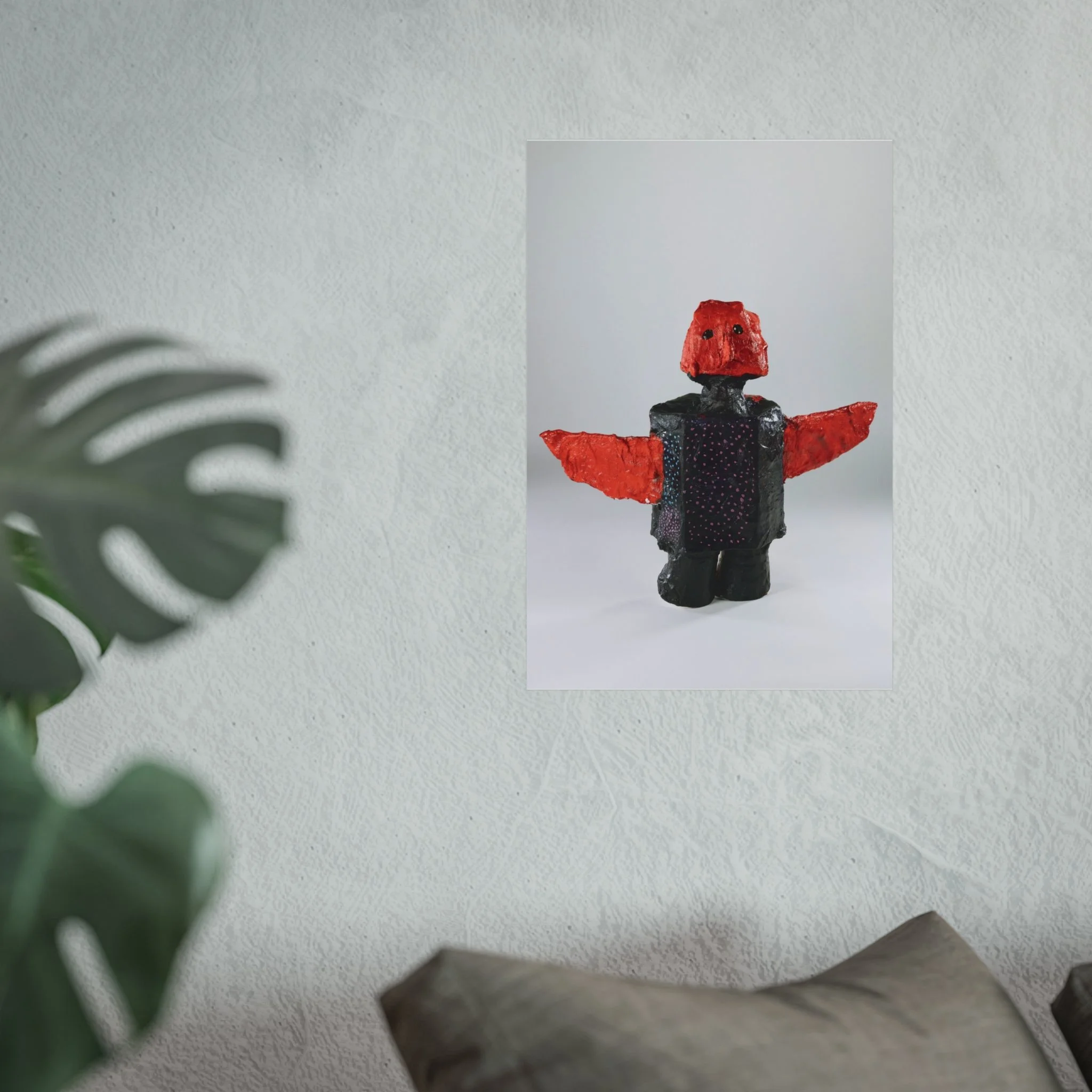 This fine art poster captures a playful, sculptural figure rendered with bold red wings and a textured, dark body. Printed on gallery-grade 220gsm acid-free paper using REACH-certified inks and giclée quality reproduction, the image keeps subtle surface details and soft matte tones intact. Hung in a living room, studio, or child's corner, the poster brings a curious, handcrafted energy—like discovering a found-object toy from a maker’s table. It reads as contemporary folk art: tactile, a little mysterious, and quietly expressive. Available in horizontal, vertical, and square formats to suit walls and frames of many sizes.