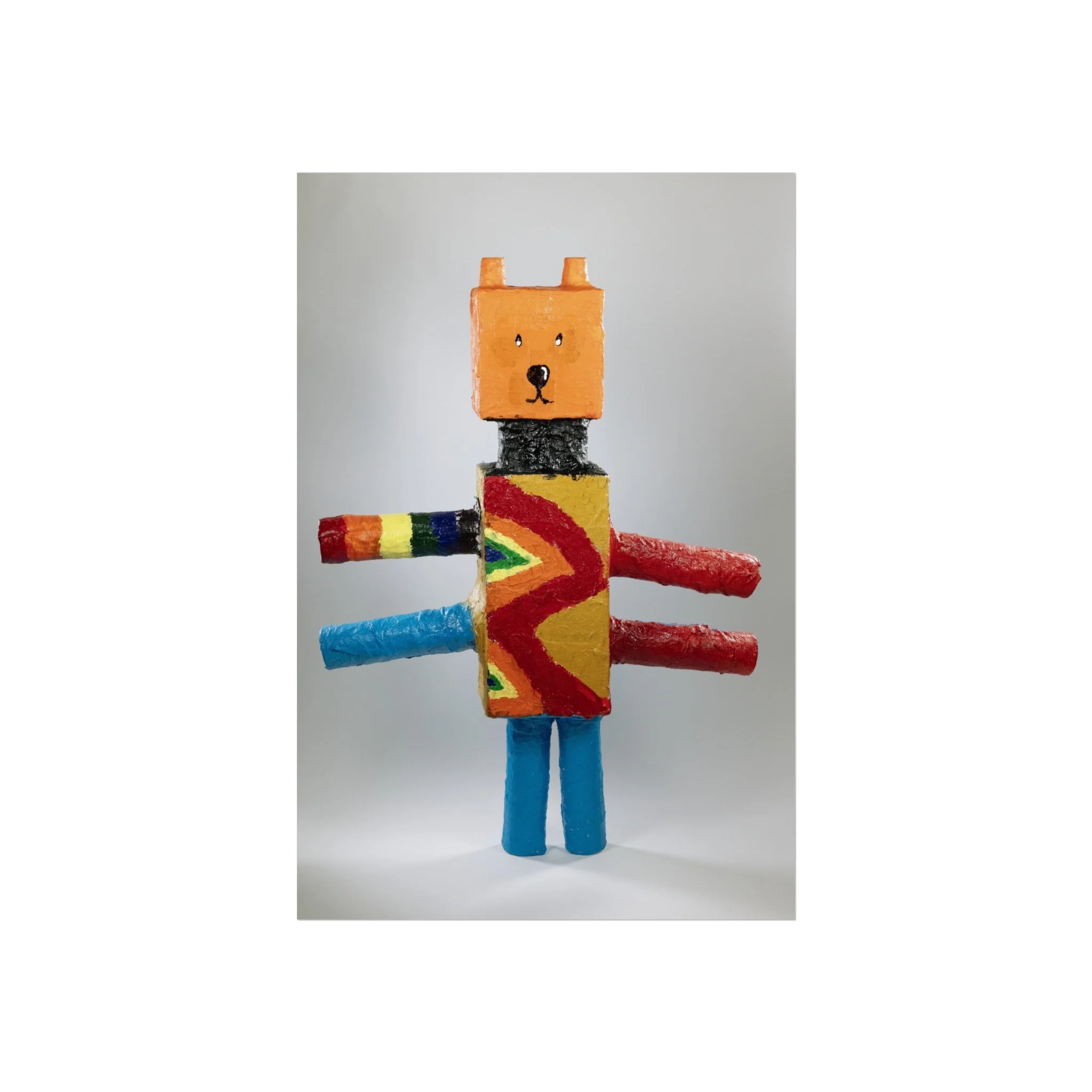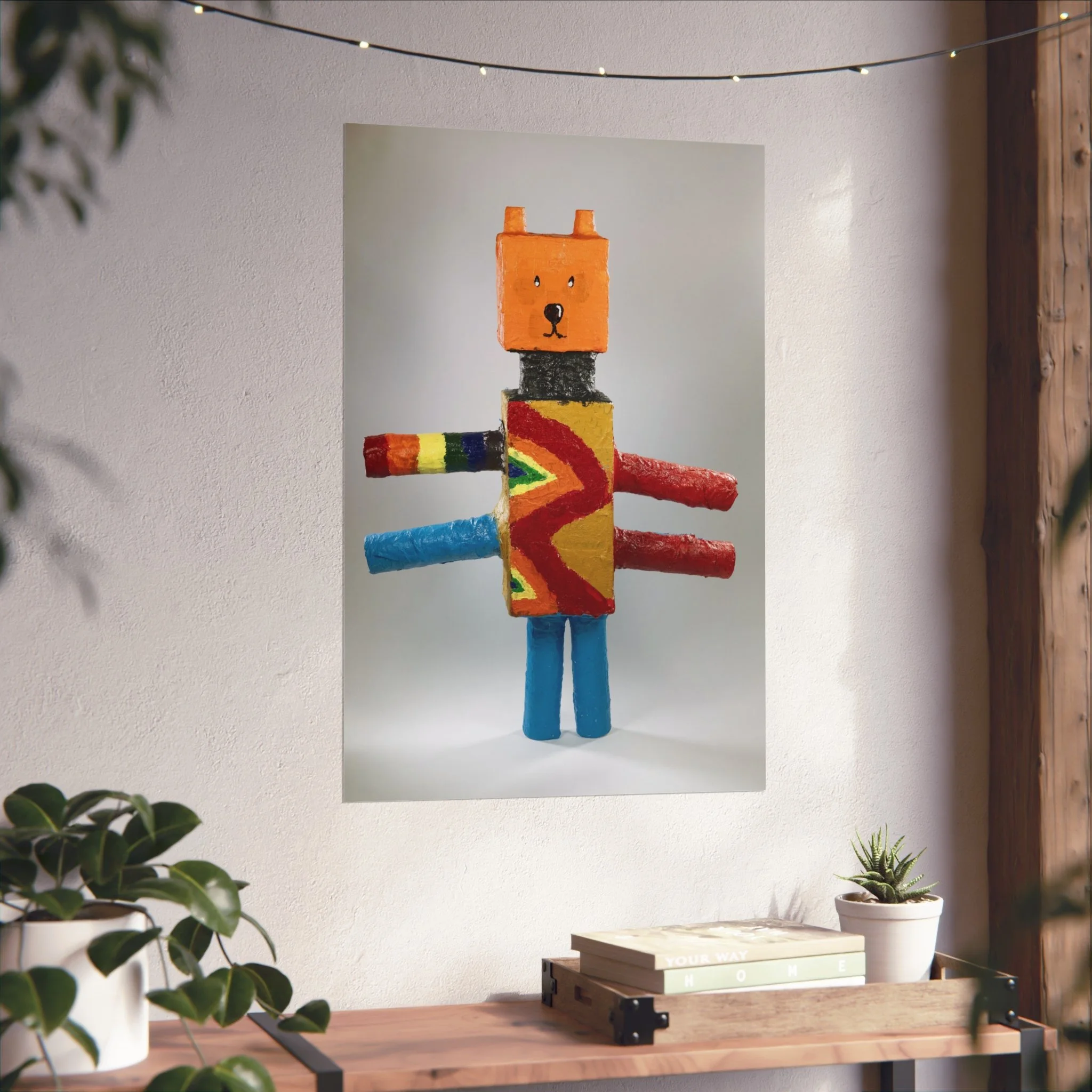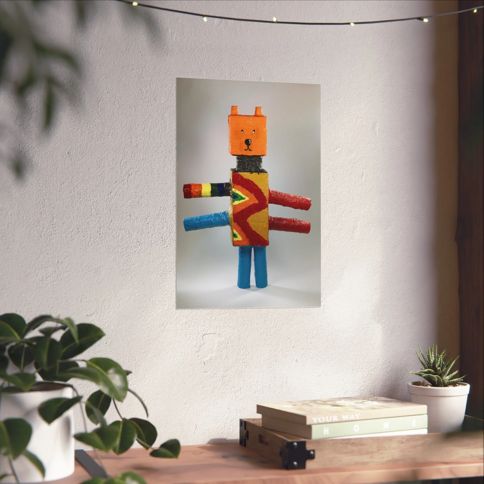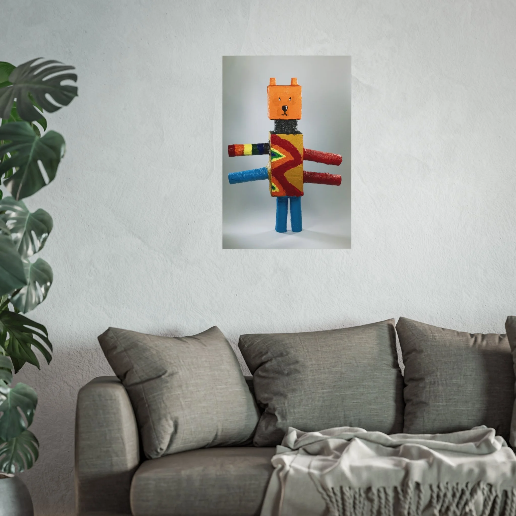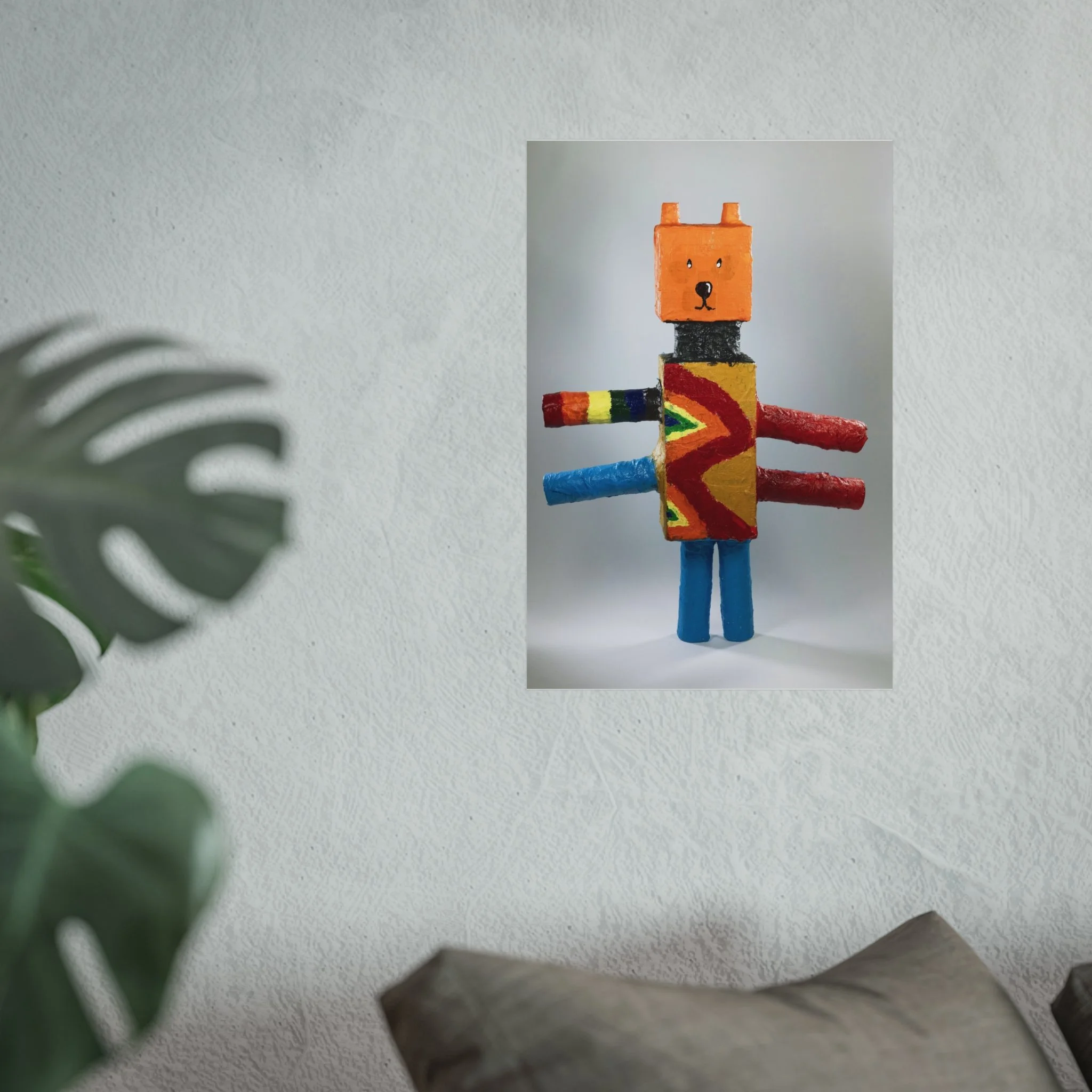 A bright, whimsical fine art poster that celebrates handmade charm and playful imagination. The image captures a blocky, toy-like character rendered in bold primary colors and textured brushstrokes — orange head, patterned torso, and colorful cylindrical limbs — set against a gently lit neutral background. Printed on gallery-grade, acid-free 220 gsm paper with giclée quality and REACH-certified inks, this piece holds color saturation and surface detail beautifully while maintaining a smooth matte finish. Available in horizontal, vertical, and square formats and multiple sizes, it slips easily into modern living rooms, nurseries, studios, or playful gallery walls. The artwork brings a warm, creative energy to a room — like a small, cheerful sculpture translated into archival print. Framing with EUTR-compliant wood options from the UK makes it an eco-conscious display choice for those who love handcrafted aesthetics and lasting quality.