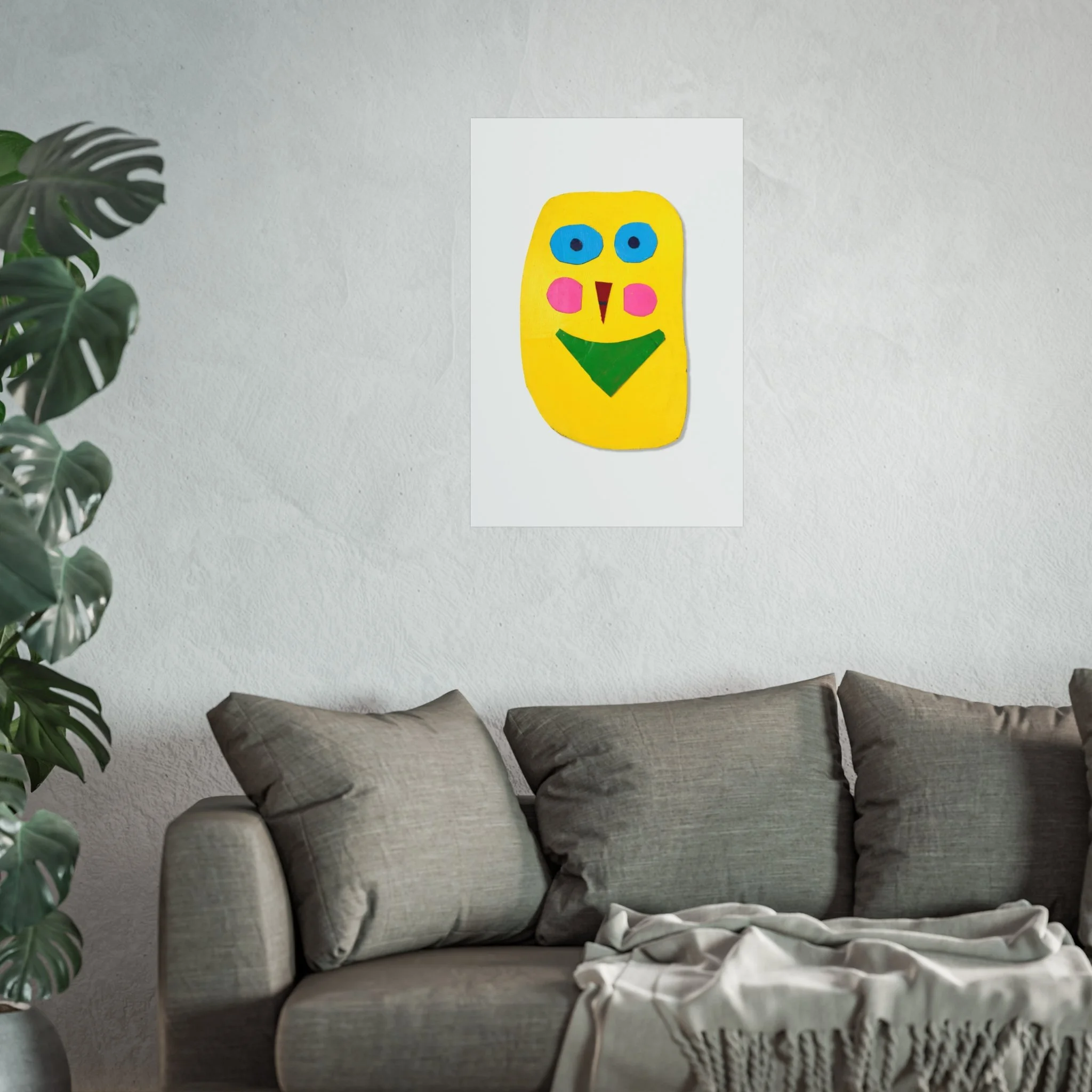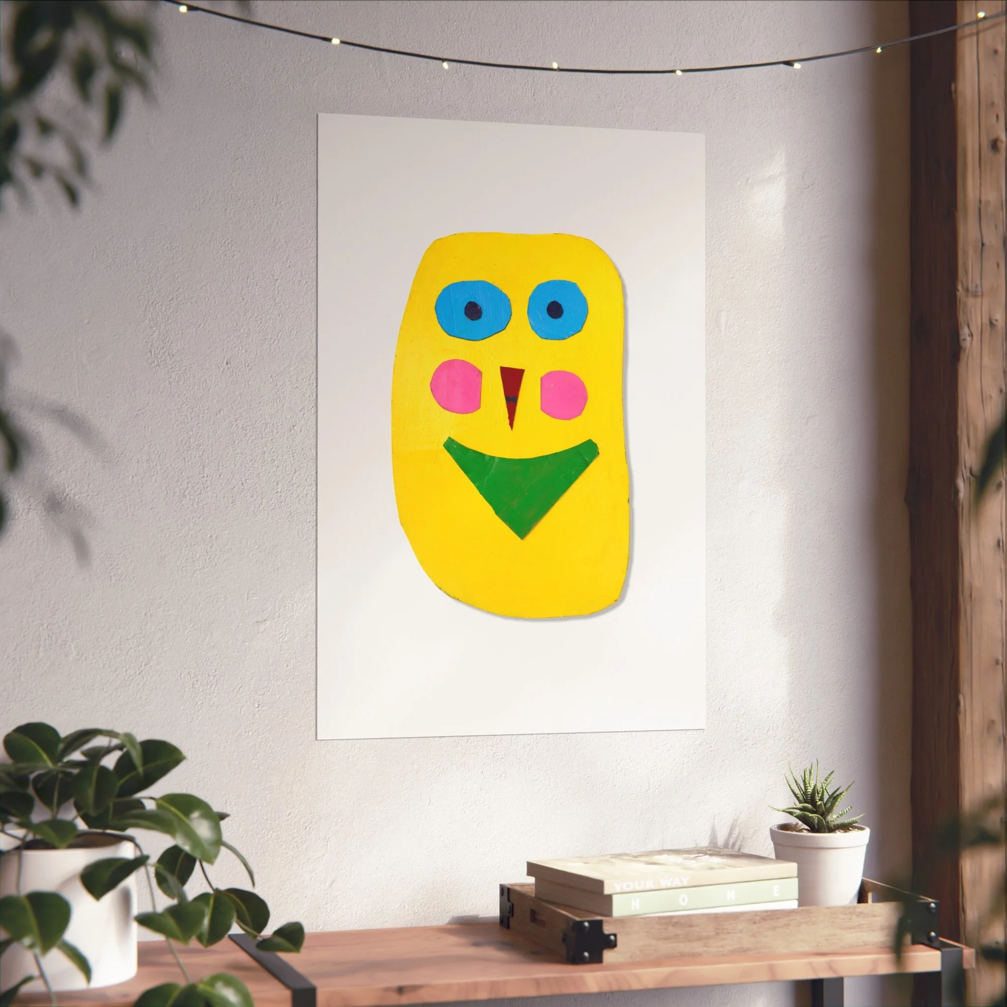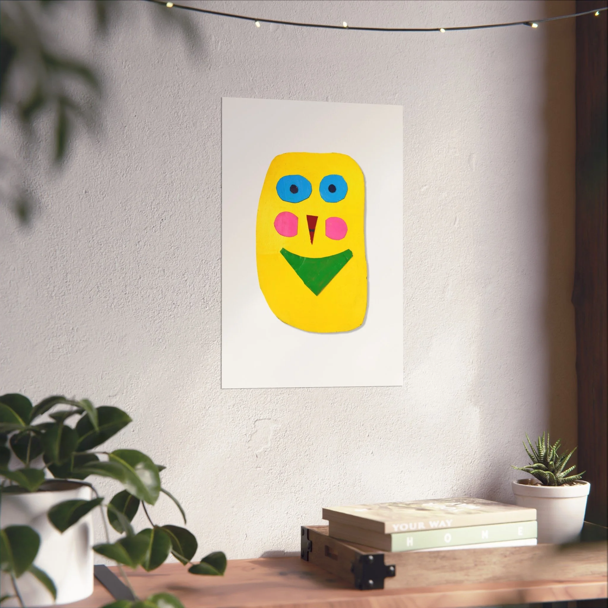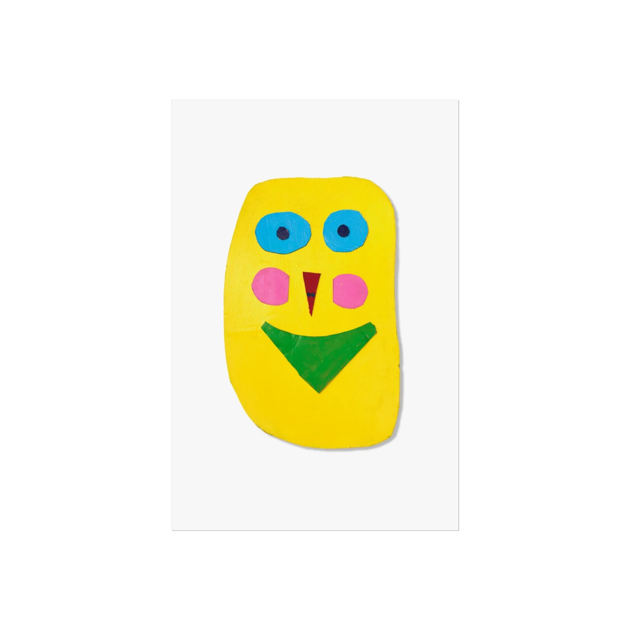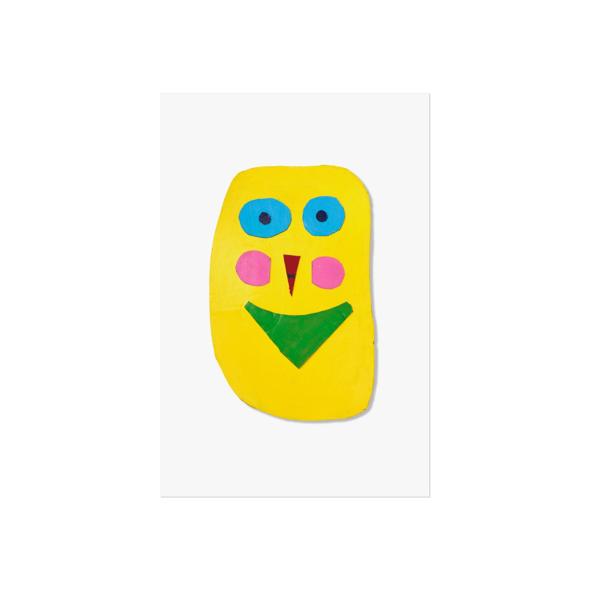 Bright, playful, and joyfully simple — this fine art poster brings a childlike burst of color to any wall. A bold yellow face with turquoise eyes, rosy cheeks, and geometric features sits on a clean white field, like a cheerful paper cut-out pinned to the page. The smooth, gallery-grade matte finish and giclée print quality let the saturated pigments read true, while sturdy 220gsm acid-free paper keeps the print flat and archival. Hang it above a reading nook, in a nursery, or lean it on a shelf to add an instant note of warmth and whimsy to everyday spaces.