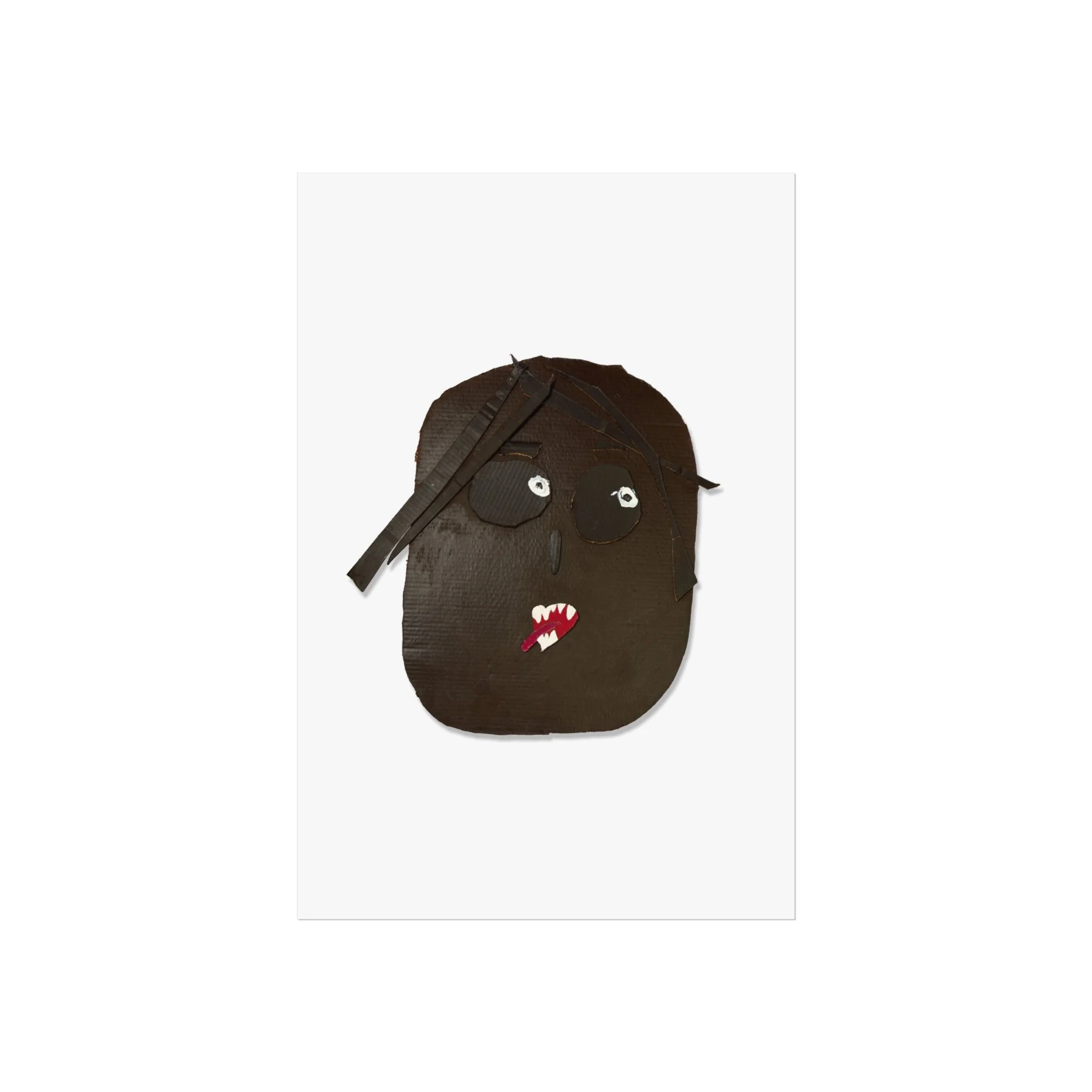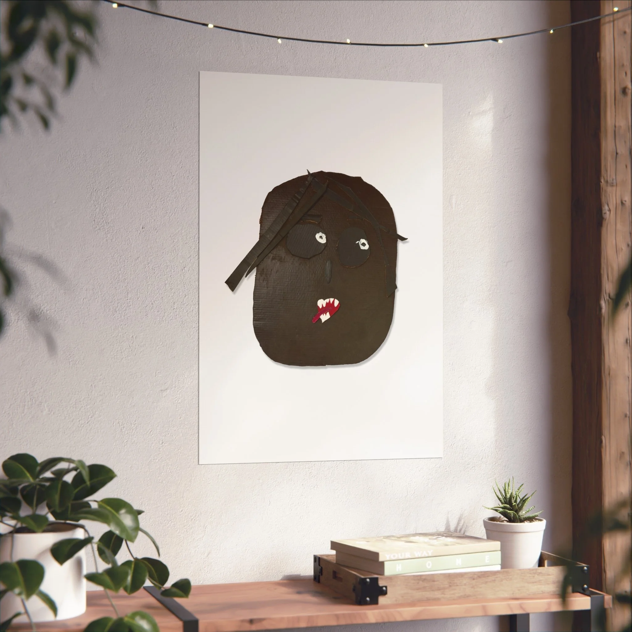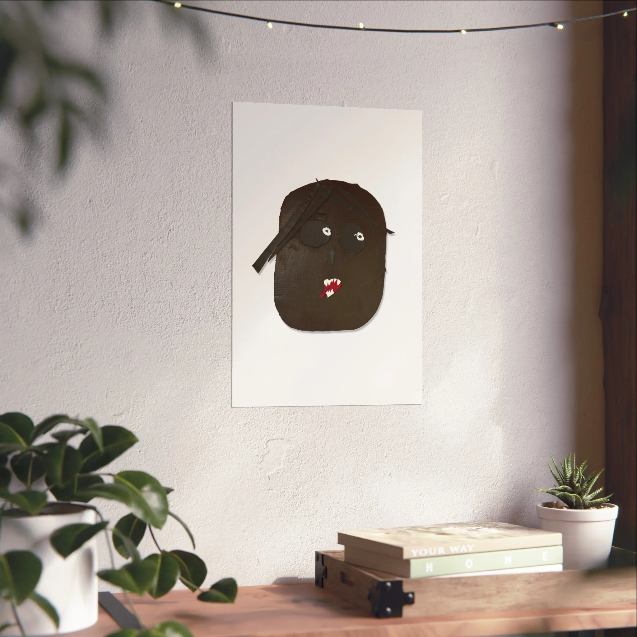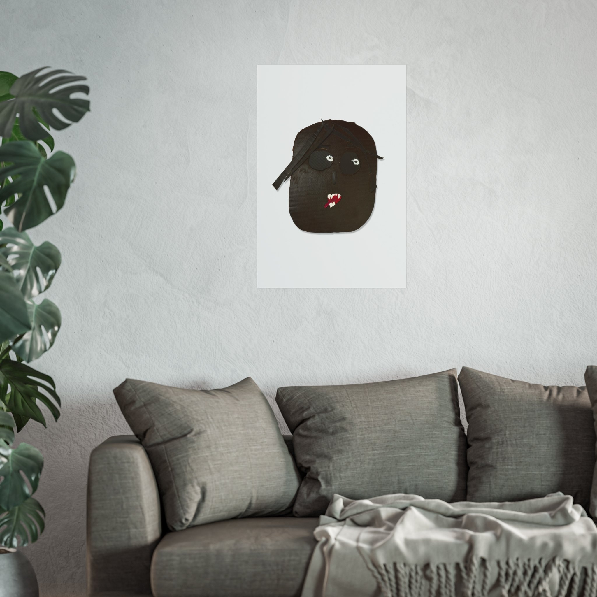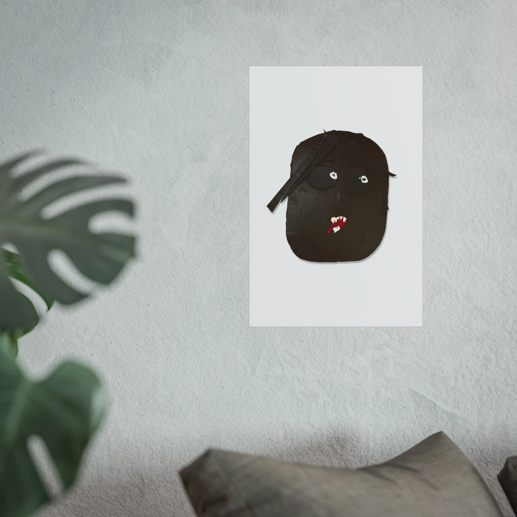 This fine art poster presents a raw, expressive face rendered in deep, velvety tones against a clean matte field. The piece feels intimate and slightly unsettling — a study in texture, shadow and small, striking details like the white, wide-set eyes and the sudden flash of red at the mouth. Printed giclée on smooth, gallery-grade 220gsm acid-free paper, the image holds rich blacks and subtle surface variations that invite closer looking. Hung above a reading nook or in a compact gallery wall, it brings a quiet, moody presence and a touch of outsider art energy to a contemporary interior.