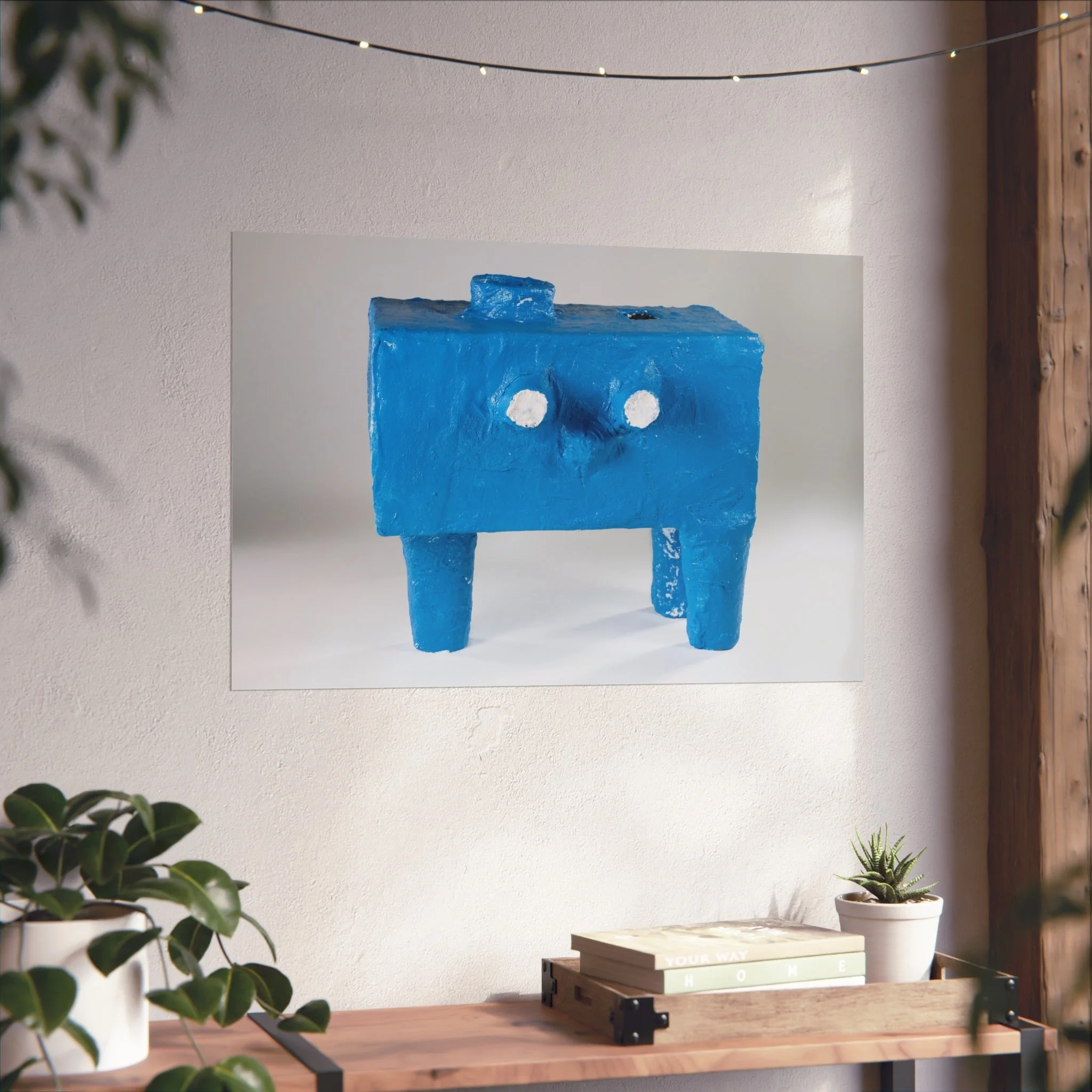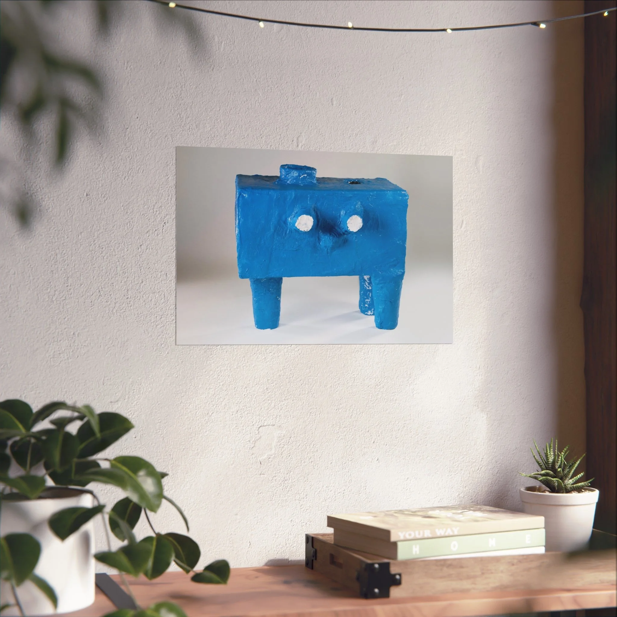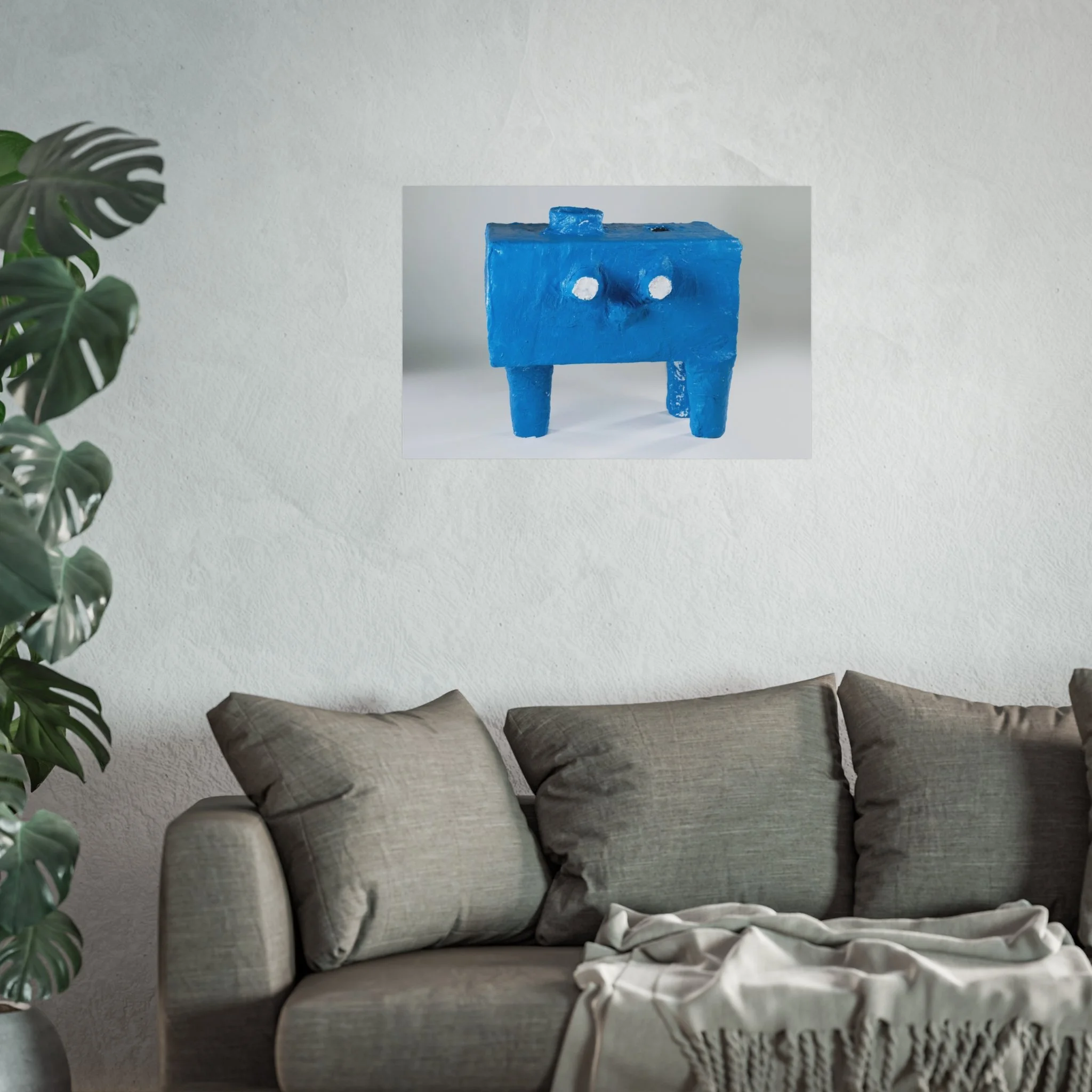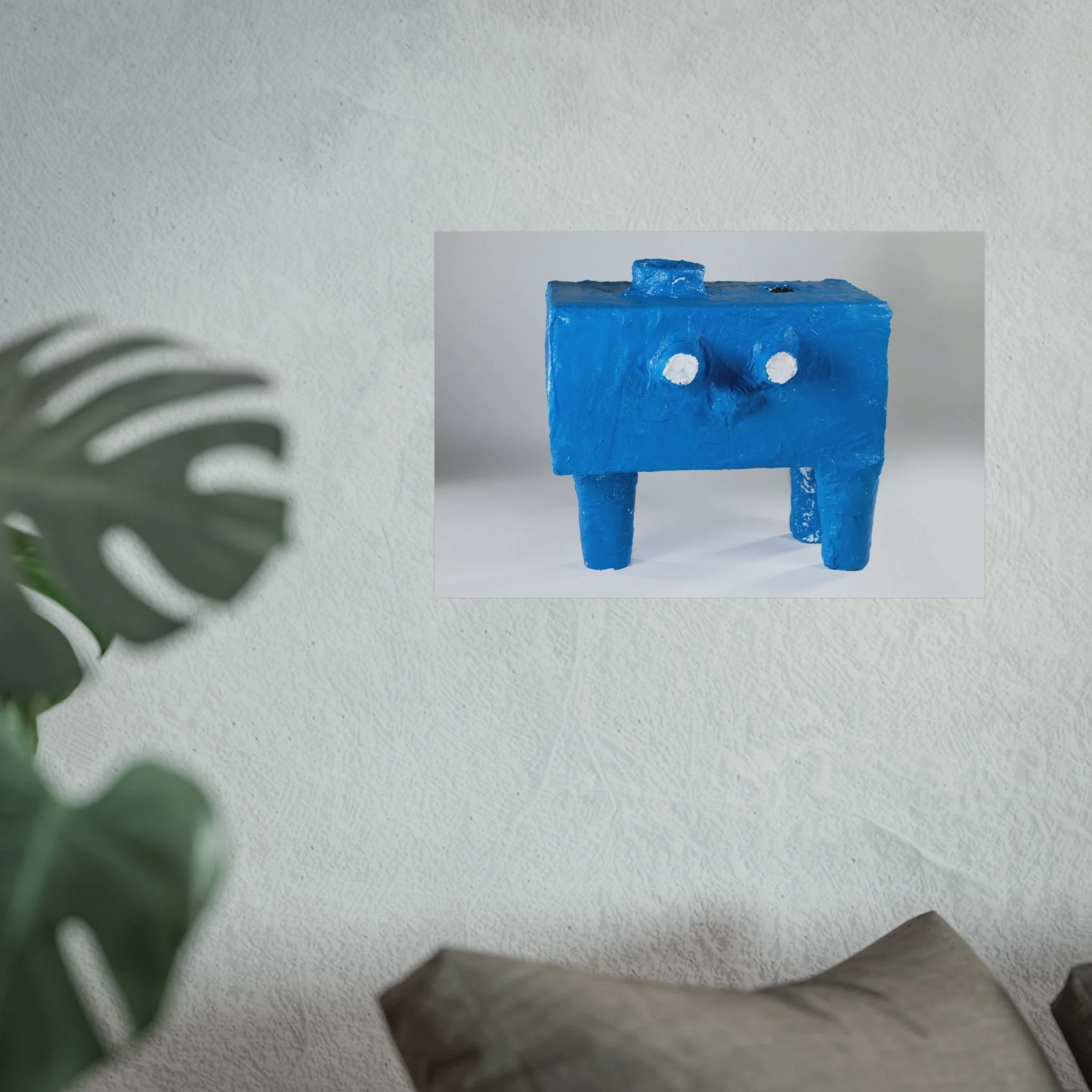 A fine art poster that brings a playful, sculptural presence to any wall. Printed on smooth, gallery-grade 220 gsm acid-free paper with giclée-quality REACH-certified inks, this matte-finish print captures the texture and bold blue of the original handmade piece. The quirky, minimalist subject — a small rectangular figure with stubby legs and bright eyes — reads like modern folk art. Hung alone or in a grouped arrangement, it adds a quiet, curious energy to a living room, studio, or child-friendly nook. Available in horizontal, vertical, and square formats across multiple sizes, this poster arrives ready to frame and enjoy for years without yellowing or loss of color.