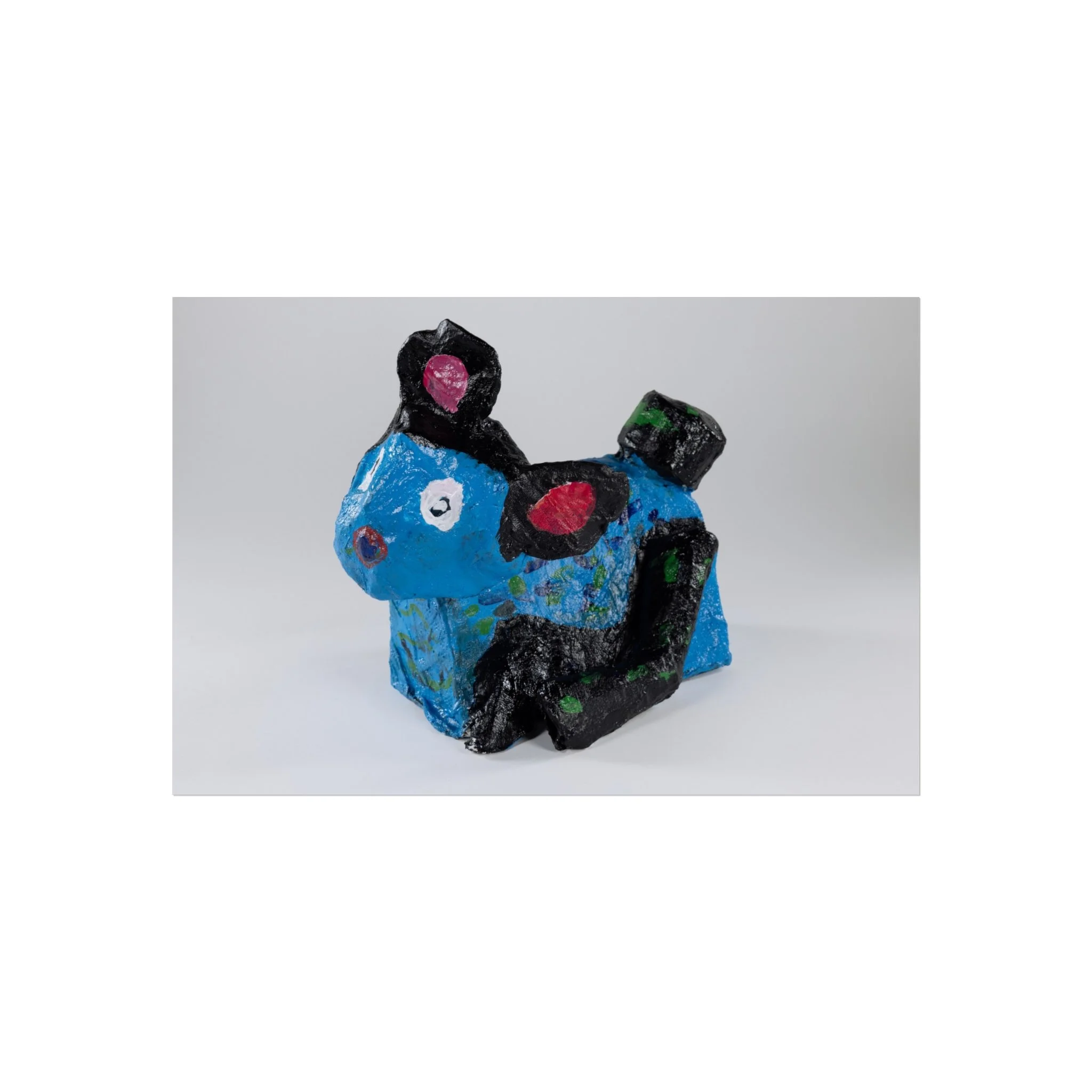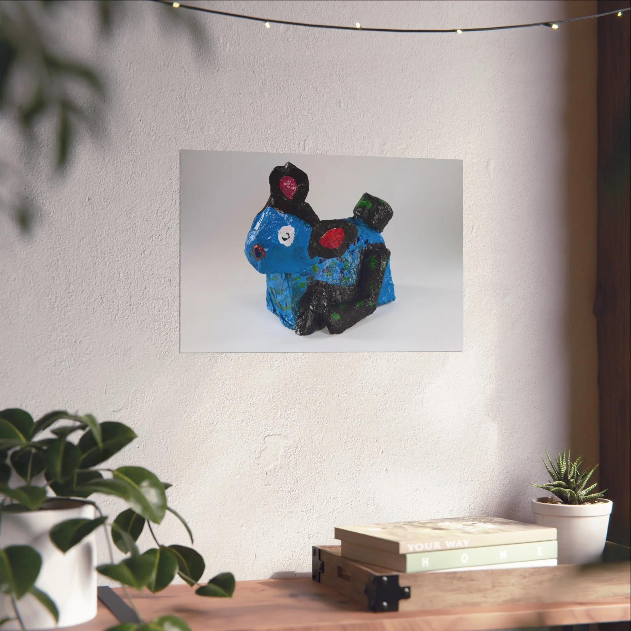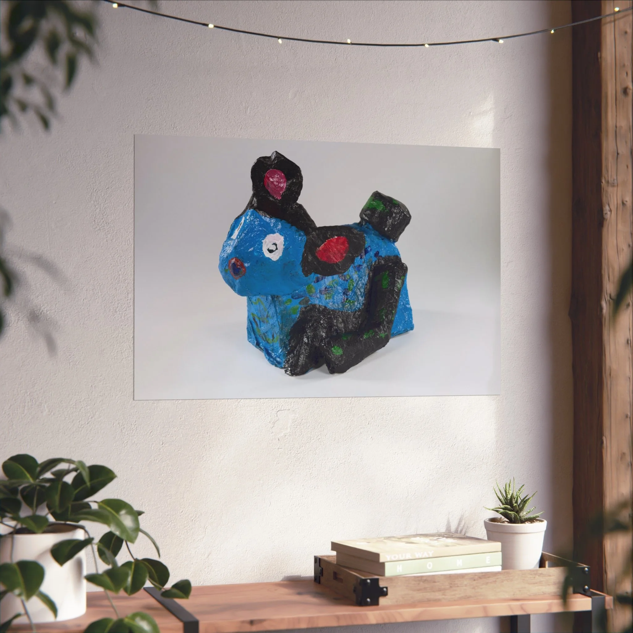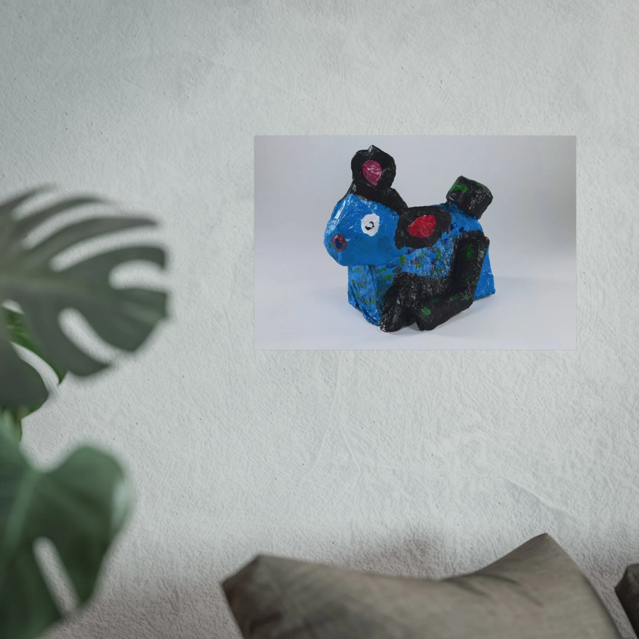 A bright, gallery-style poster that captures playful, handcrafted charm. The artwork reproduces a colorful papier-mâché creature—bold blues, playful pinks and deep blacks—printed with exceptional giclée quality on smooth, acid-free 220gsm fine art paper. The matte finish keeps glare low and colors true, so the piece feels like a window into a whimsical studio moment. Hung in a hallway, children's room, or creative nook, this poster brings a handcrafted, joyful energy to the space and pairs naturally with neutral walls and natural textures.