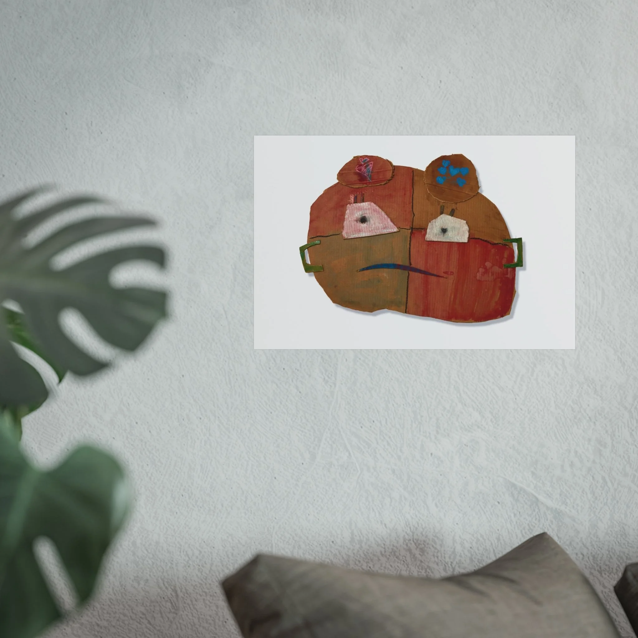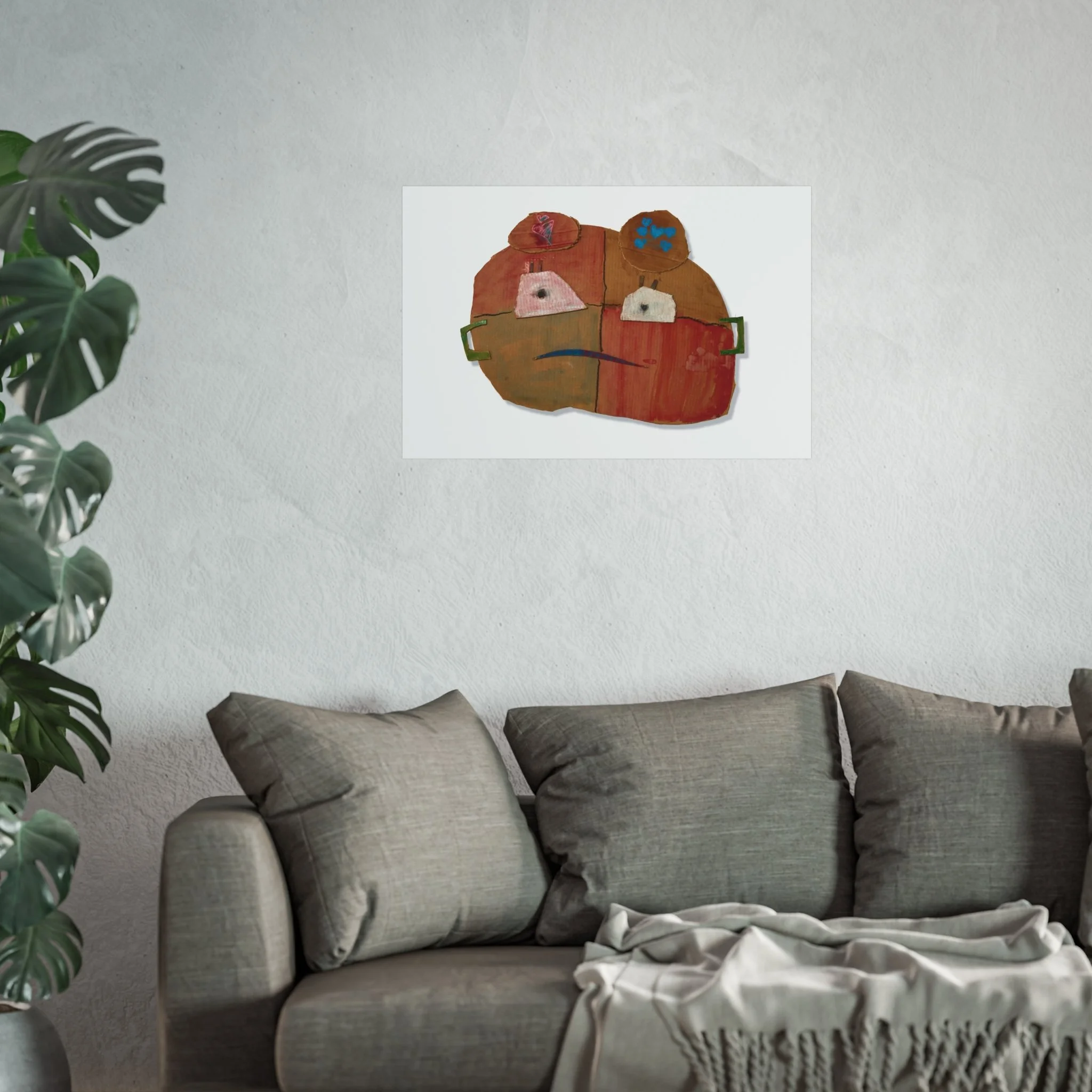 A small, soulful abstract face rendered in warm terracotta tones — this fine art poster brings a playful, human touch to modern spaces. The muted oranges and soft blues feel handcrafted, like a quiet studio piece rescued from an artist’s sketchbook. Hung above a couch or in a narrow hallway, it invites a second look: the uneven lines, stitched shapes and subtle texture make the piece feel lived-in and intimate. For collectors of contemporary folk and experimental studio work, this print slides easily into curated walls, cozy reading nooks, or creative workspaces, adding a hint of whimsy and honest imperfection to the room.