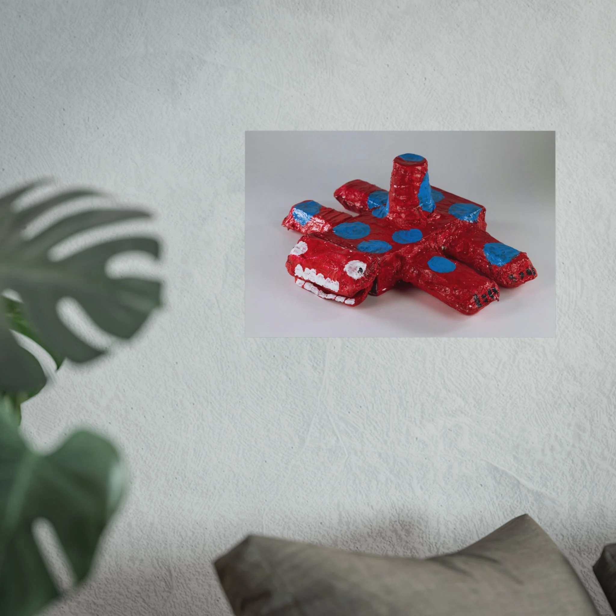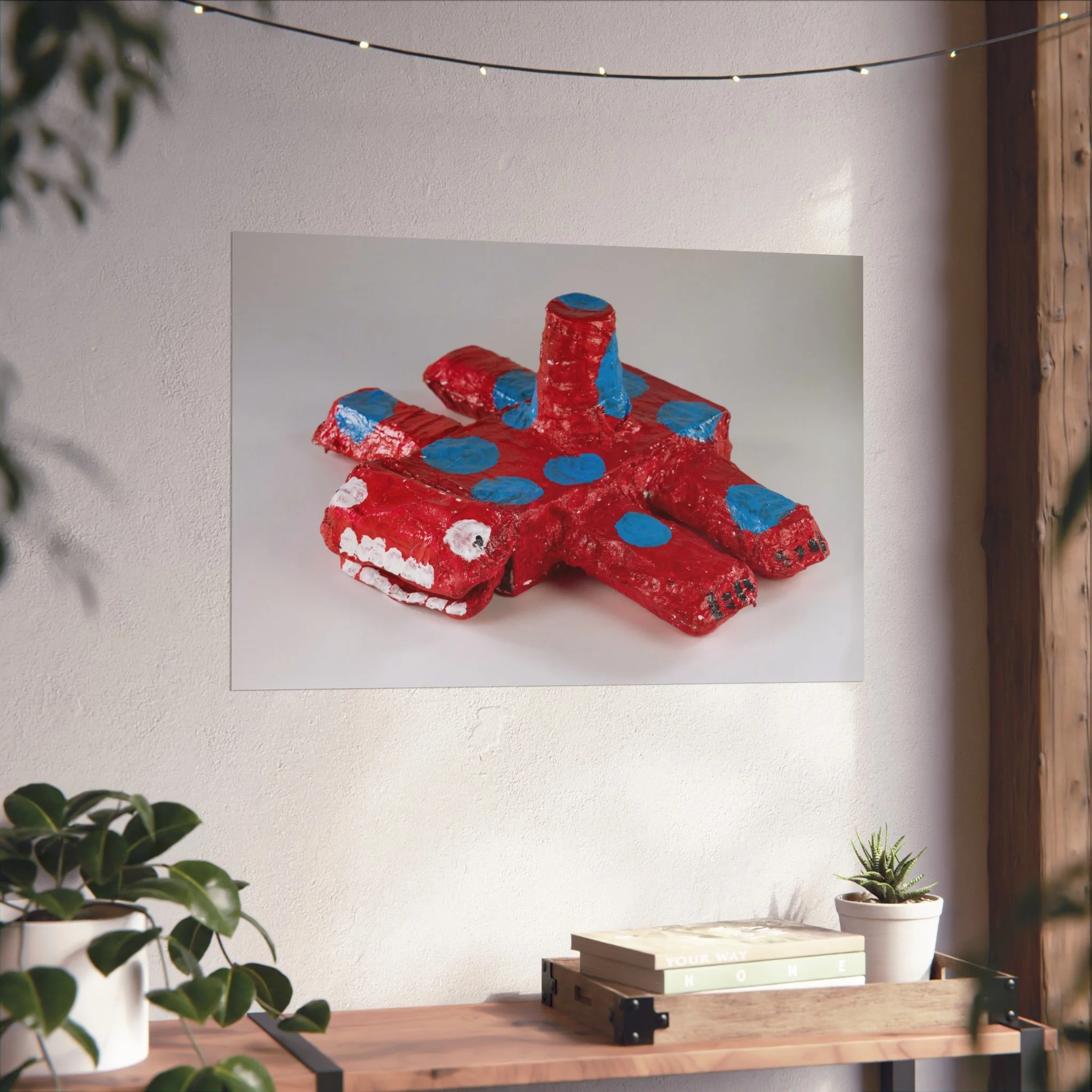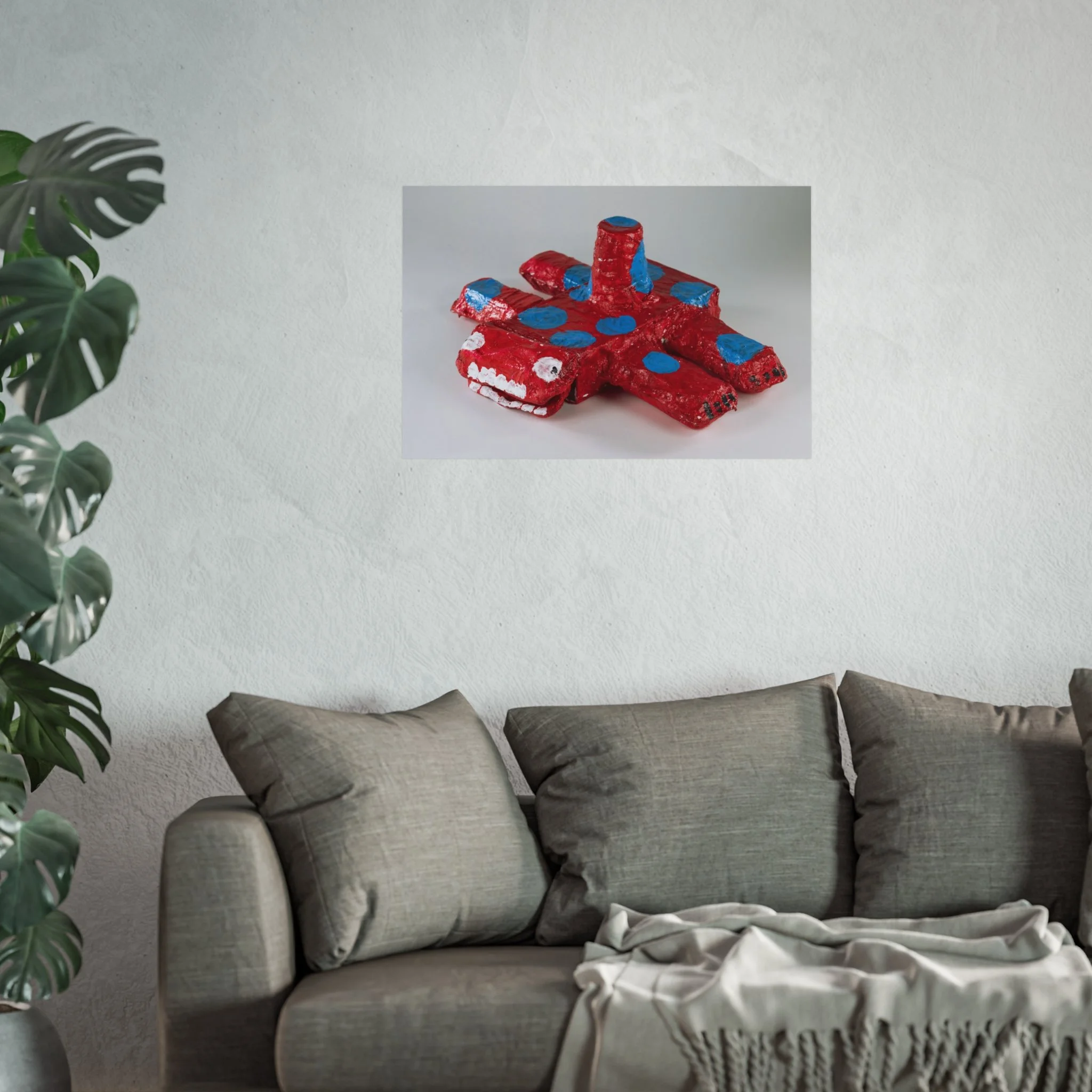 A vibrant fine art poster capturing a playful, hand-crafted sculpture in bold reds and sky blues. The image brings a touch of naïve creativity and tactile charm to any wall—its chunky, whimsical form reads like a joyful relic from a community art project or a child’s imagination grown up. Printed on gallery-grade paper with a smooth matte surface and giclée-quality inks, the colors stay rich and textured without glare. Hang it in a relaxed living room, a creative studio, or a kid-friendly corner to spark conversation and brighten the room with an offbeat, handmade energy.