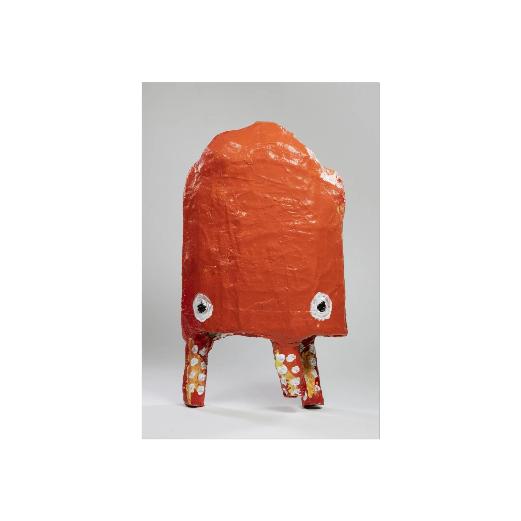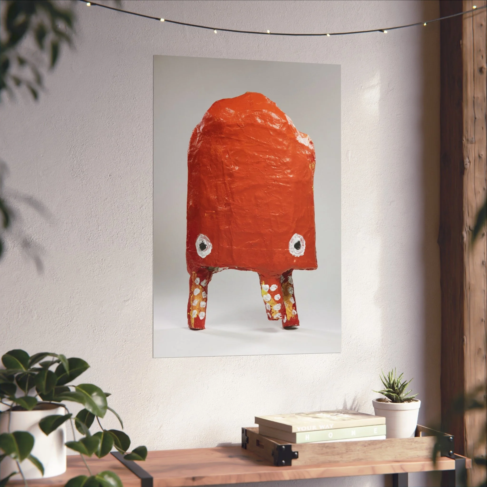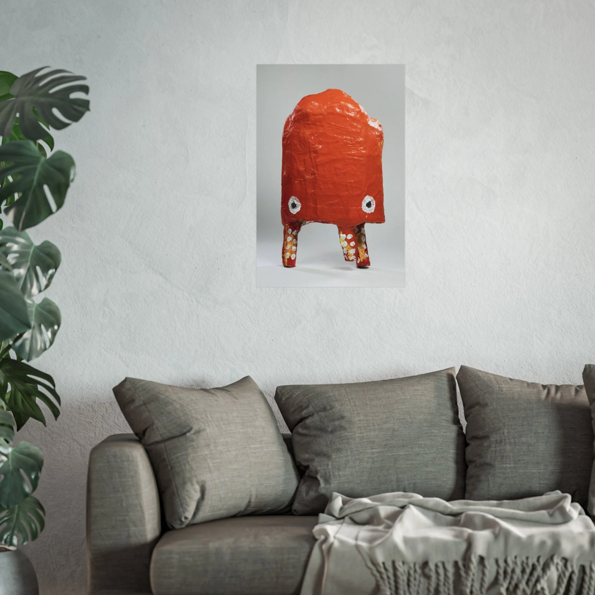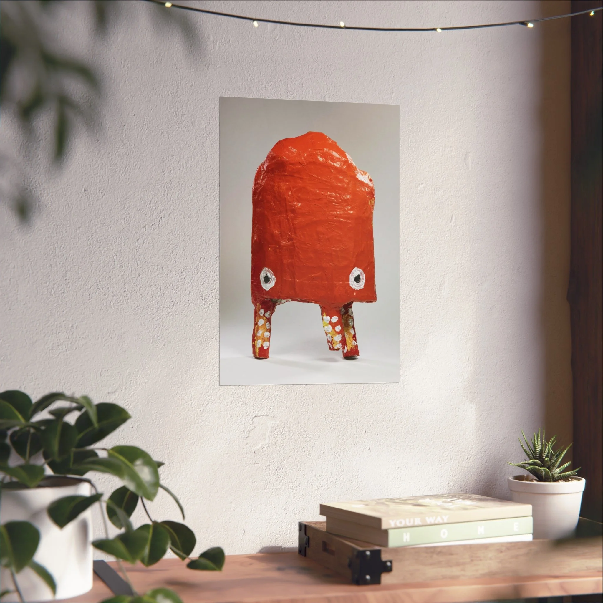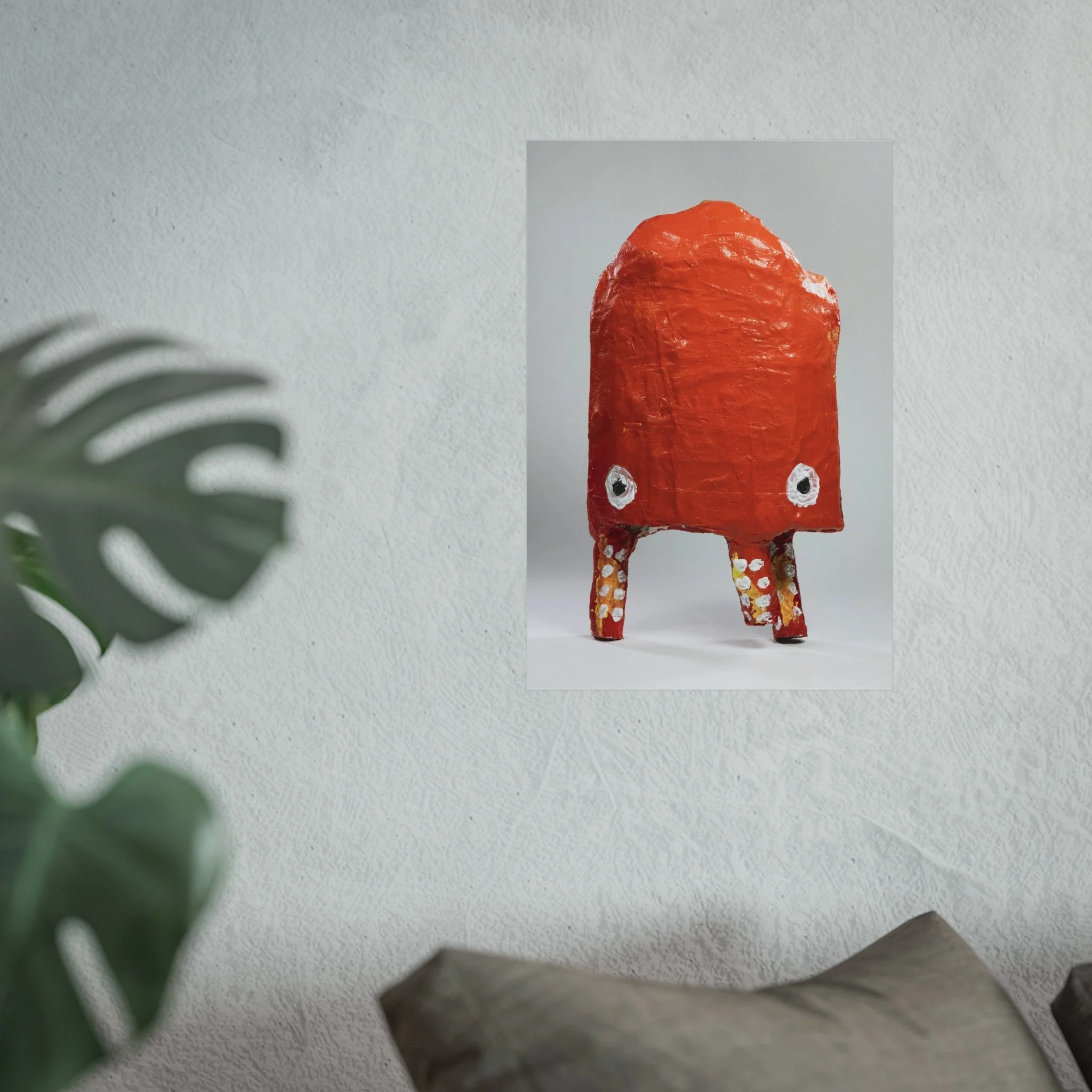 A small, joyful art print that brings a playful, handmade spirit to any wall. The image features a charming, red-orange sculptural figure with simple white eyes and patterned legs — a mix of childlike wonder and contemporary folk art. Printed on smooth, gallery-grade 220gsm paper with giclée quality and a soft matte finish, the colors hold rich and tactile detail without glare. Hung in a living room, studio, or hallway, this poster adds an offbeat, warm presence that sparks conversations and invites smiles.