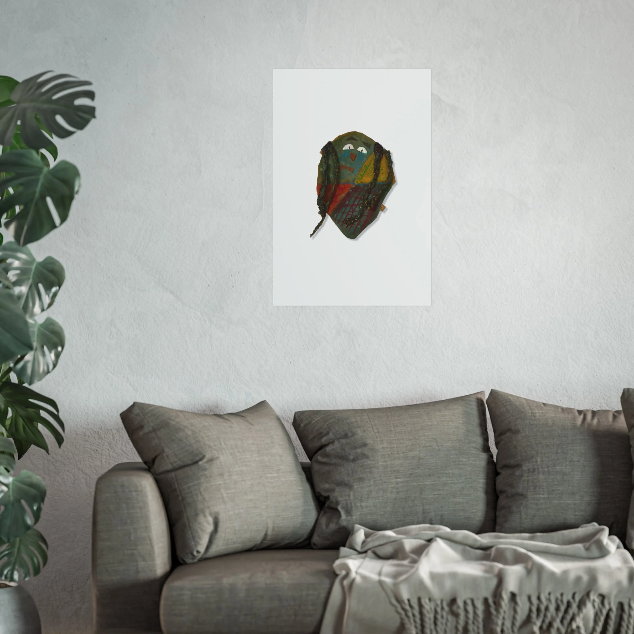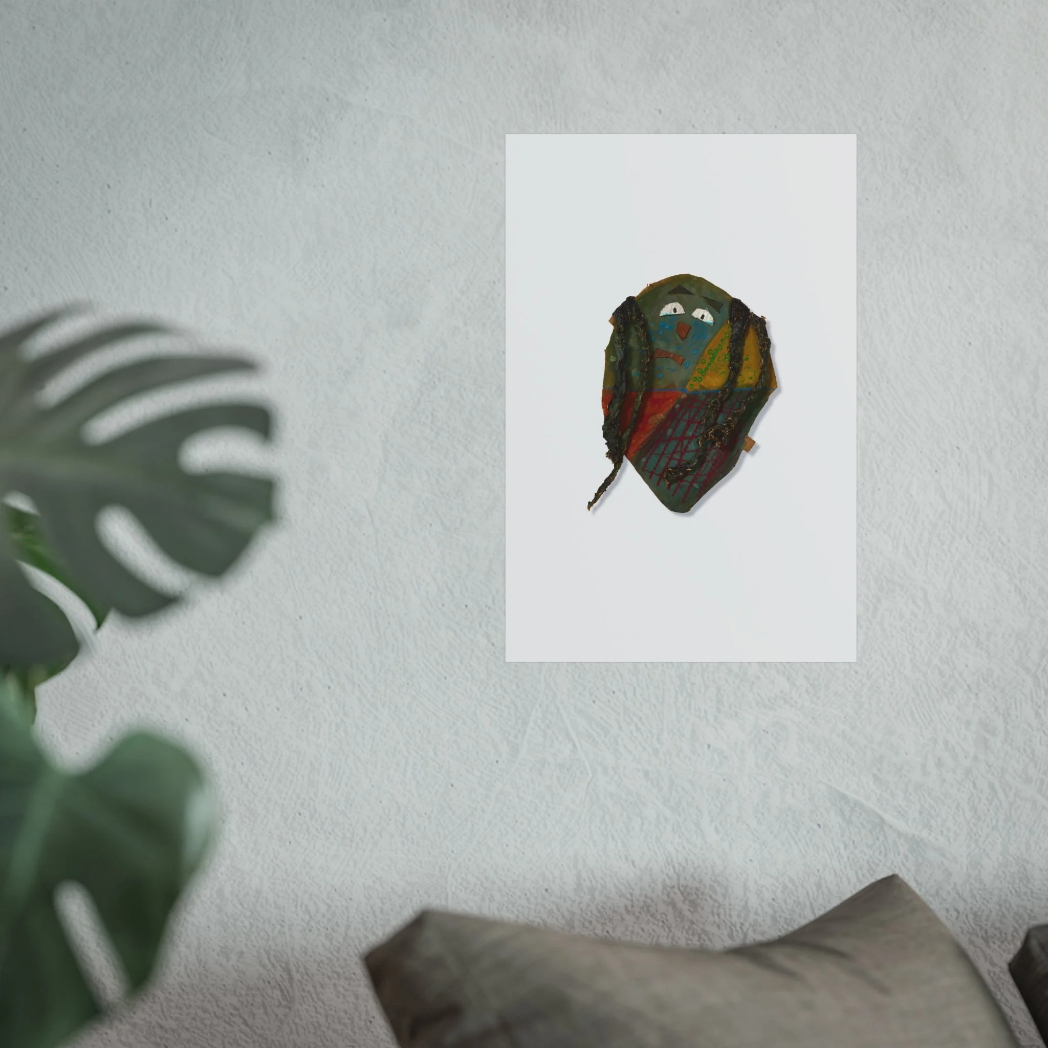 A small, soulful fine art poster that brings a playful, hand-painted presence to quiet corners. The artwork centres on a textured, mask-like face rendered in earthy tones—moss greens, autumn golds and deep russet—set against a clean, matte background to let every brushstroke breathe. Hung in a hallway, studio or above a reading nook, this print feels like a secret companion: curious, slightly mischievous, and quietly expressive. It’s an artwork that starts conversations and adds layered personality without shouting. Choose horizontal, vertical or square orientations and a size that fits your space; the matte finish keeps reflections low and the image intimate.