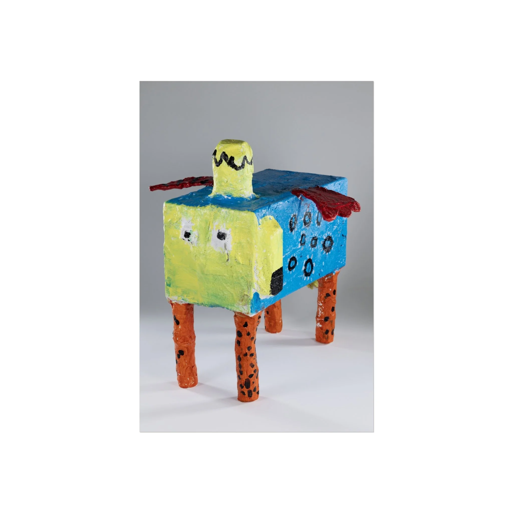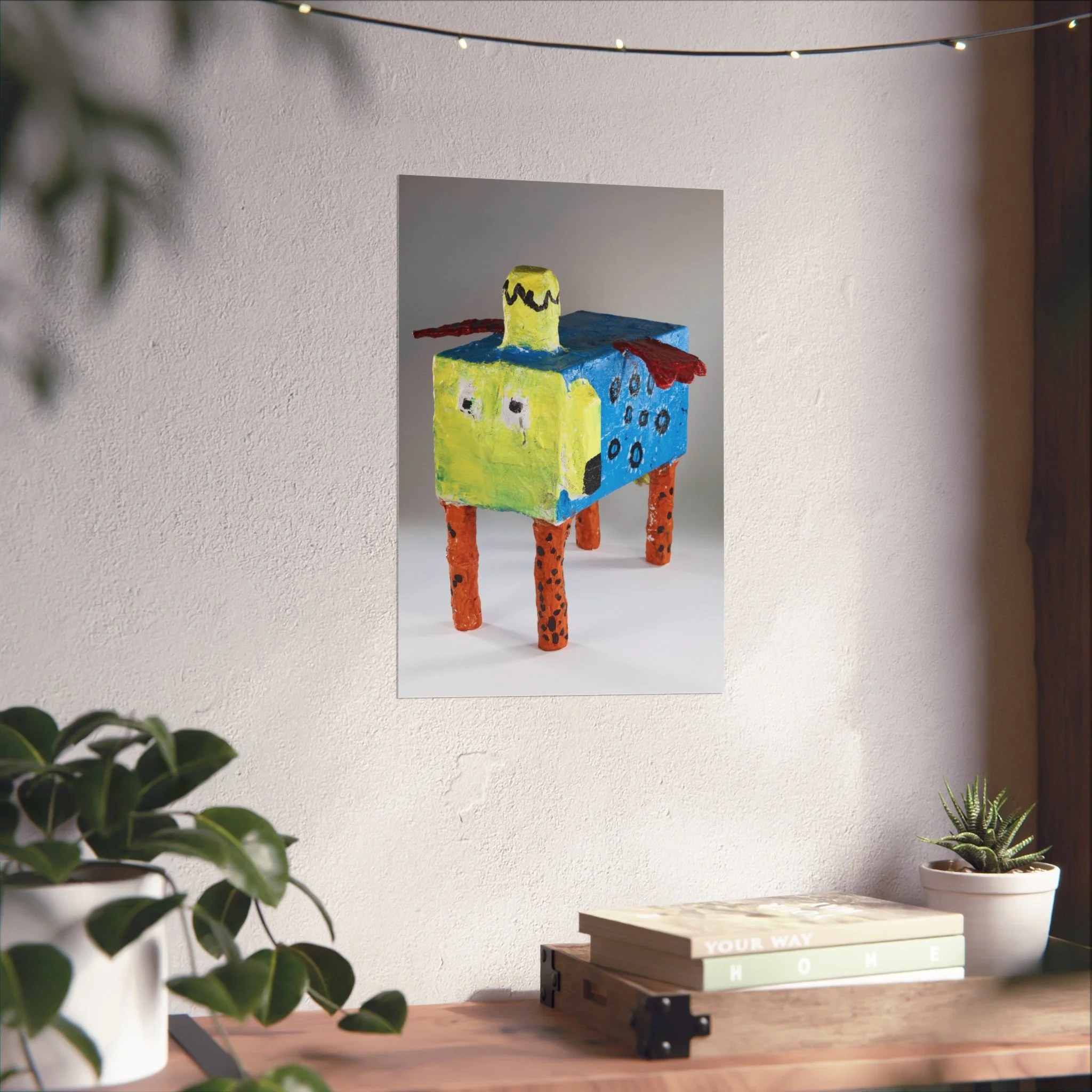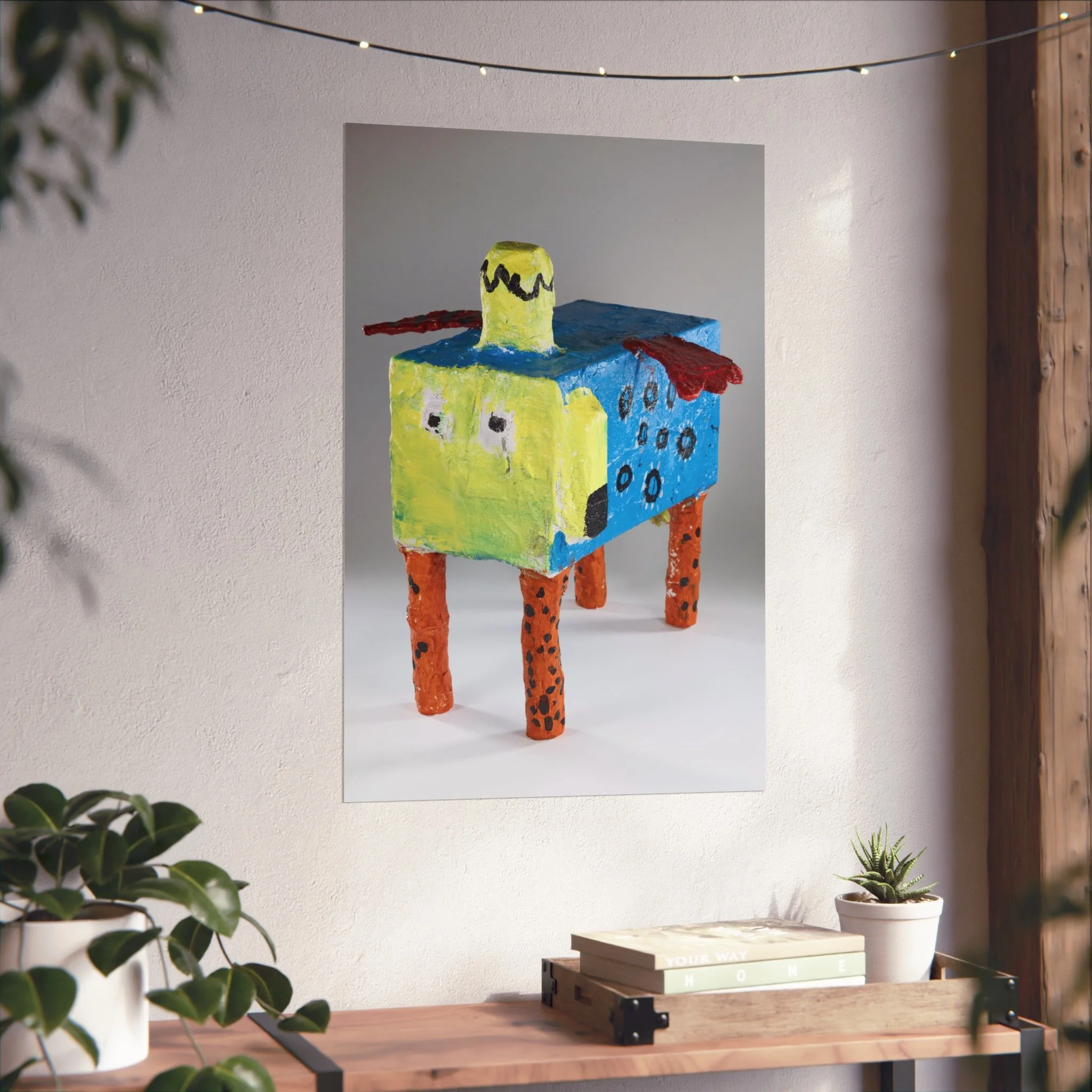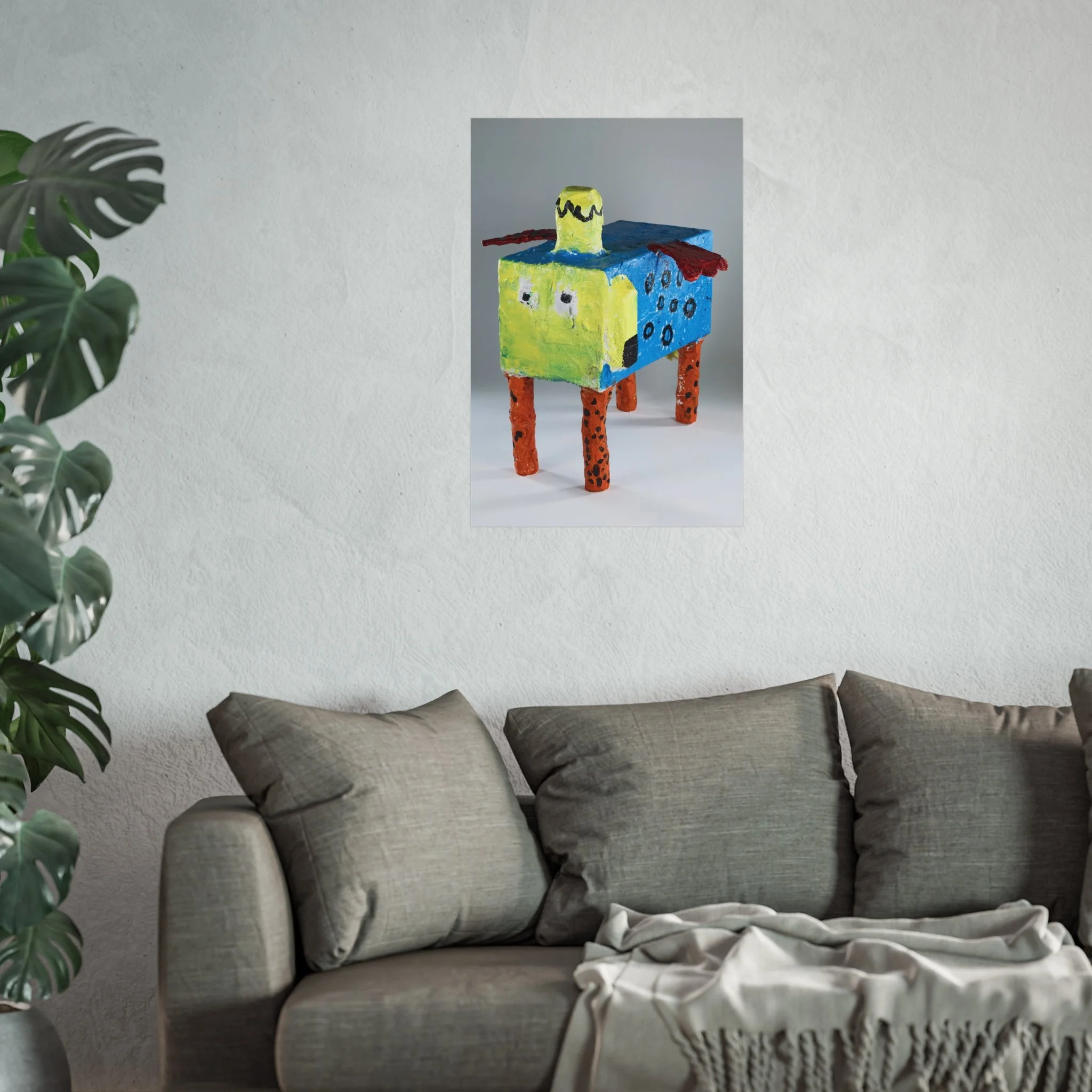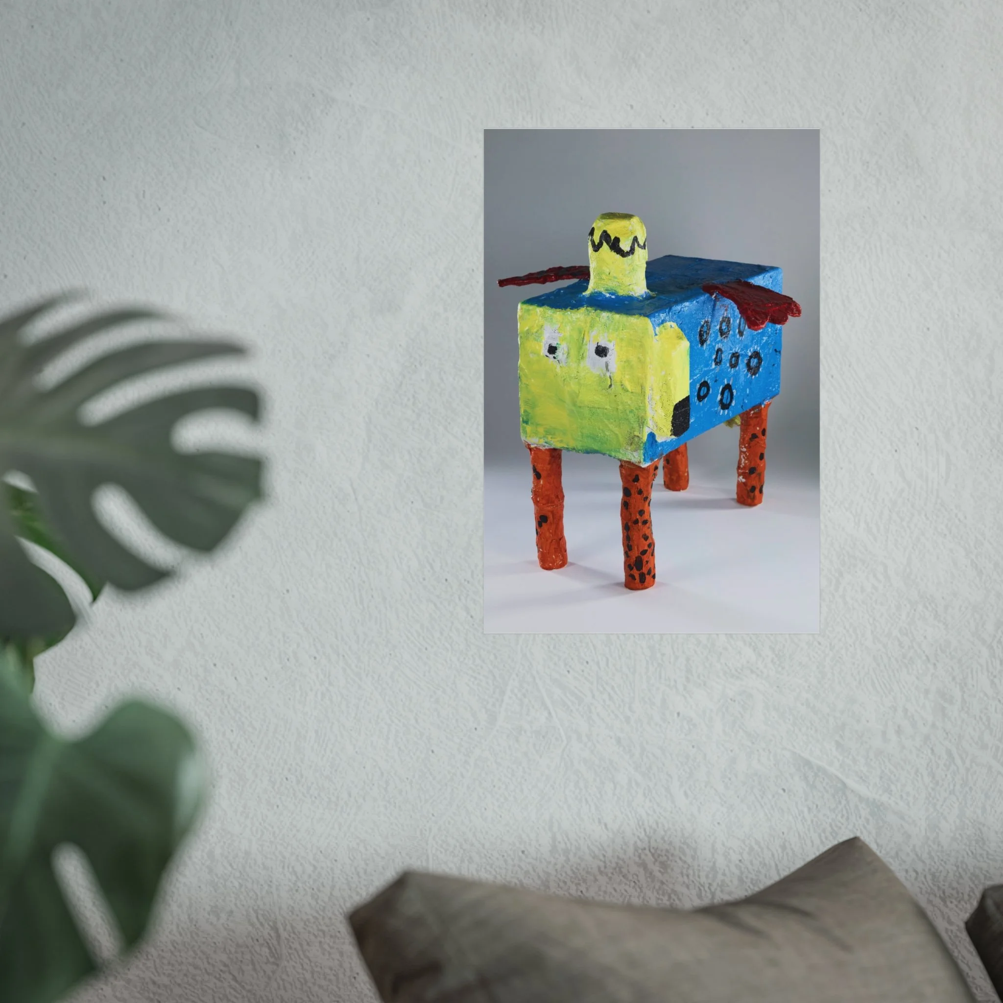 Bright, playful fine art poster that brings handcrafted charm to a modern wall. The print captures a colorful, folk-art sculpture rendered in bold blocks of yellow, blue and orange with whimsical markings and textured brushwork. Mounted on smooth, gallery-grade 220gsm paper with a matte, giclée-quality finish, the image keeps its painterly detail without glare. It sits naturally in casual living rooms, children's spaces, creative studios, or gallery walls, adding a joyful, handcrafted energy that makes a room feel lively and curious.