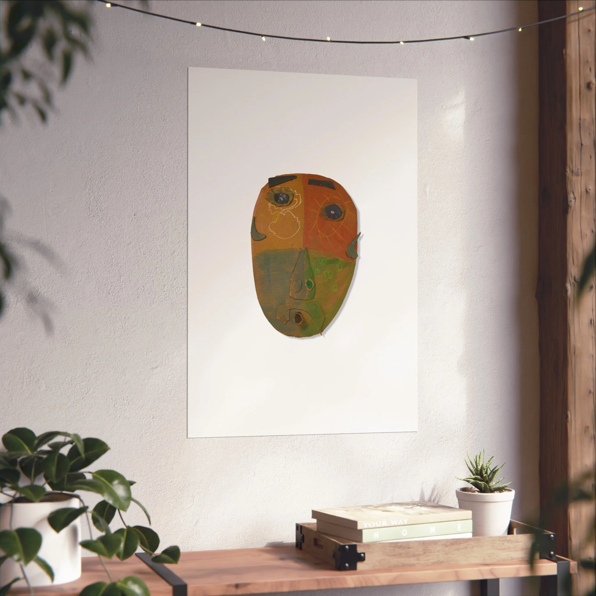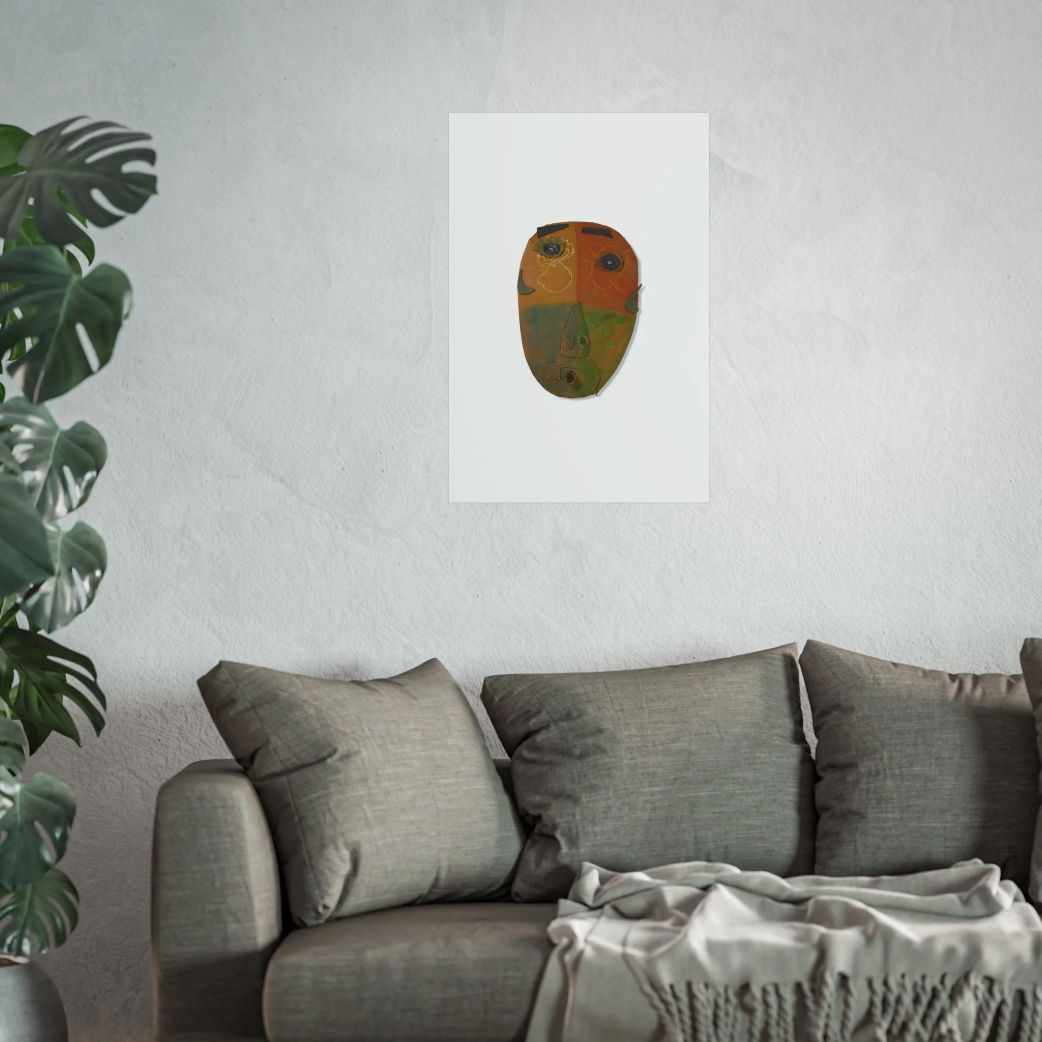 This gallery-style fine art poster brings a small, enigmatic face to the center of a clean, matte field — a study in muted earth tones and simple, abstract geometry. Printed with giclée quality using REACH-certified inks on smooth, acid-free 220gsm paper, the image reads like a private relic on the wall: intimate, slightly mysterious, and quietly textured. It slips effortlessly into a curated living room, a compact studio, or a minimalist hallway, where it invites longer looks and quiet conversation. Sizes come in horizontal, vertical, and square formats so you can place it in a tight gallery cluster or let it sit alone as a contemplative focal point. Sourced from the UK with responsibly certified materials, this poster is made to keep its color and clarity over time without yellowing or glare.