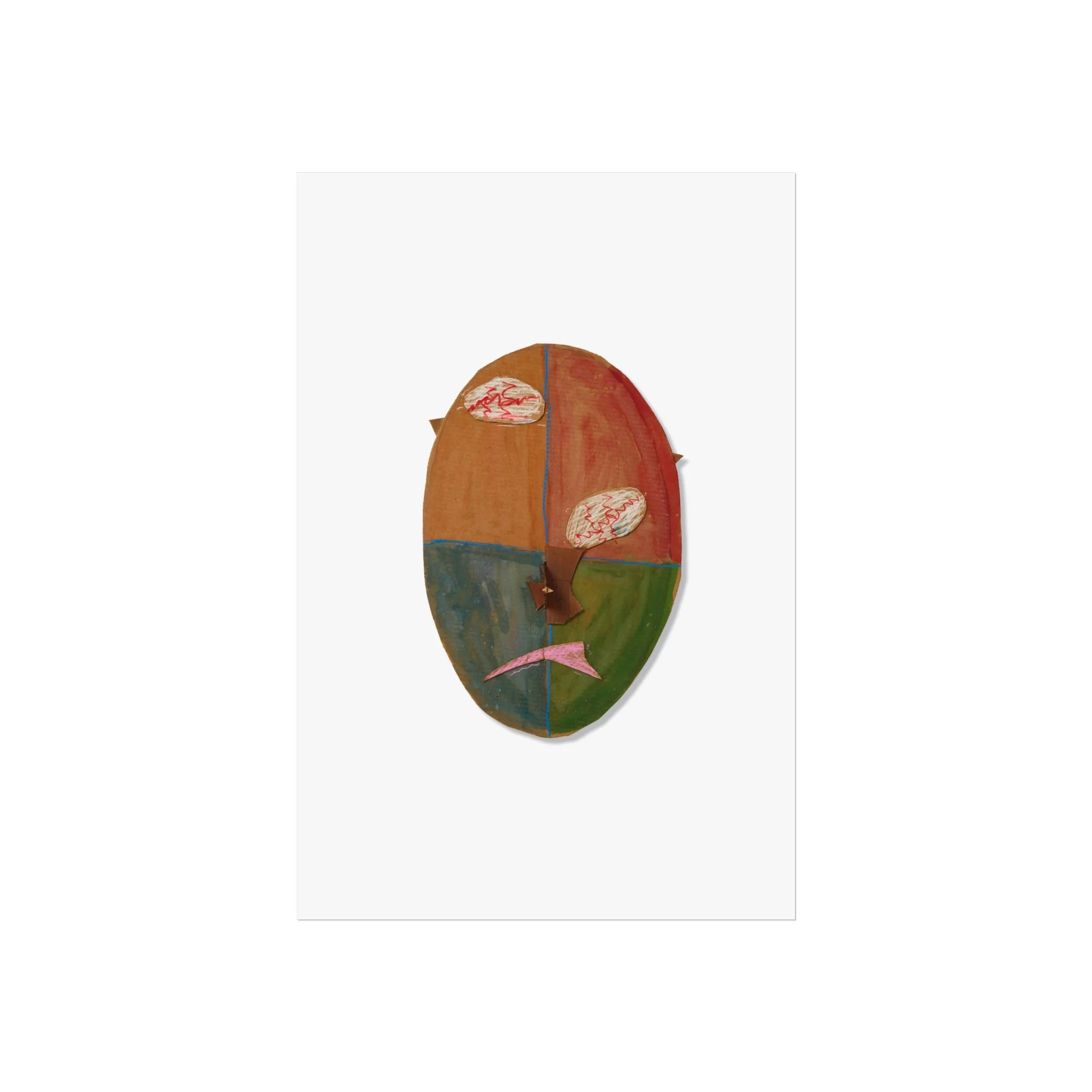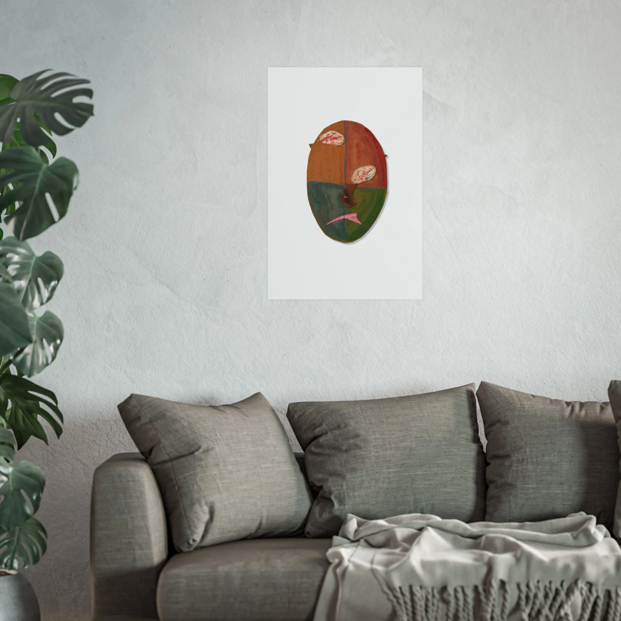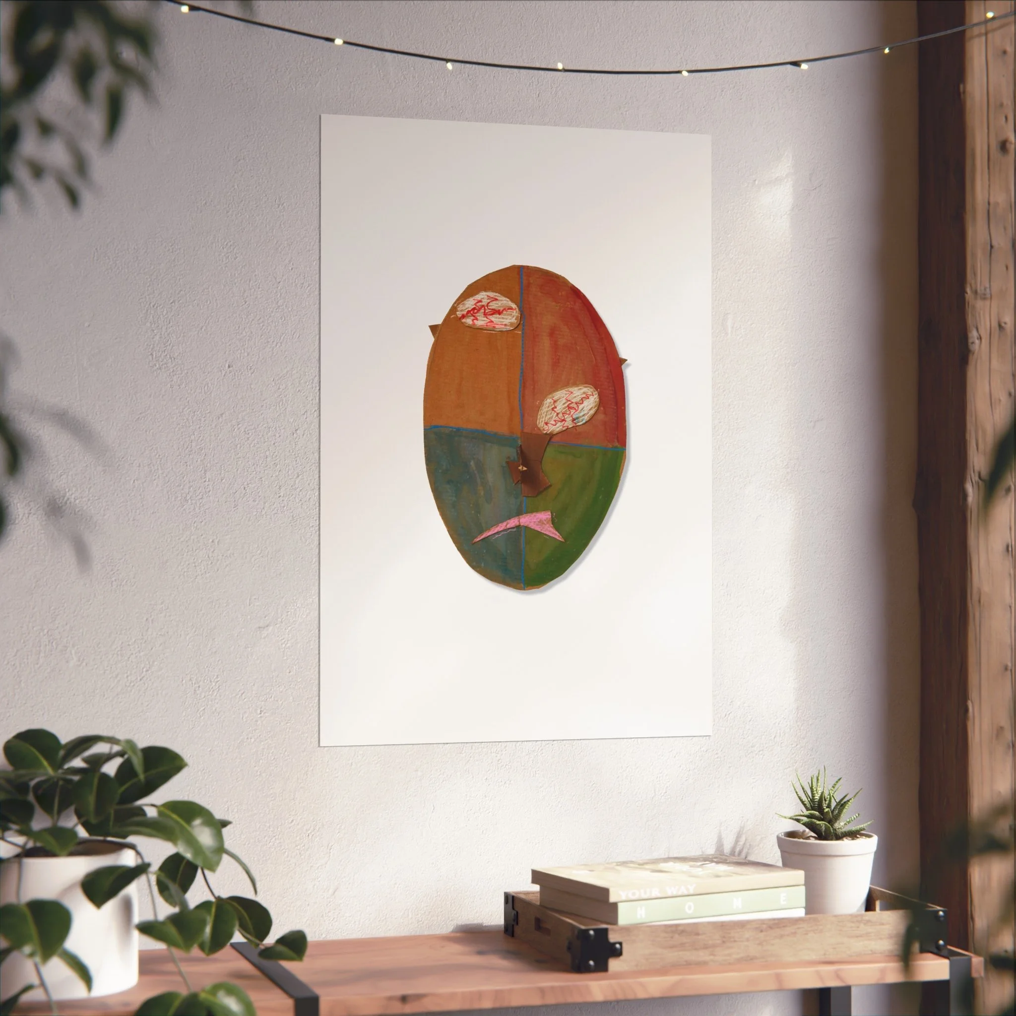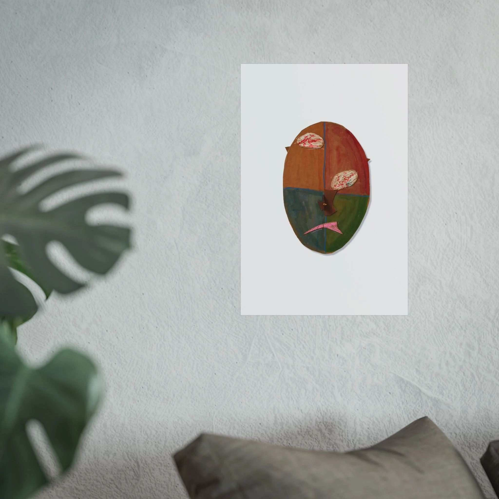 A quiet, painterly poster that feels like a found fragment from a private sketchbook. The abstract face—quartered blocks of warm terracotta, deep teal and olive—sits on a wide matte field, its soft brushwork and muted palette inviting slow, thoughtful looks. This print brings calm and curiosity to a living room wall, studio nook, or hallway. It reads as both contemporary art and intimate object: small enough to tuck into a gallery wall, strong enough to anchor a minimalist vignette. Printed with archival giclée inks on smooth, acid-free 220gsm paper, the surface keeps tones true and textures subtle, so the brushstrokes breathe on the paper long after you hang it.