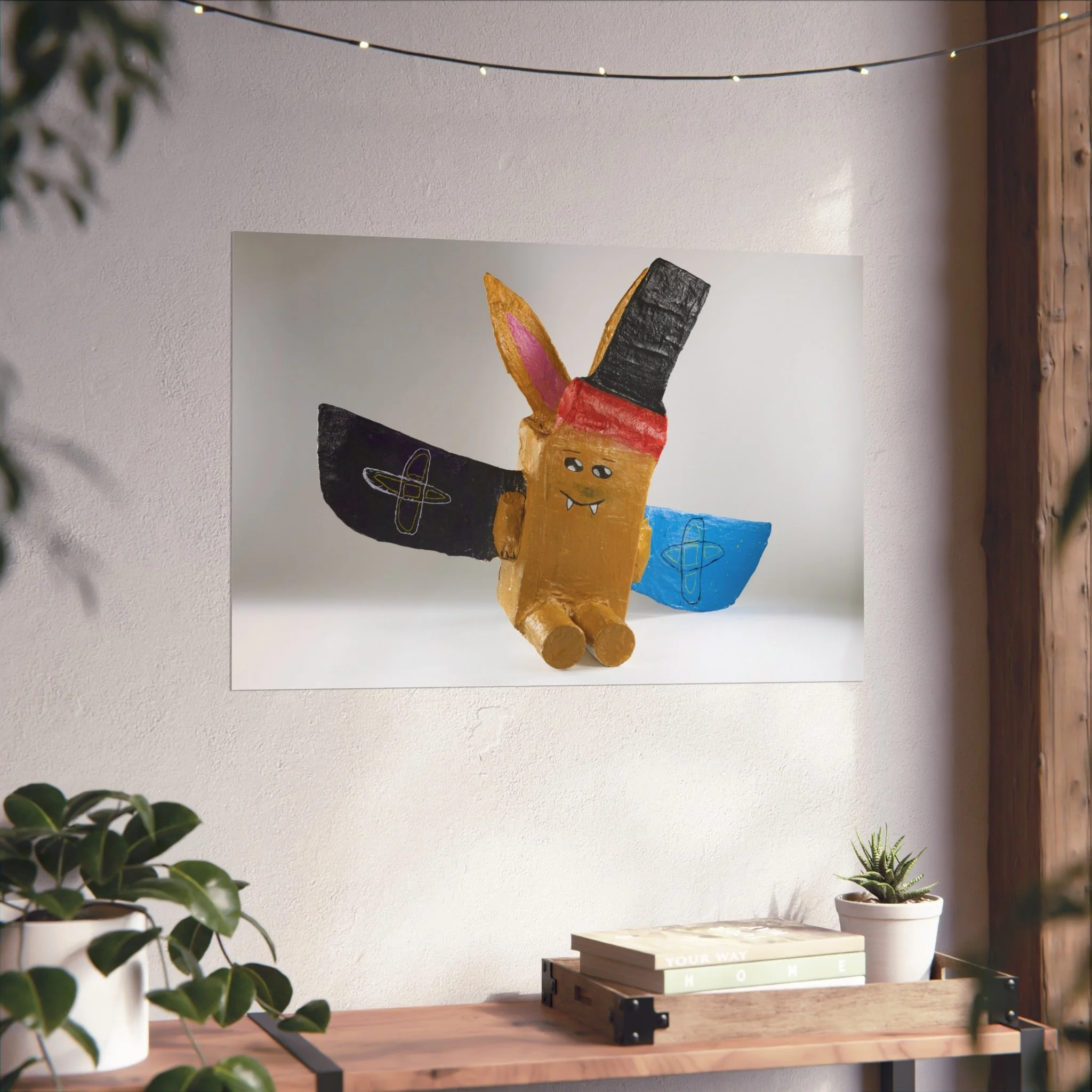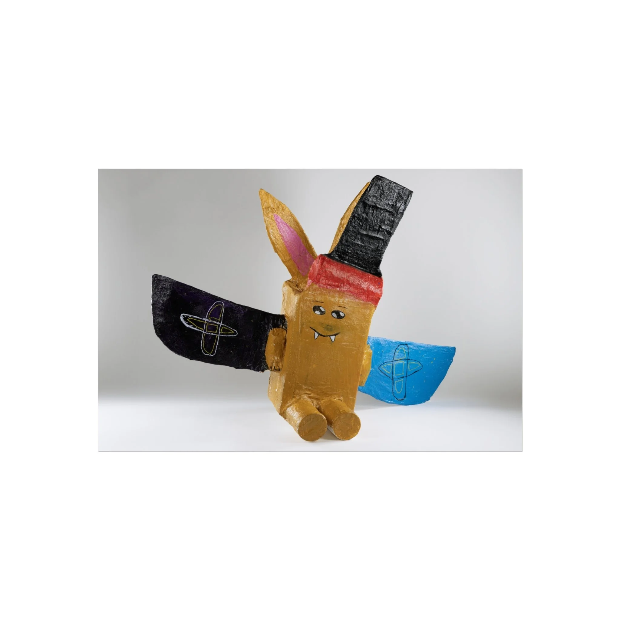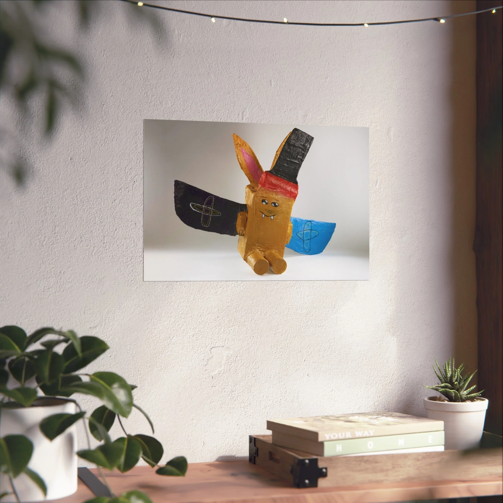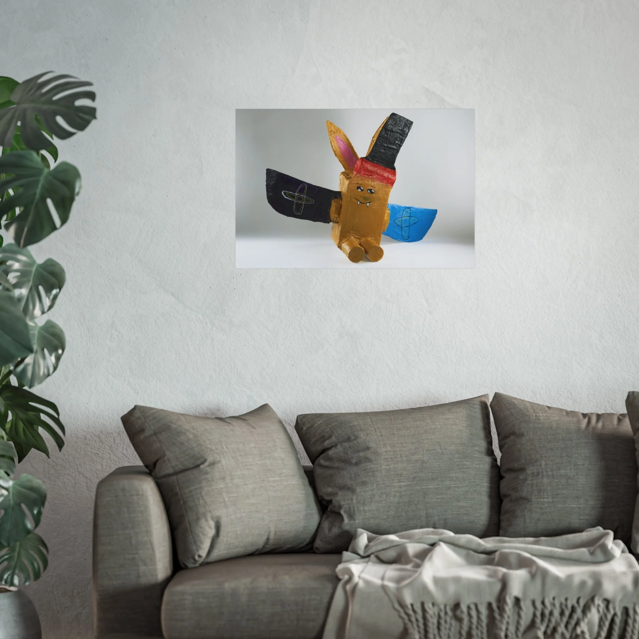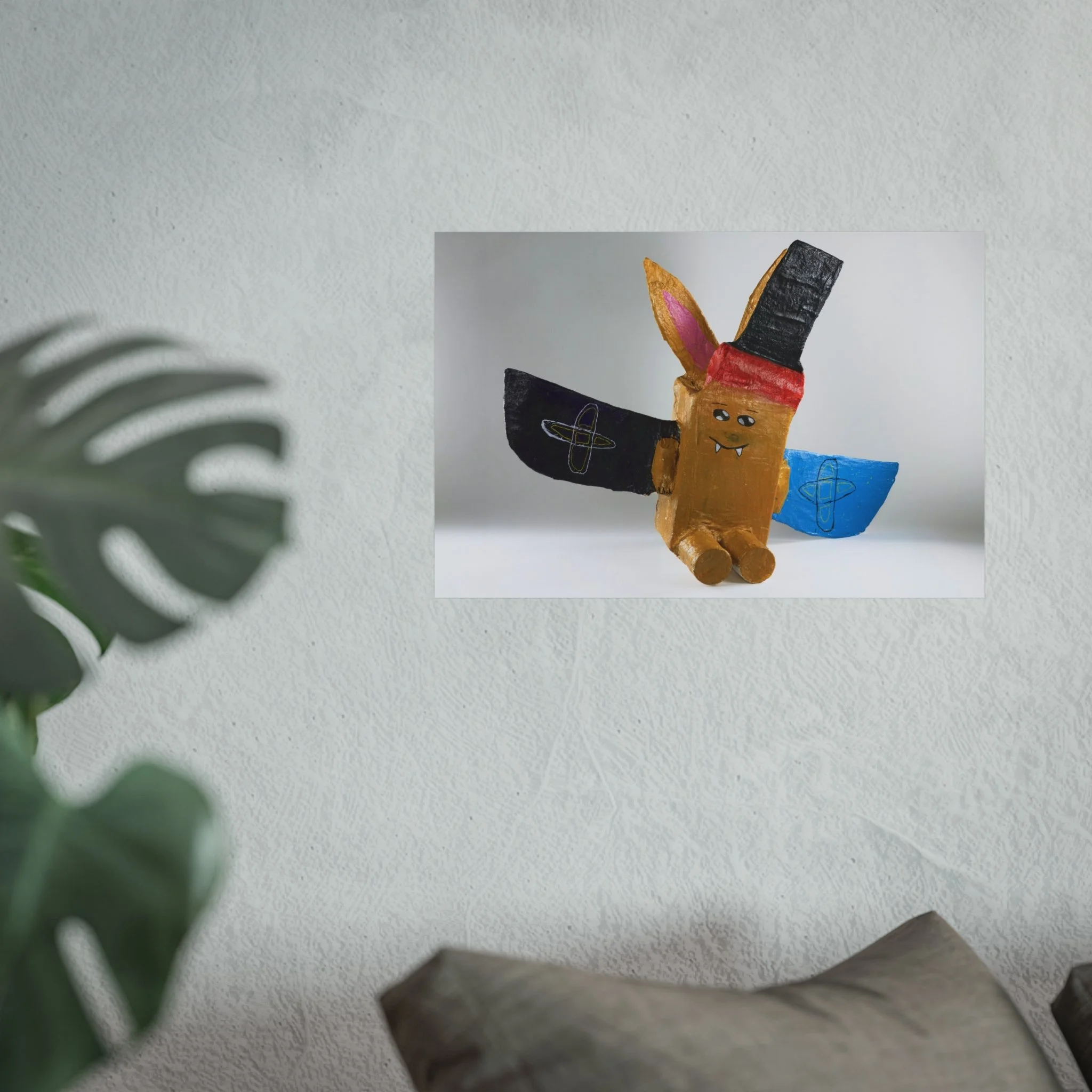 This fine art poster captures a playful, hand-crafted character with bold, childlike shapes and a splash of bright colors. Printed giclée-style on smooth, gallery-grade 220gsm paper, the image retains vivid pigment and fine detail against a soft matte surface. The composition’s whimsical energy brings a lighthearted focal point to a living room wall, creative studio, or child-friendly nook. It reads like a joyful keepsake from an art-school project—nostalgic, slightly quirky, and full of personality. Hung horizontally or cropped to a square, it adds approachable charm to everyday spaces and complements eclectic, bohemian, or maker-centered interiors.