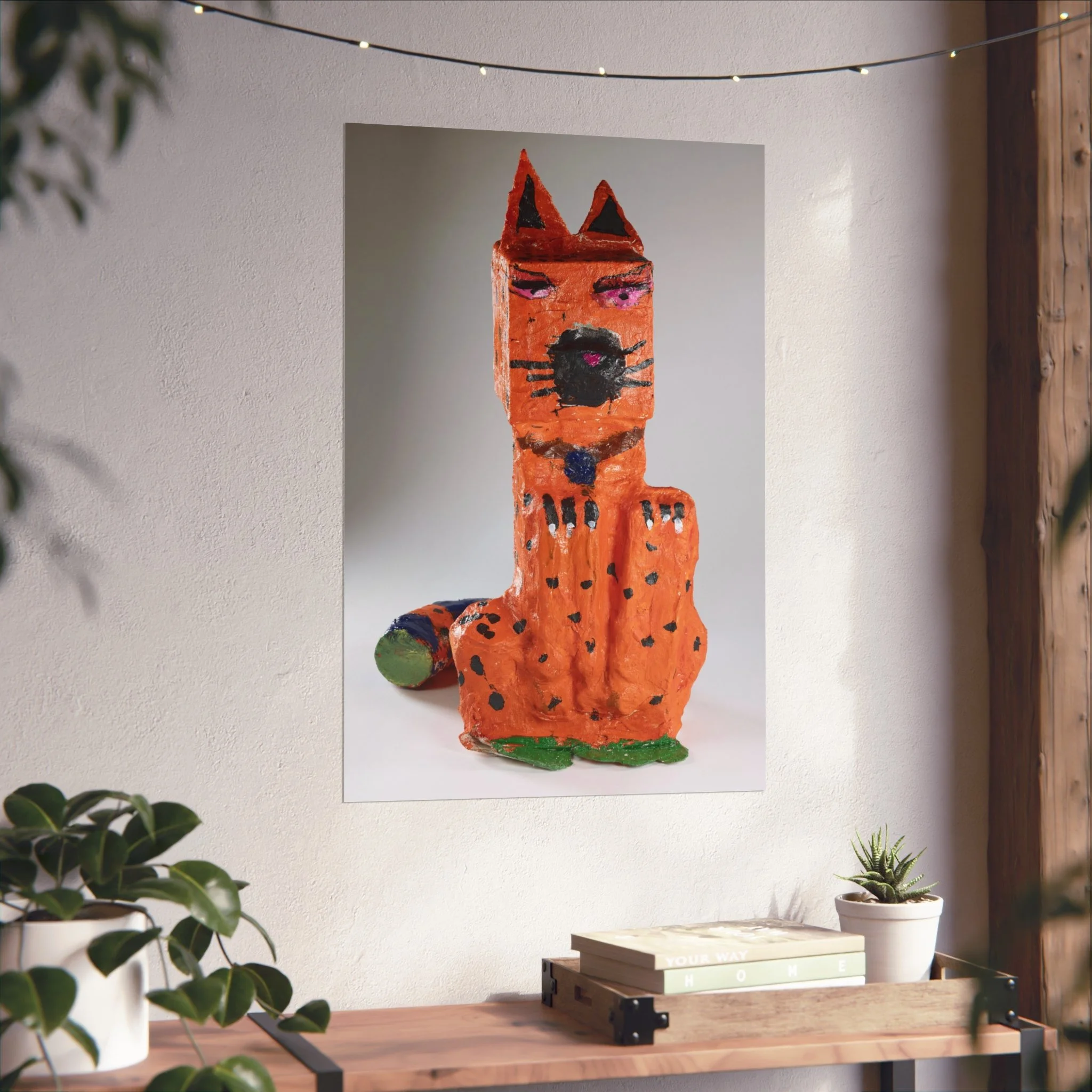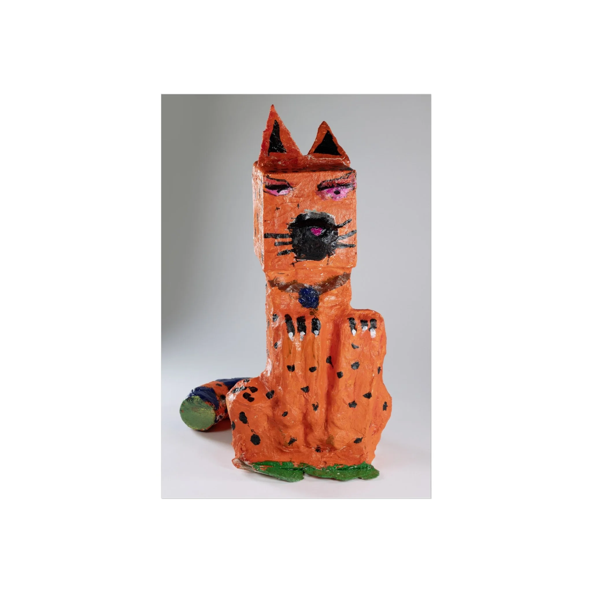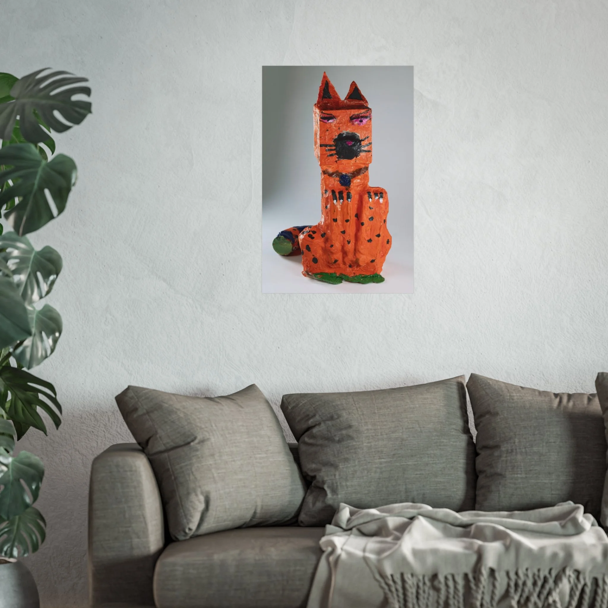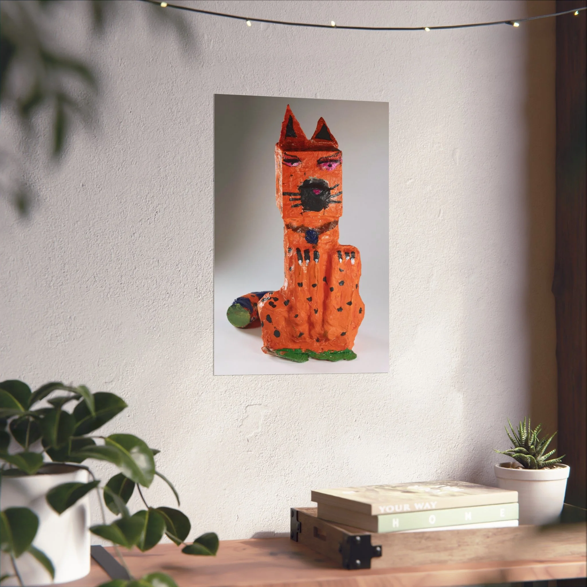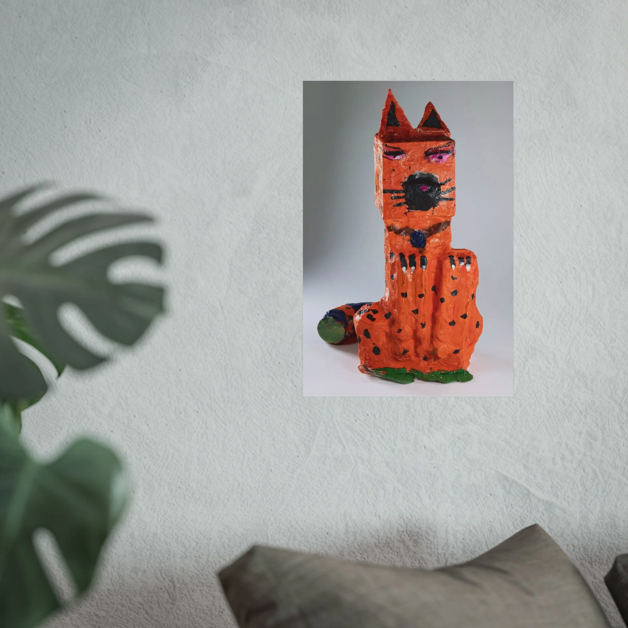 This fine art poster captures a playful, handcrafted sculpture of a whimsical orange cat — textured, slightly imperfect, and full of personality. Printed on gallery-grade 220gsm acid-free paper with giclée quality and REACH-certified inks, the artwork keeps the sculpture’s tactile details and painterly marks intact while delivering a smooth matte finish that hangs beautifully in living spaces, studios, or children's rooms. Available in horizontal, vertical, and square formats across multiple sizes, this poster pairs well with contemporary, eclectic, and kid-focused interiors. The paper and production follow sustainable and regulatory standards, with EUTR-compliant woodstock used in production and blank product sourced from the United Kingdom.