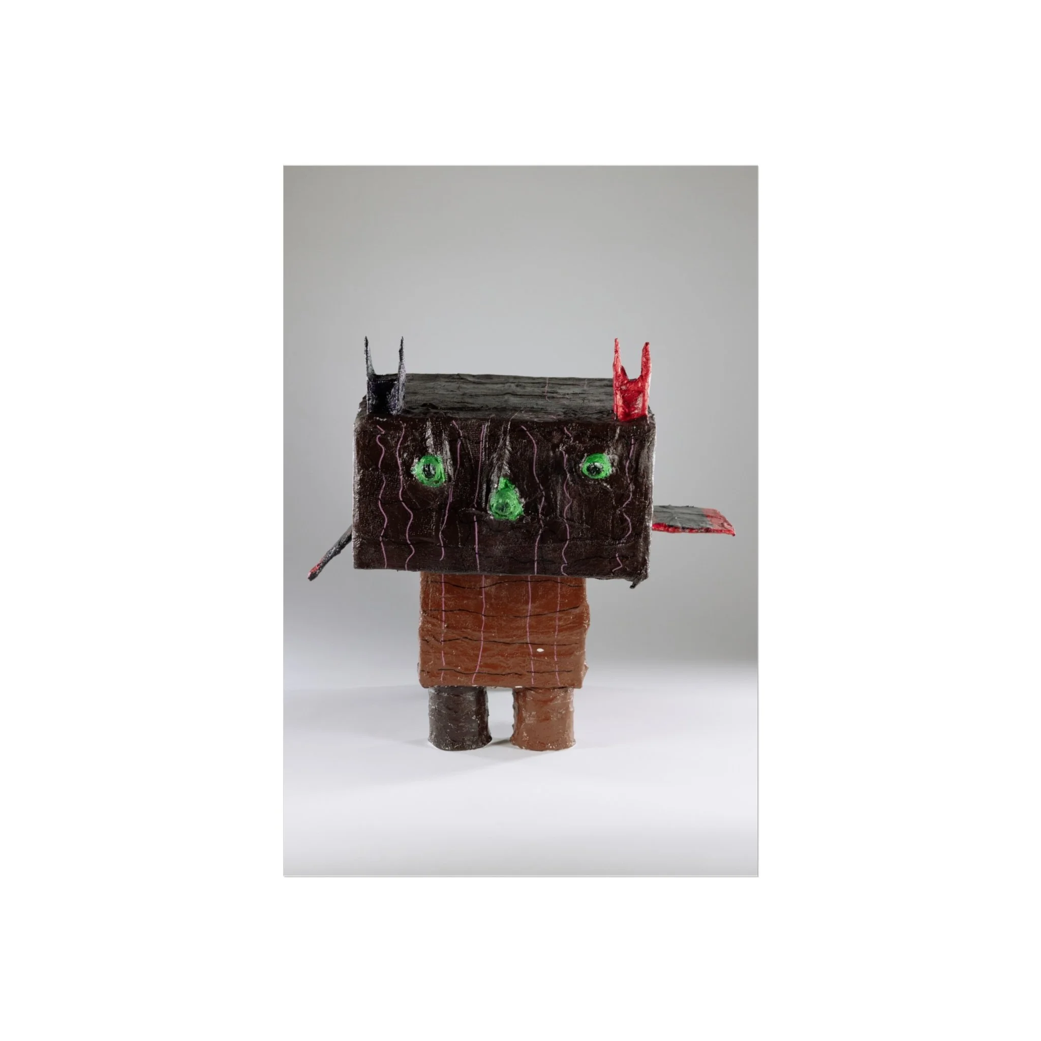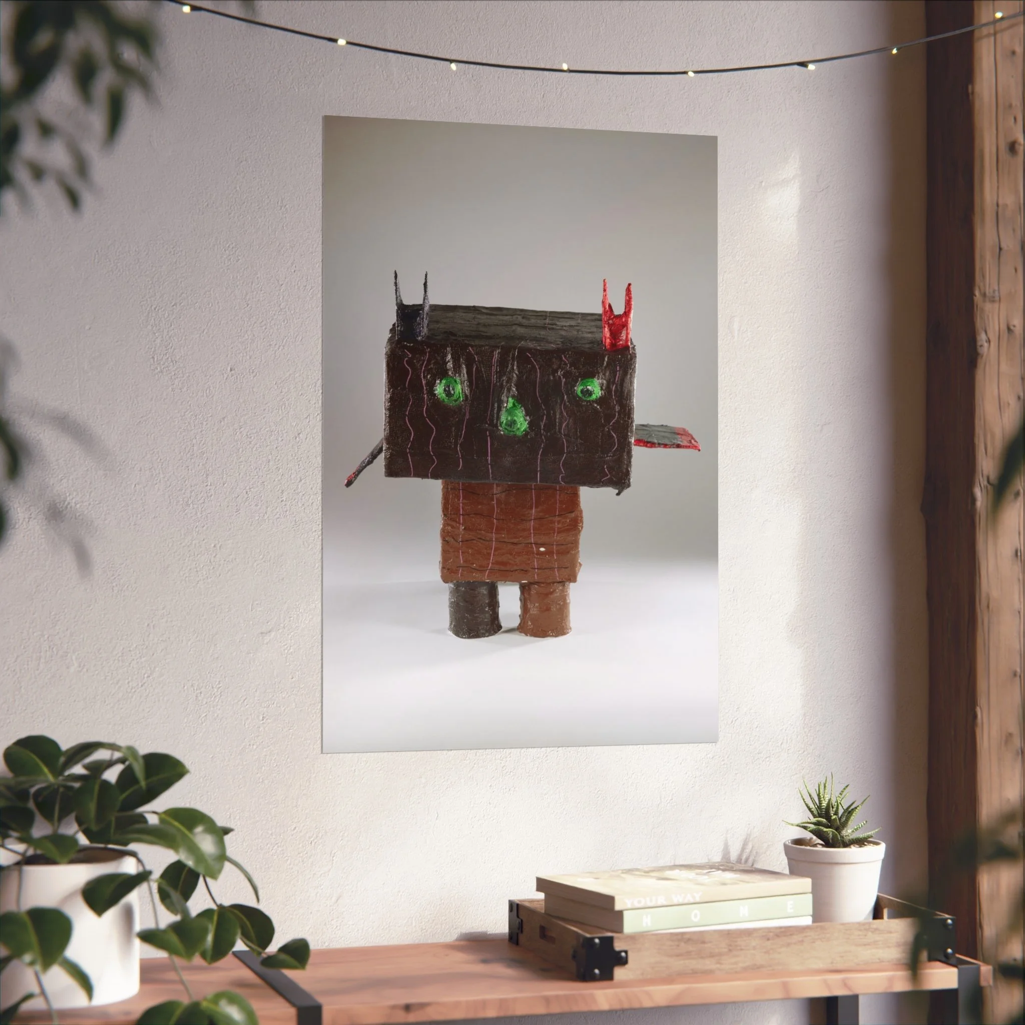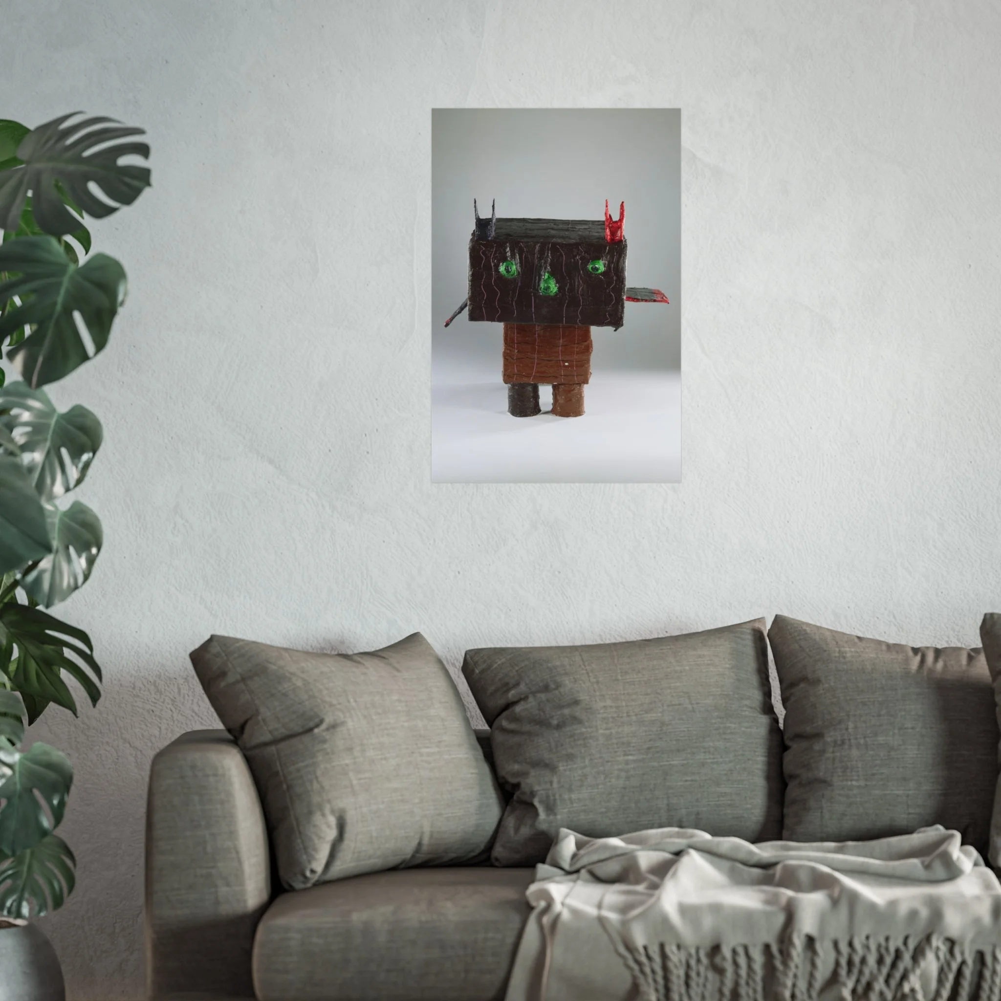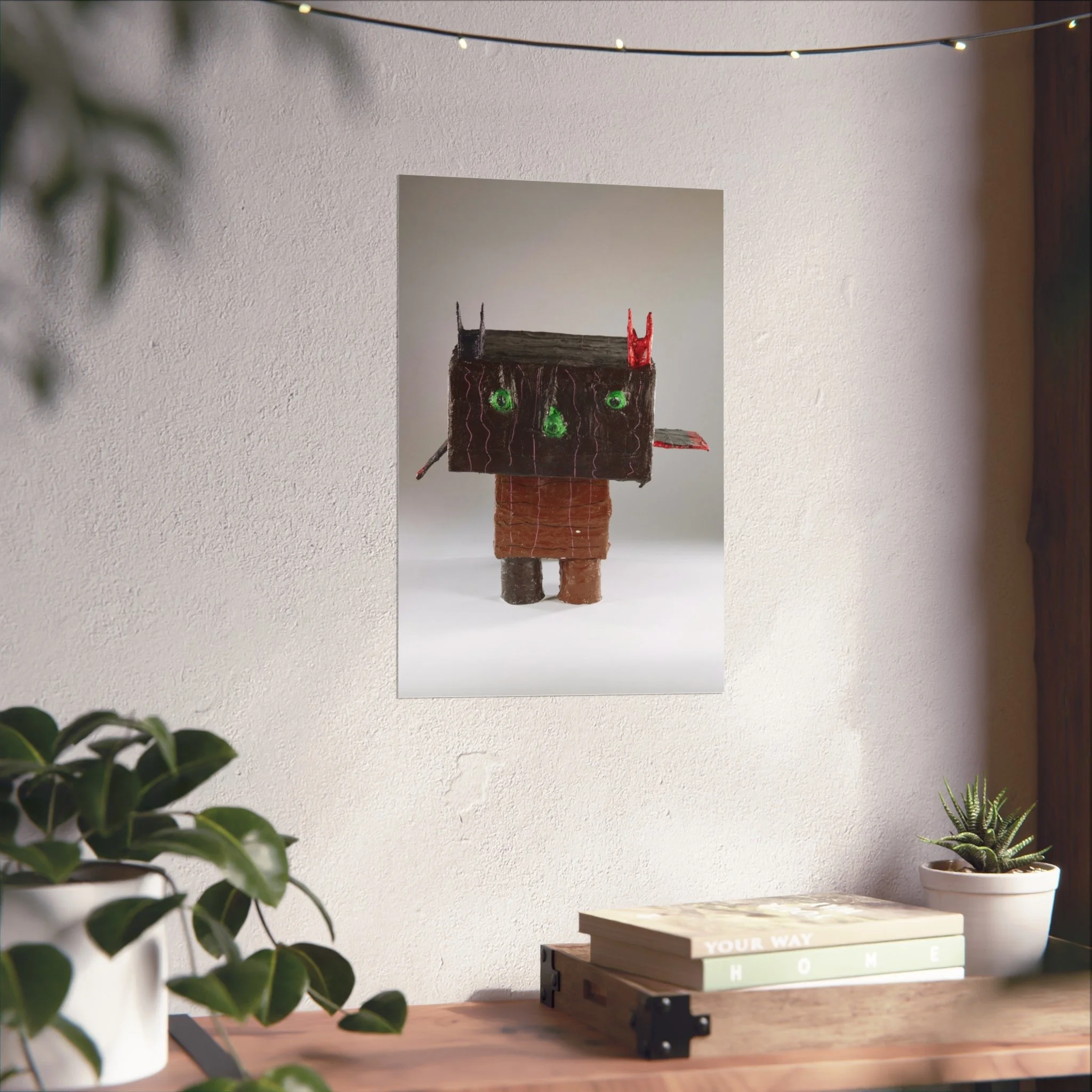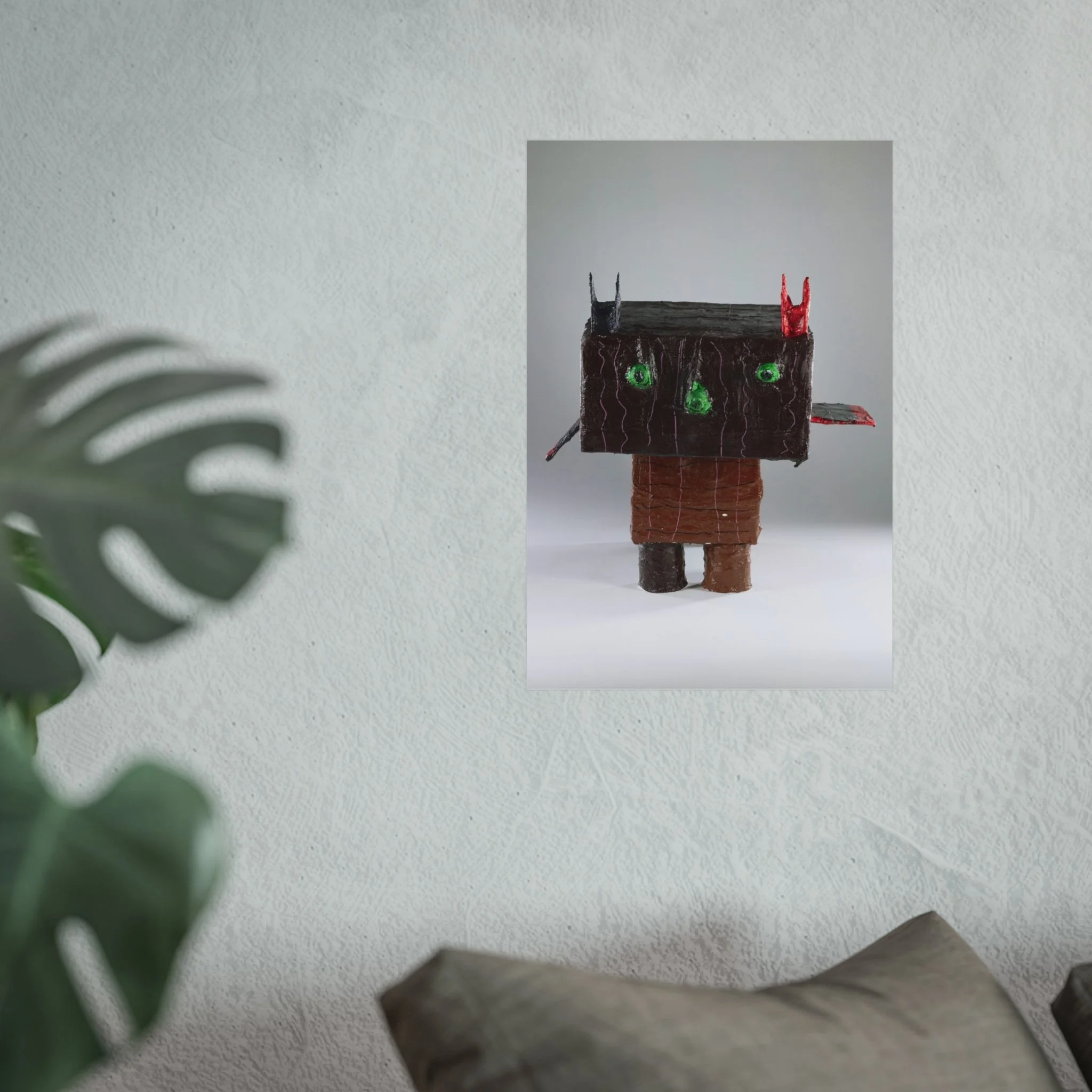 This fine art poster presents a tactile, sculptural character rendered with a playful, slightly uncanny charm. Printed on smooth, gallery-grade 220gsm paper using REACH-certified inks and giclée-quality printing, the image keeps delicate shadow, texture, and subtle color gradations crisp and lifelike. The matte finish reduces glare and invites a close look at the handcrafted details — the rough, wood-like head, bright green eyes, and tiny red and black accents — that give the piece personality. Hung alone or grouped with other contemporary prints, it brings an unexpected, whimsical edge to a living room wall, studio, or creative workspace. Available in horizontal, vertical, and square formats and multiple sizes, each poster is produced from UK-sourced blanks using EUTR-compliant woodstock practices for responsible production.