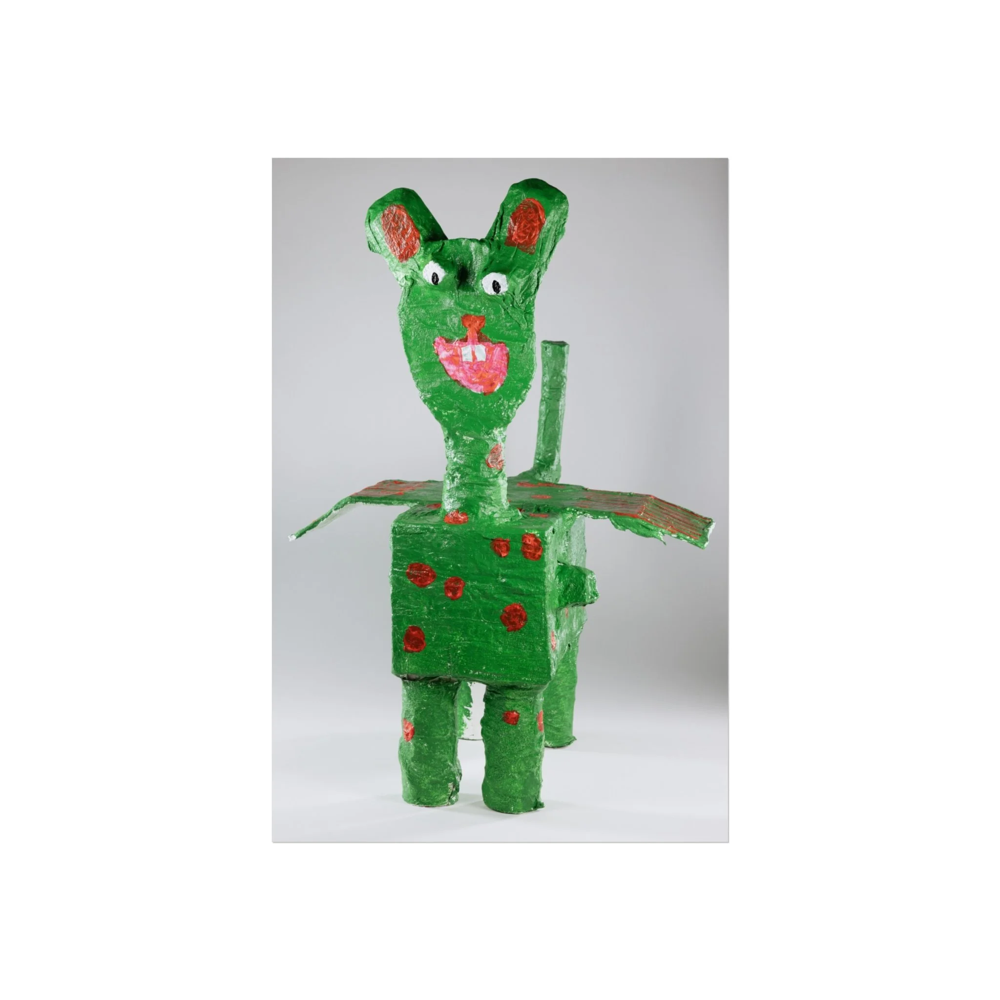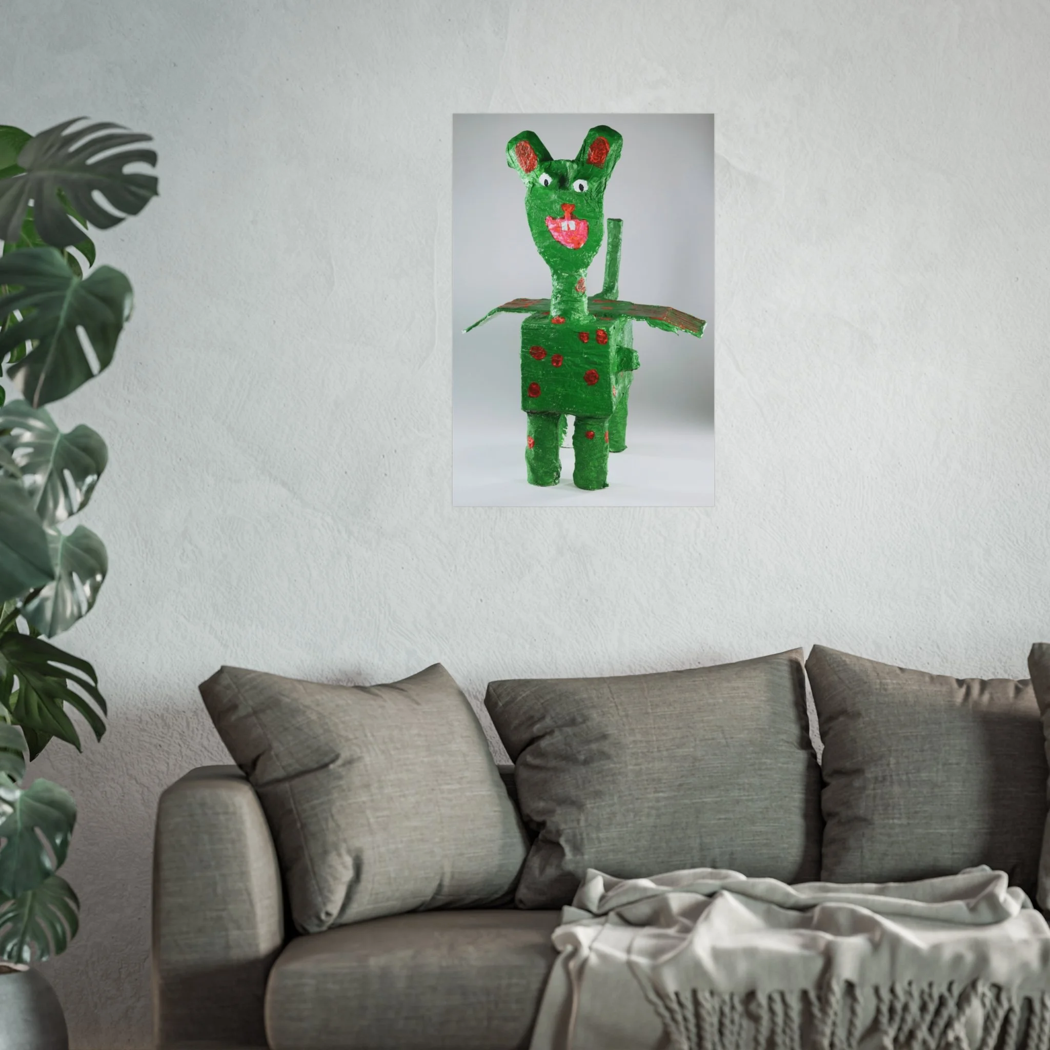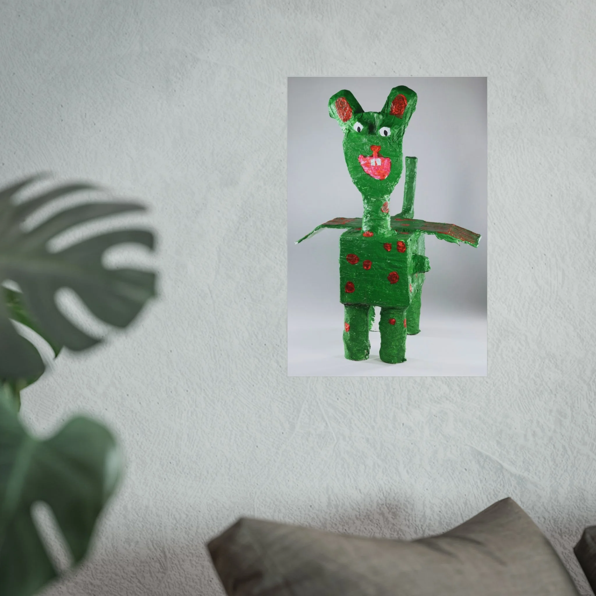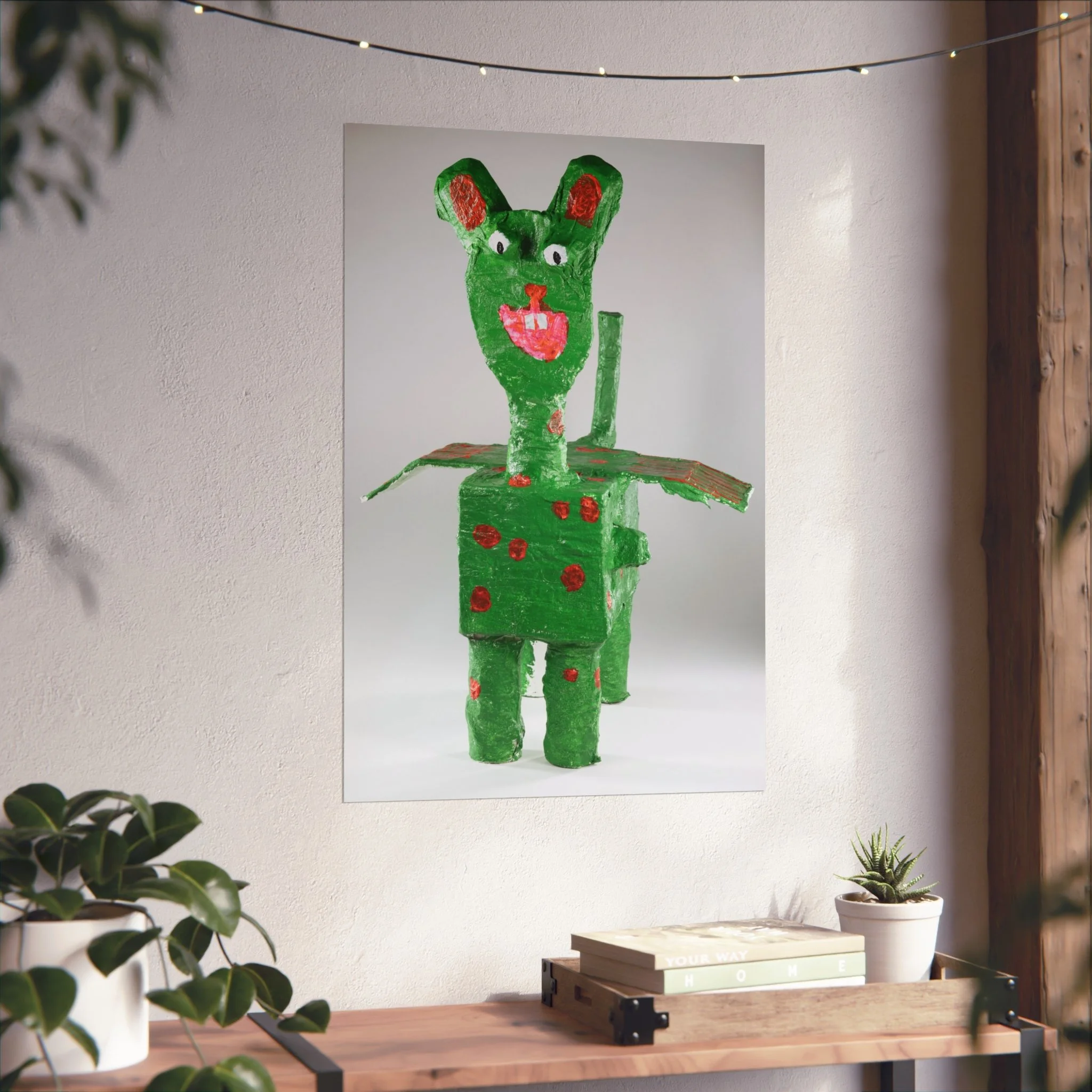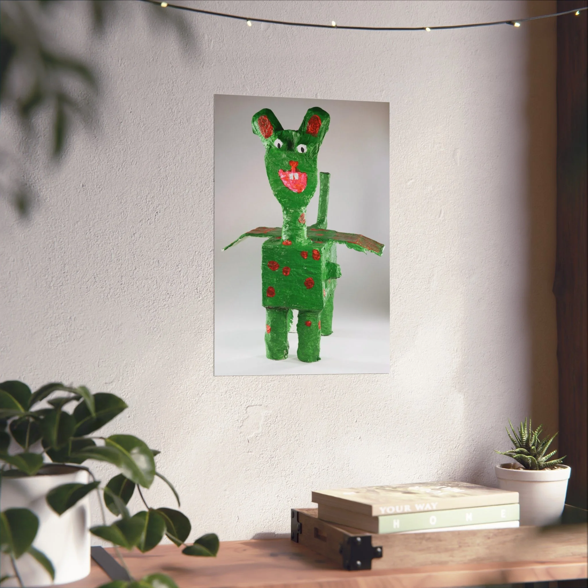 This fine art poster captures a playful, hand-crafted creature in bold greens and reds, printed with archival quality on smooth, gallery-grade paper. The image has a whimsical, childlike energy—like a found piece of folk art or a jaunty classroom pinata—inviting a lighthearted focal point for a living room wall, studio, classroom, or nursery gallery. The matte finish keeps glare low and colours rich without overwhelming a calm interior. Hang it solo to let its quirky personality breathe, or mix it into a casual gallery wall for an eclectic, handmade vibe.