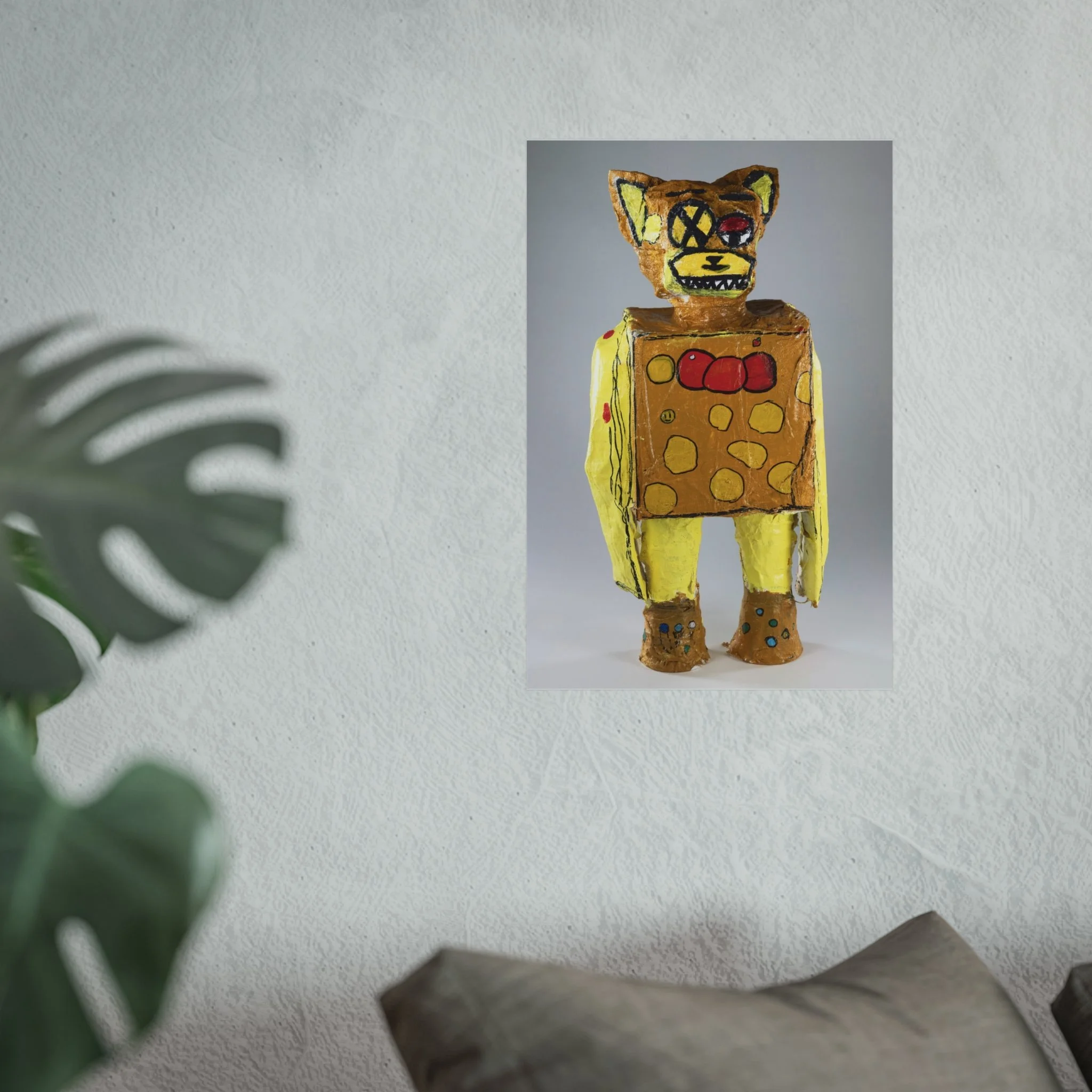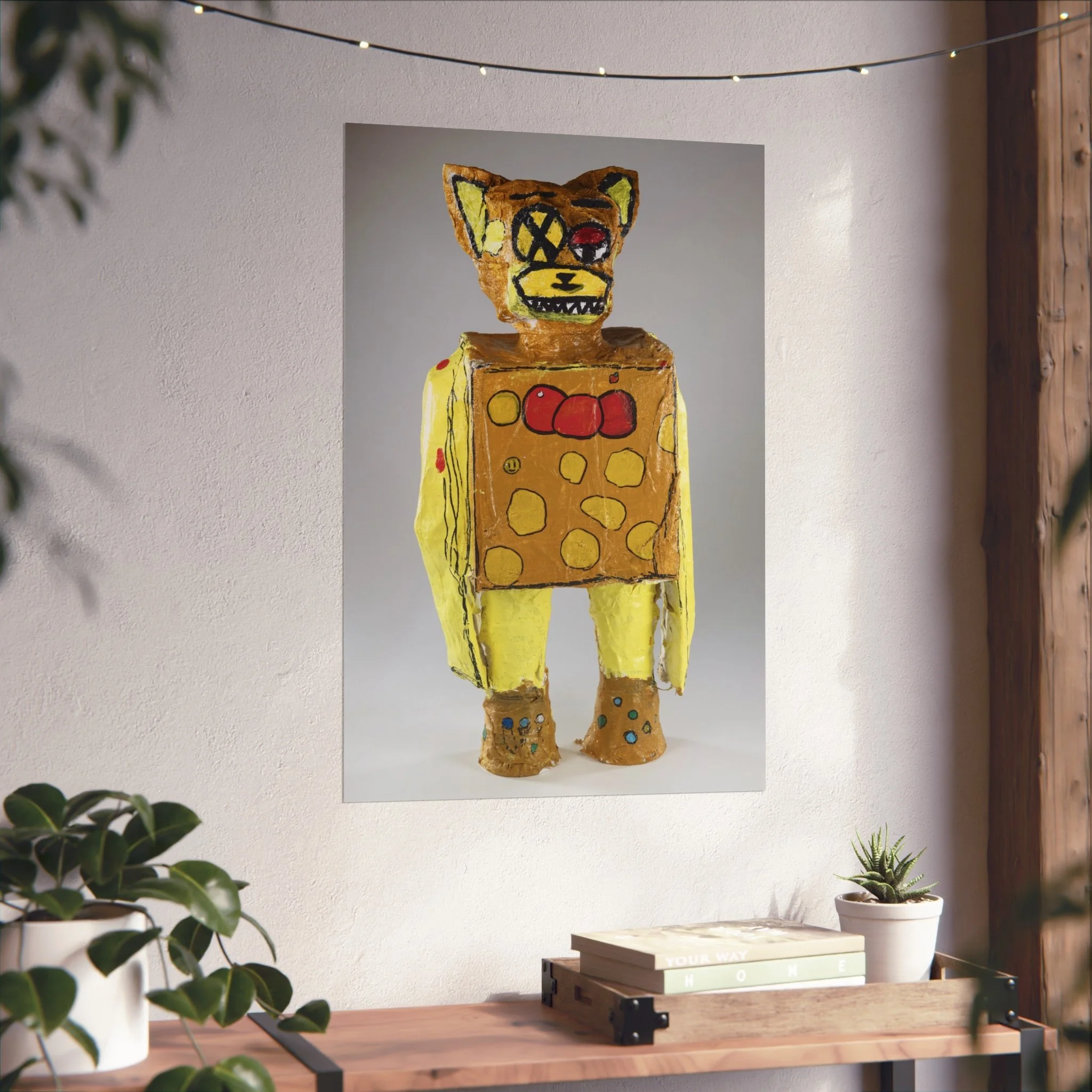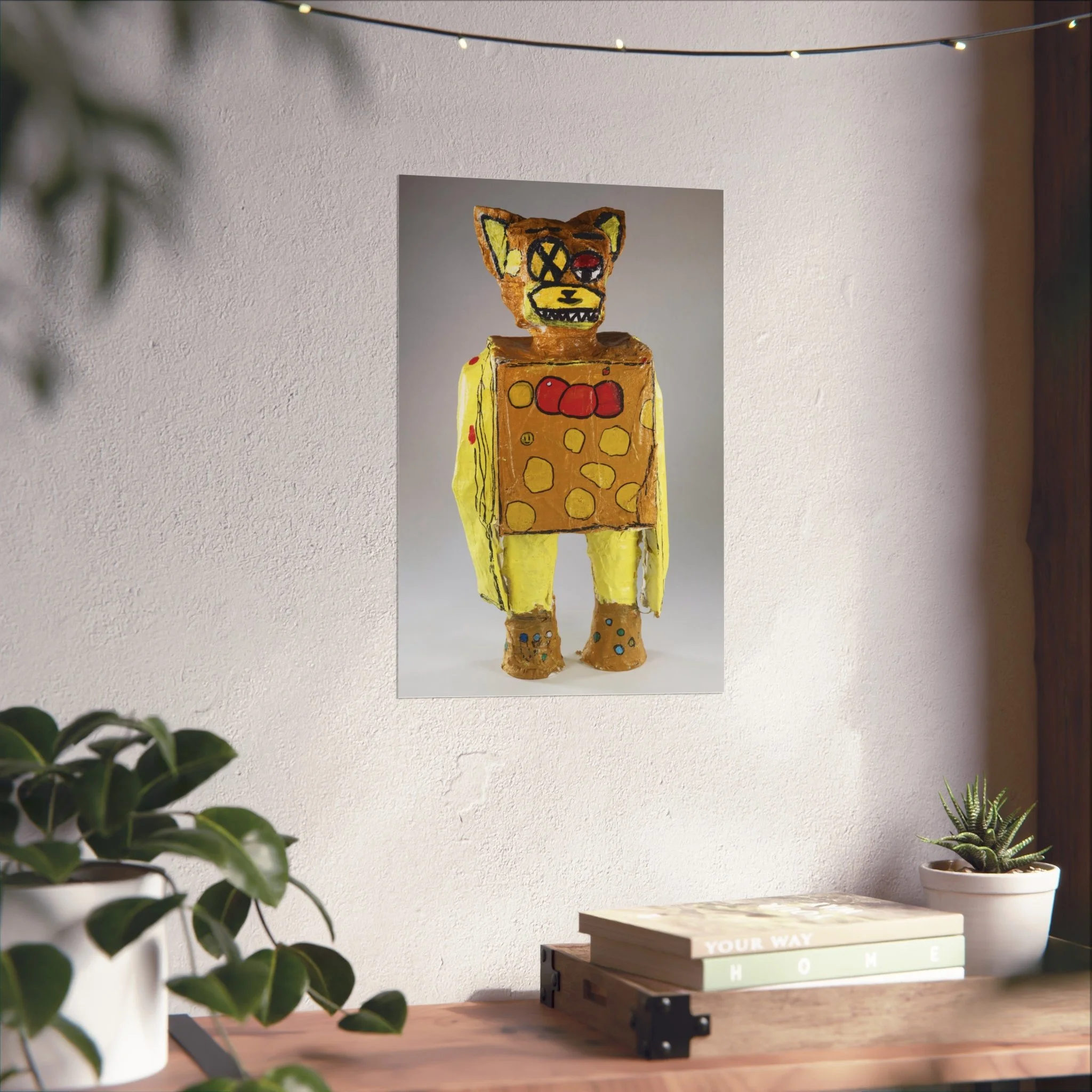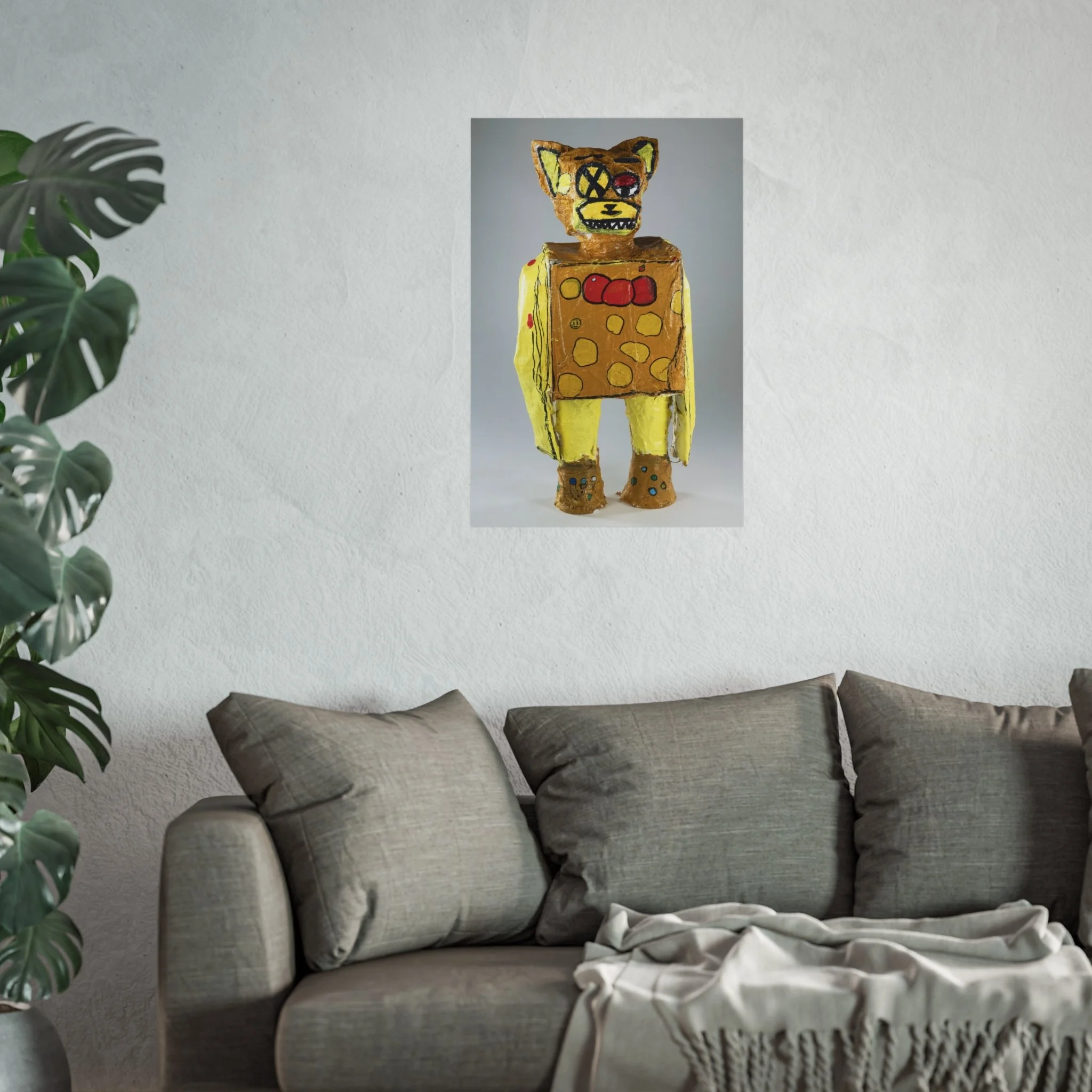 Bright, playful, and a little bit wild — this fine art poster captures a colorful handmade creature that feels equal parts childhood memory and outsider art. The giclée print brings out the textured brushstrokes, bold yellow palette, and quirky character details: mismatched eyes, dotted body, and an expressive, hand-crafted charm. Hung on a nursery wall, a creative studio, or a cozy living nook, the poster invites smiles and conversation. It doesn’t shout — it offers personality and warmth, and celebrates the imperfect, joyful energy of folk-made art.