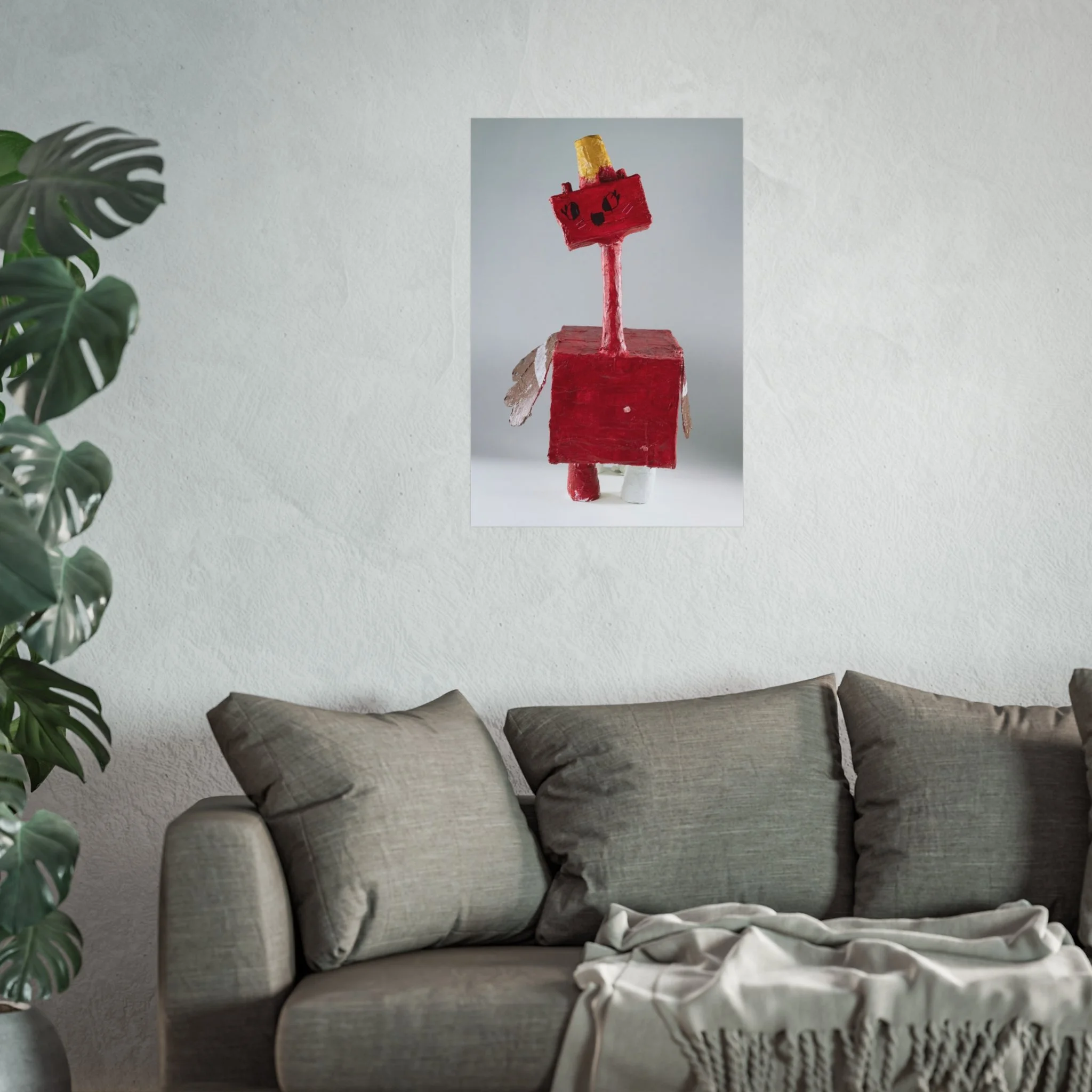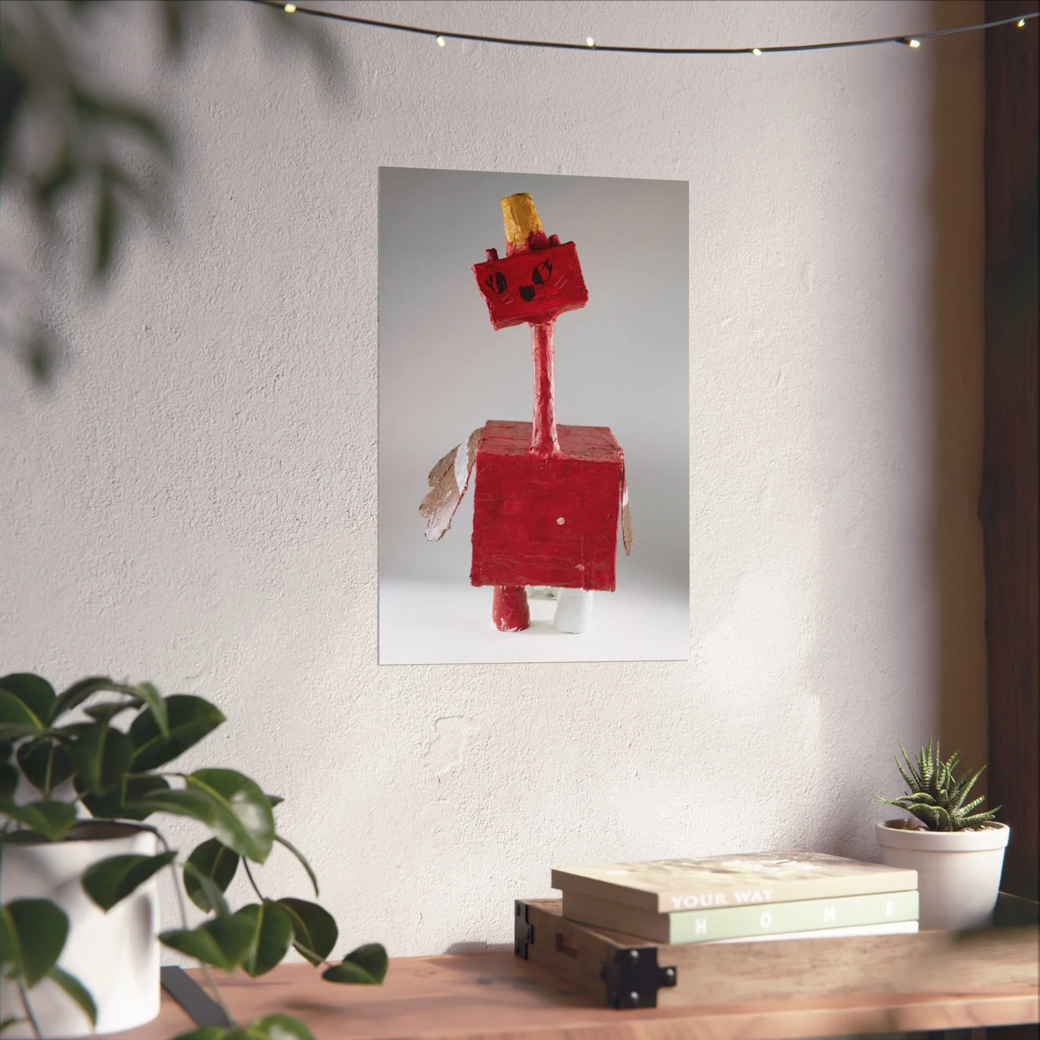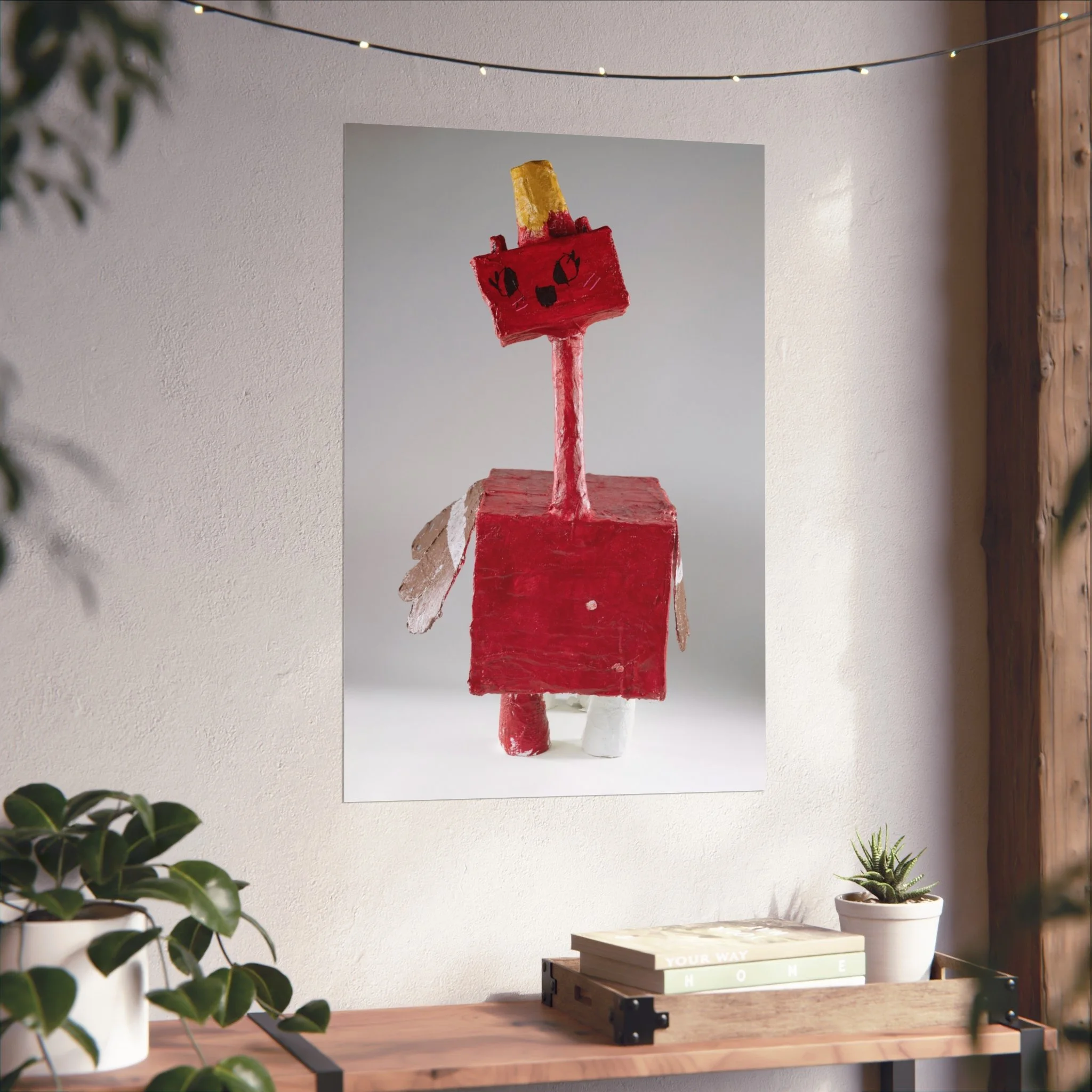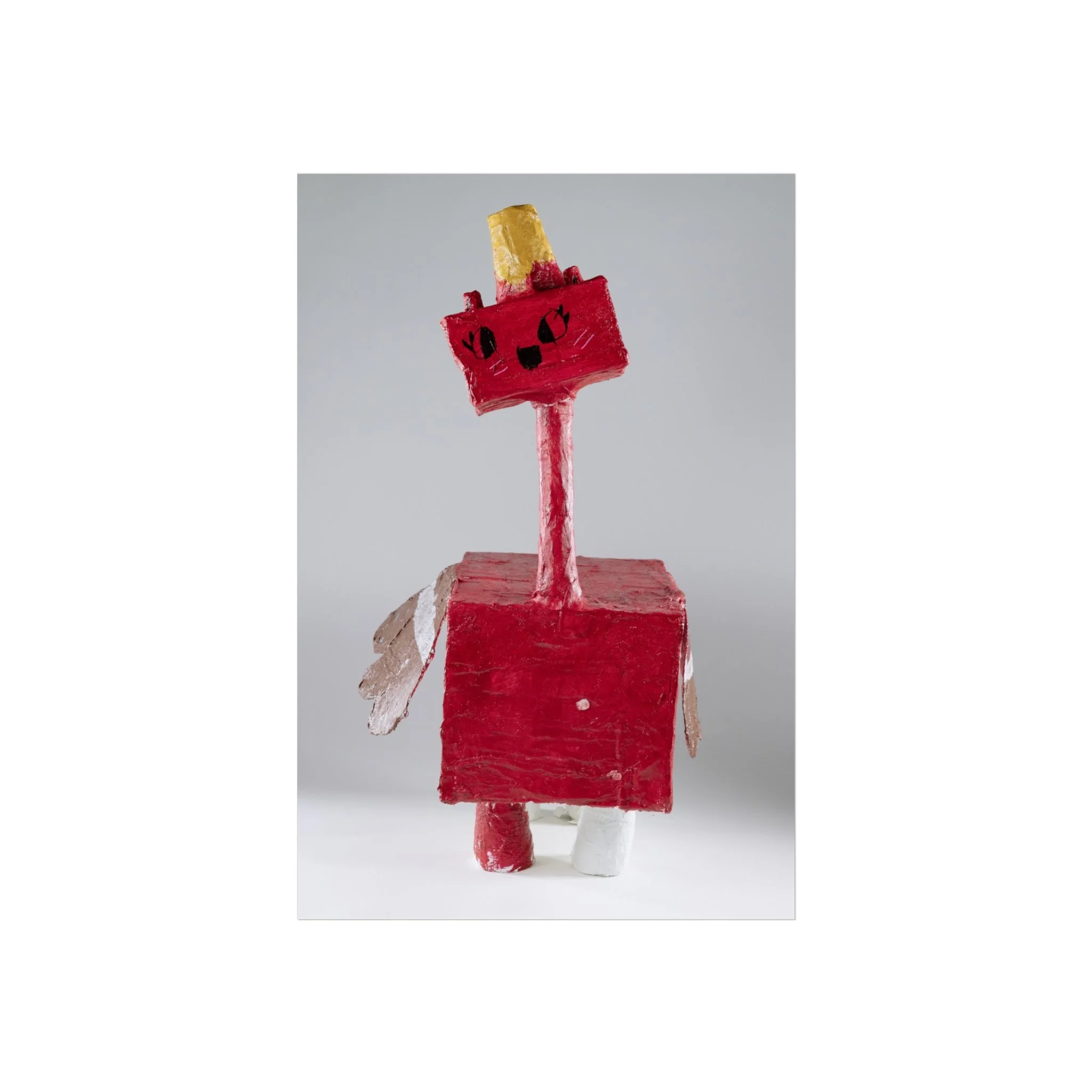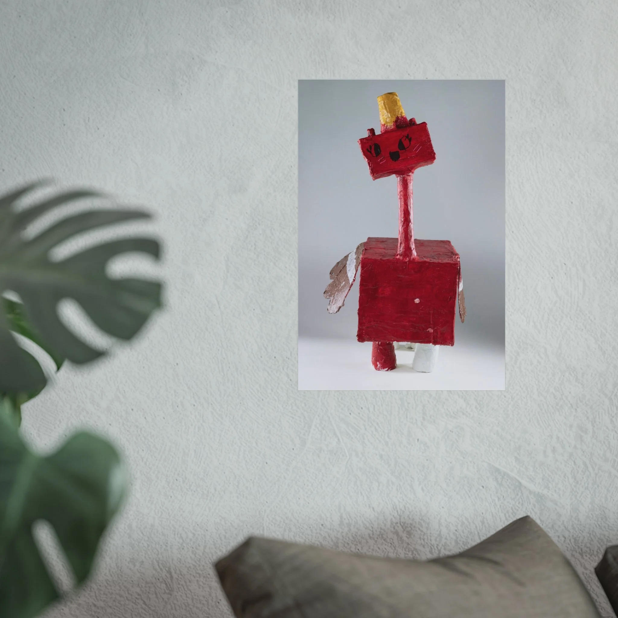 This fine art poster captures a playful, handcrafted sculpture—bright crimson blocks, a slender neck, and quirky golden crown—brought to life with museum-grade printing. The matte surface softens glare and lets the texture of the original object breathe: brushstrokes, paper edges, and the tactile charm of a homemade figure. It hangs quietly in a living room corner or studio nook, inviting smiles and sparking conversations about creativity, childhood craft, and inventive play.