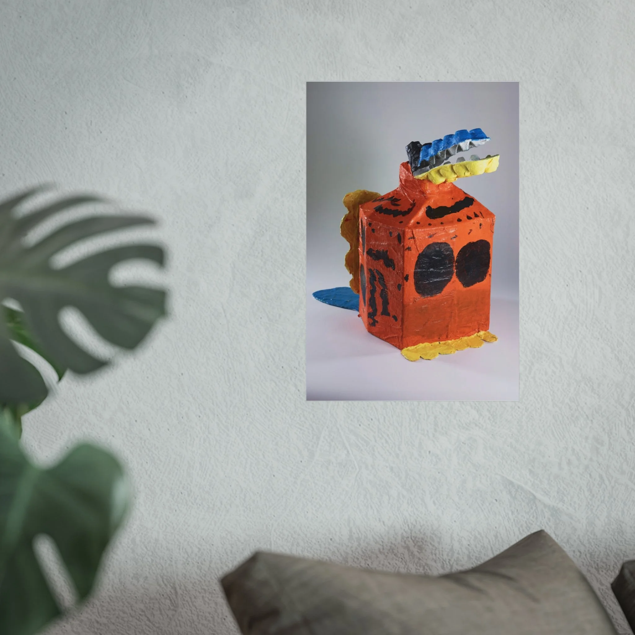 This fine art poster captures a playful, hand-crafted sculpture rendered in warm, saturated tones. Printed on smooth, gallery-grade 220 gsm paper with giclée quality and REACH-certified inks, the image keeps its texture and depth while offering a refined matte finish that reduces glare. The composition feels intimate and whimsical — like a small, joyful object discovered on a studio shelf — and adds a touch of creative warmth to living rooms, studios, or children's spaces. Choose from horizontal, vertical, or square layouts and multiple sizes to suit your wall and framing style.