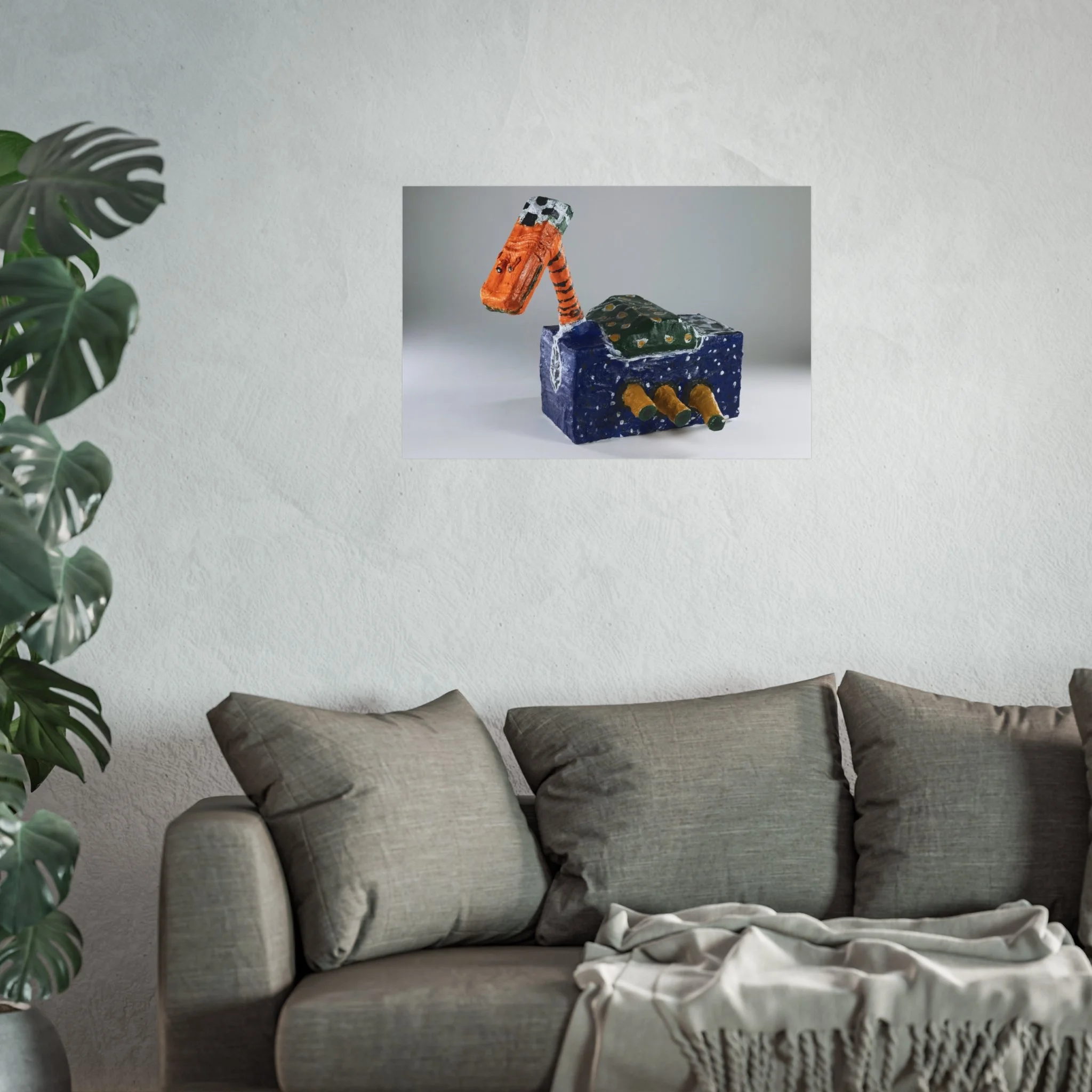 A gallery-quality fine art poster that celebrates handmade imagination. Printed on smooth, acid-free 220gsm paper with archival giclée quality and REACH-certified inks, this print captures every textured brushstroke and playful color of the original ceramic sculpture. Hung above a sofa or in a creative nook, the image brings a warm, curious energy — a little quirky, quietly joyful, and full of handcrafted charm. Available in horizontal, vertical, and square formats to suit your space, it arrives with a matte finish that reduces glare and keeps the tones soft and true.