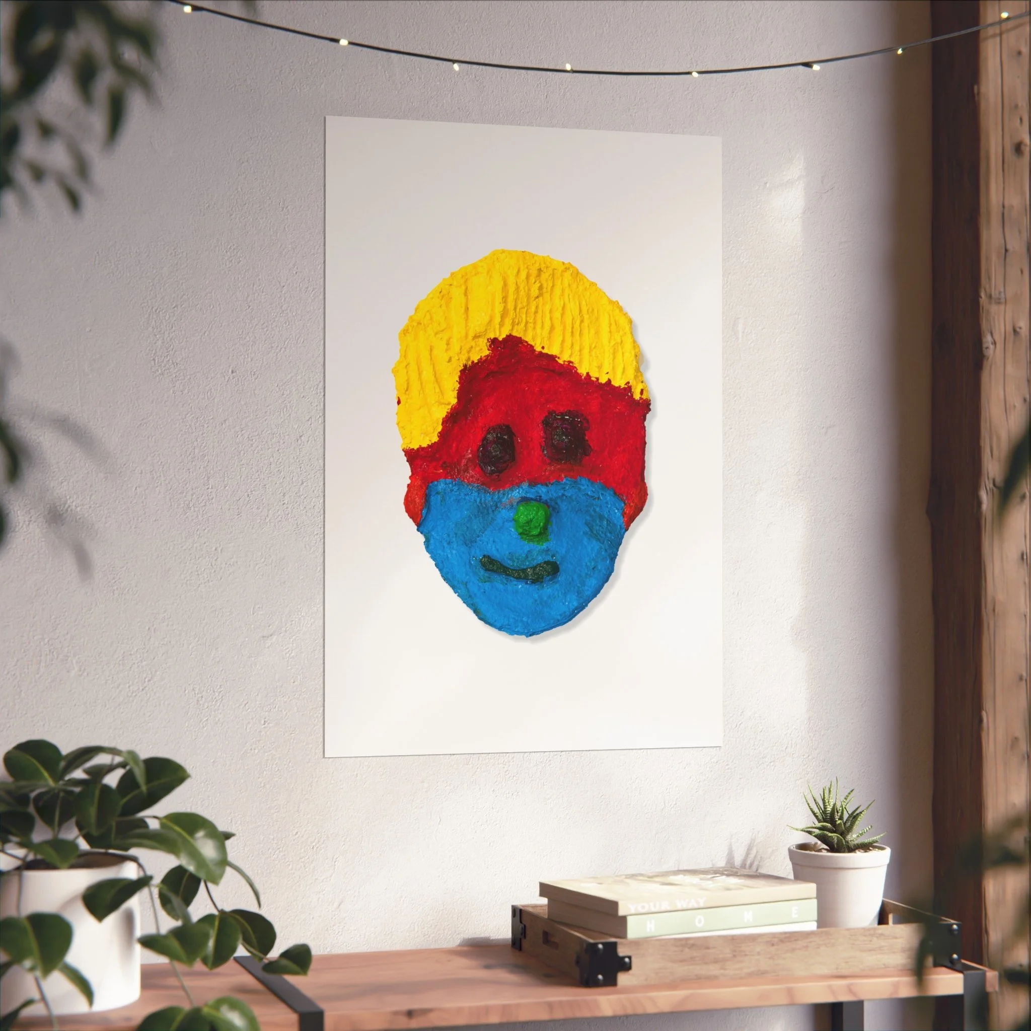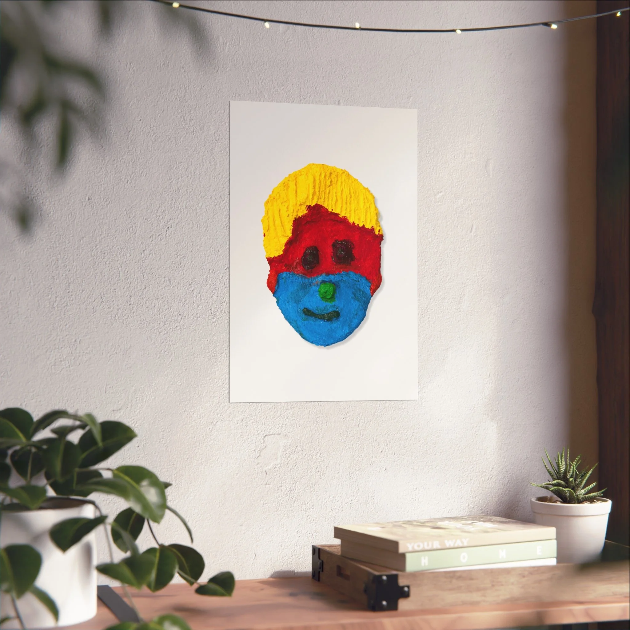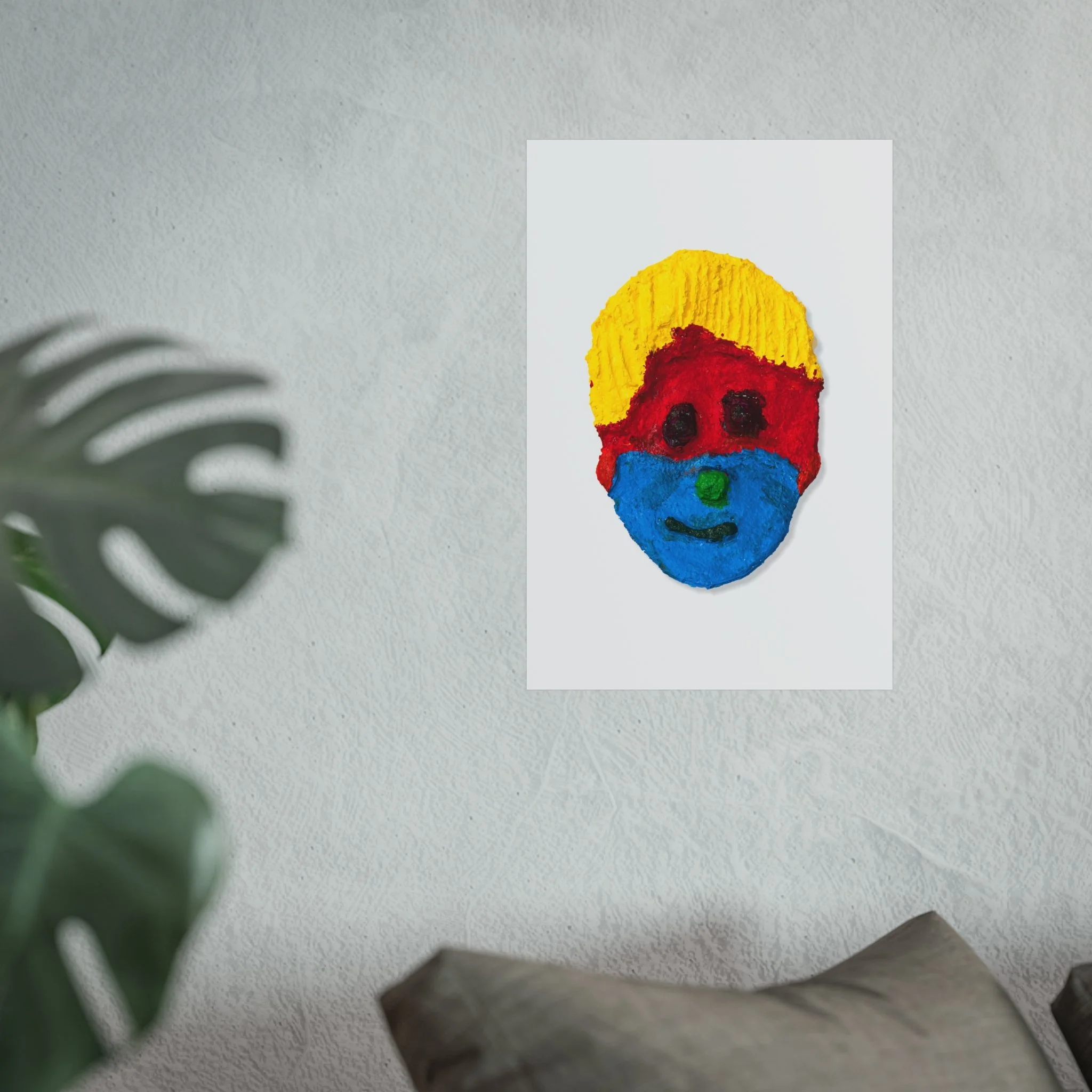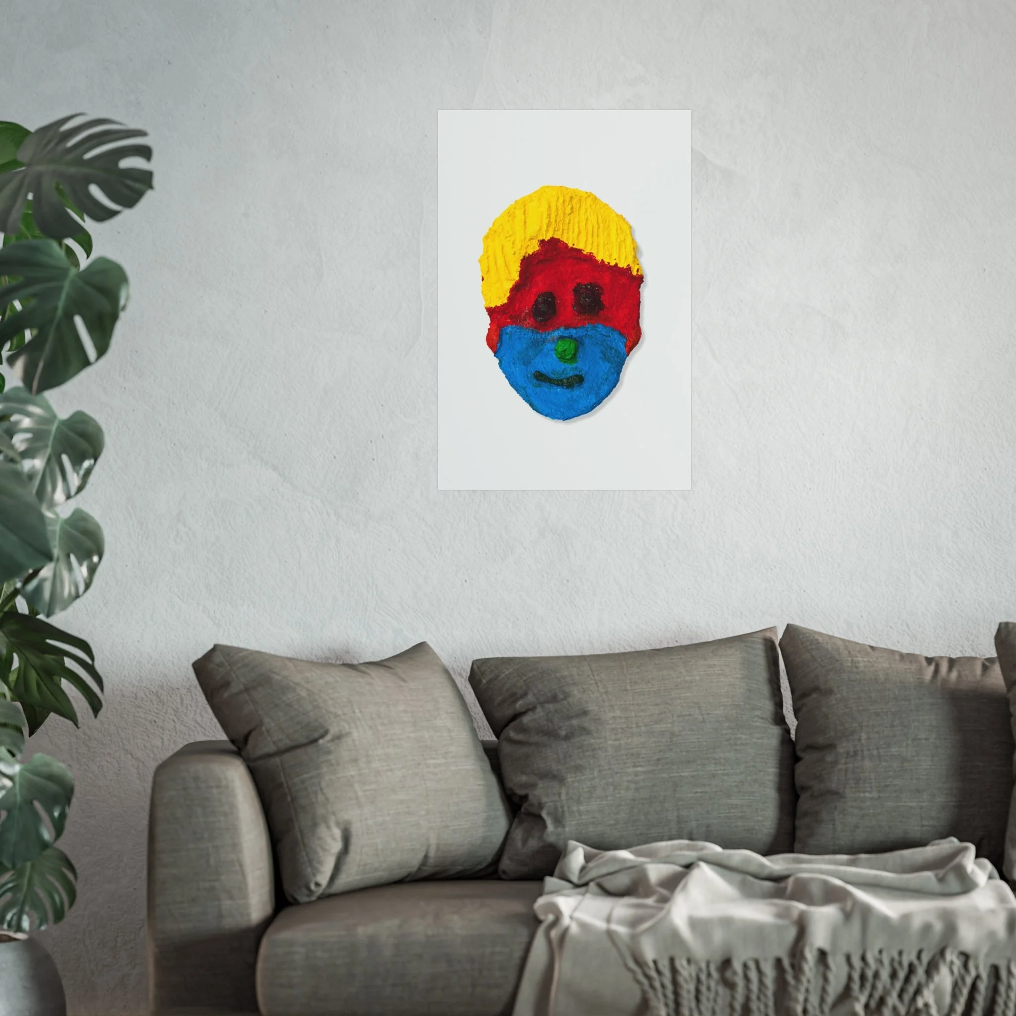 This fine art poster brings a playful, handmade energy to any wall. The giclée-quality print captures vibrant, painterly textures — a bright face rendered in bold yellow, red, blue and green that feels both childlike and intentionally crafted. Printed on smooth, gallery-grade 220gsm acid-free paper with a matte finish, the image reads with depth and tactile presence even without a frame. It slips into casual, creative spaces: studio walls, nursery corners, or eclectic living rooms where color and personality are welcome. Available in horizontal, vertical, and square formats and multiple sizes, the poster adapts to gallery arrangements or a single statement placement. The materials and printing follow high standards (EUTR-compliant wood sourcing and REACH-certified inks), so the piece looks lively while meeting responsible production practices.