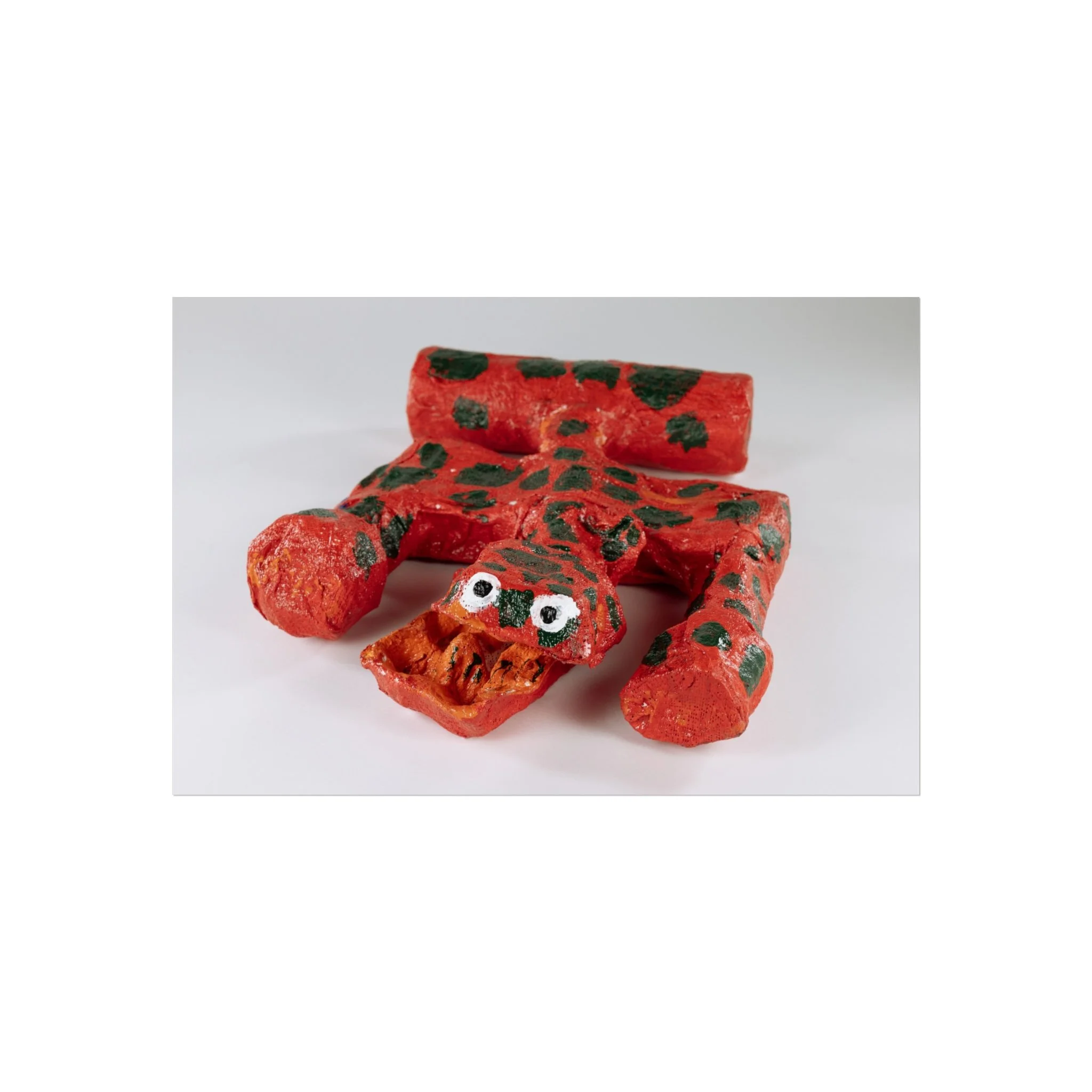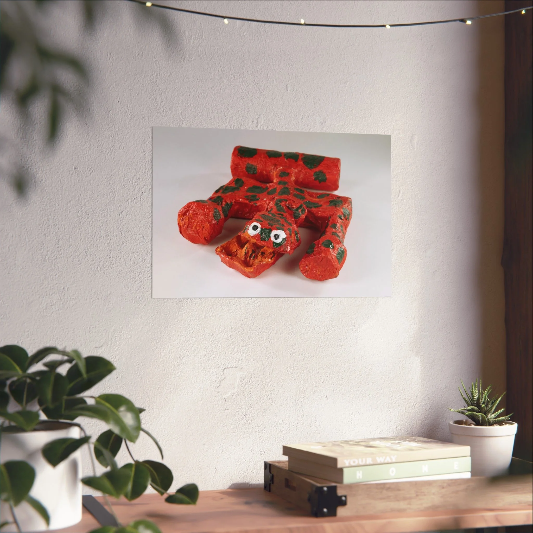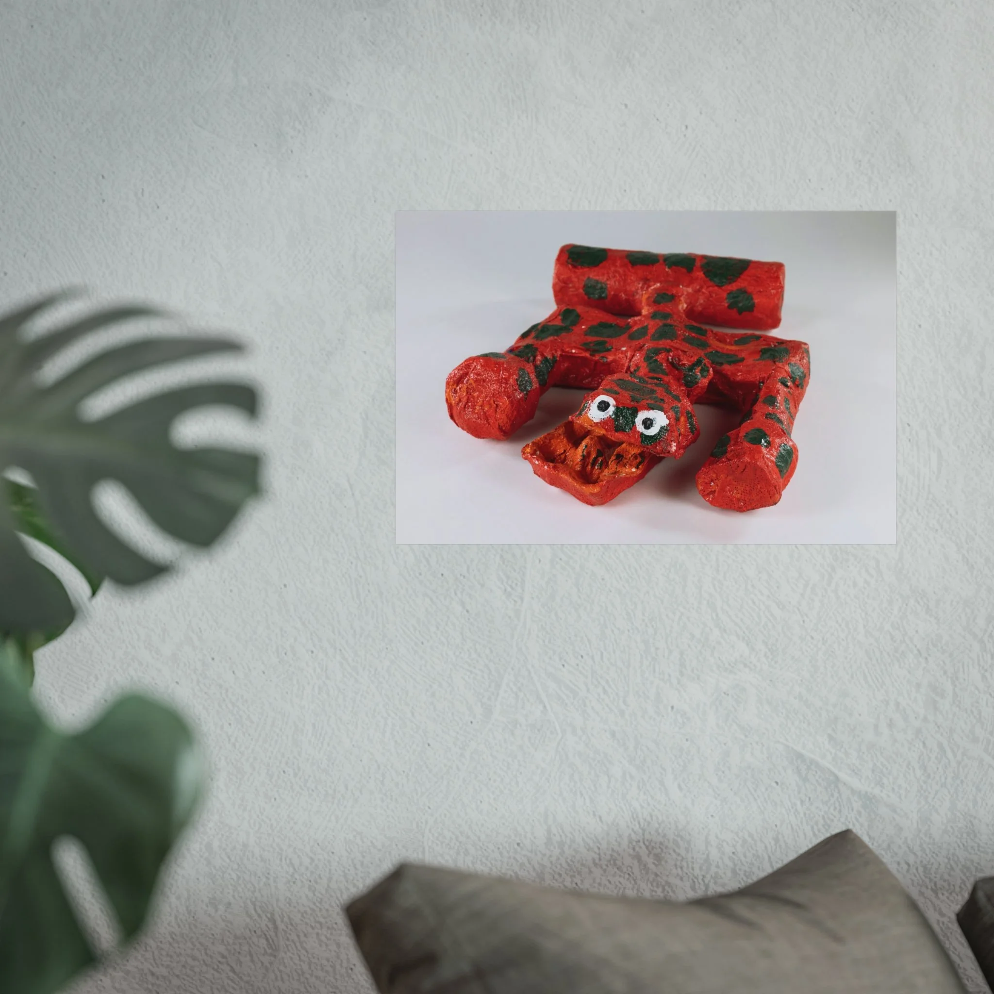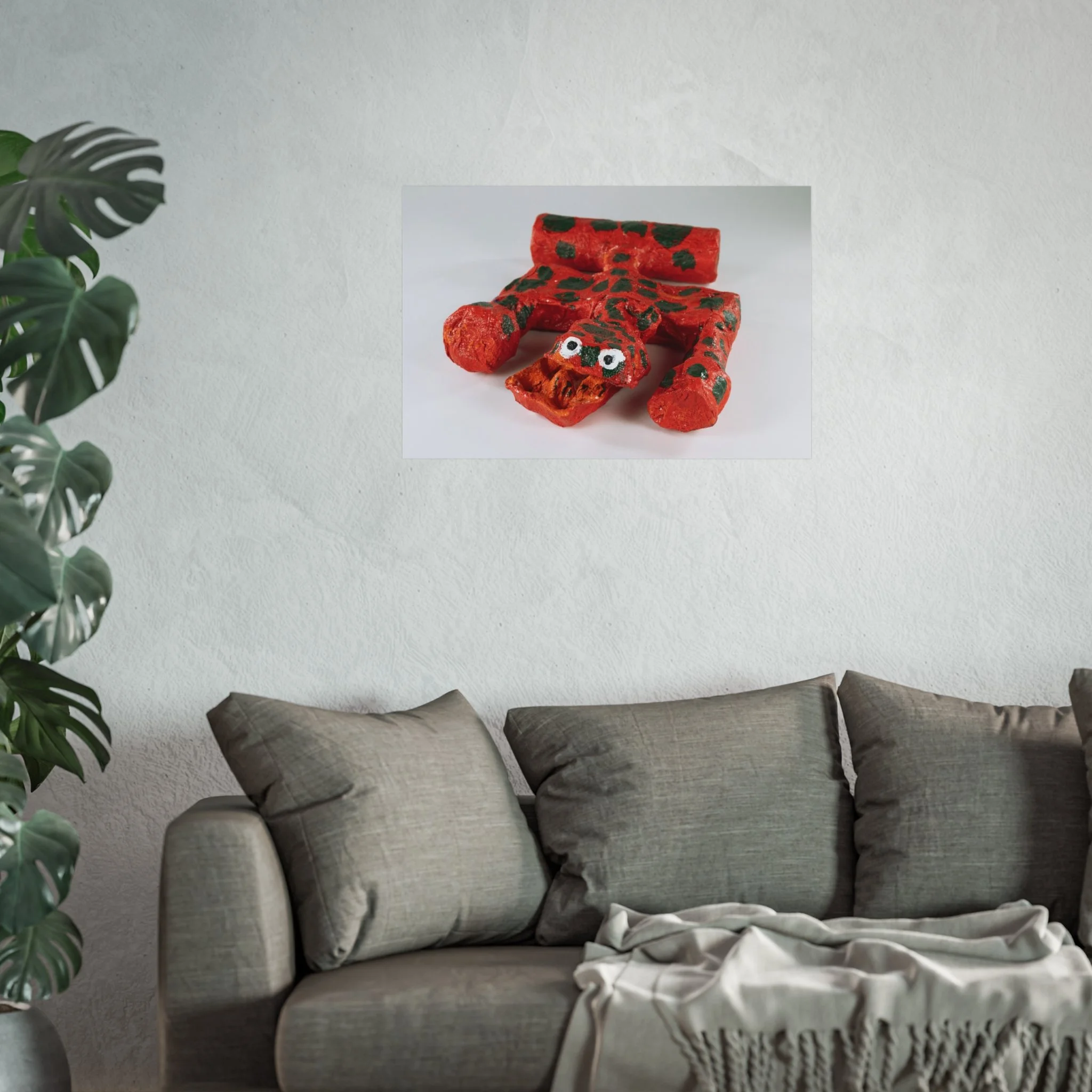 This fine art poster captures a playful, textured sculpture in bold red and deep green. The image feels tactile — handmade clay or papier-mâché shapes, quirky eyes and a raw, expressive surface. Hung on a pale wall, the print brings a burst of color and a sense of whimsical craft to quiet living rooms, studios, or creative corners. The matte, gallery-grade finish keeps the tones soft yet vivid, letting viewers focus on the handmade details and the joyful, slightly mischievous character of the piece. Choose a horizontal, vertical, or square layout to suit your wall and scale up the feeling of presence in shared spaces or personal studios.