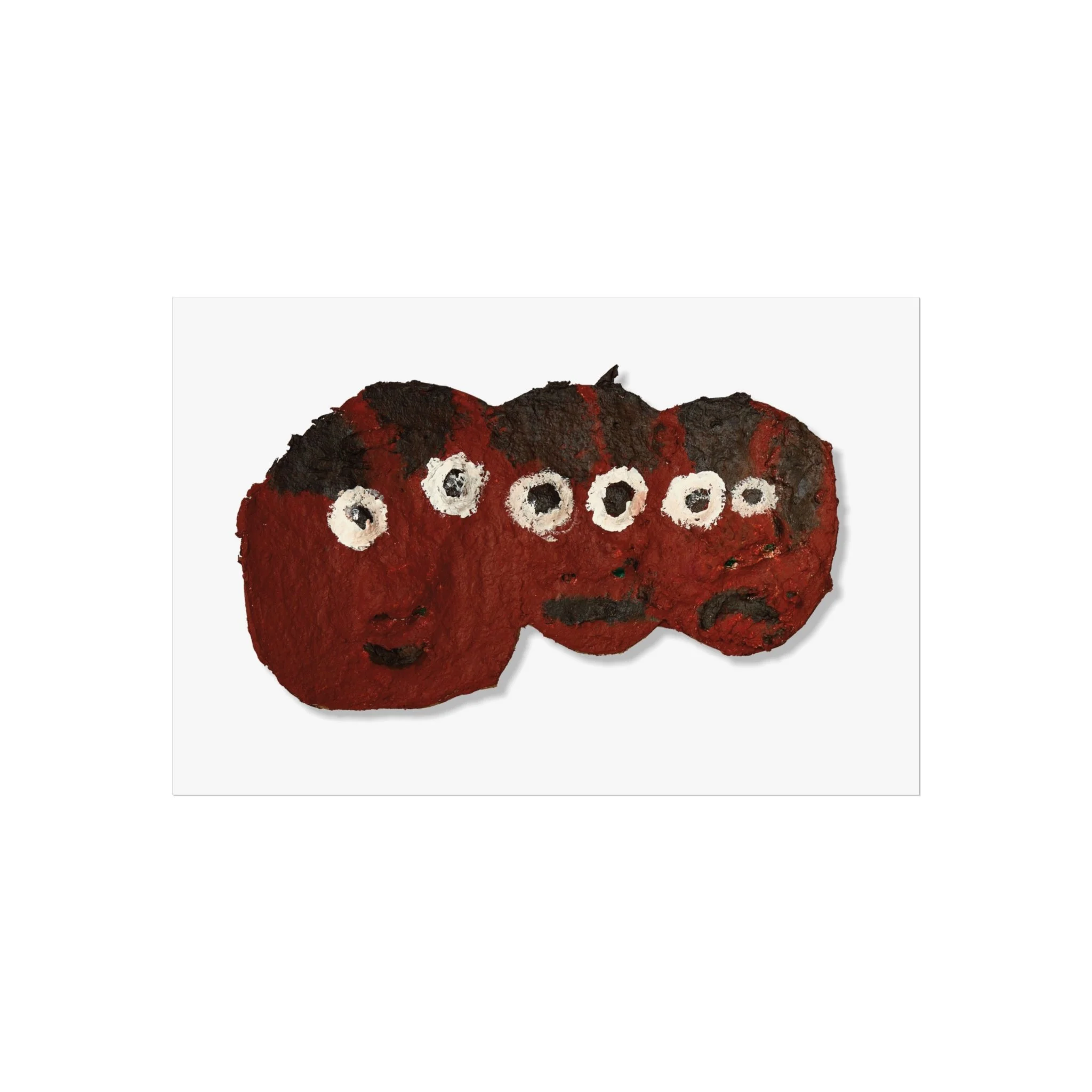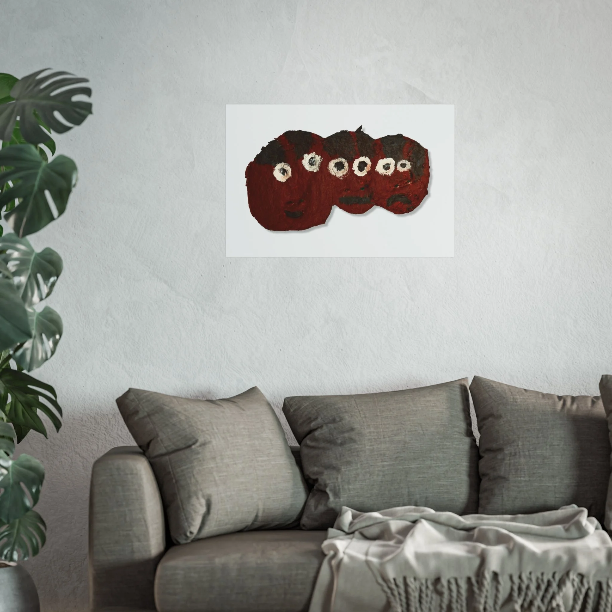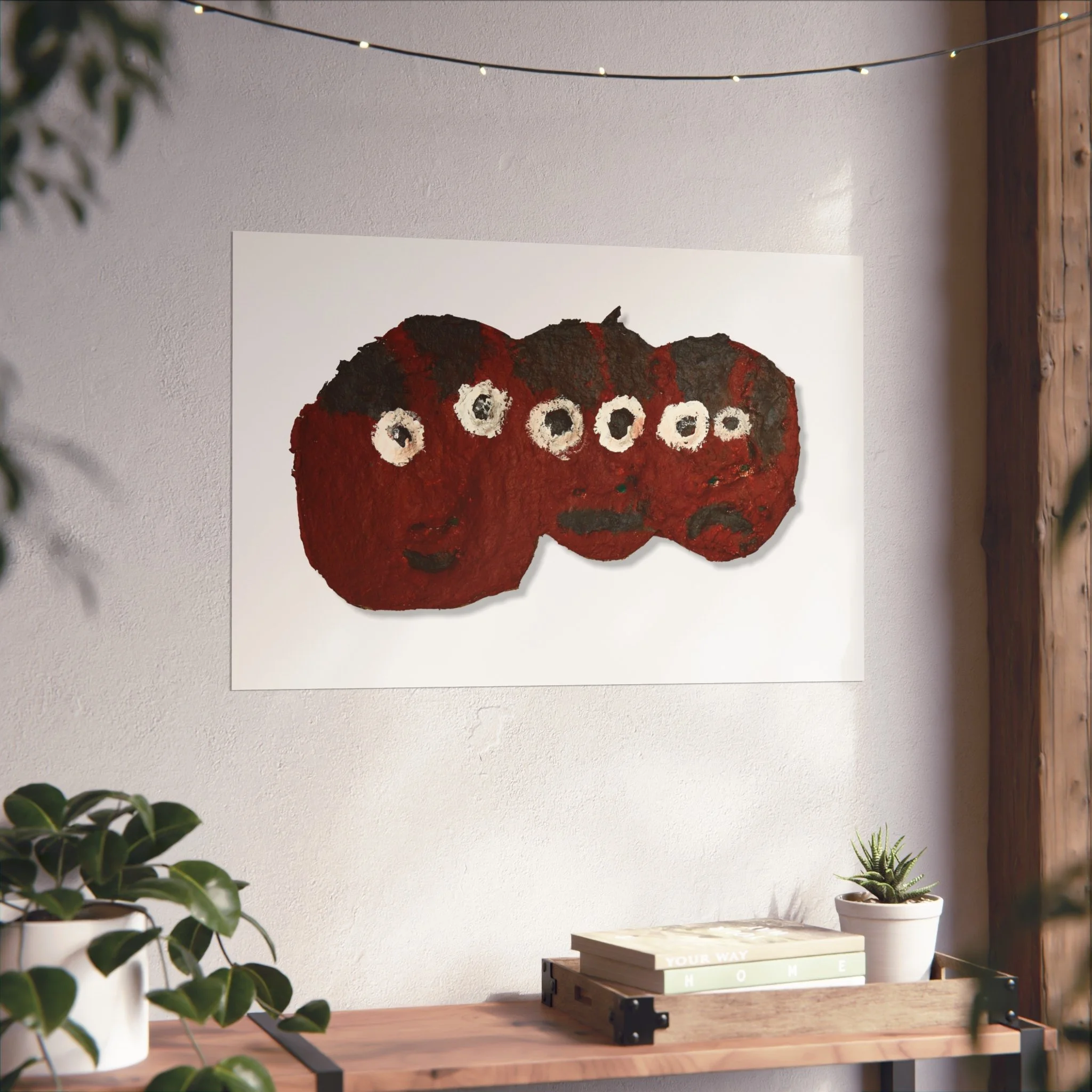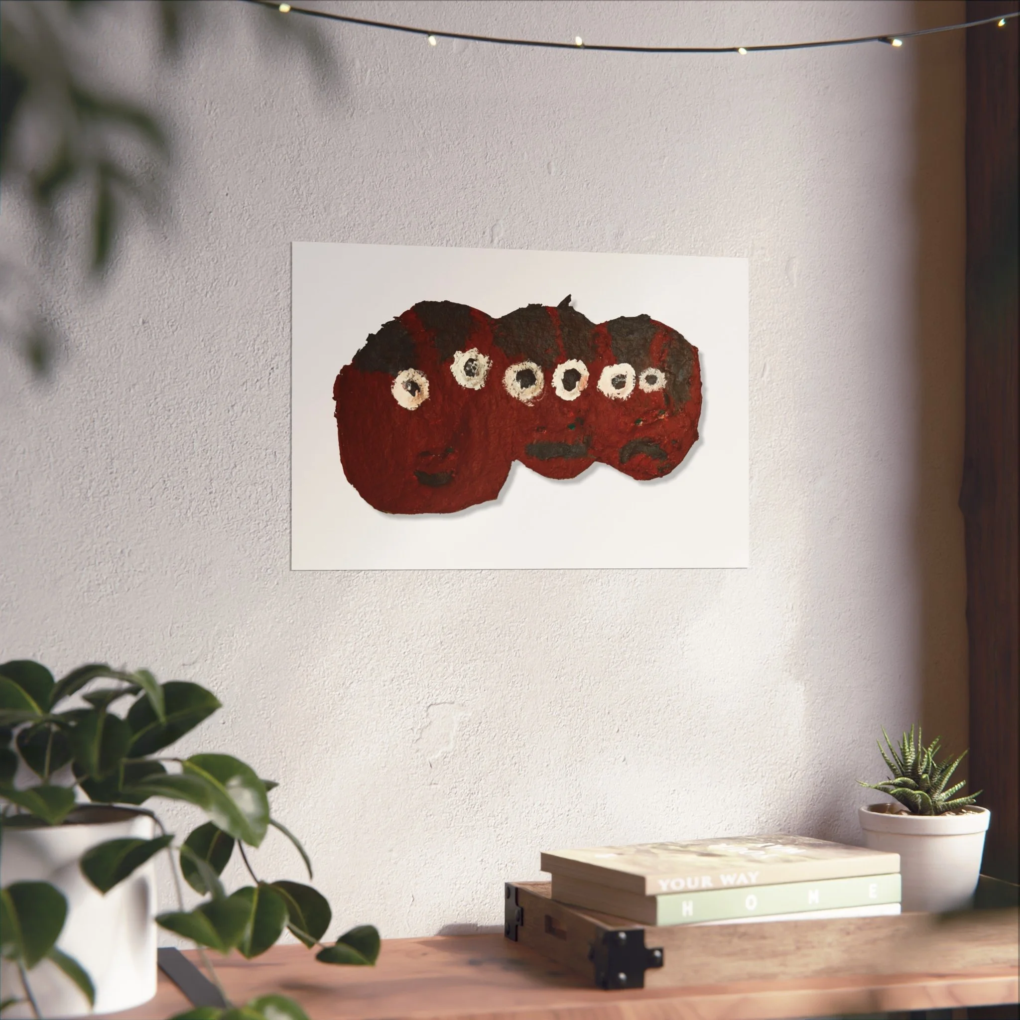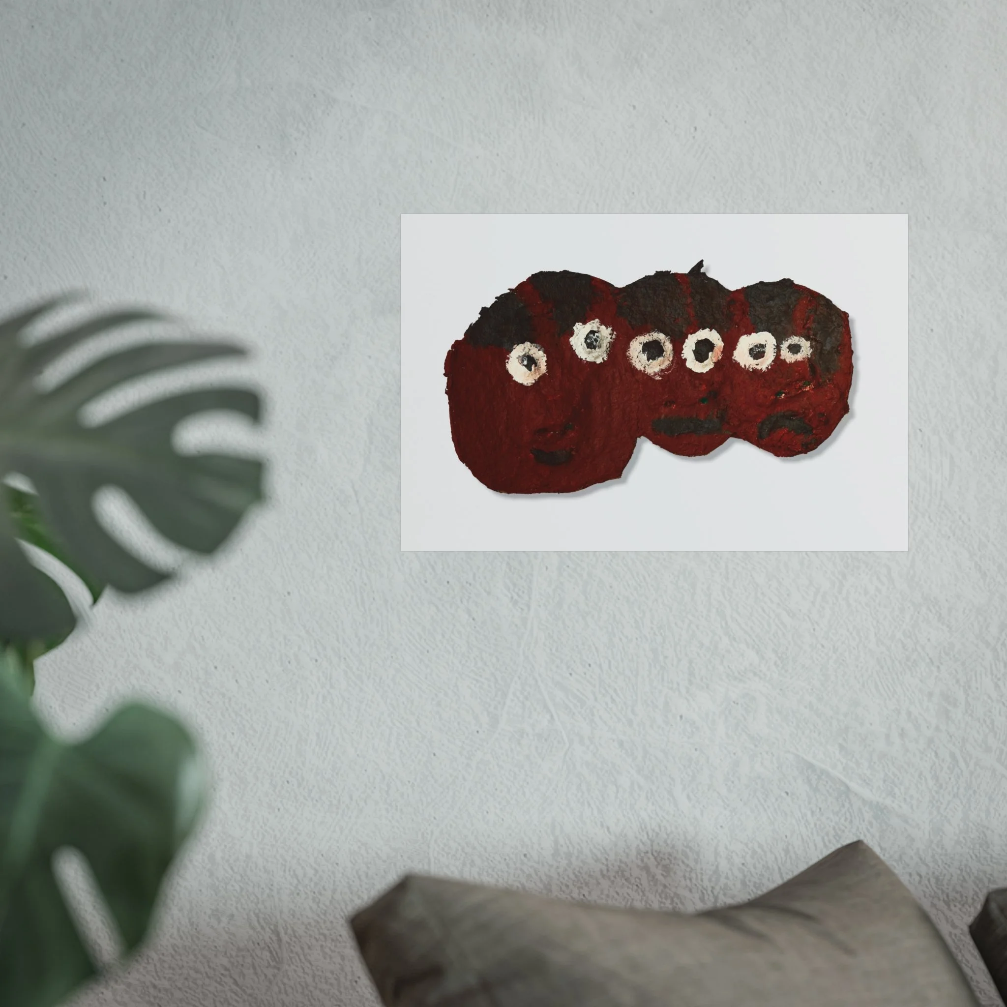 A small series of whimsical, textured faces rendered in deep crimson and coal black — this fine art poster brings a hand-made, tactile warmth to any pared-back interior. Printed on smooth, gallery-grade 220gsm paper with giclée quality and REACH-certified inks, the image preserves brushstrokes and the subtle roughness of the original work. It sits comfortably above a couch or in a quiet nook, adding a playful, slightly mysterious presence that feels like a private discovery. Choose horizontal, vertical, or square formats in multiple sizes to suit a gallery wall or a lone statement piece. Sustainably sourced materials — EUTR-compliant wood components and UK-produced blanks — mean you can display this lively artwork with confidence.