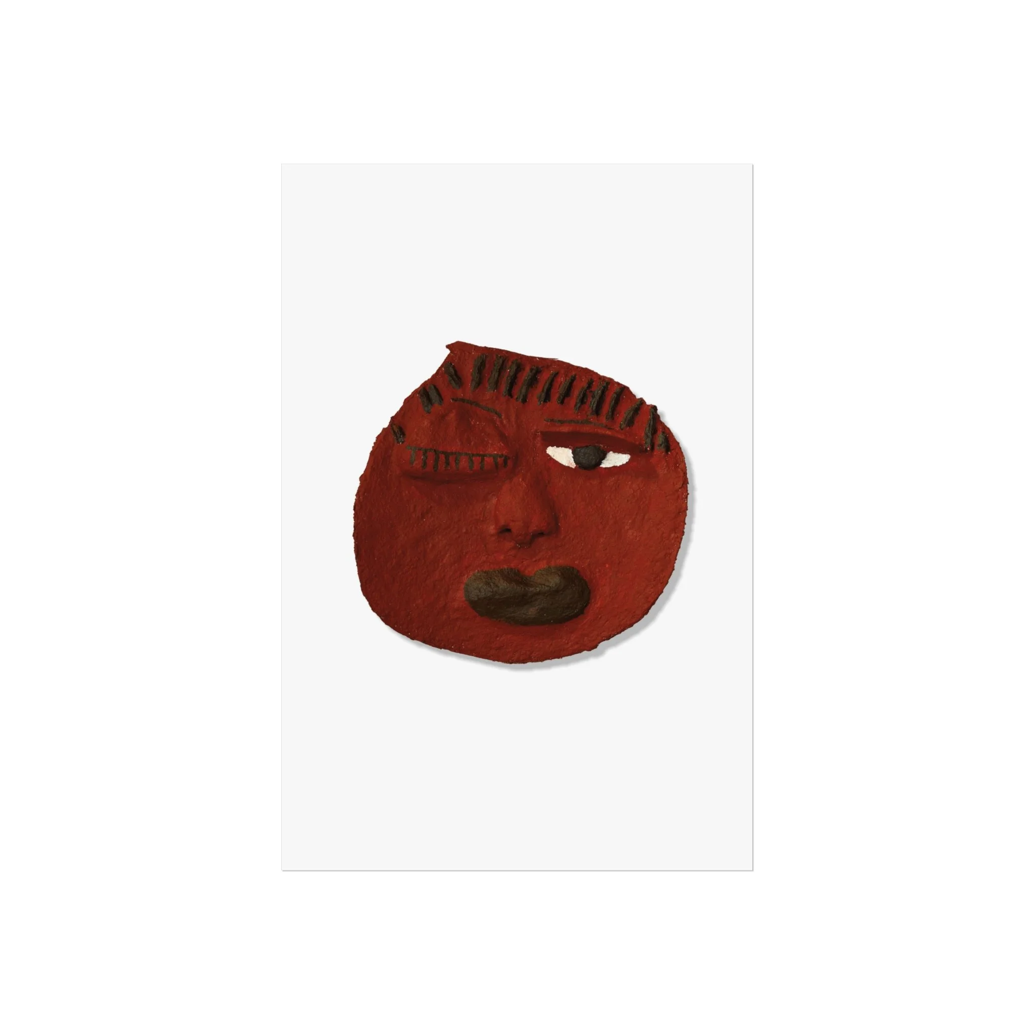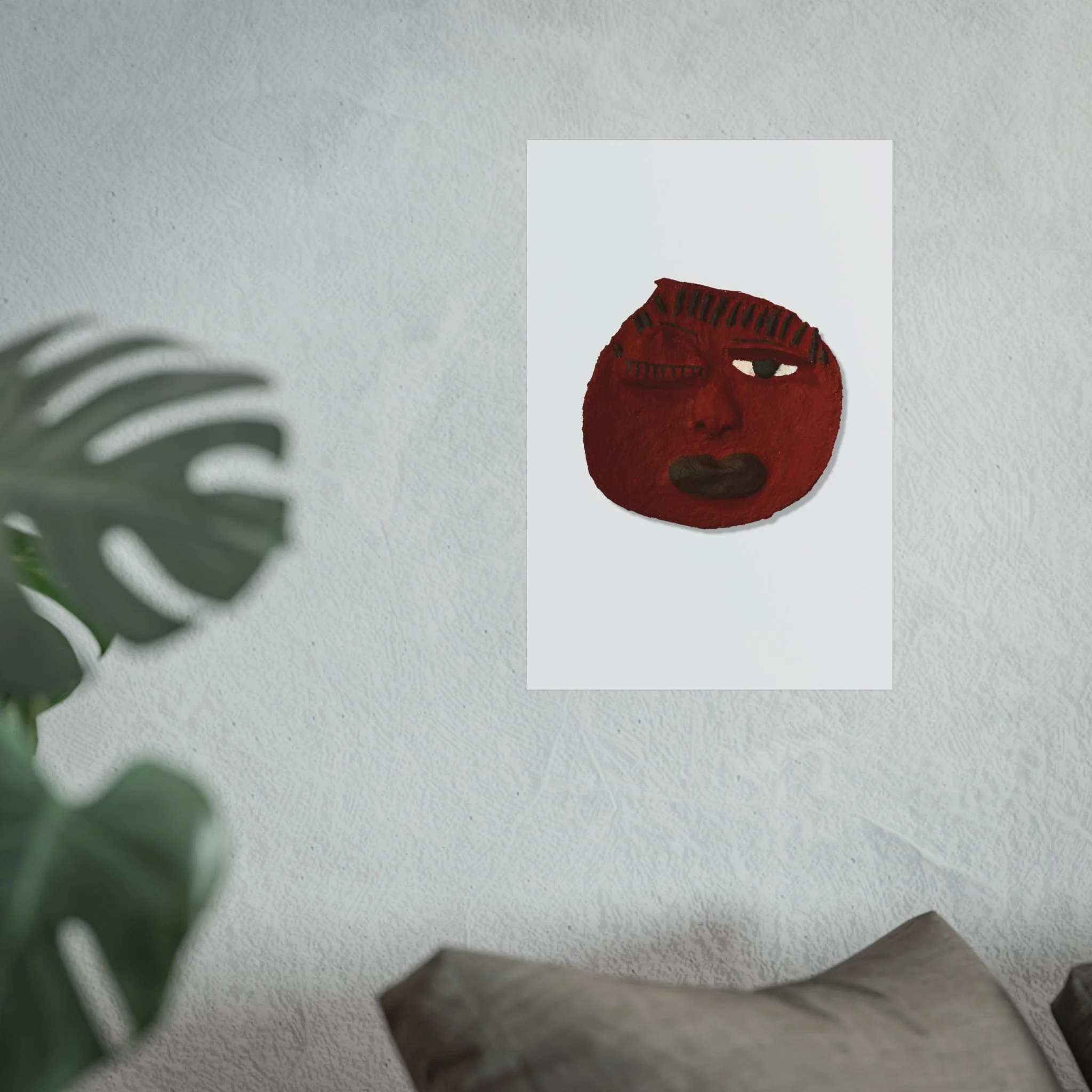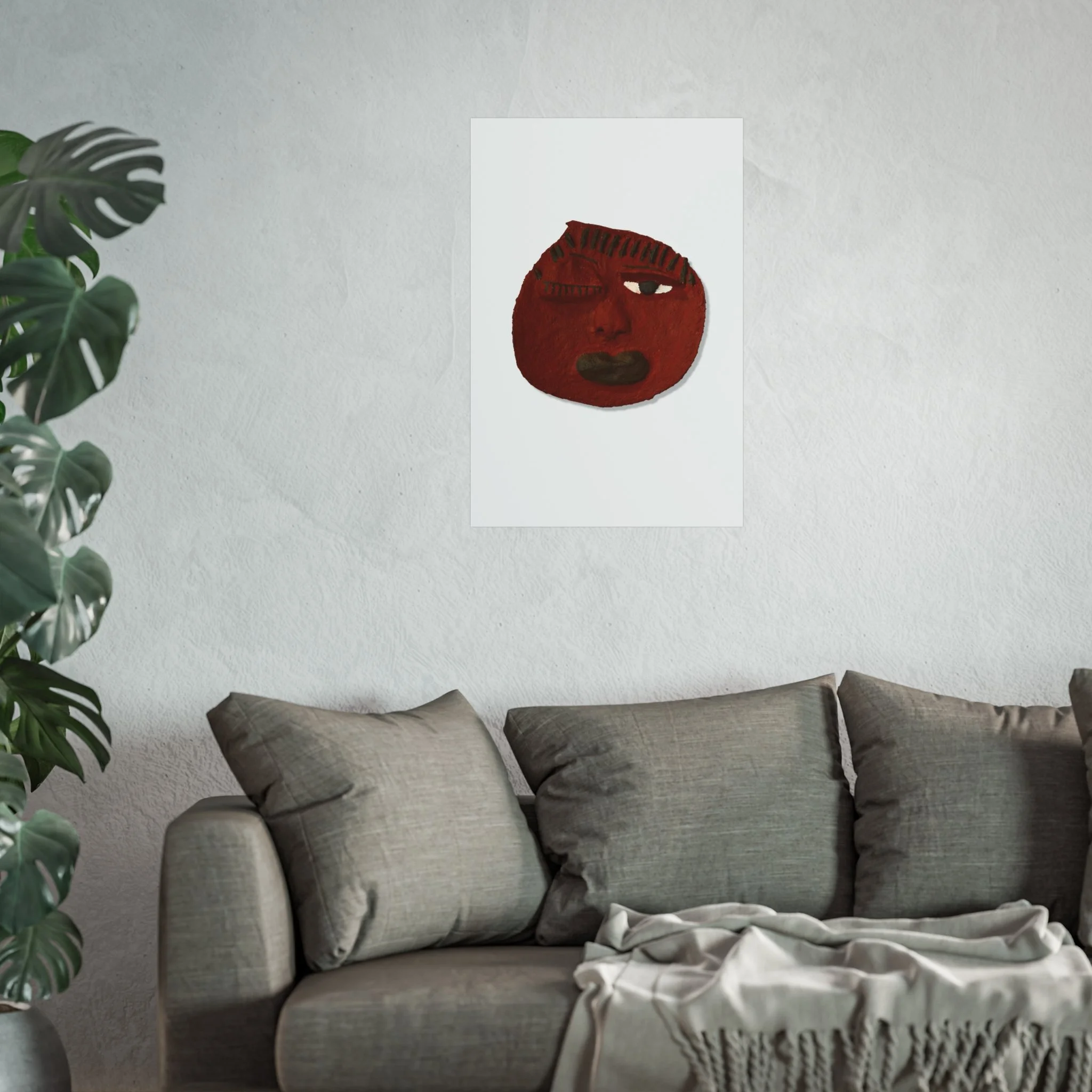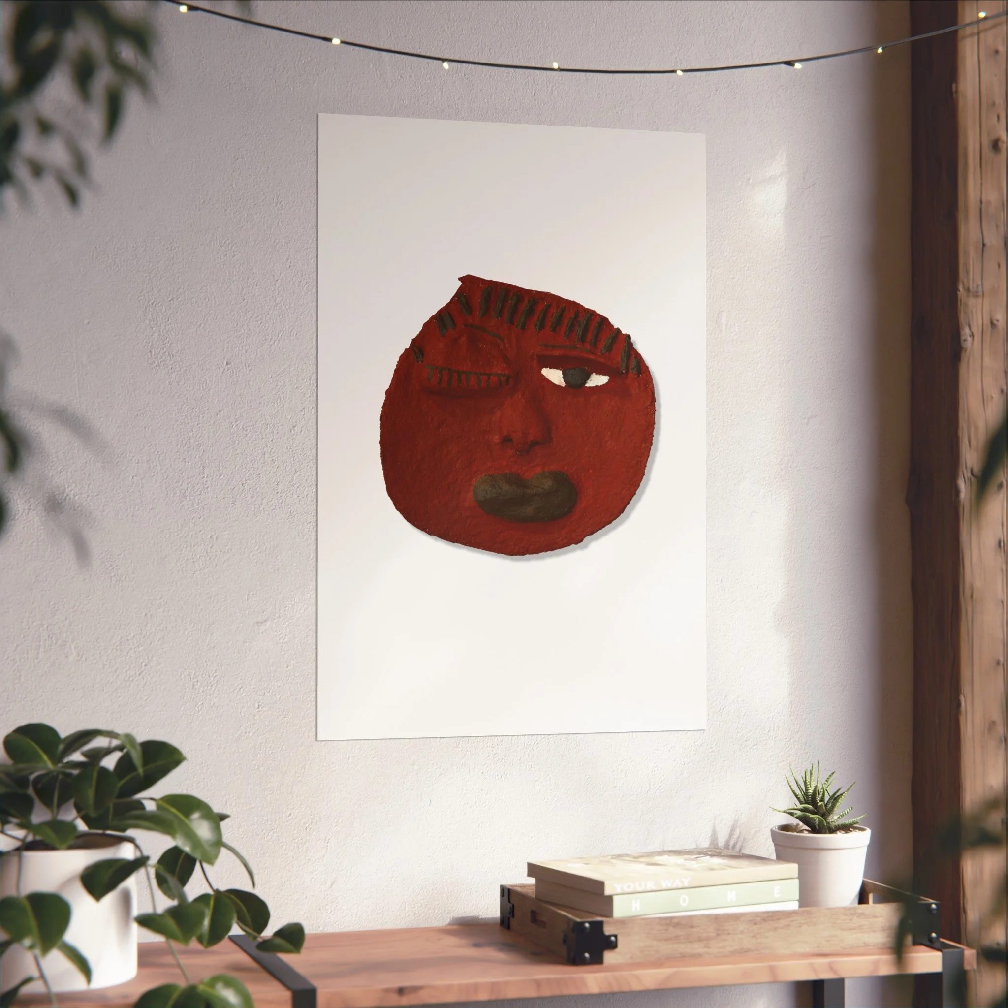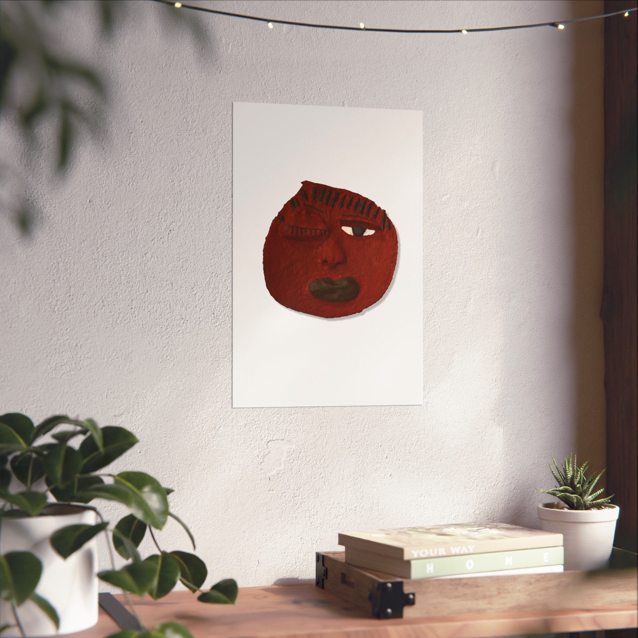 A small, soulful portrait printed on smooth, gallery-grade paper. The image centers on a rich, rust-red face with textured brushwork, heavy-lidded eyes, and sculpted lips — a piece that brings quiet presence and character to a living room corner, studio wall, or bedside nook. The matte, giclée-quality finish preserves subtle color depth and tactile brush marks, letting the portrait feel both intimate and contemporary. Hung alone or in a curated cluster, it reads as thoughtful, tactile art that invites lingering looks and soft conversation during slow afternoons or candlelit evenings.