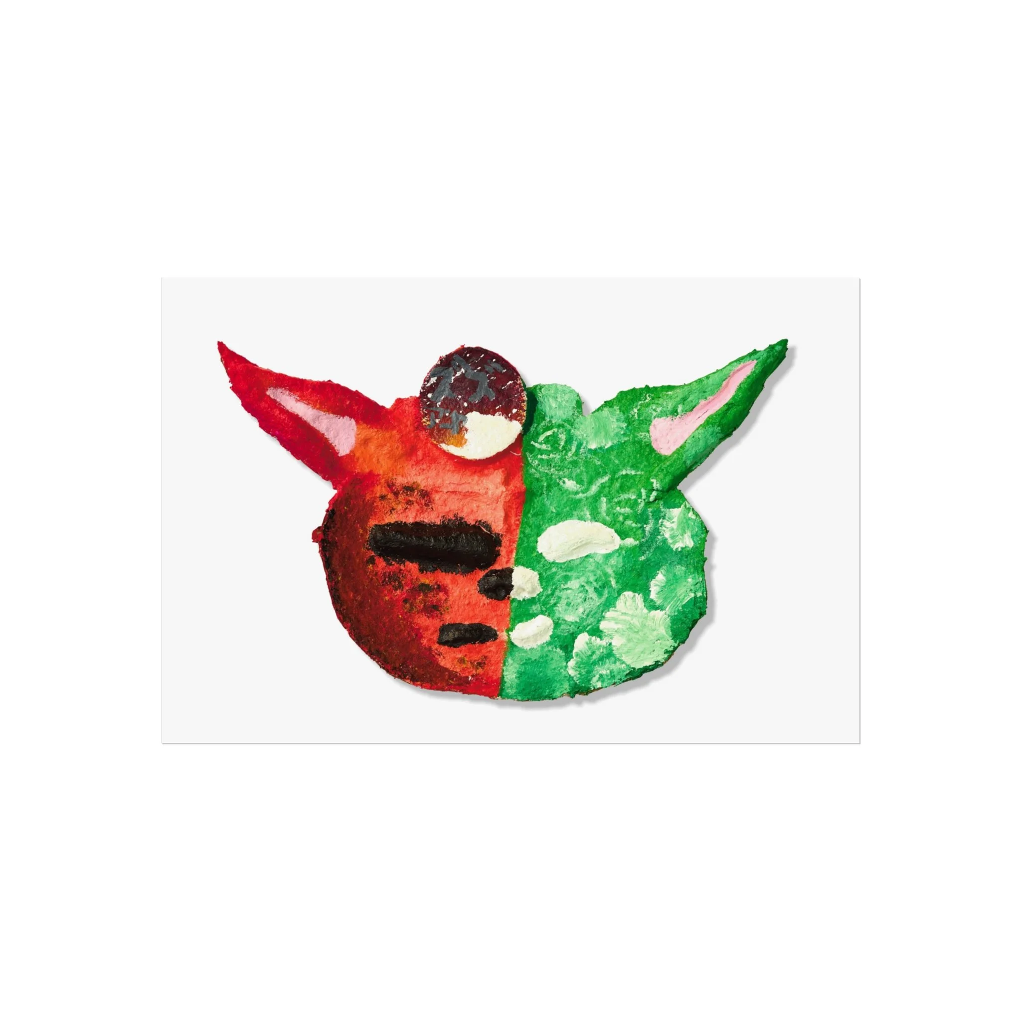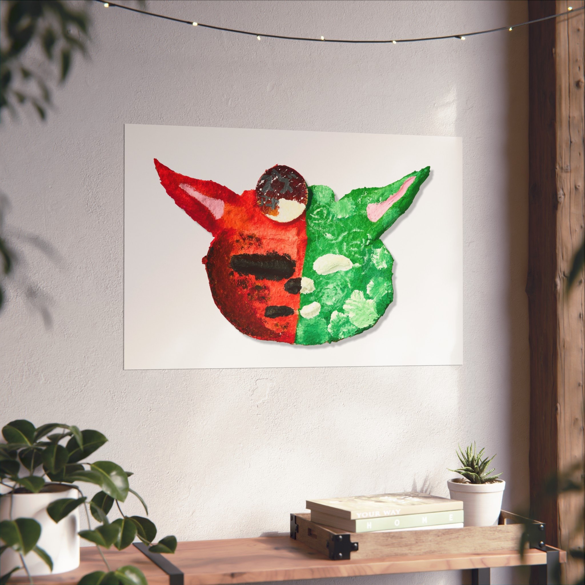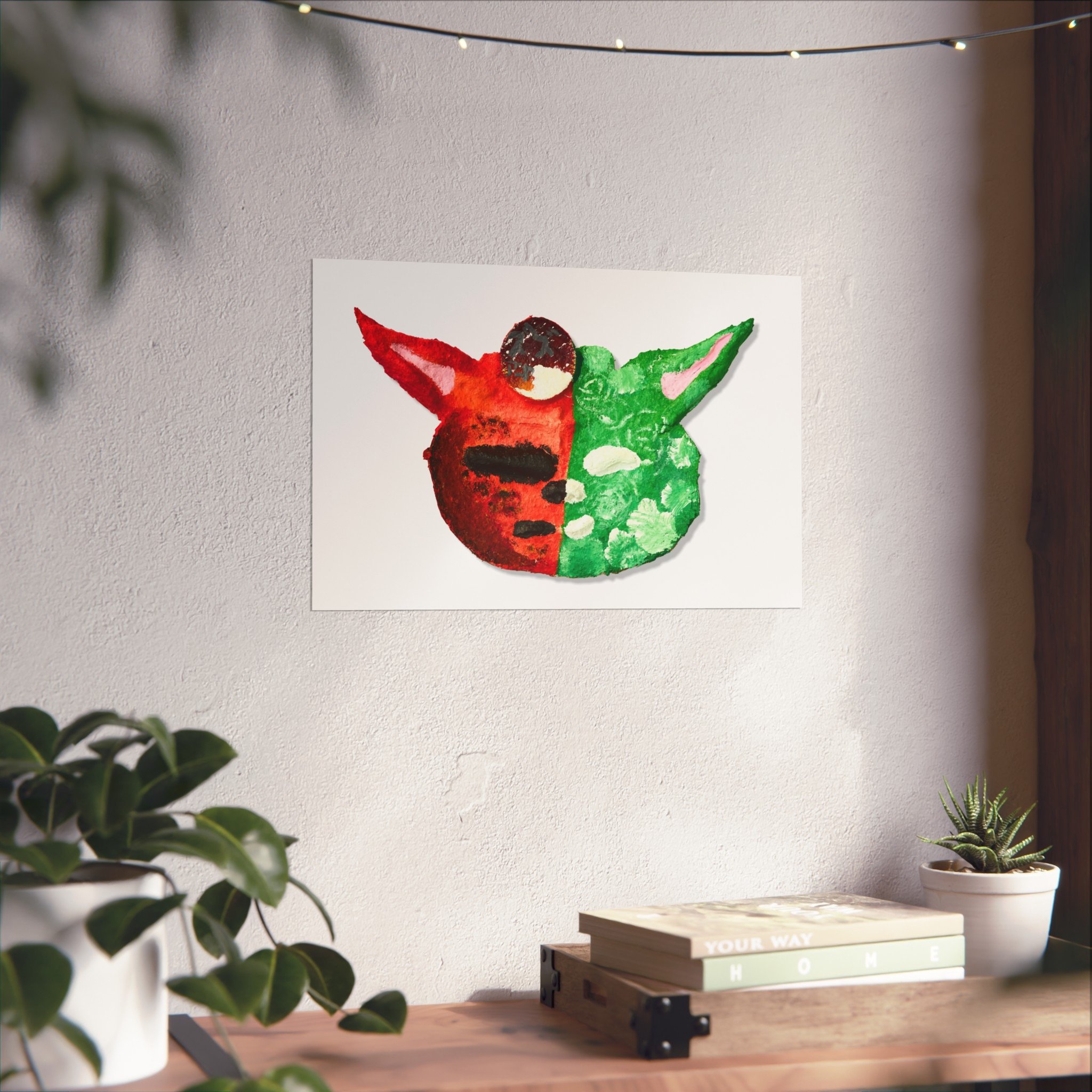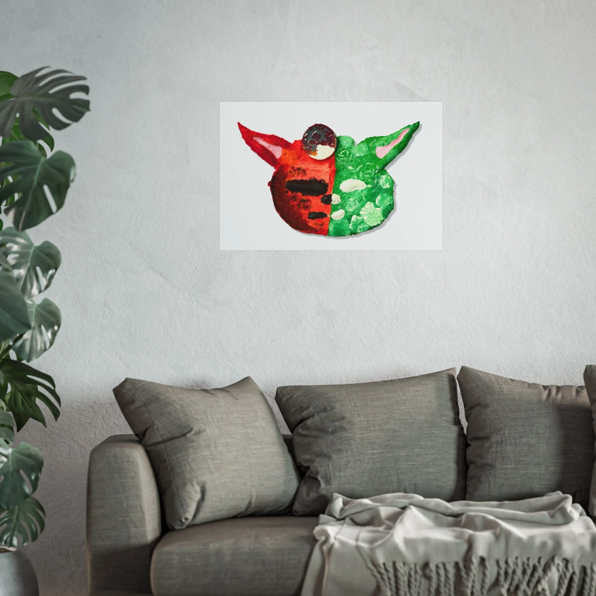 A small, surreal creature stares back from a hand-painted split face — warm red on one side, cool green on the other — rendered in watercolor textures and printed with museum-grade detail. This fine art poster brings an intimate, offbeat energy to a wall: it feels like a fragment of a dream or a curious companion found in a sketchbook. Hang it where quiet corners meet lively conversation. It pairs beautifully with indoor plants, textured plaster, or vintage frames, adding a playful, slightly mysterious focal point to living rooms, studios, or reading nooks.