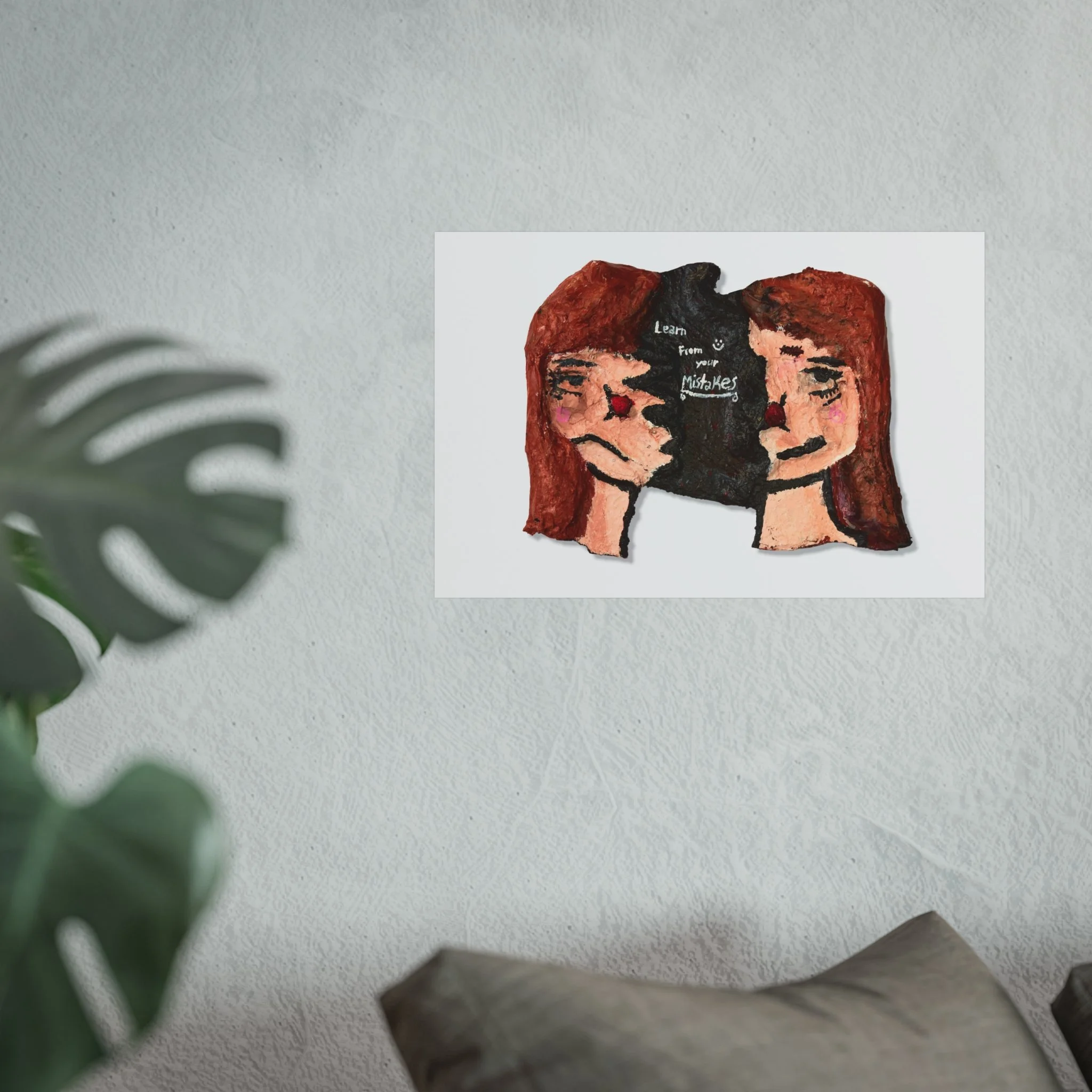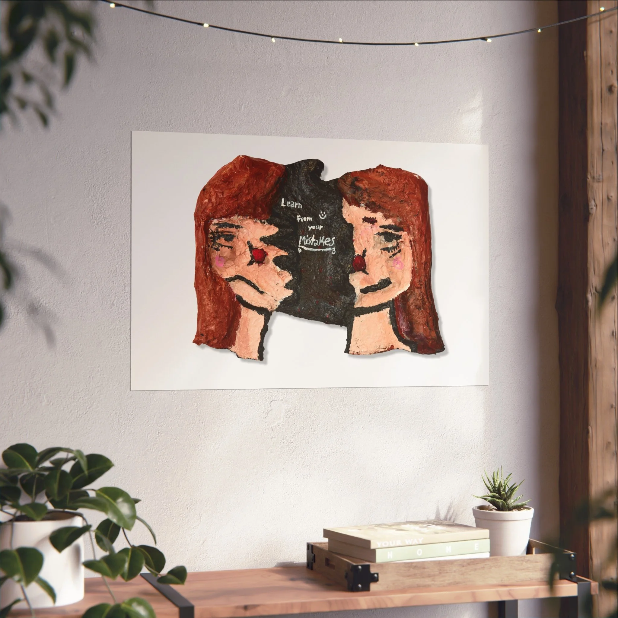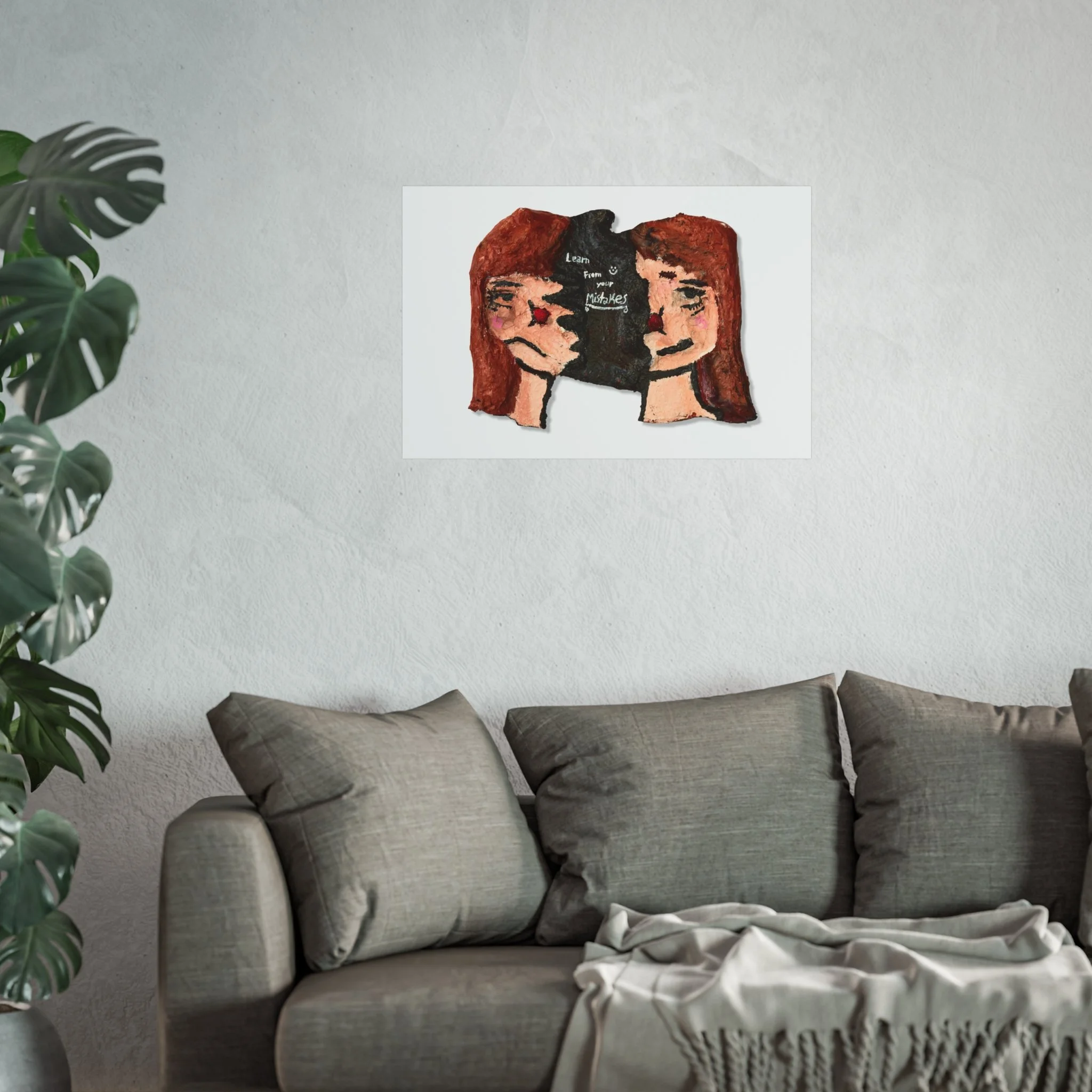 This gallery-style fine art poster captures a raw, intimate portrait rendered in earthy tones and textured brushwork. The piece reads like a visual whisper—two mirrored faces separated by a dark, imperfect divide where tiny handwritten text appears. It carries quiet vulnerability and a sense of personal memory, fitting into rooms where art is meant to spark reflection. Printed on smooth, matte, gallery-grade paper with giclée quality, the image keeps its tactile, painterly details alive on each size and orientation. Hung above a reading nook or on a bedroom wall, it creates a contemplative corner that invites slow looks and gentle conversations.