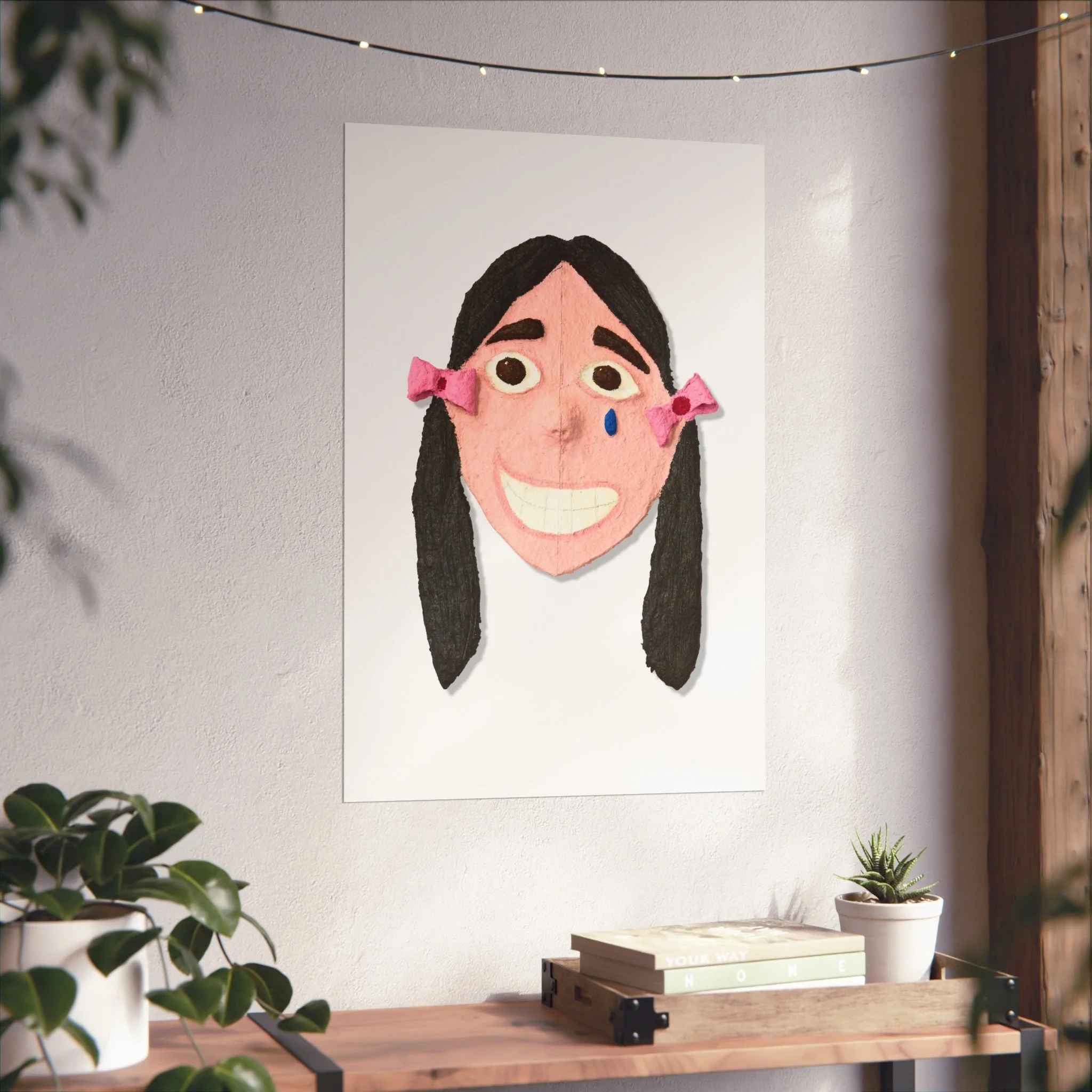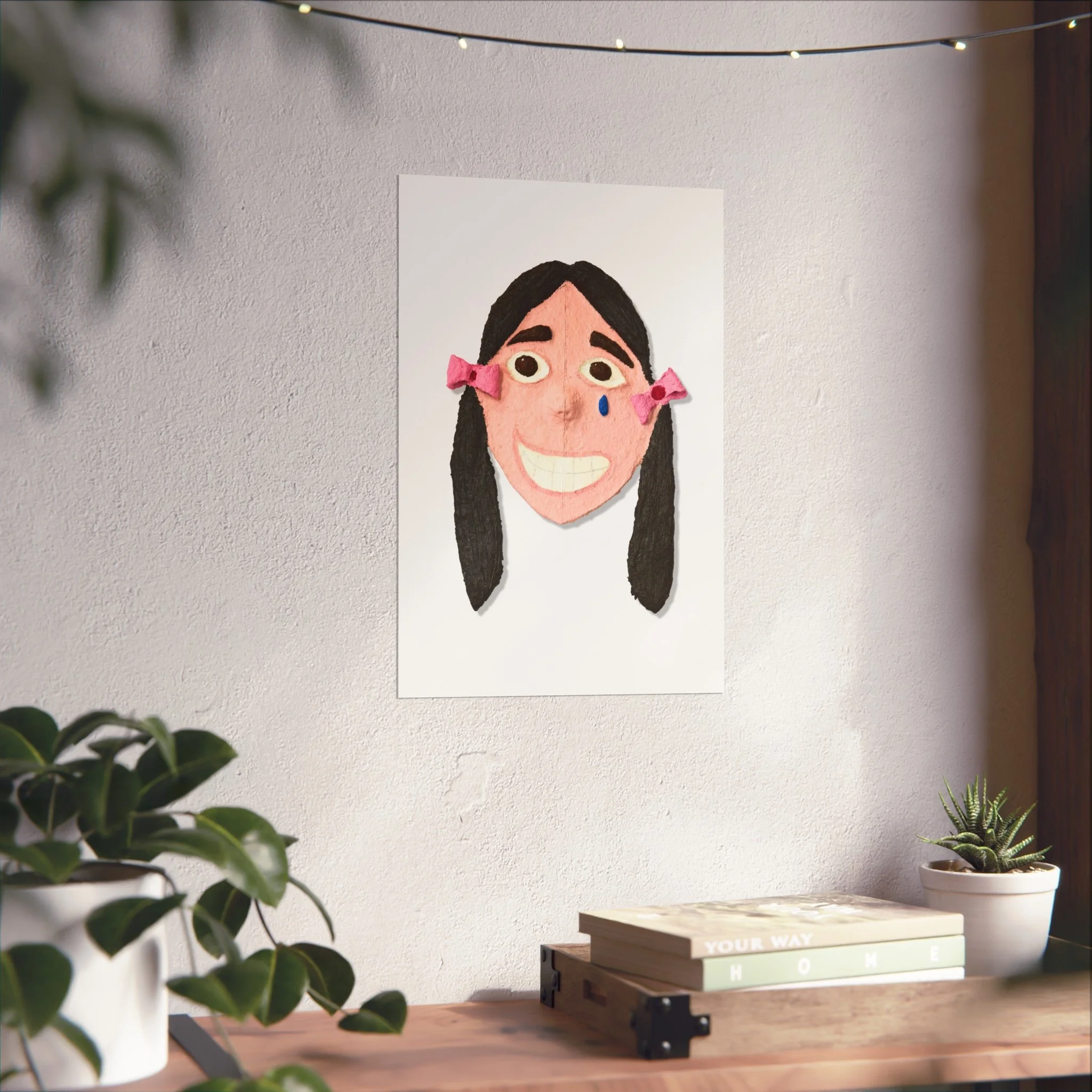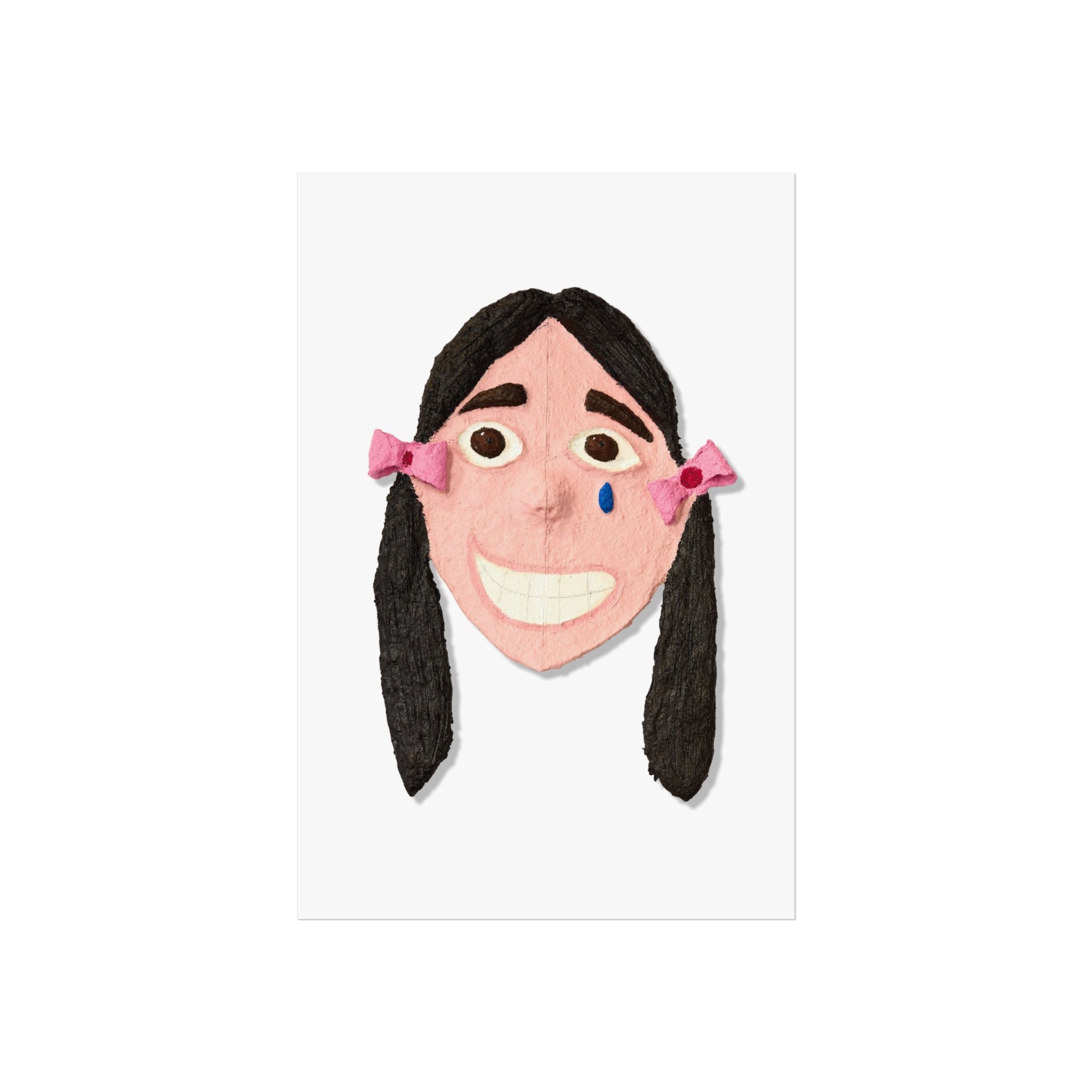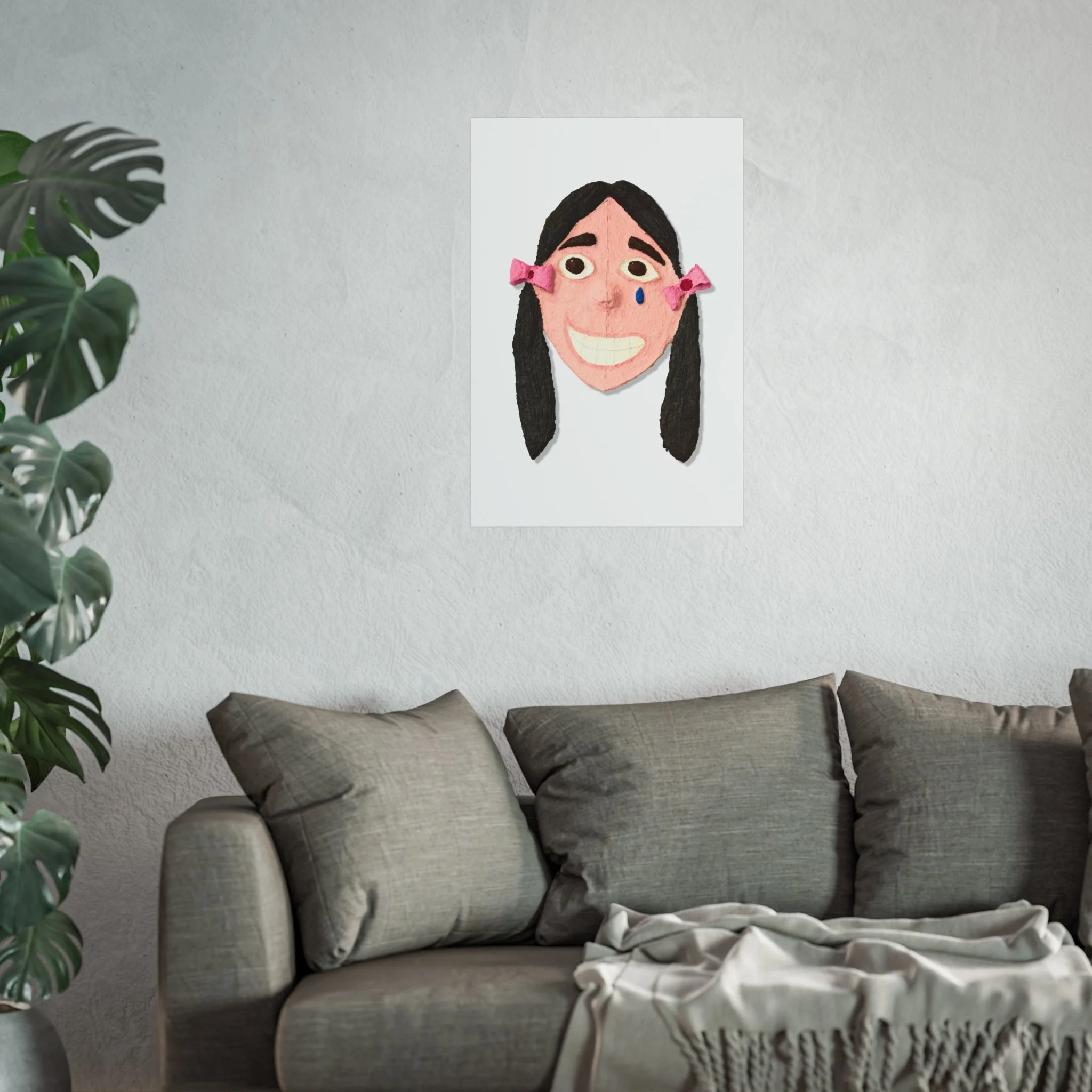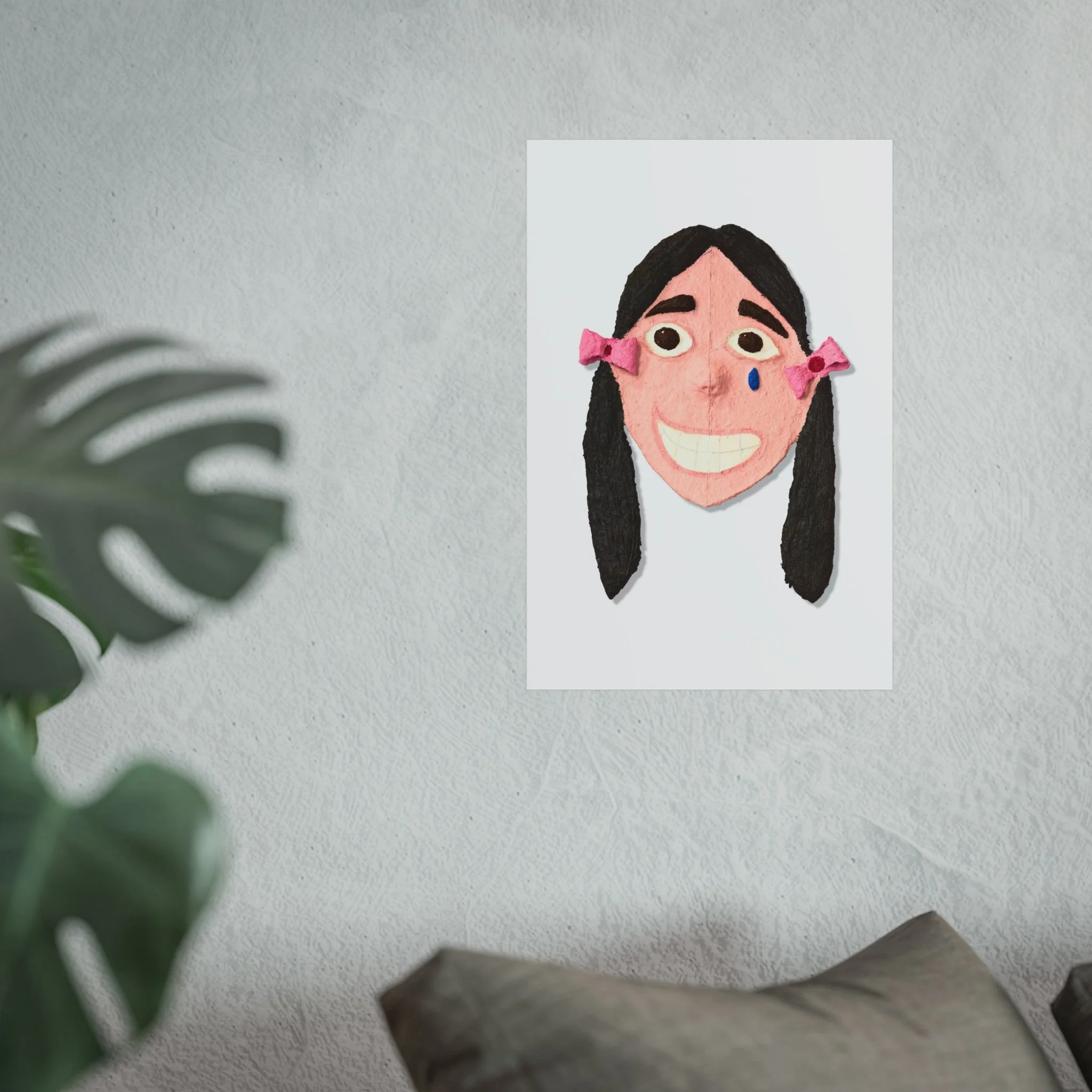 A small, textured portrait printed with rich giclée detail that feels like a secret between you and the artwork. The smiling face—handmade textures, rosy tones, and little pink bows—sits on a smooth matte, gallery‑grade surface that brings out every subtle brush and felt mark. It reads as playful and a touch bittersweet: the wide, toothy grin paired with a single blue tear creates a story that lingers. Printed on acid‑free 220gsm paper with REACH‑certified inks and offered in horizontal, vertical, and square formats, this piece fits easily into living rooms, studios, or cozy reading nooks and adds an intimate, quirky focal point to any wall.