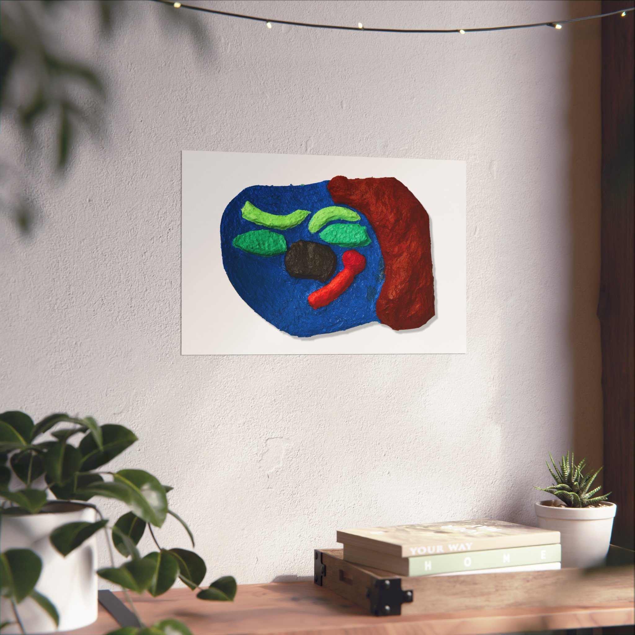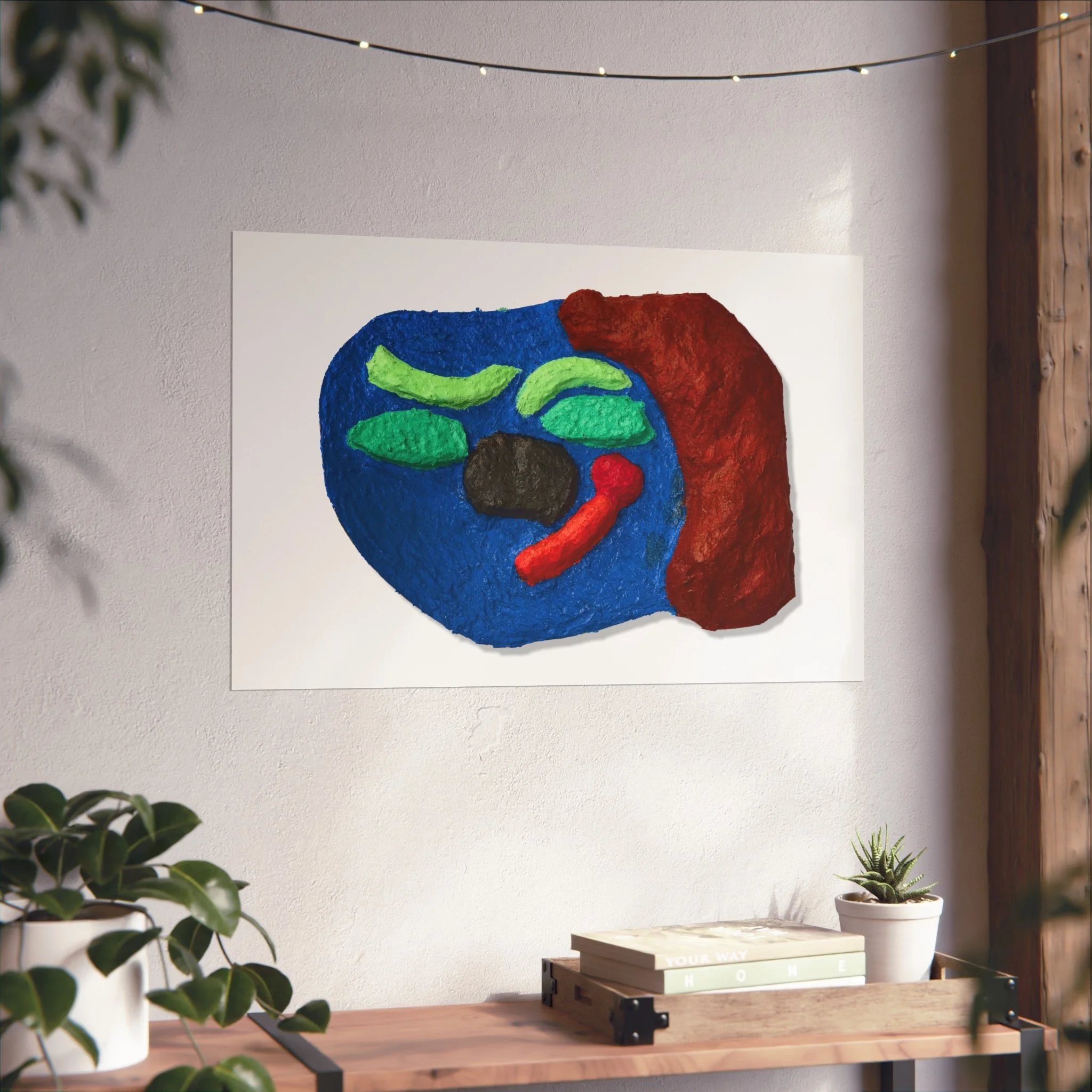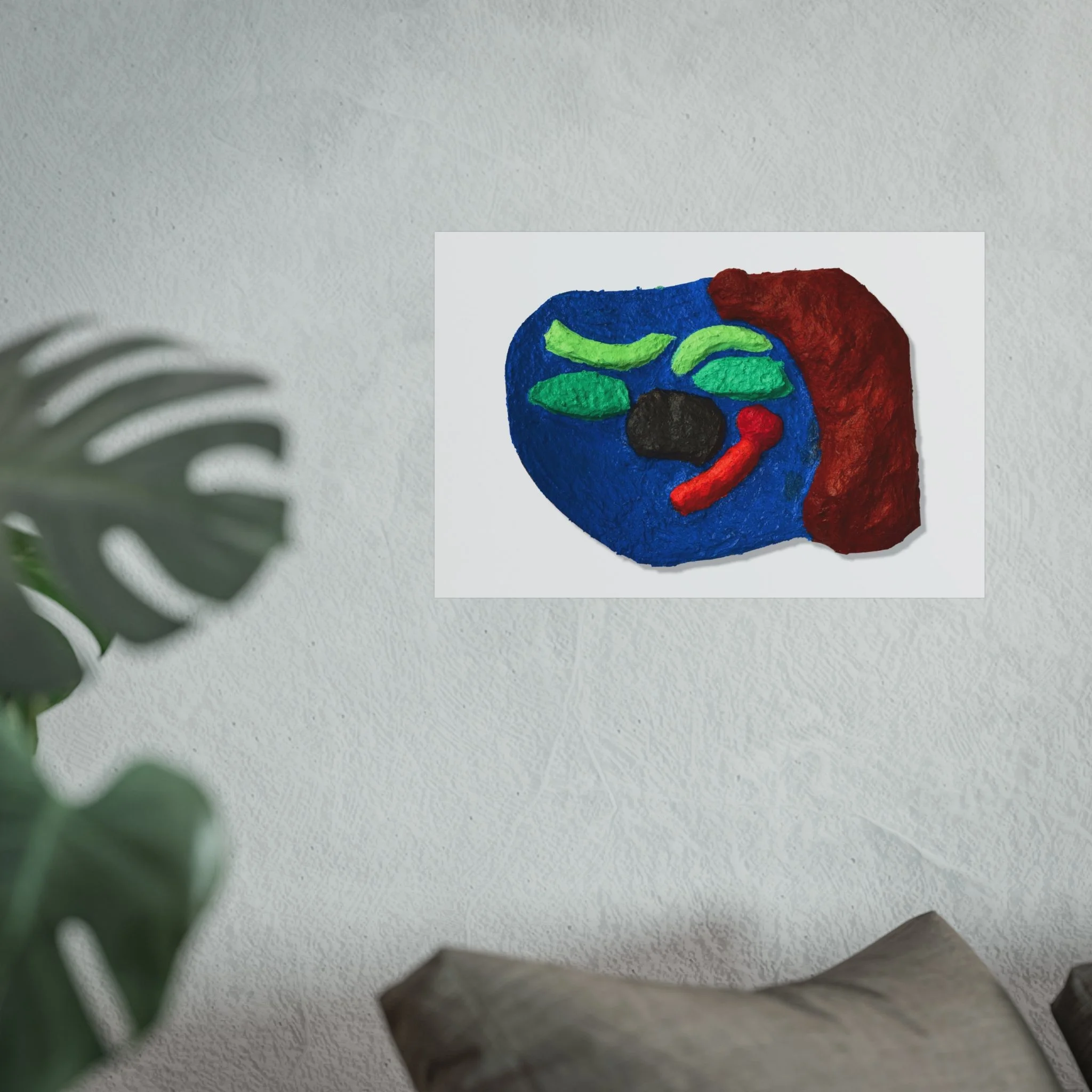 A bold fine art poster that brings playful abstraction and vivid color into a contemporary space. Thick, textured brushwork is translated into a giclée print with rich blues, deep russet, and pops of neon green and red that read like a modern face or mask. Hung alone or as part of a curated wall, this piece adds an expressive, tactile energy to living rooms, studios, or creative workspaces. The matte surface keeps the colors lush without glare, and the gallery-grade paper gives the image a museum-quality presence that feels both intimate and striking.