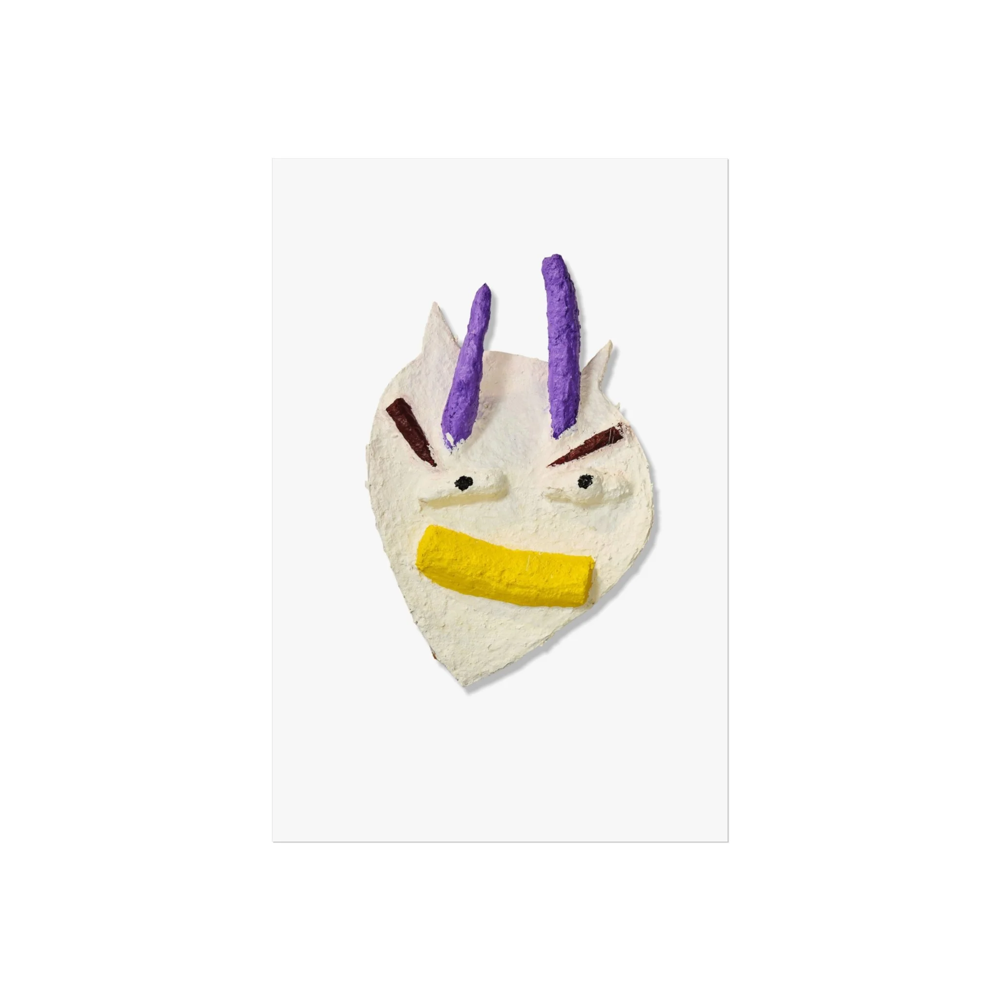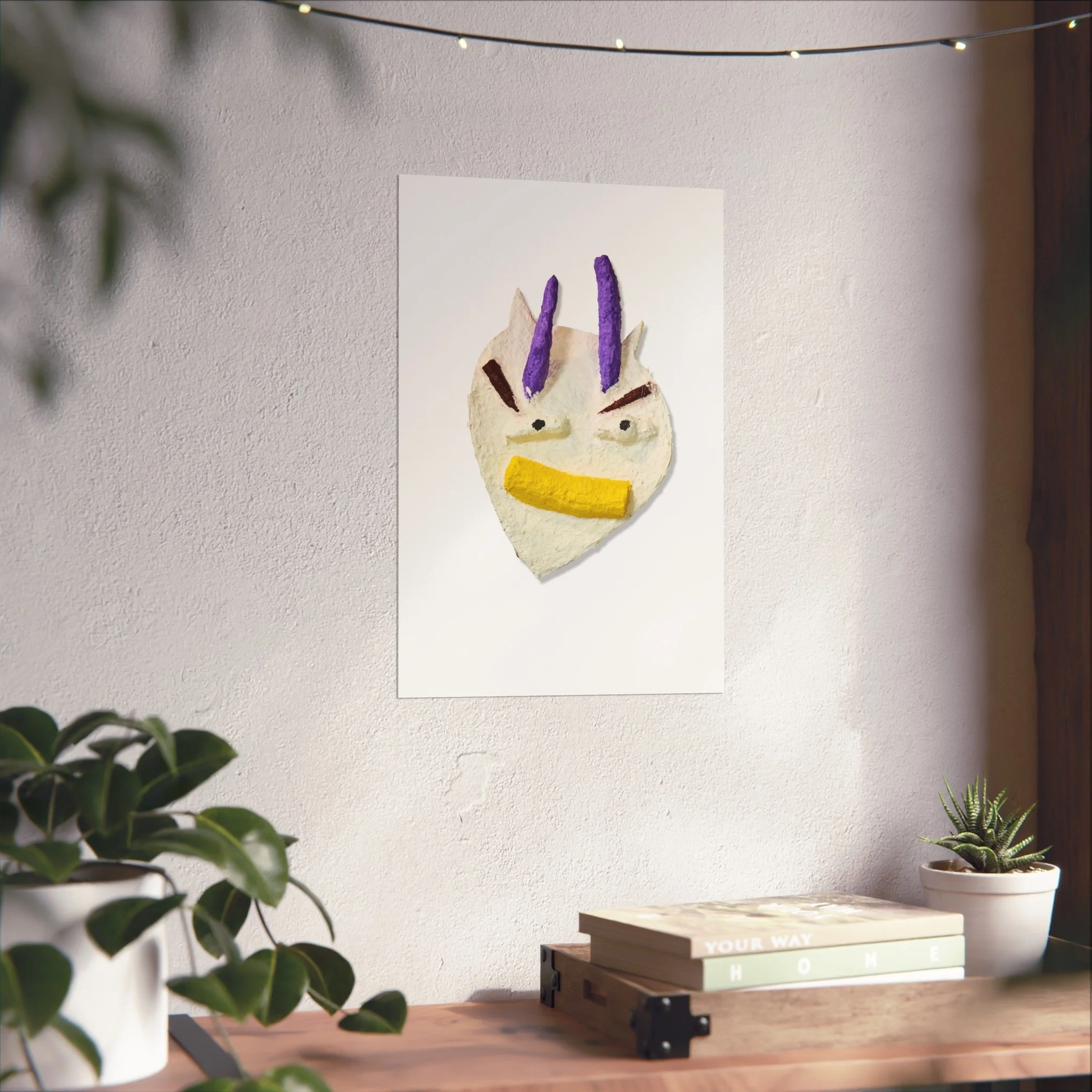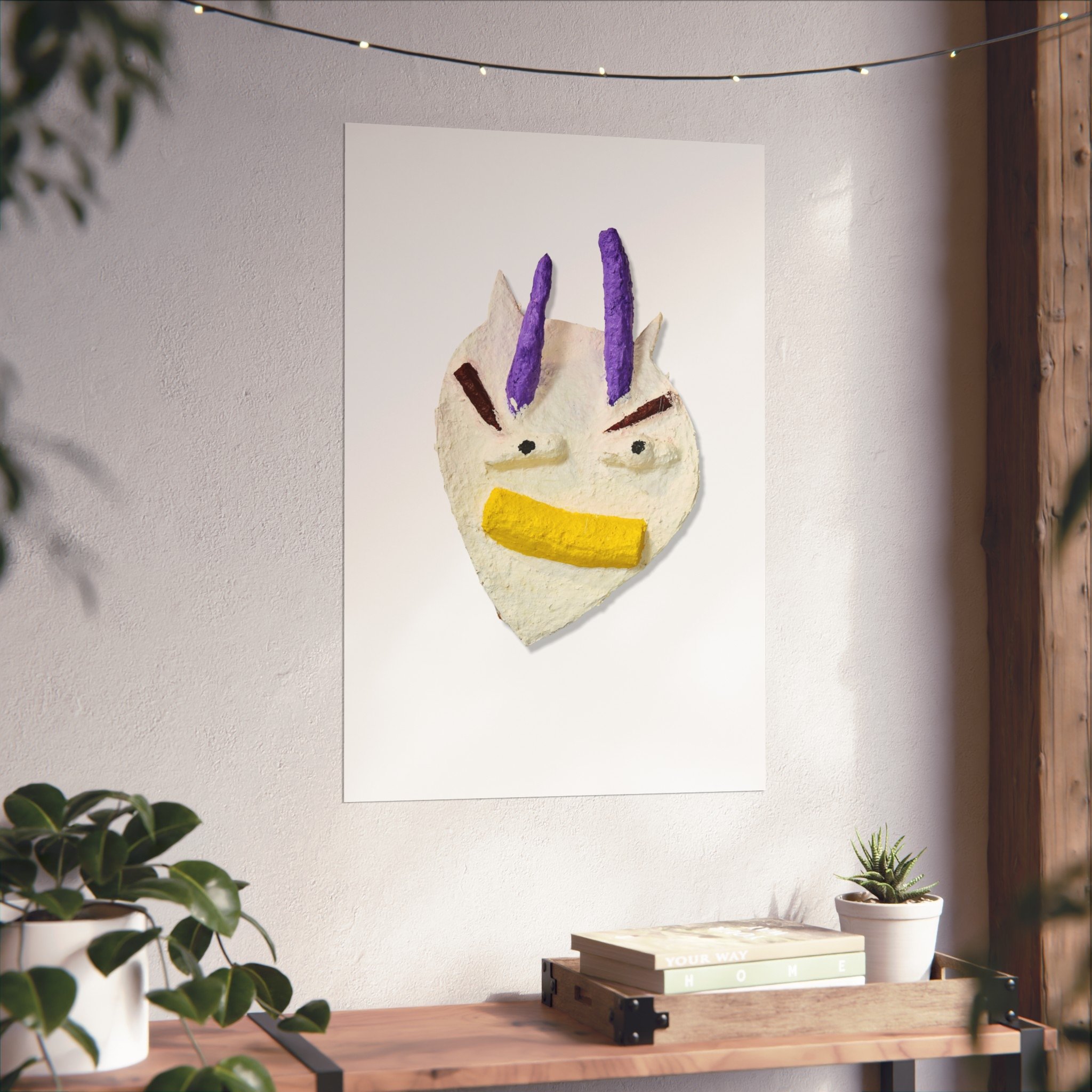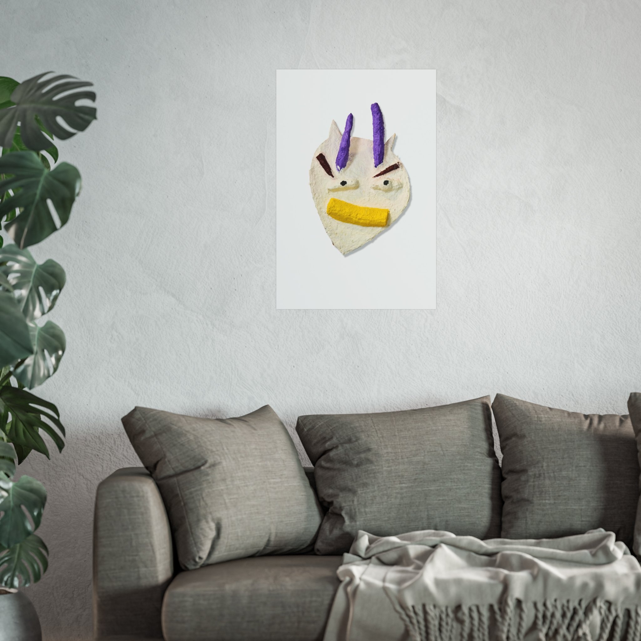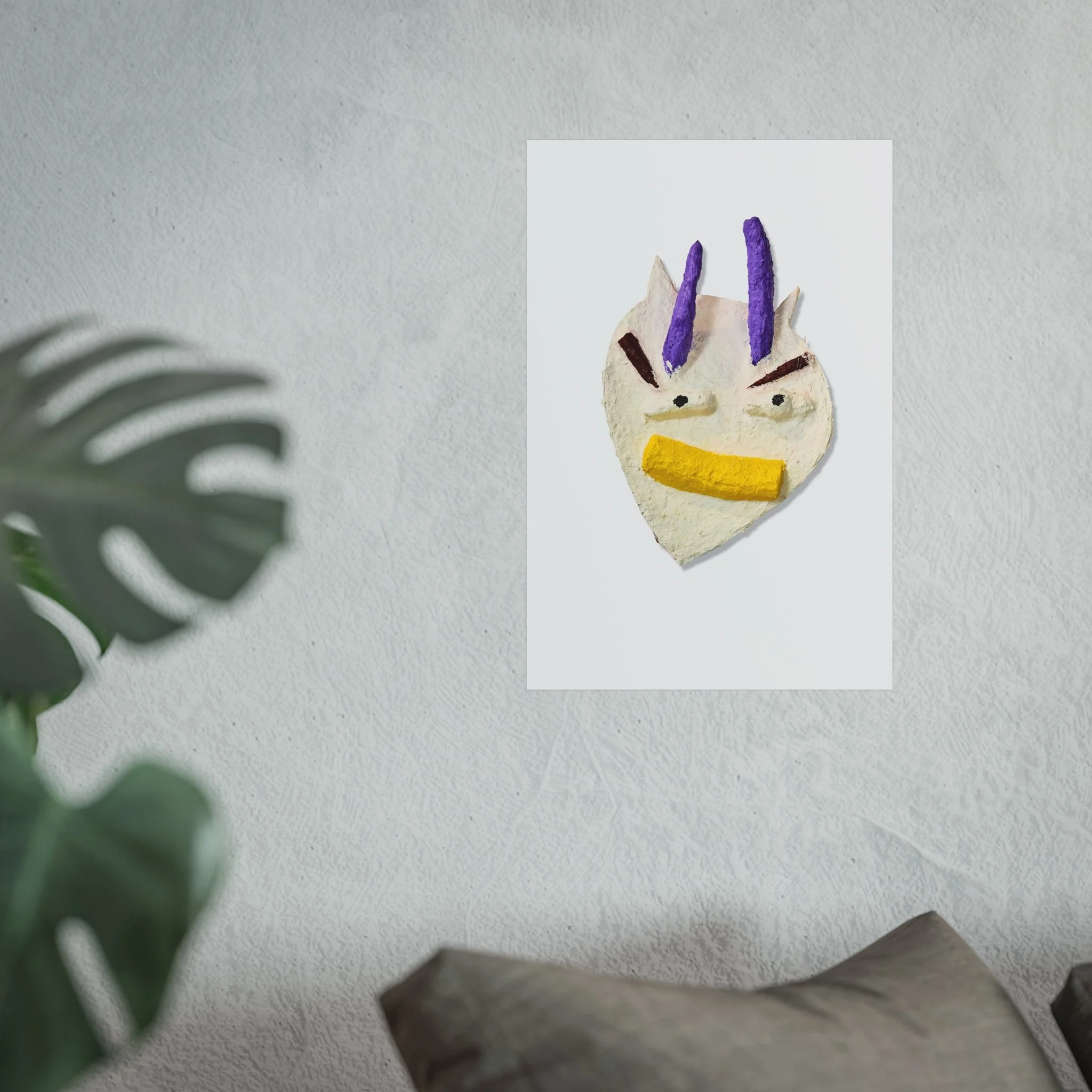 This fine art poster brings a playful, handmade spirit to any wall. Printed as a giclée on smooth, gallery-grade 220gsm acid-free paper, the image — a whimsical, textured face with bold purple and yellow accents — reads like a small object lifted from a craft studio and set against a clean white field. The matte finish keeps glare low and color rich while preserving the tactile, collage-like feel of the original. Hung in a reading nook, studio, or entryway, it invites a smile and a second look, adding character without shouting.