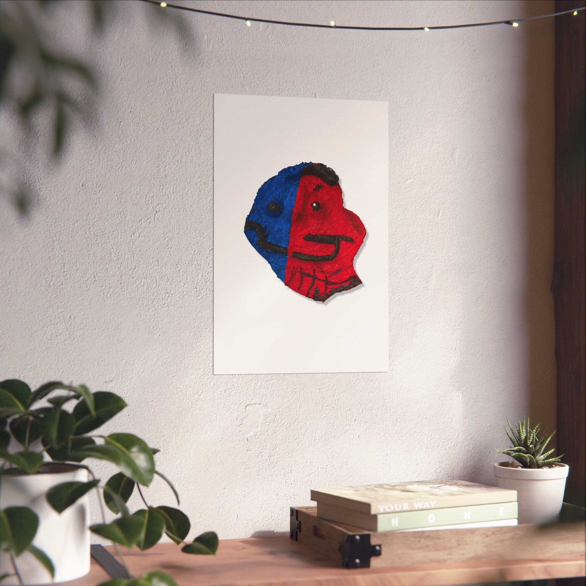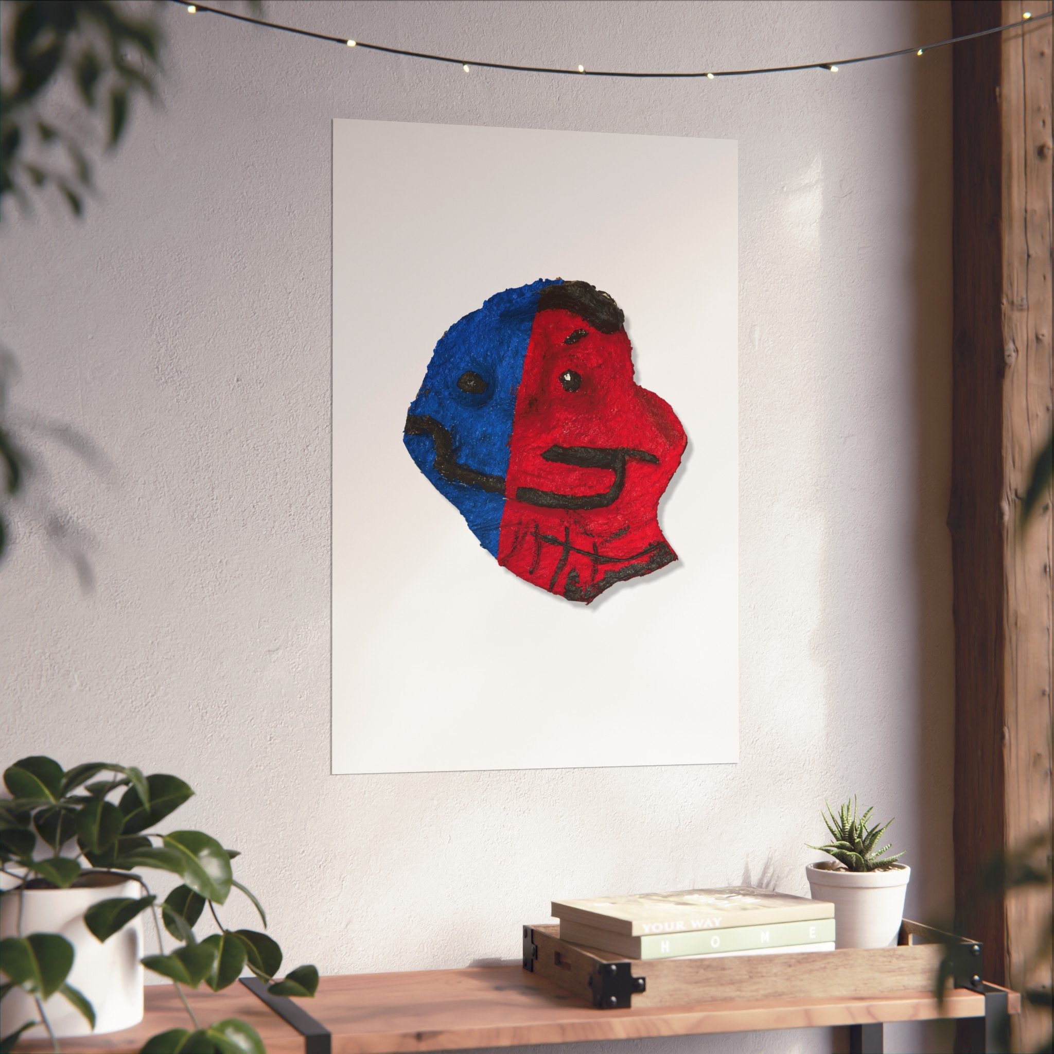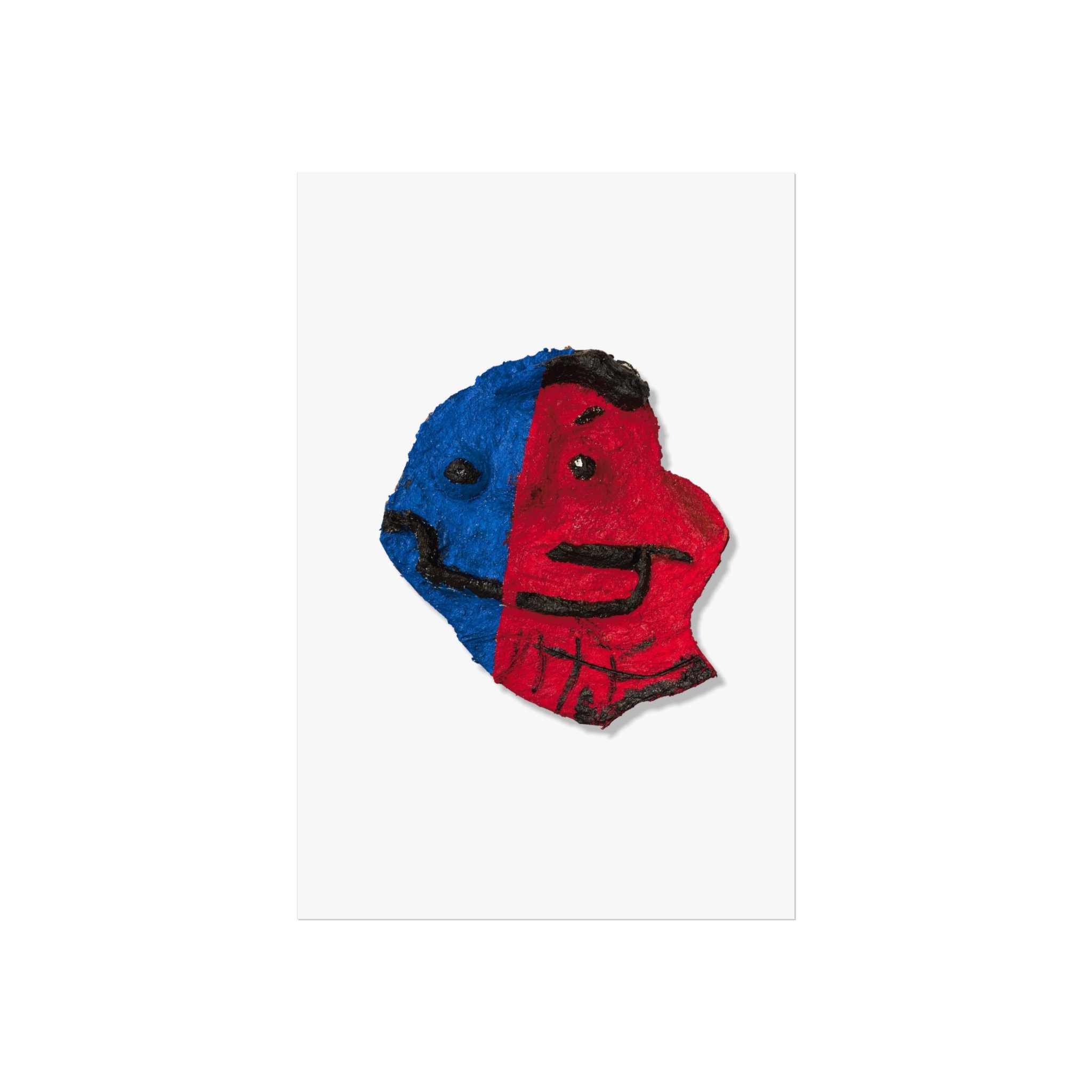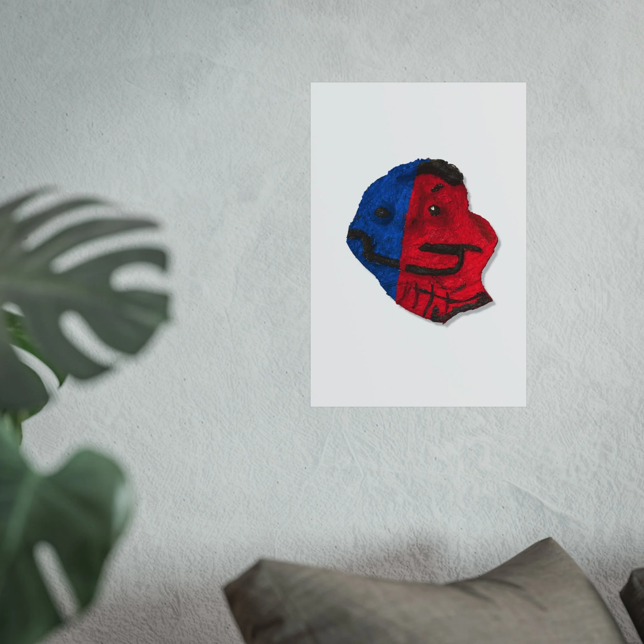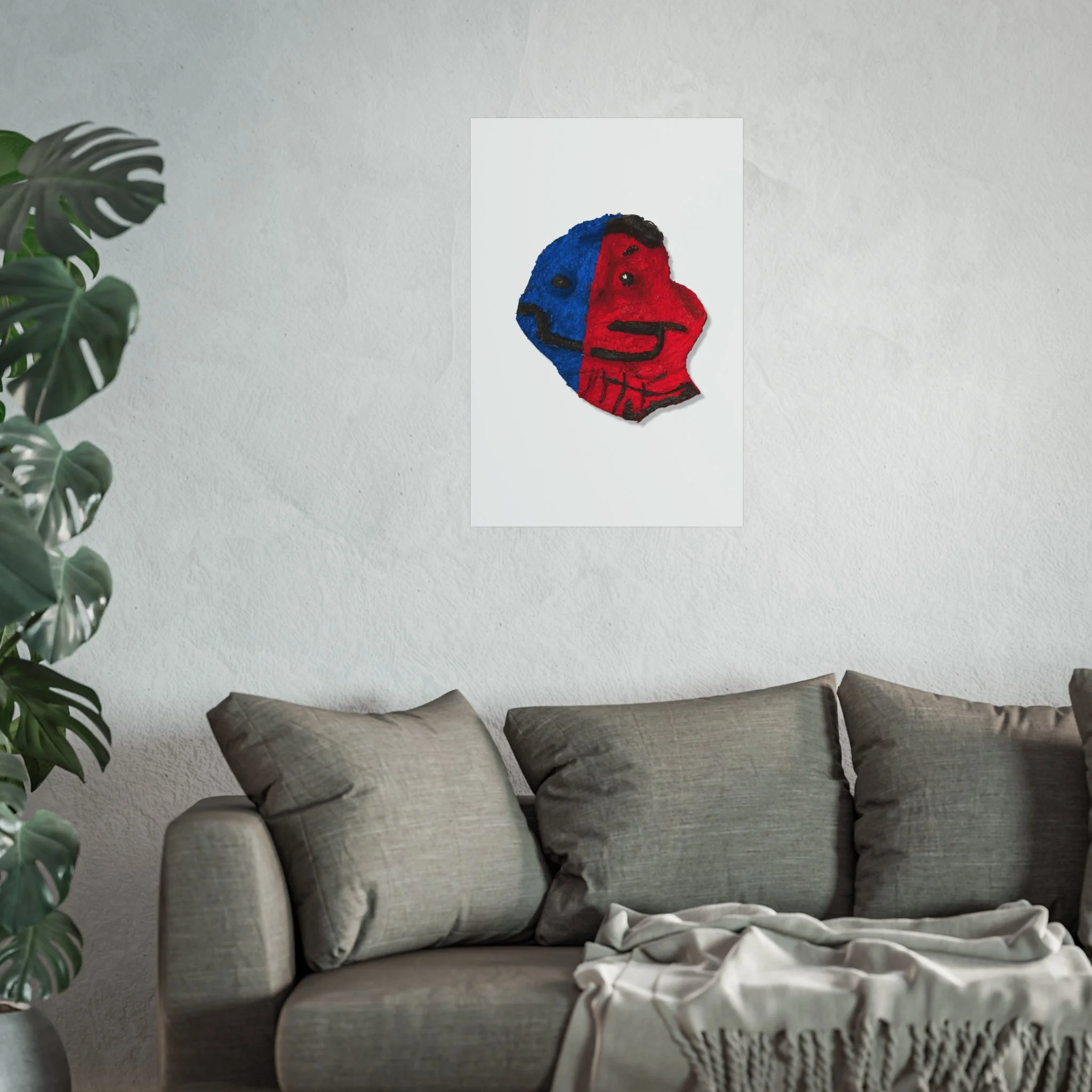 A striking fine art poster that pairs raw, hand-crafted texture with bold, split-color expression. The image reads like an intimate study: a tactile, slightly distressed mask rendered in vivid blue and red against a clean white field. The contrast draws the eye, while the matte giclée print preserves every brushstroke and paper grain. Hang it in a cozy reading nook or a contemporary living room to add an unexpected, conversation-starting focal point. The piece feels personal and a little enigmatic — suited to someone who collects daring, emotive art and values high-quality archival prints.
