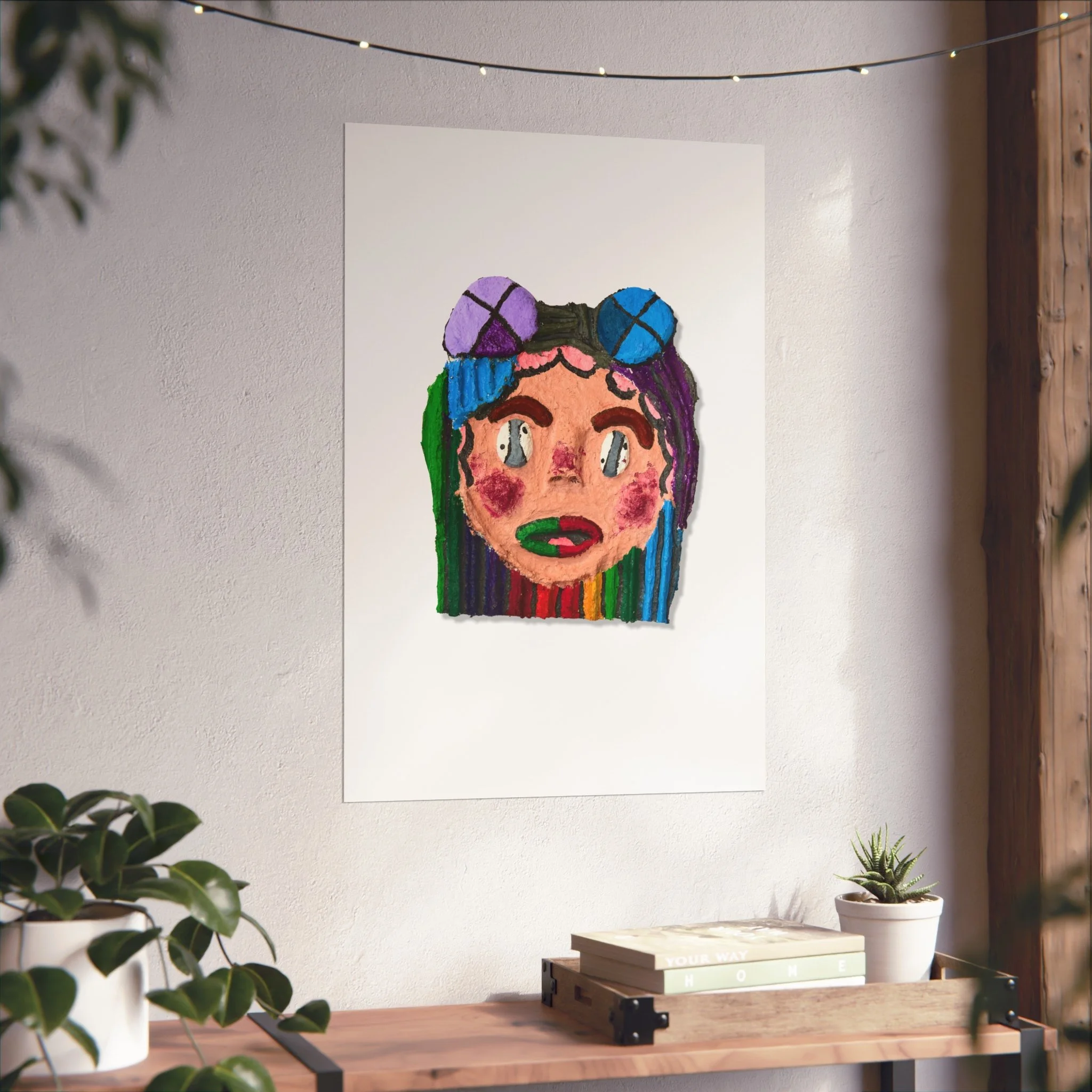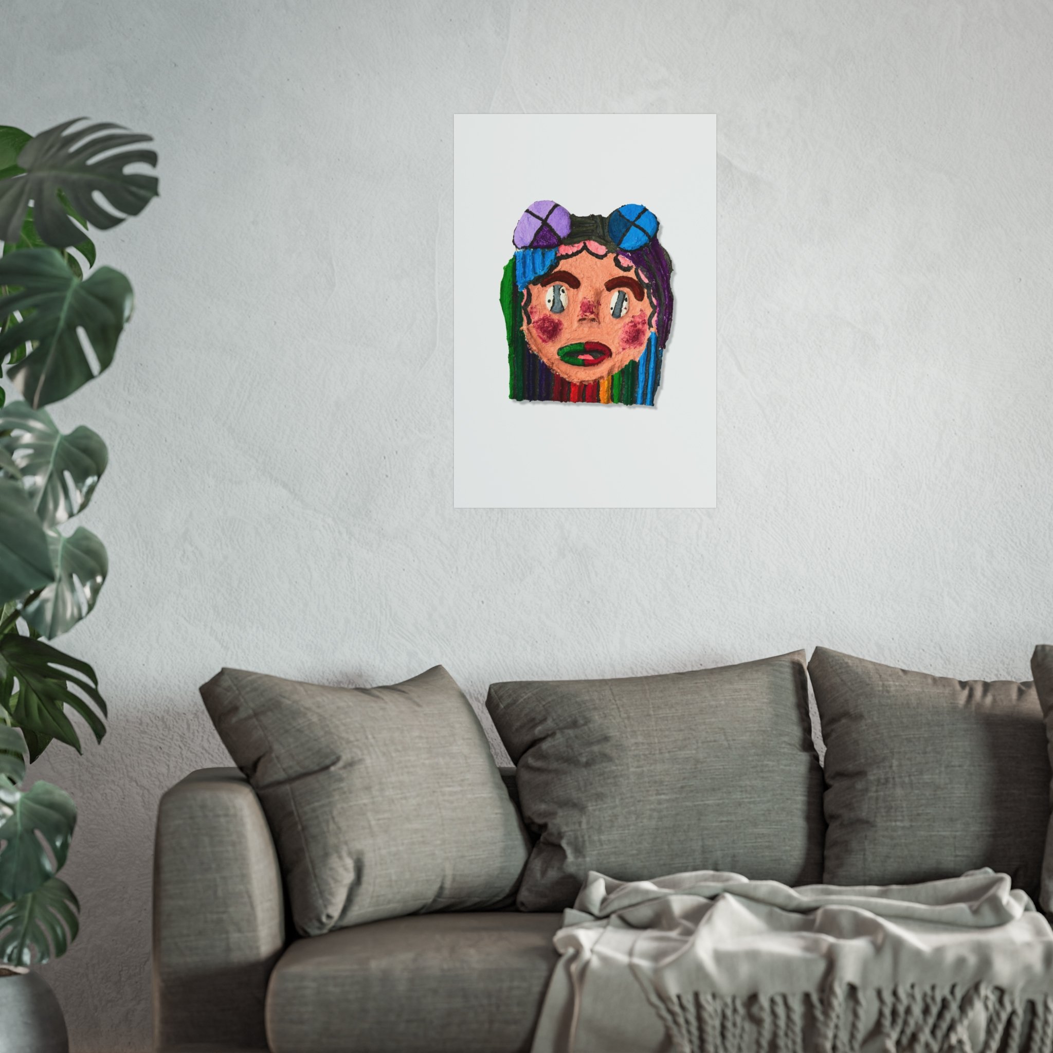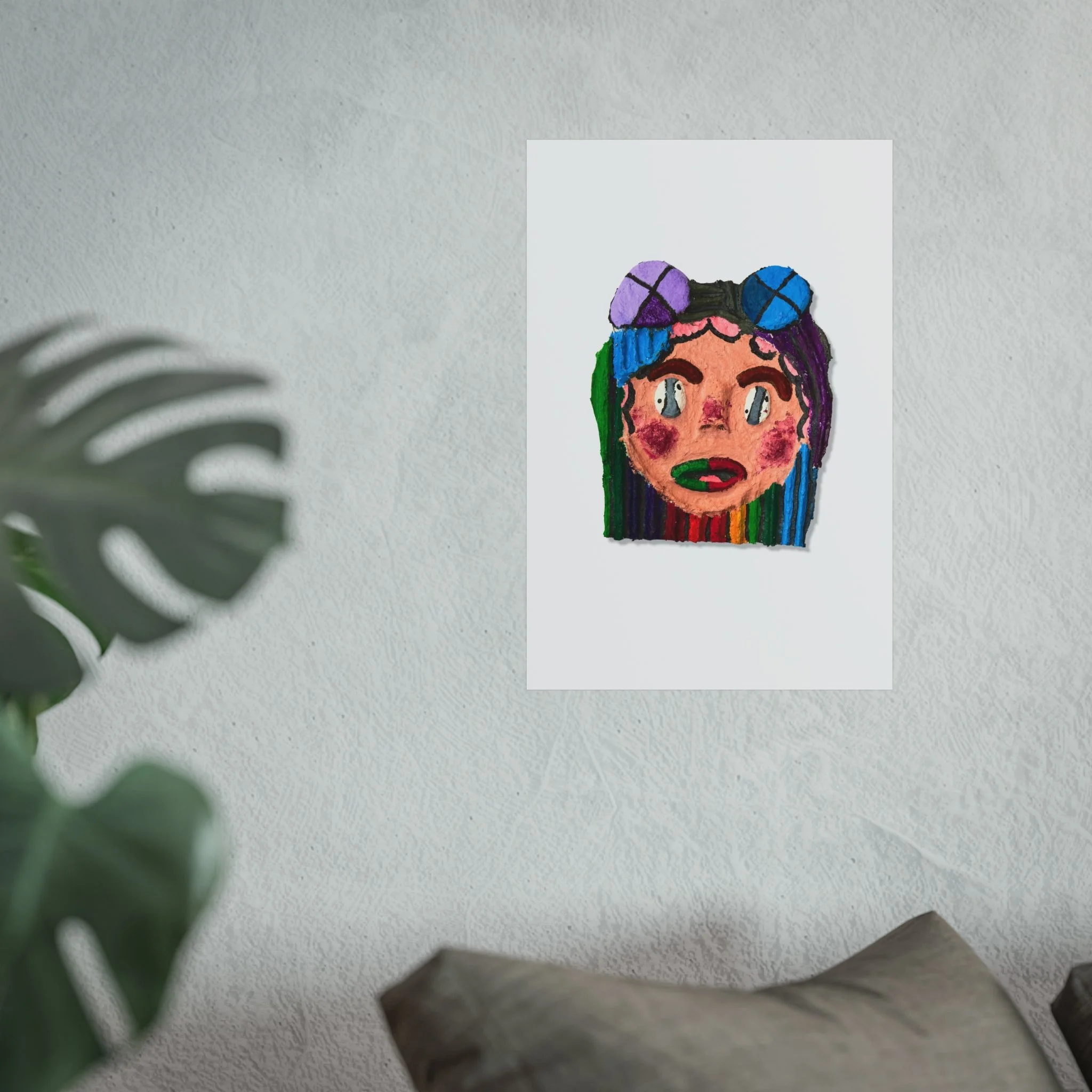 A vibrant fine art poster that brings hand-drawn, playful portraiture into your space. Bold, painterly strokes form a whimsical face framed by rainbow-striped hair and oversized goggles — colors stay true thanks to giclée print quality and REACH-certified inks. The smooth, matte gallery paper gives the piece an elegant, tactile feel while keeping colors rich and textured without glare. Hang it alone as a statement or mix it into an eclectic gallery wall to add character and joyful color to a bedroom, studio, or living area.