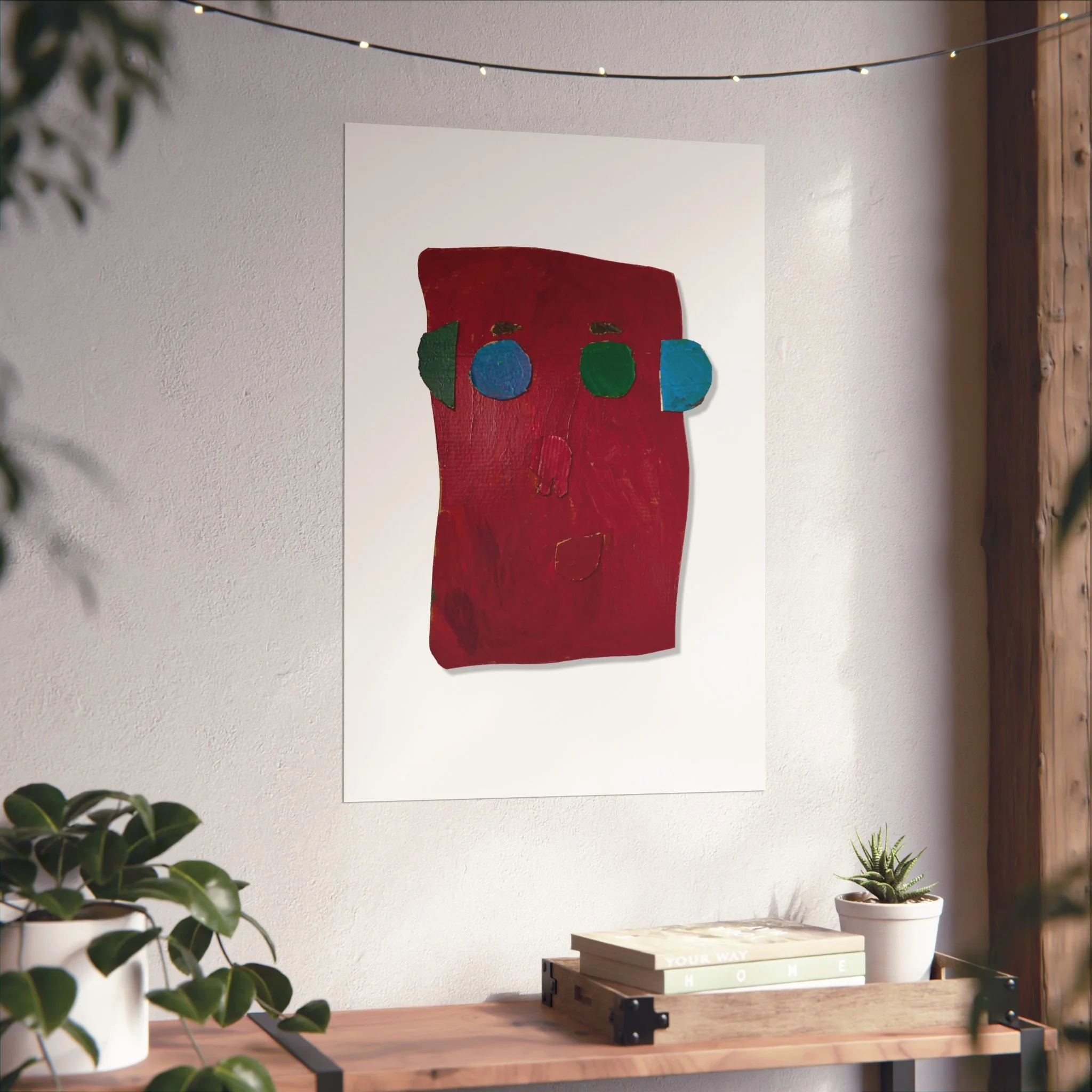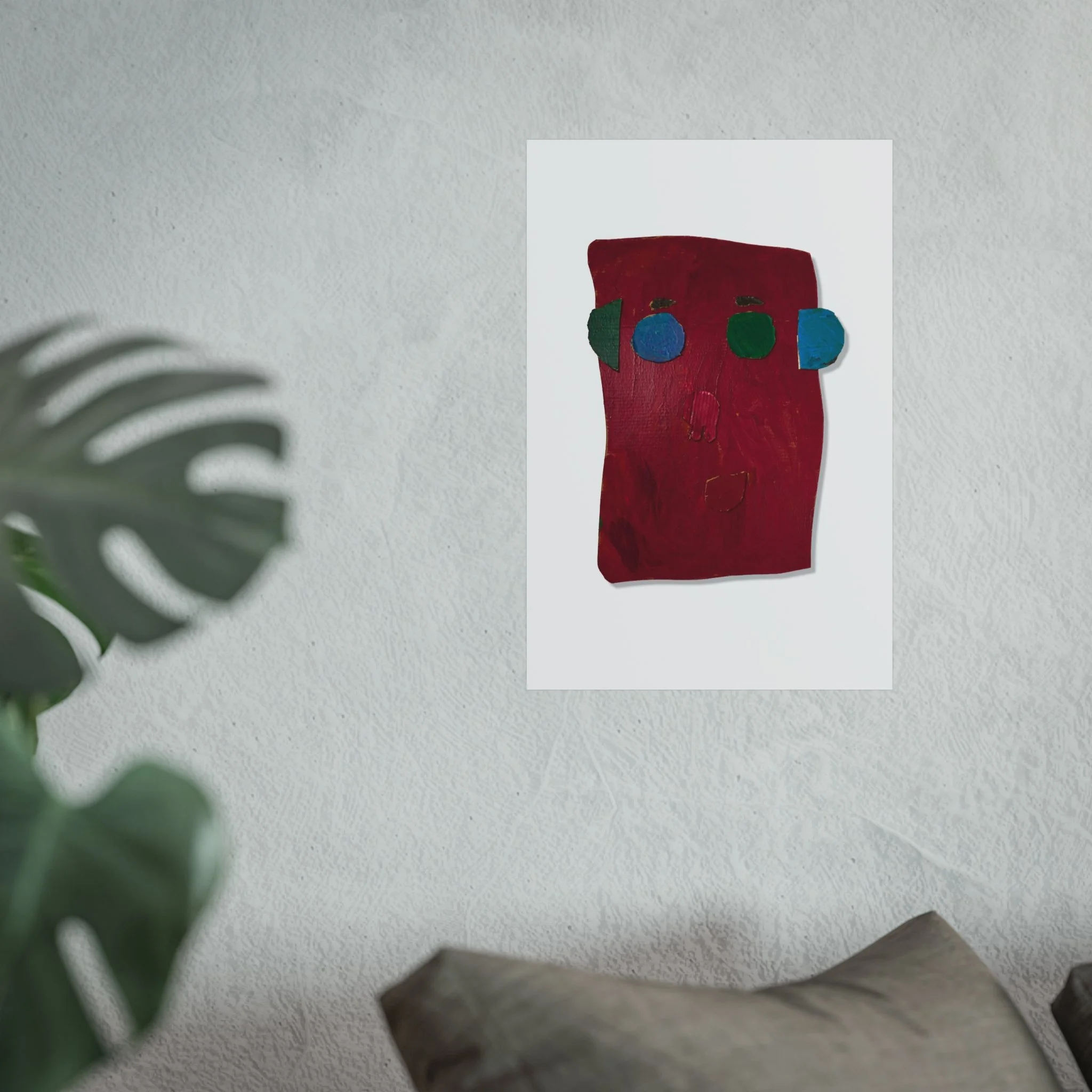 A minimalist fine art poster that feels tactile and deliberate. Deep, painterly strokes of crimson form an irregular rectangular field, punctuated by three small circular shapes in teal and green that float across the top like quiet counterpoints. The matte, gallery-grade surface keeps reflections low so the texture and color depth read like an original study on paper. Hung alone or layered with other works, this print brings a contemplative, modern-art energy to living rooms, studios, and gallery walls.