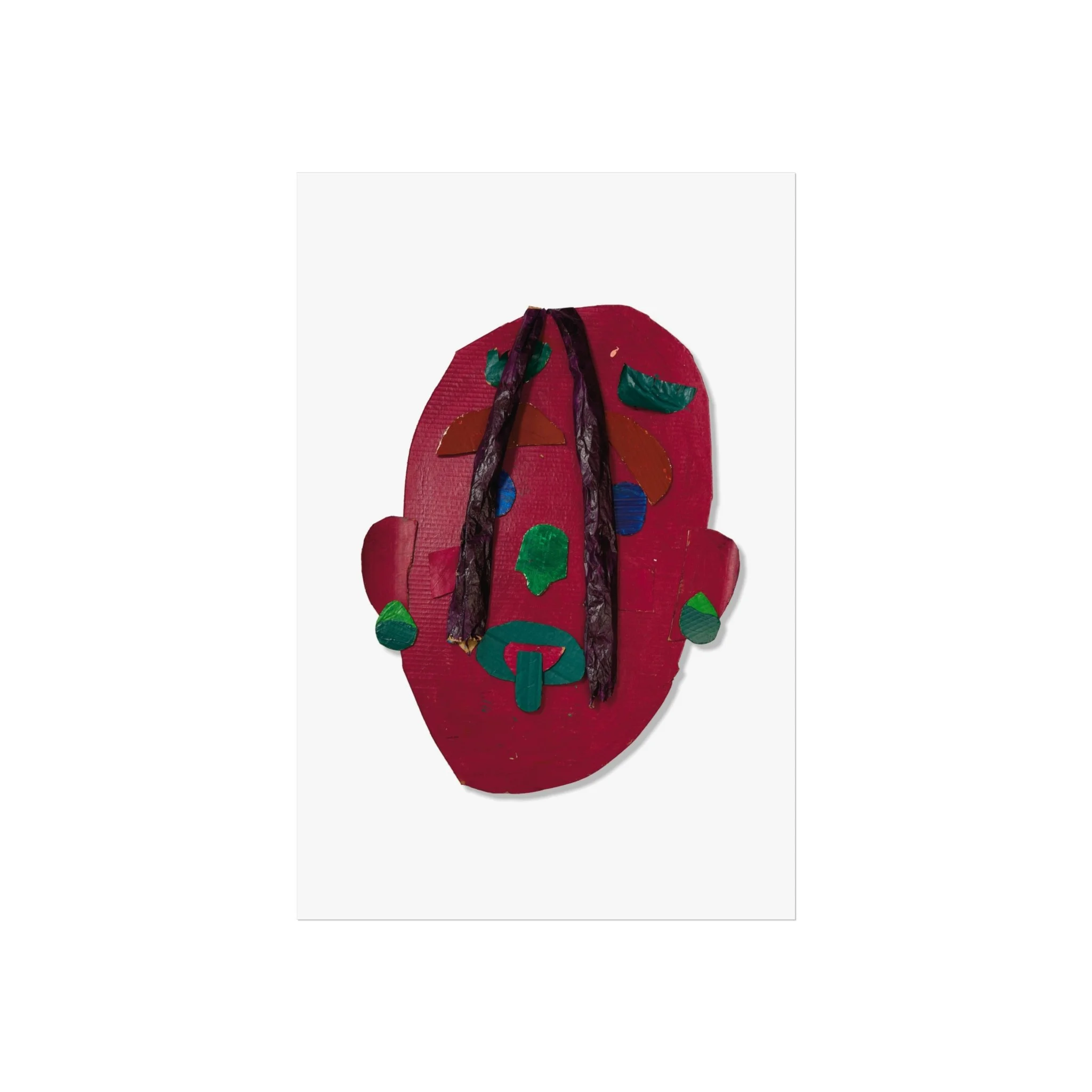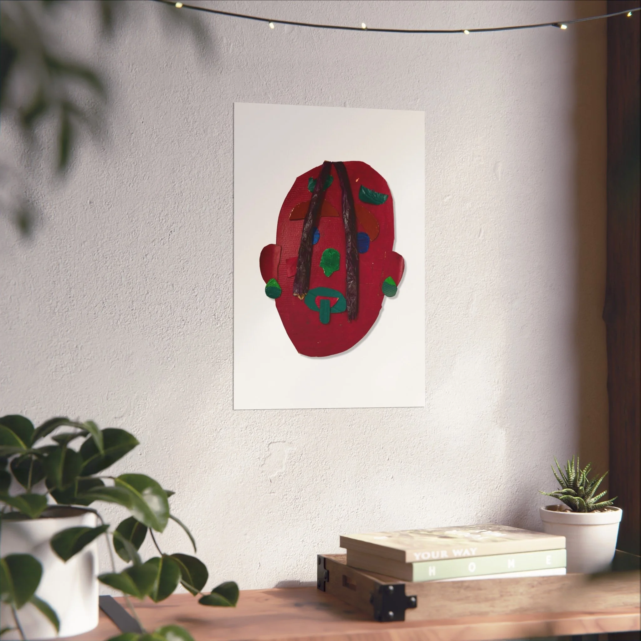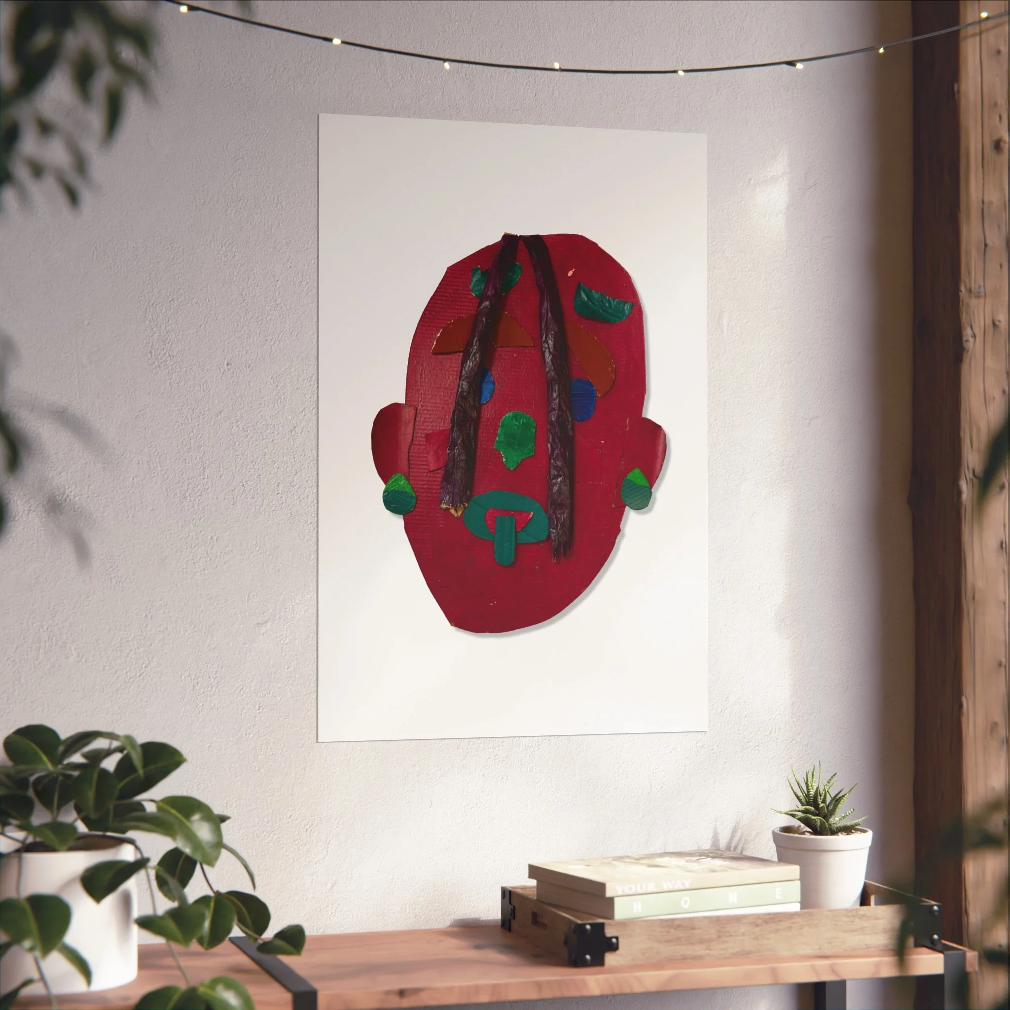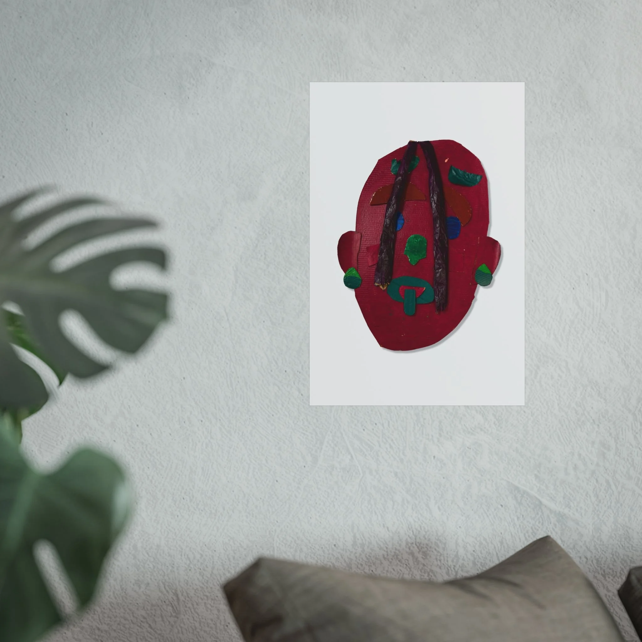 This fine art poster reproduces a bold, tactile collage-style portrait that feels handmade and immediate. Deep crimson forms anchor the composition while playful green and blue accents punctuate the face, giving it personality and movement. Printed with giclée quality on smooth, gallery-grade 220gsm acid-free paper, the image retains rich color depth and subtle texture. The matte finish reduces glare and invites closer inspection — a quiet piece that sparks conversation and brings a contemporary, craft-forward energy to a living room, studio, or creative workspace.