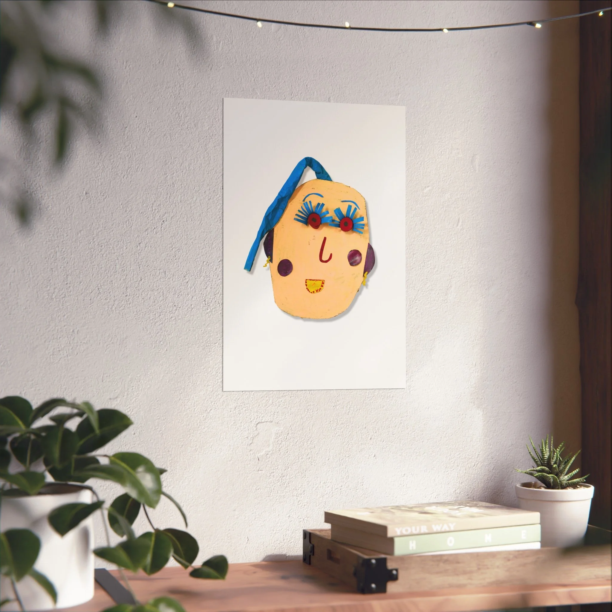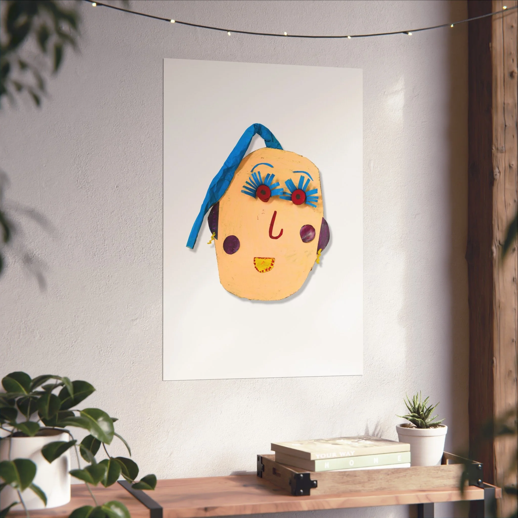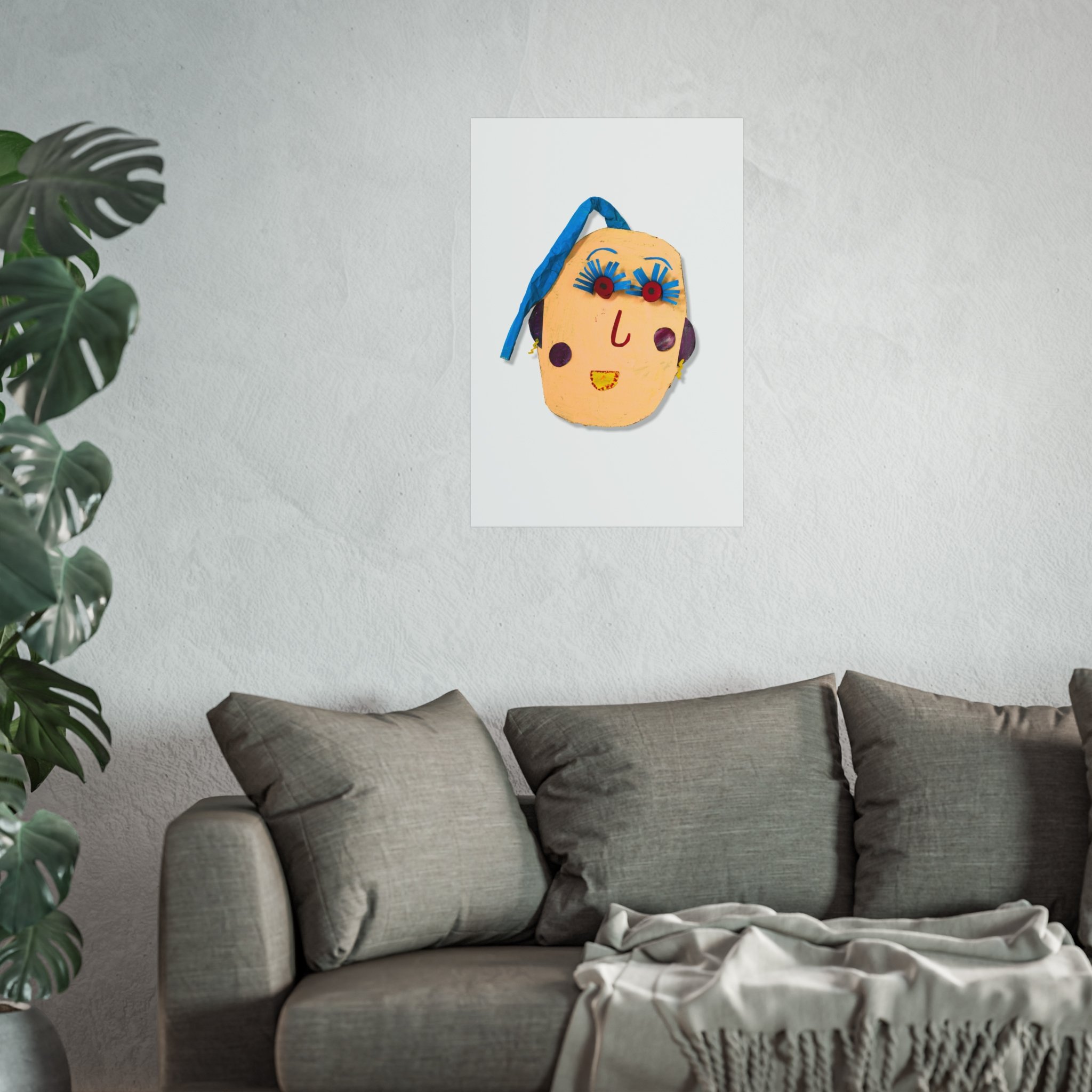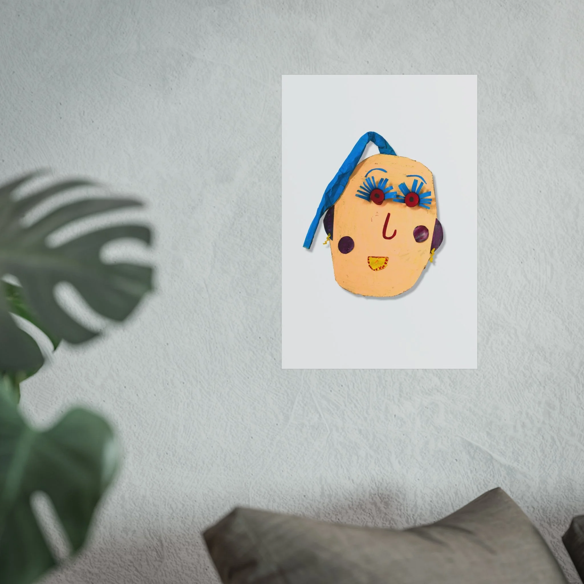 A playful fine art poster that brings handcrafted charm to any wall. This giclée print captures a quirky, handmade face—bright ribbon hair, exaggerated lashes, and simple stitched features—on smooth, matte gallery paper. The composition feels both childlike and artful, like a found object turned into wall art. Hang it in a studio, nursery, or cozy nook to add an offbeat, joyful accent that sparks conversation and invites a smile. The muted background keeps the focus on the whimsical face, letting it sit comfortably among plants, textiles, and warm, lived-in decor.