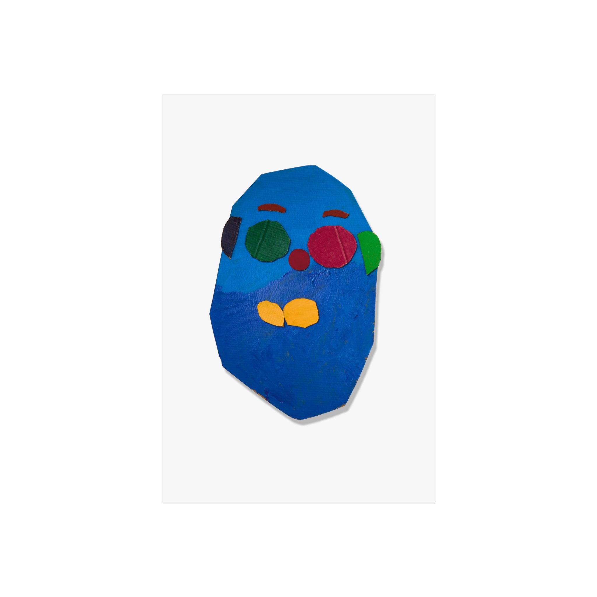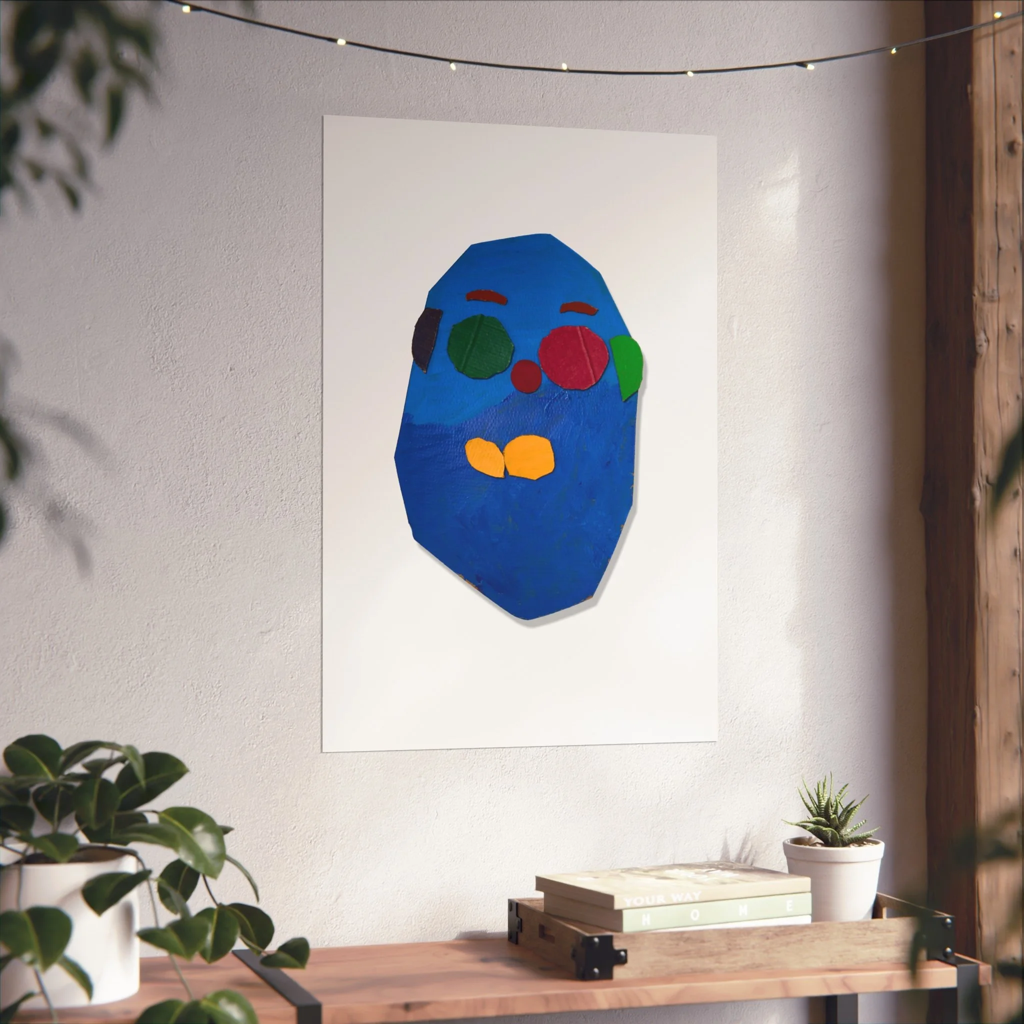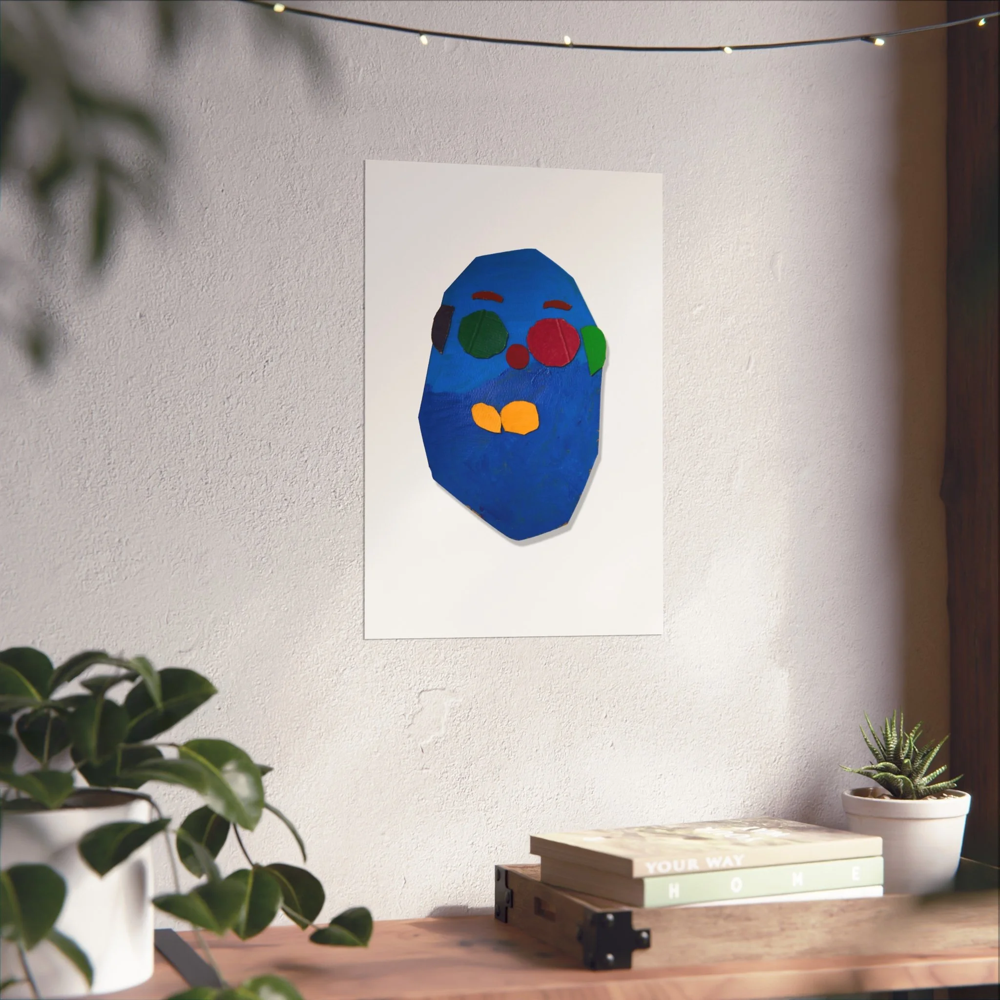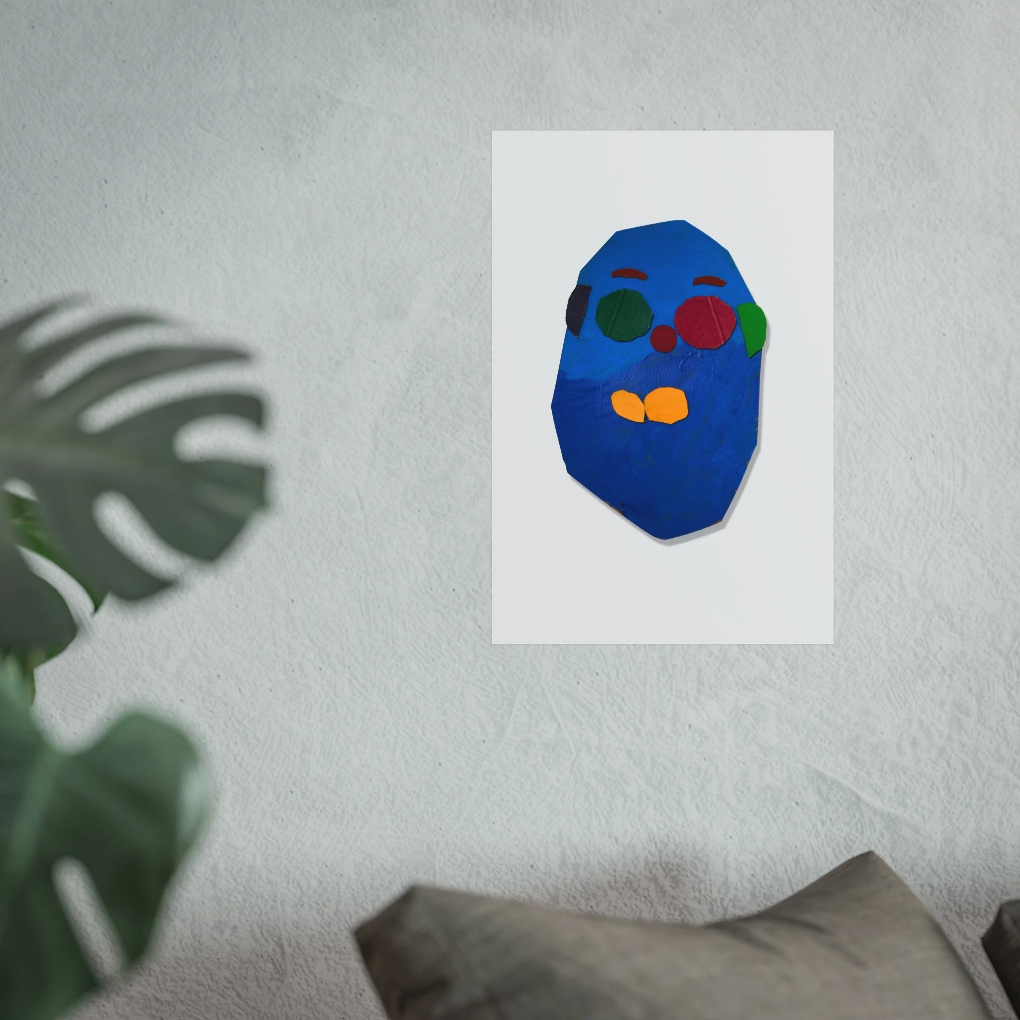 This fine art poster brings a bold, playful face into your space — a simple collage-like portrait rendered in deep cobalt, bright greens, crimson and a pop of golden yellow. The textured, painterly shapes sit on a clean white field, so the color and form read clearly from across a room. Hang it in a studio, living room nook, or hallway to introduce a moment of joyful abstraction that feels both modern and handmade. It pairs well with warm woods, houseplants, and minimalist frames, adding personality without shouting.