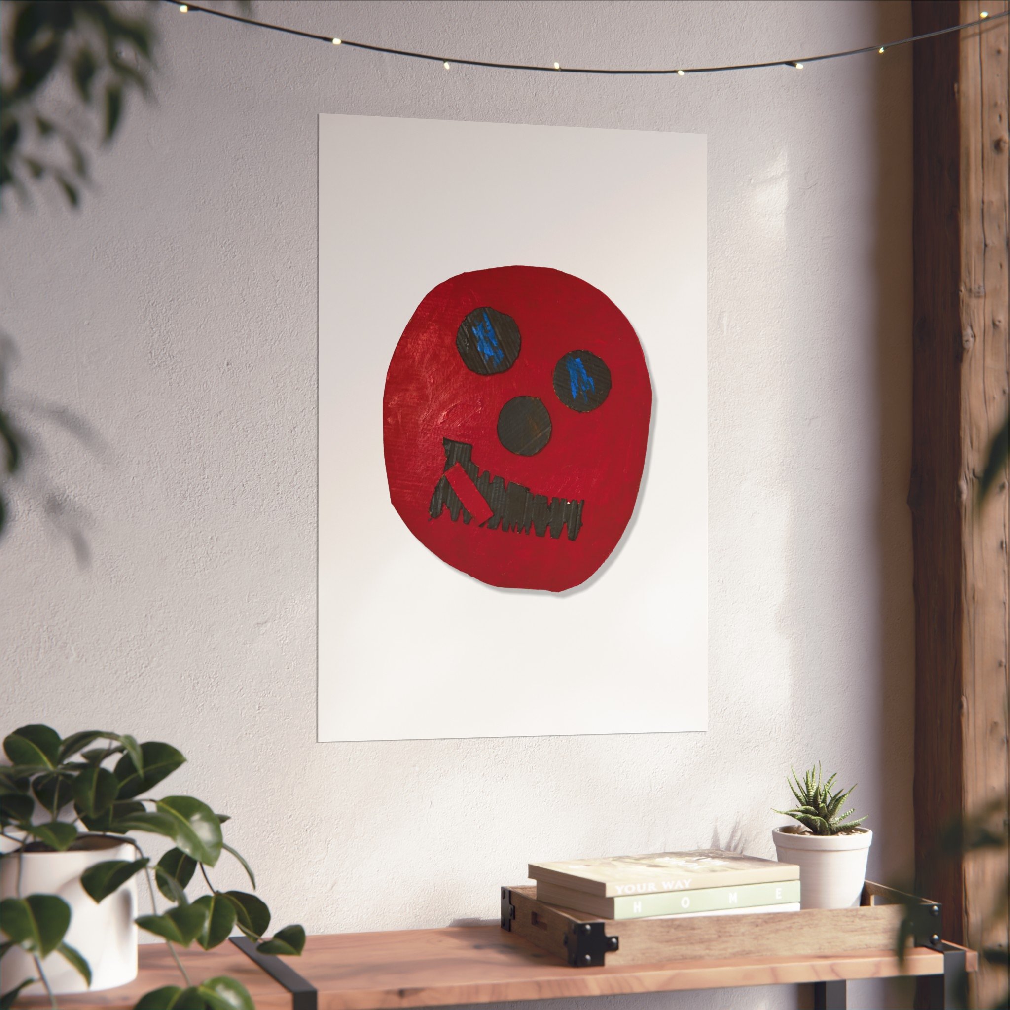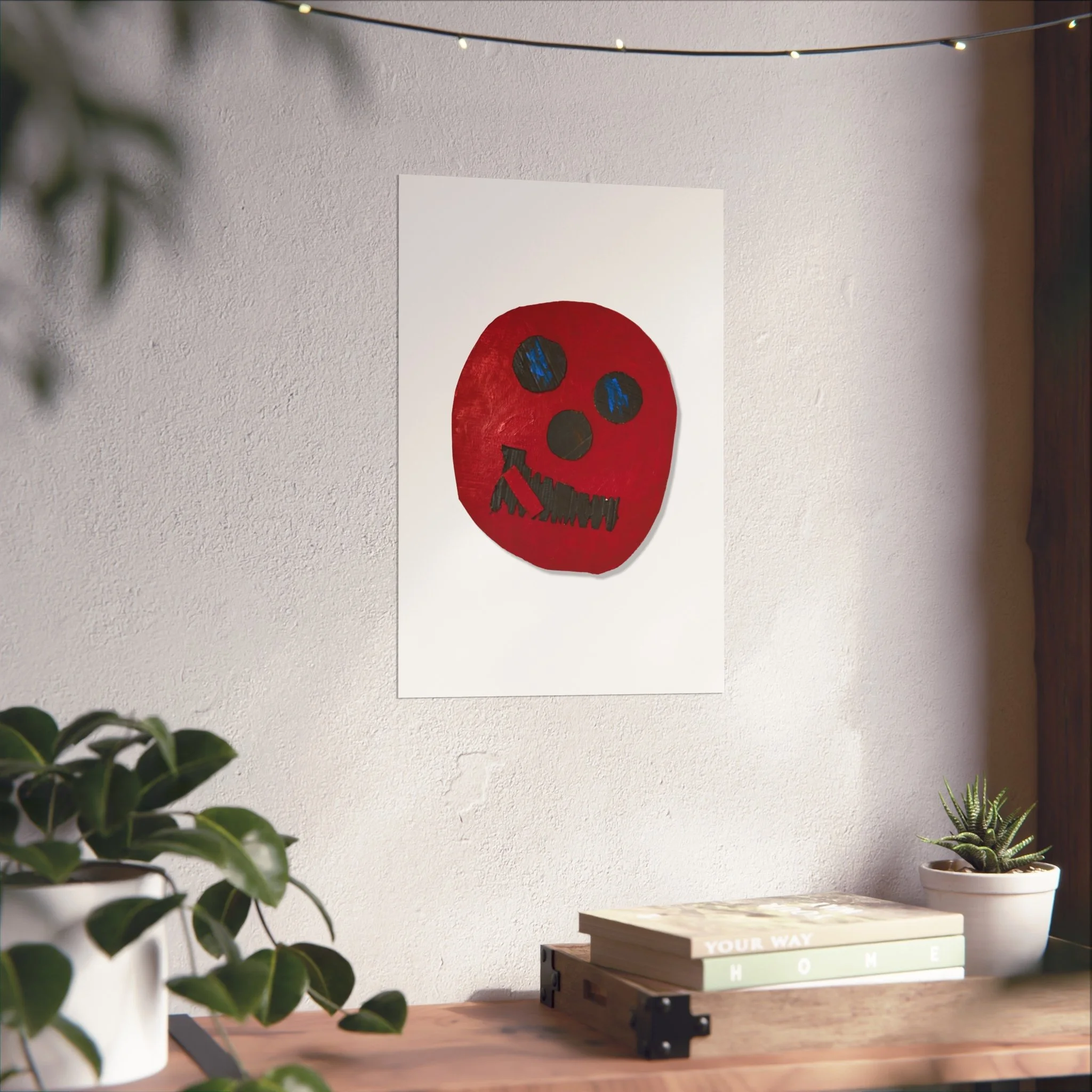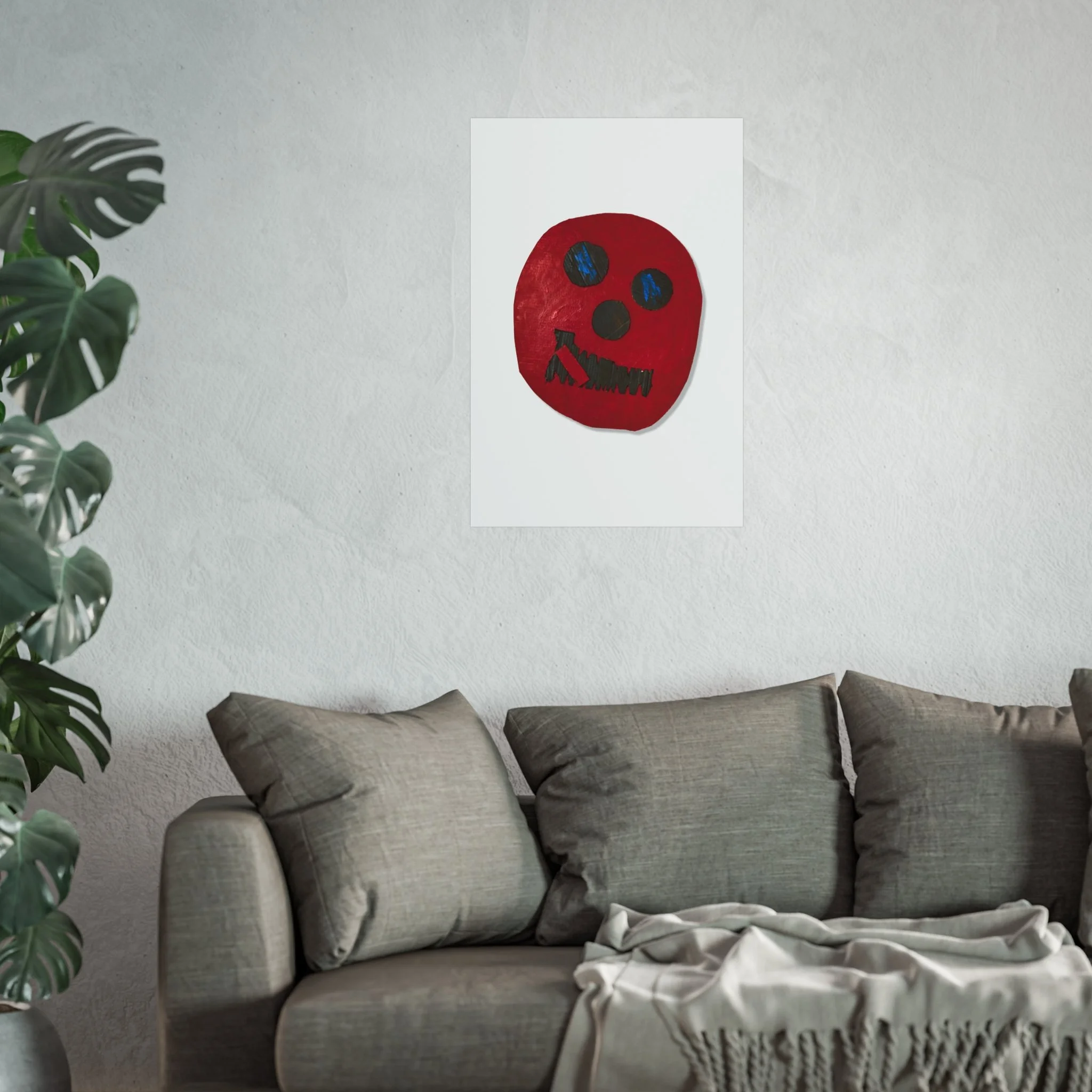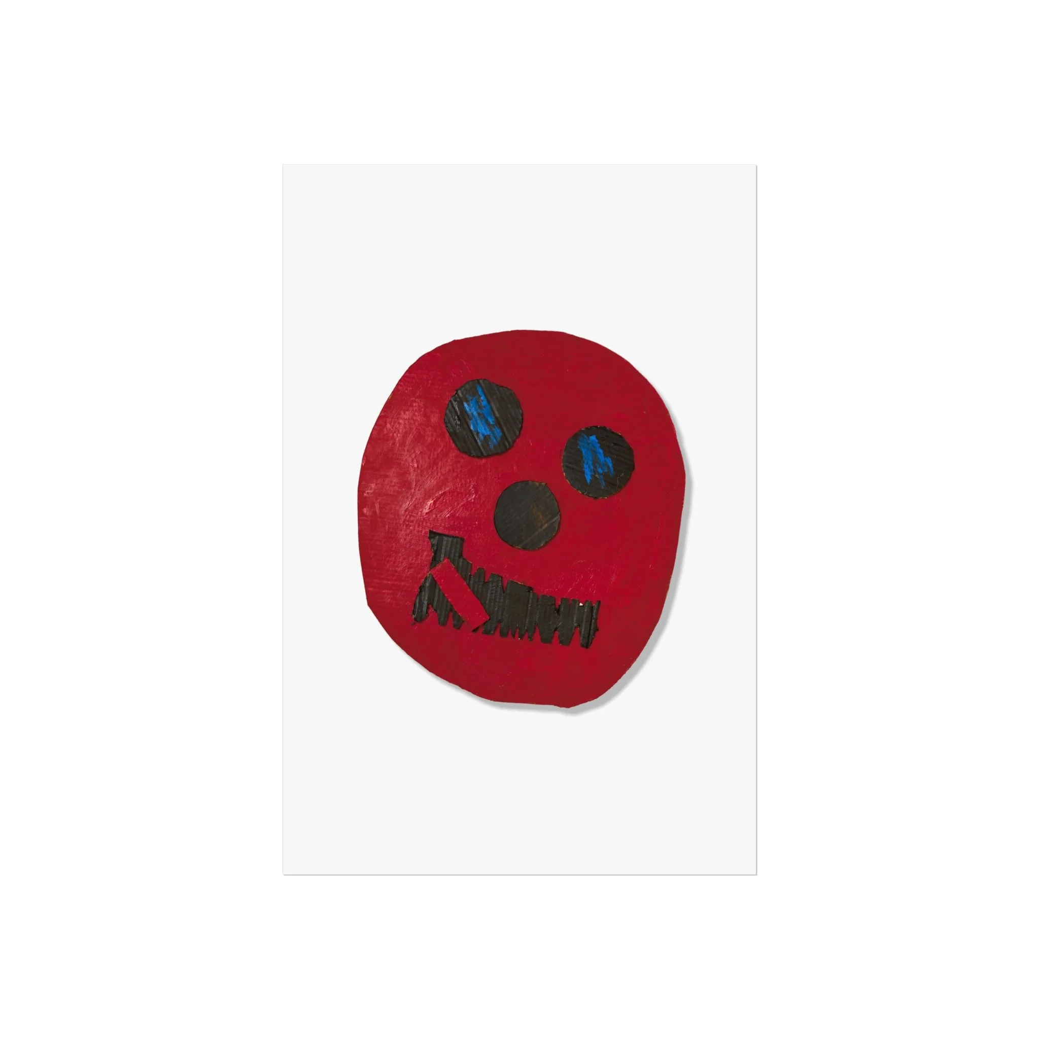 A striking fine art poster that captures a raw, expressive face in bold red and deep blue. Printed as a giclée on smooth, gallery-grade 220gsm acid-free paper, the image keeps its texture and painterly brushstrokes intact — a tactile, handmade feeling translated into archival print. The spare white margin and matte finish let the vivid red shape and sketch-like features take center stage, creating a piece that works as a statement on a living room wall, a creative studio, or an eclectic gallery corner. It feels intimate and honest: part folk art, part contemporary oddity, inviting conversation and lingering looks.