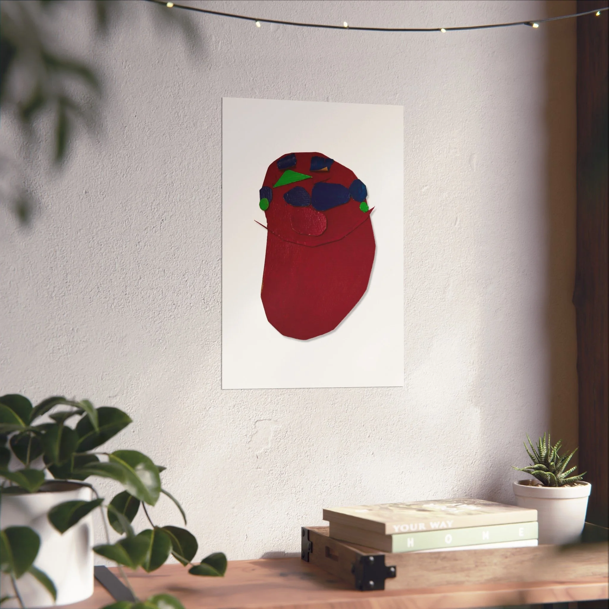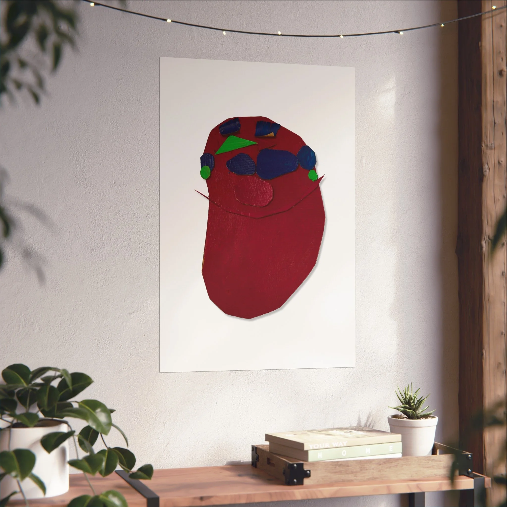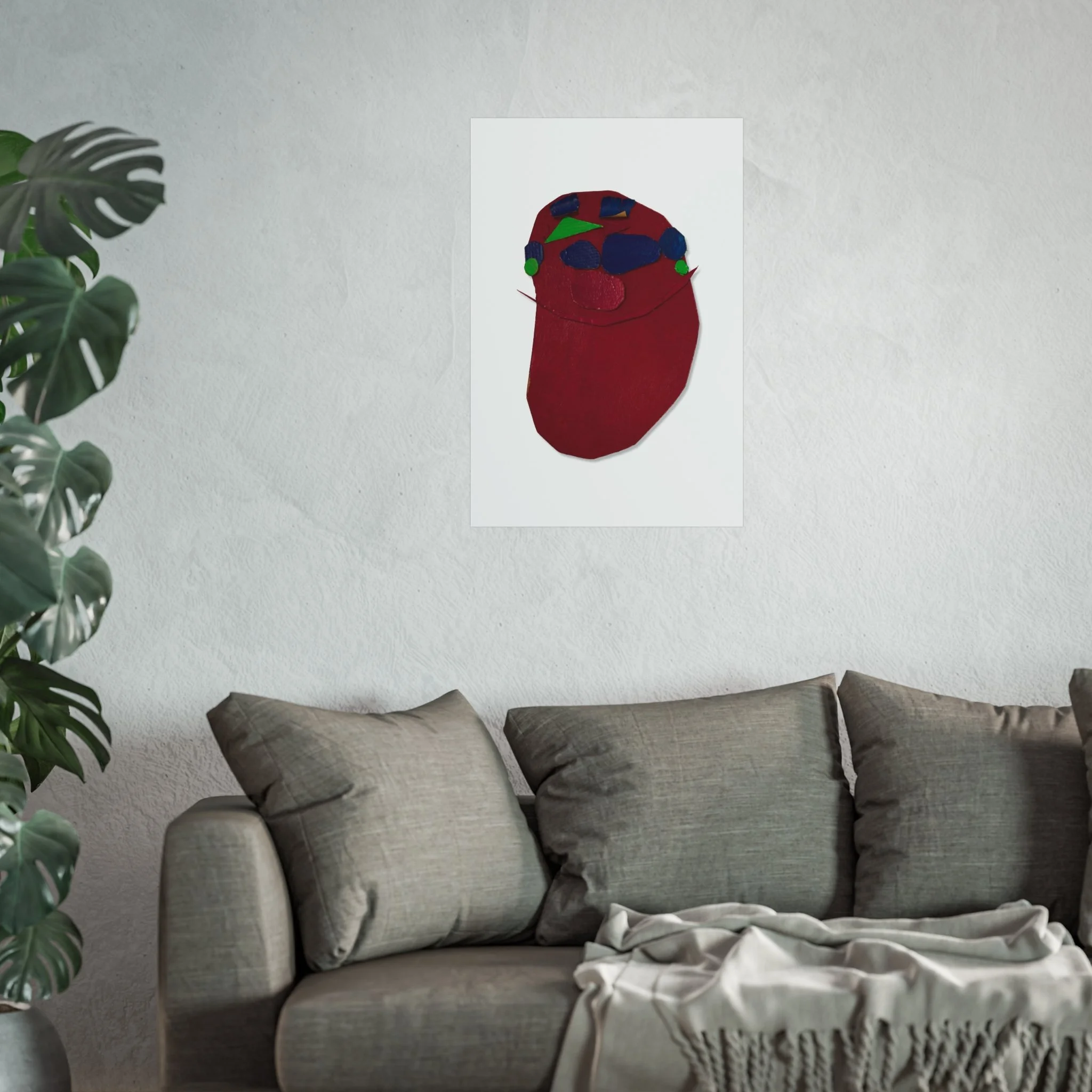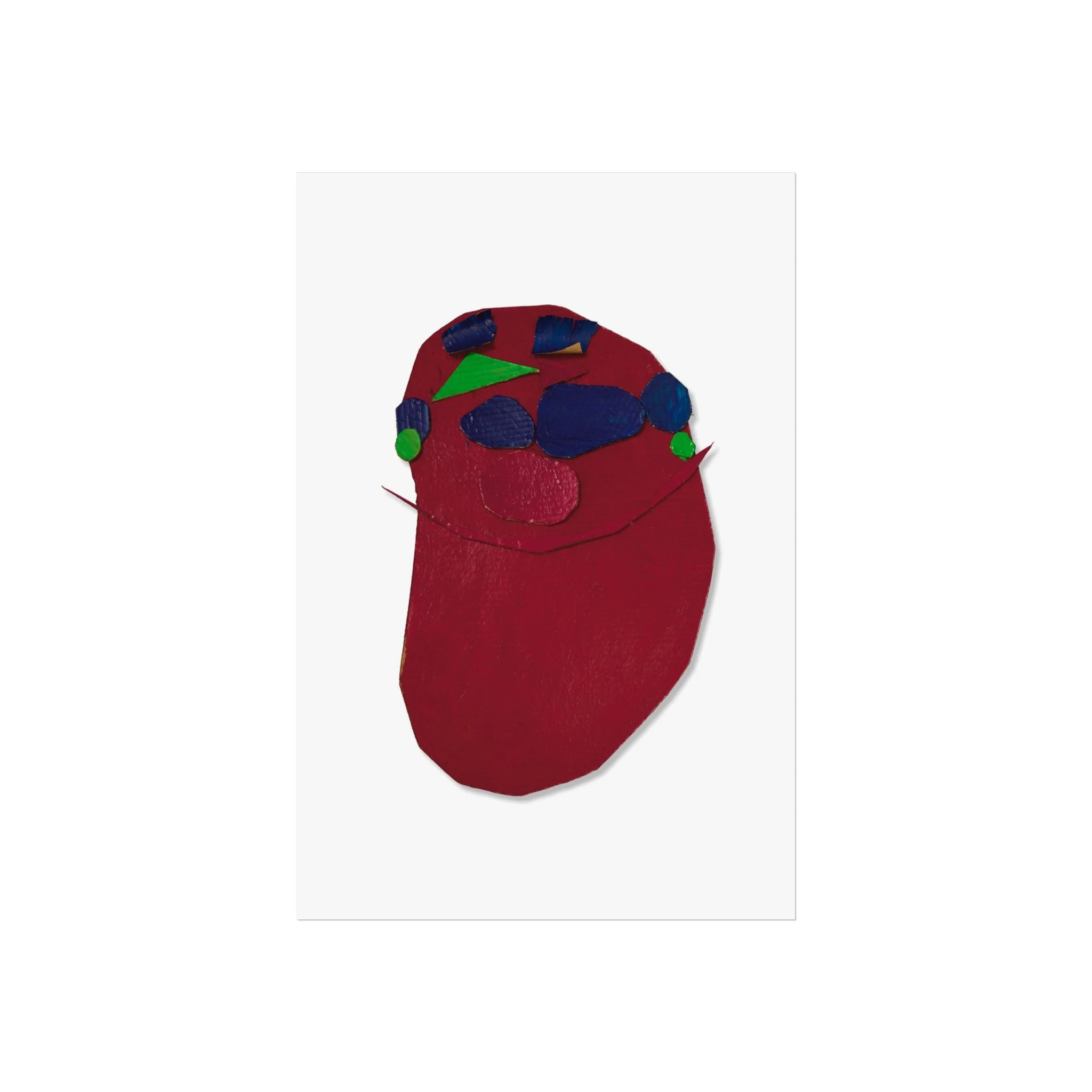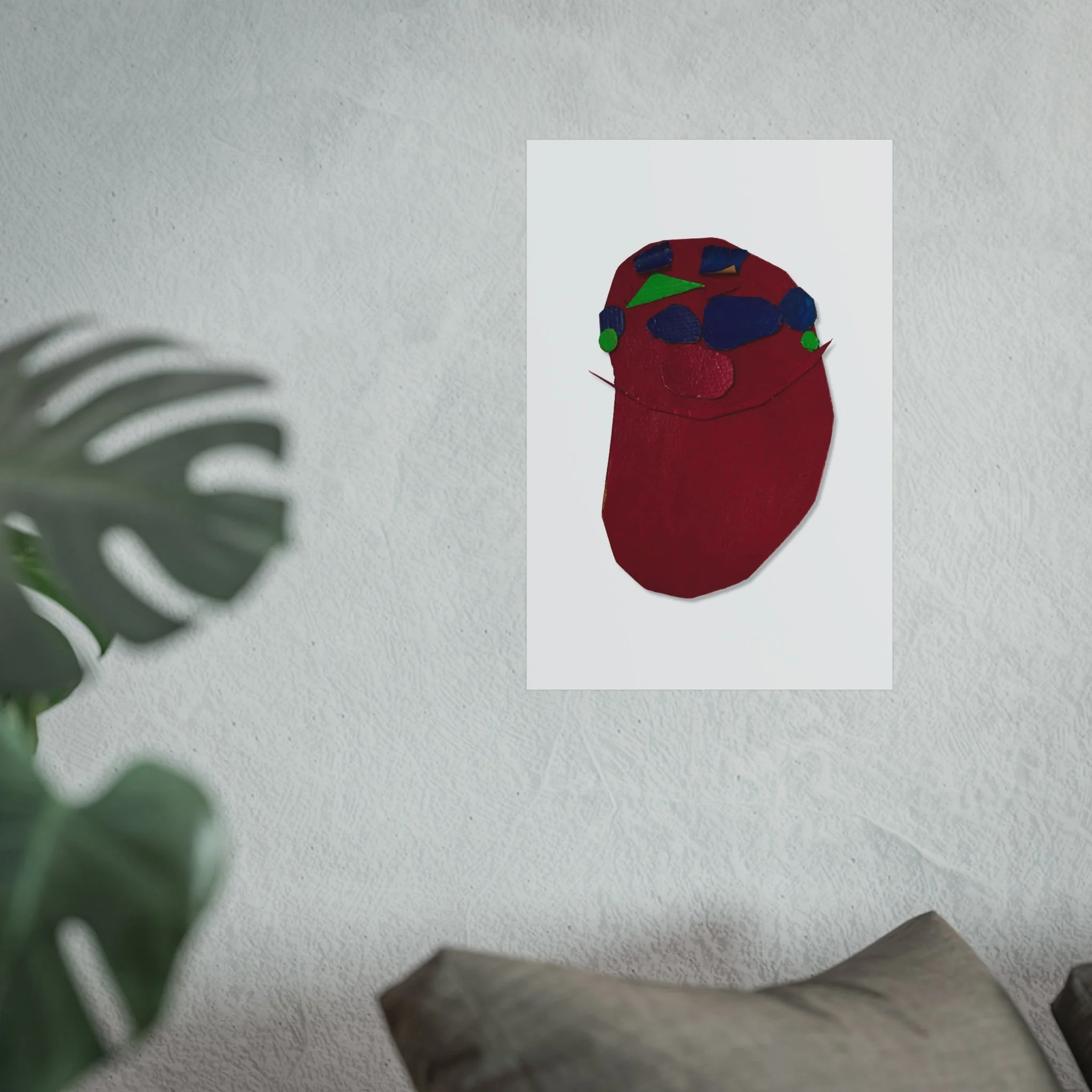 A striking fine art poster that feels intimate and unexpected. Deep crimson forms and pops of cobalt, emerald and rose sit on a clean white field, creating a bold, tactile composition that reads like a modern collage. The matte, gallery-grade surface and giclée-quality printing preserve subtle texture and rich, layered color — a quiet statement piece that brings warmth and personality to a living room wall, studio corner, or creative workspace. Its simplified shapes invite quiet reflection and conversation, fitting easily into eclectic, contemporary, or minimalist interiors while adding an expressive, handcrafted touch.