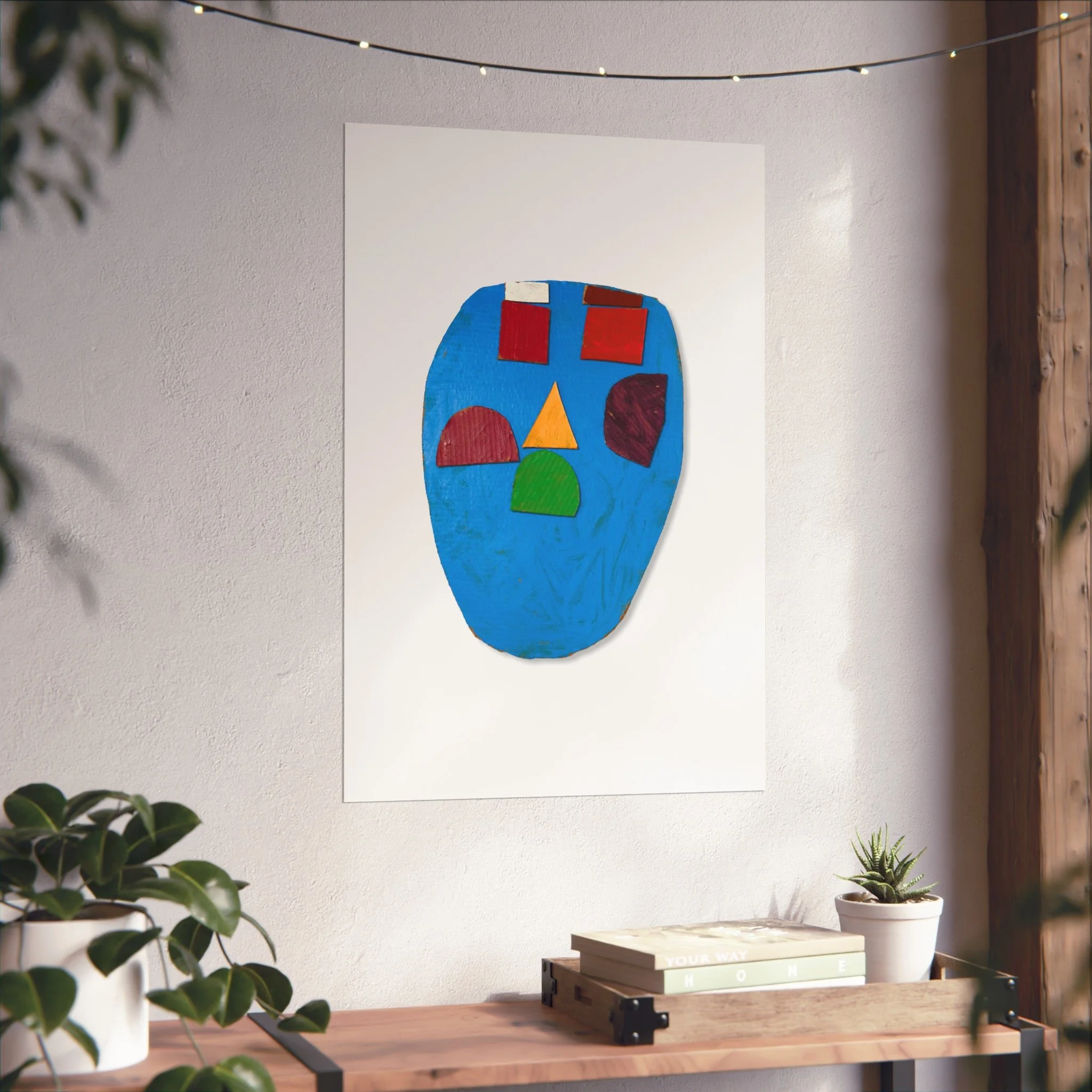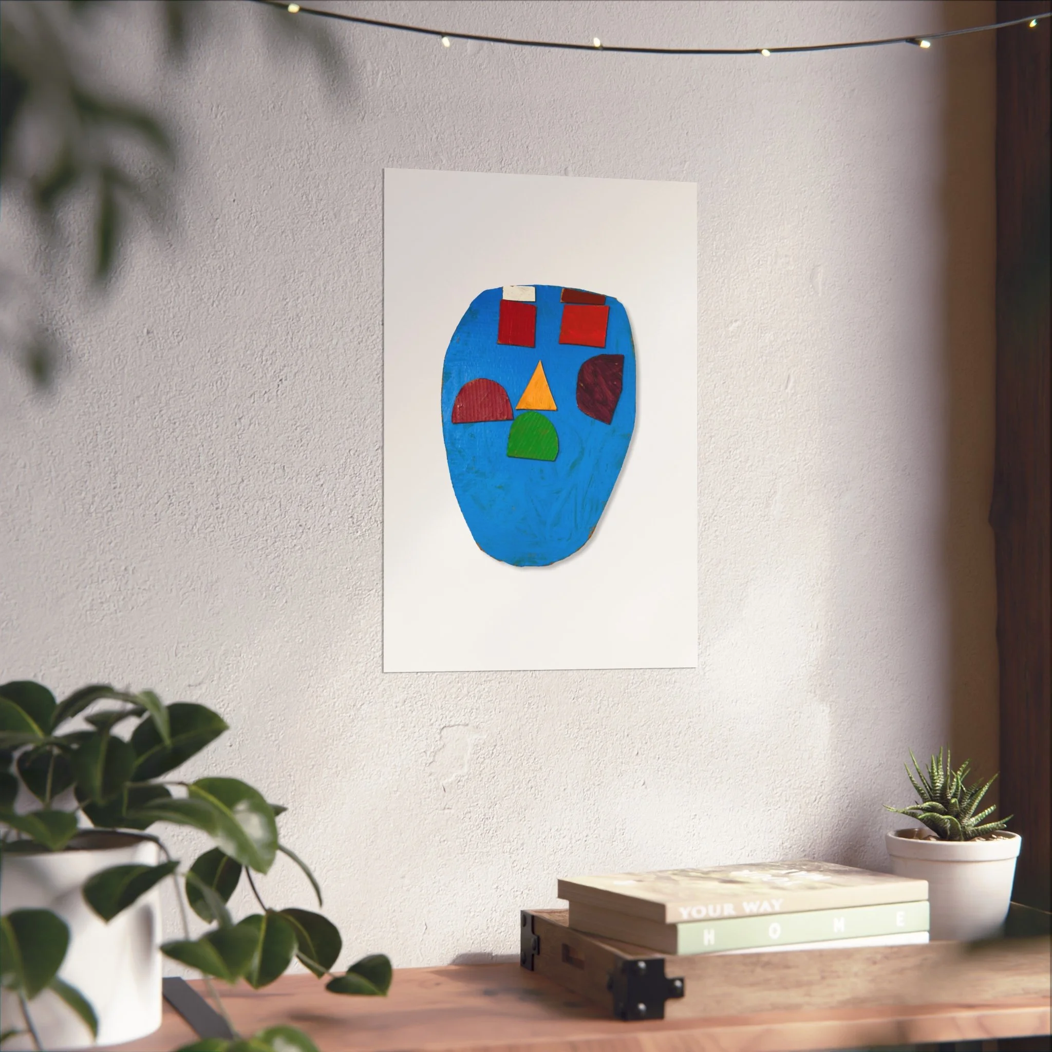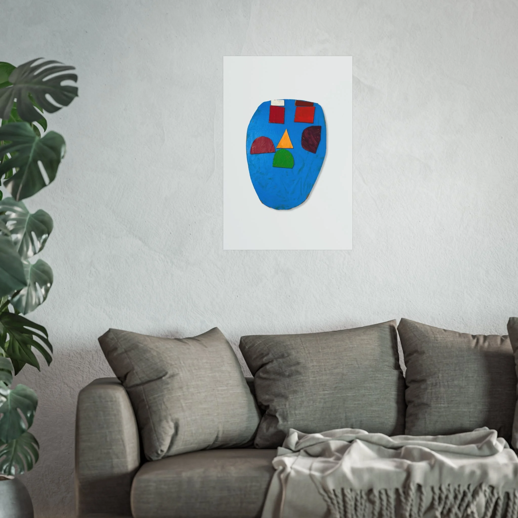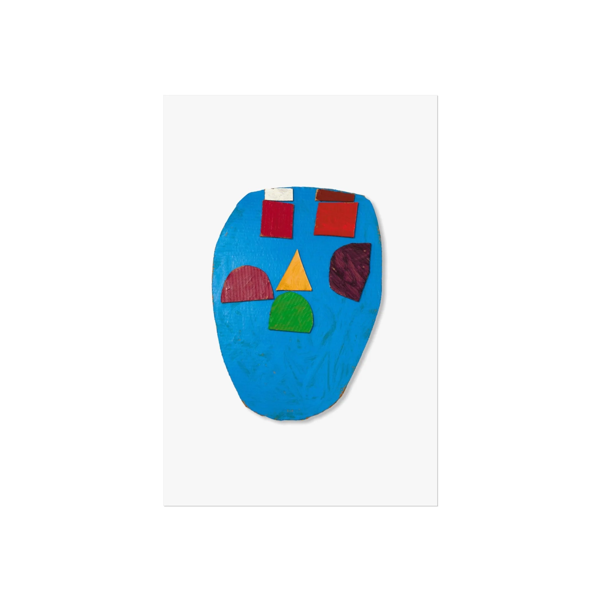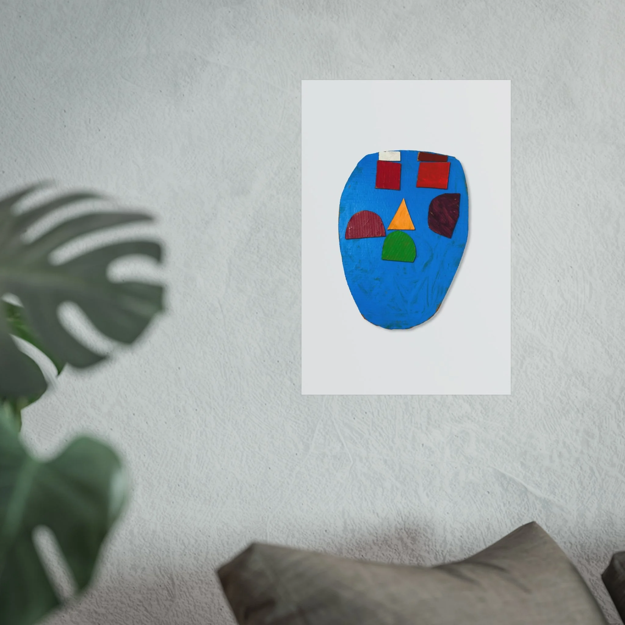 A small, modern art poster that brings a playful, sculptural face into a room. Bright blocks of primary color sit against a textured blue field, creating a piece that feels both childlike and thoughtfully composed. Hung above a sofa or leaning on a shelf, it quietly punctuates neutral interiors with an upbeat, artistic energy. This print reads like a snapshot of a tactile collage—visible brush textures and cut-shape forms invite closer inspection and reward viewers who love color-driven, contemporary wall art.