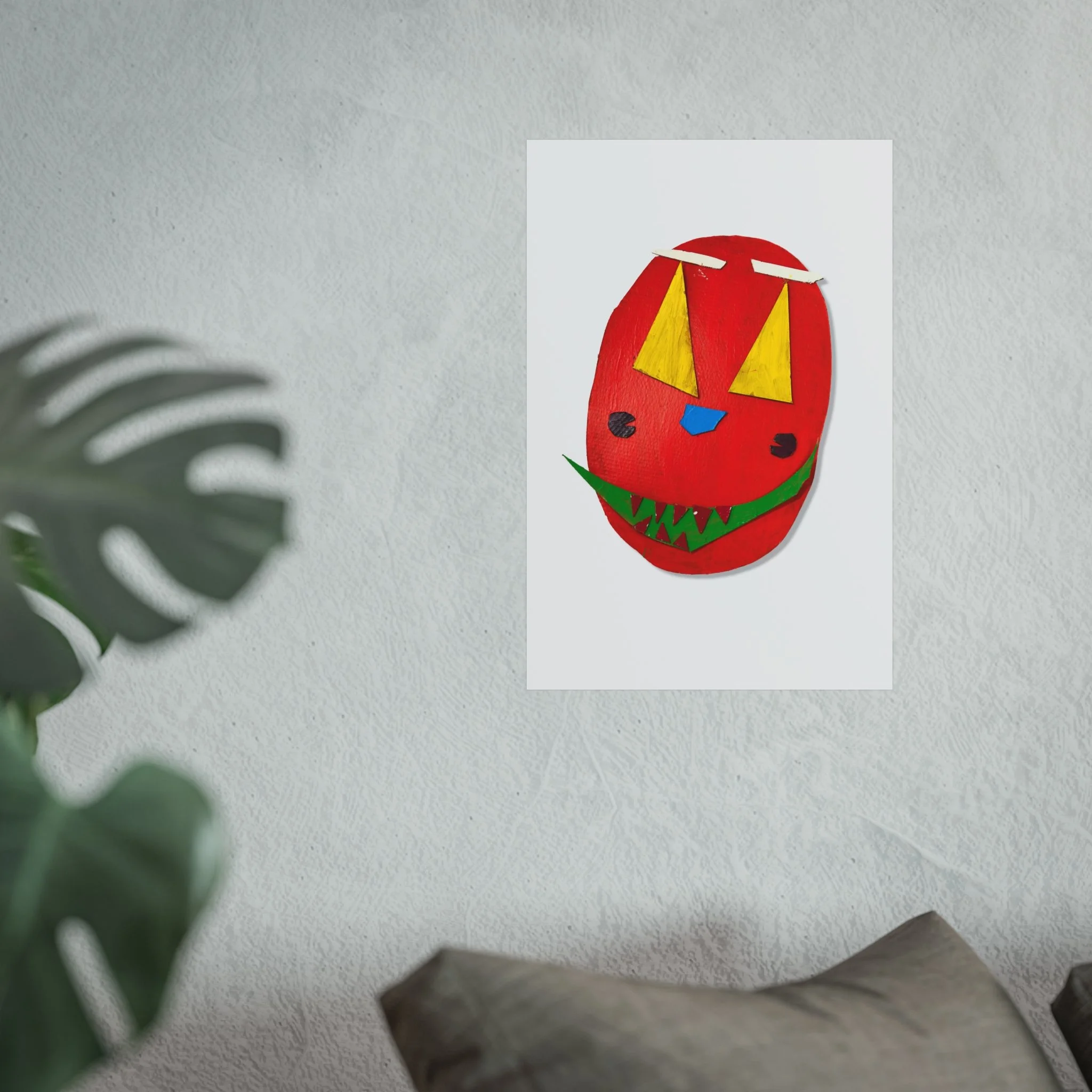 A bold, playful fine art poster that brings a handcrafted, whimsical face into your space. Bright reds, sunny yellow eyes and a jagged green grin create a joyful, slightly mischievous character — like a spontaneous paper-collage friend pinned to your wall. The smooth matte finish and giclée print quality keep color vibrant and edges crisp, so the simple shapes and layered textures read clearly from across the room. Hung solo above a couch or grouped with other eclectic prints, this piece adds a burst of color and childlike energy to living rooms, nurseries, studios, and creative workspaces.