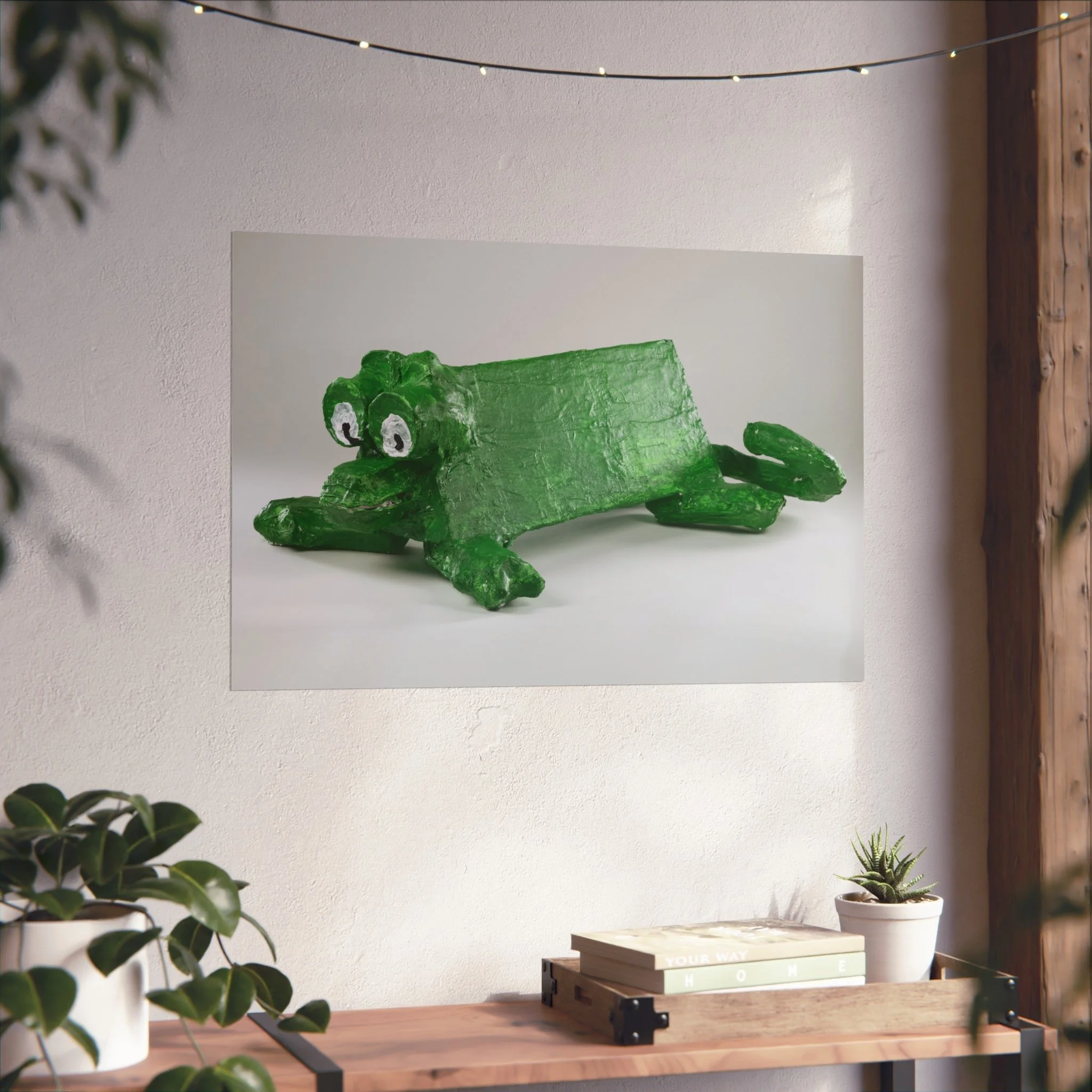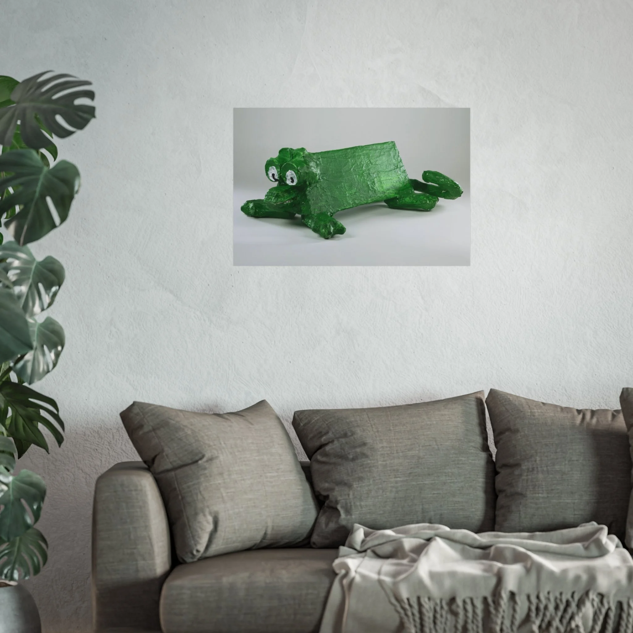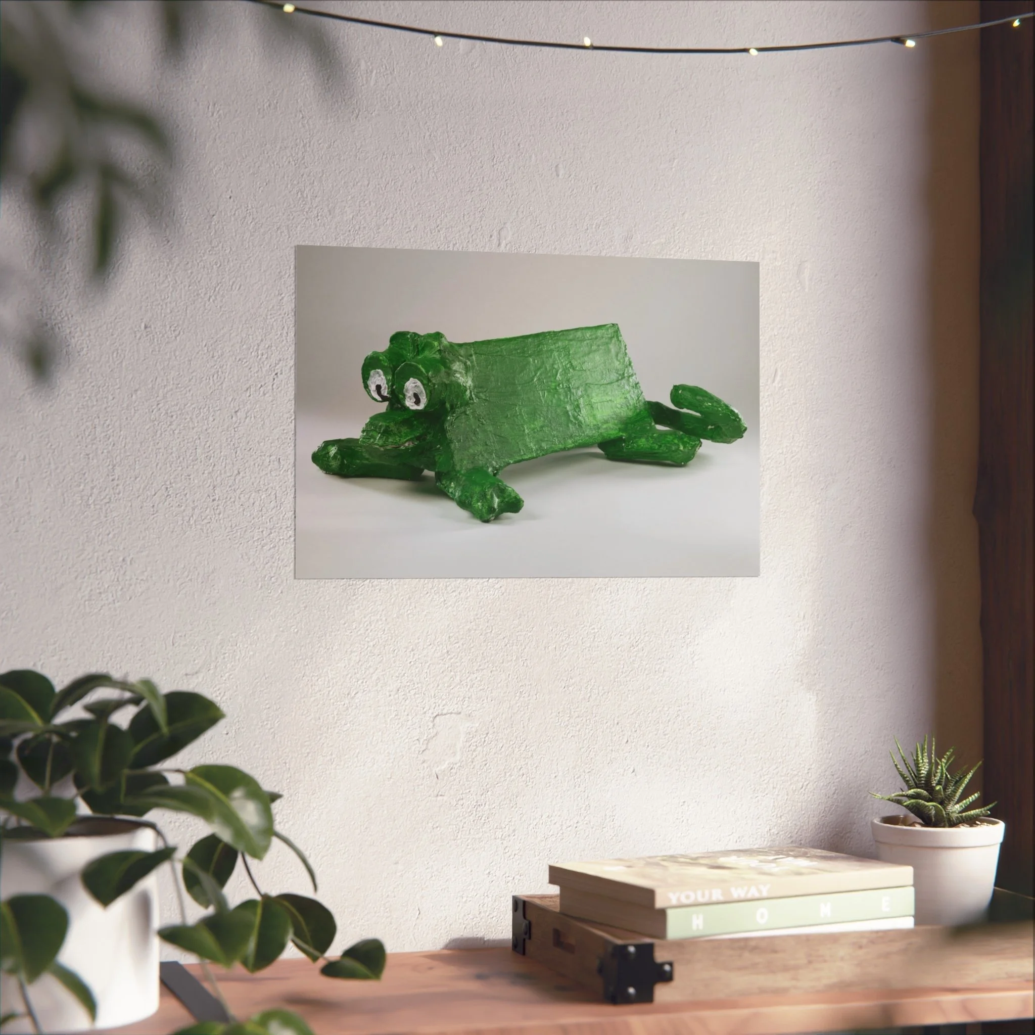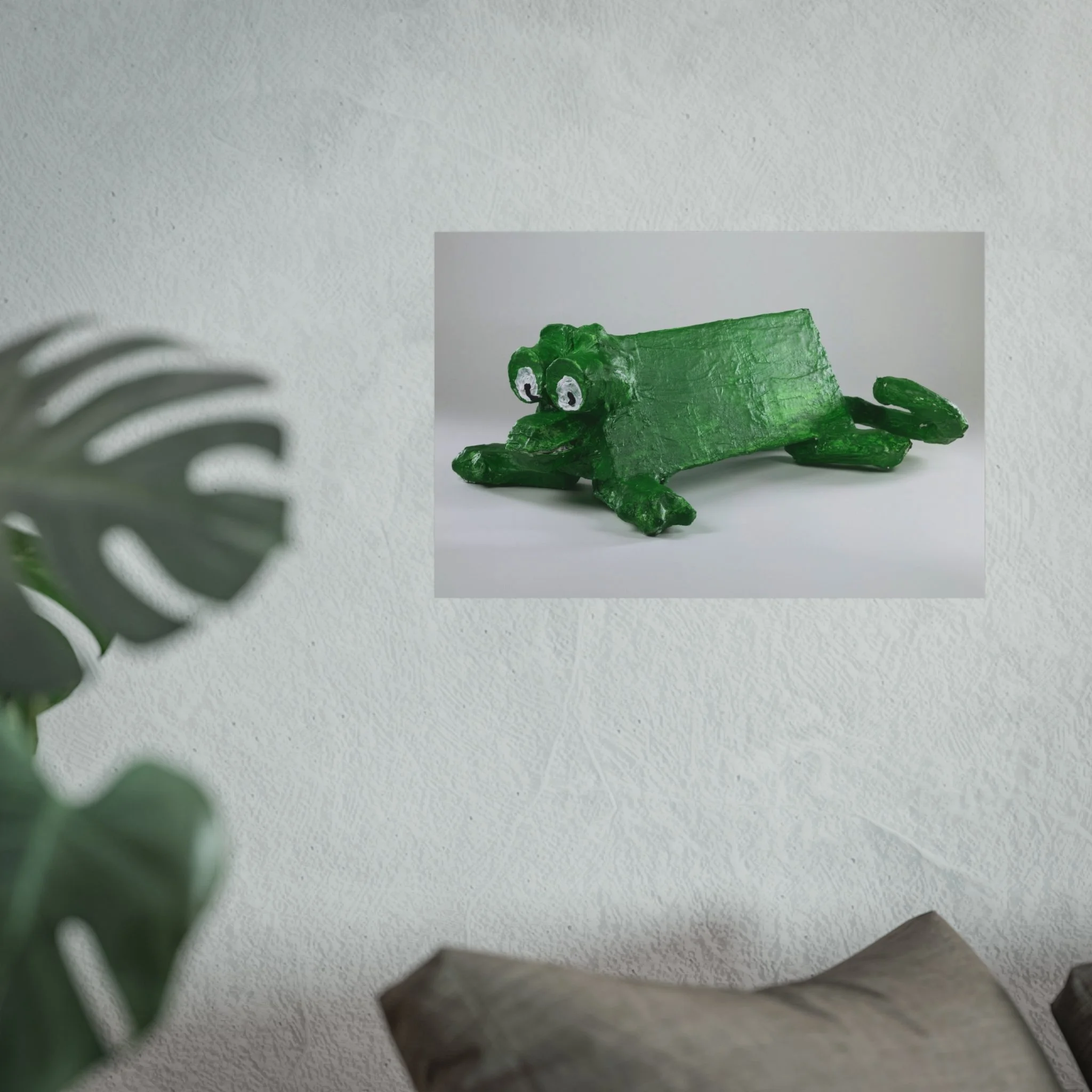 A whimsical fine art poster that brings a playful, handcrafted charm to any room. The print captures a quirky green frog sculpture rendered with tactile brushstrokes and a matte, gallery-grade finish that feels both nostalgic and modern. Hung above a sofa, in a nursery, or in a creative studio, this piece adds a lighthearted focal point — the kind that sparks smiles and invites conversation. The soft, muted background keeps the composition calm while the frog’s bright green texture gives the work personality and warmth. Printed with archival, REACH-certified inks on smooth, acid-free 220 gsm paper using giclée techniques, it’s made to keep its color and character for years.